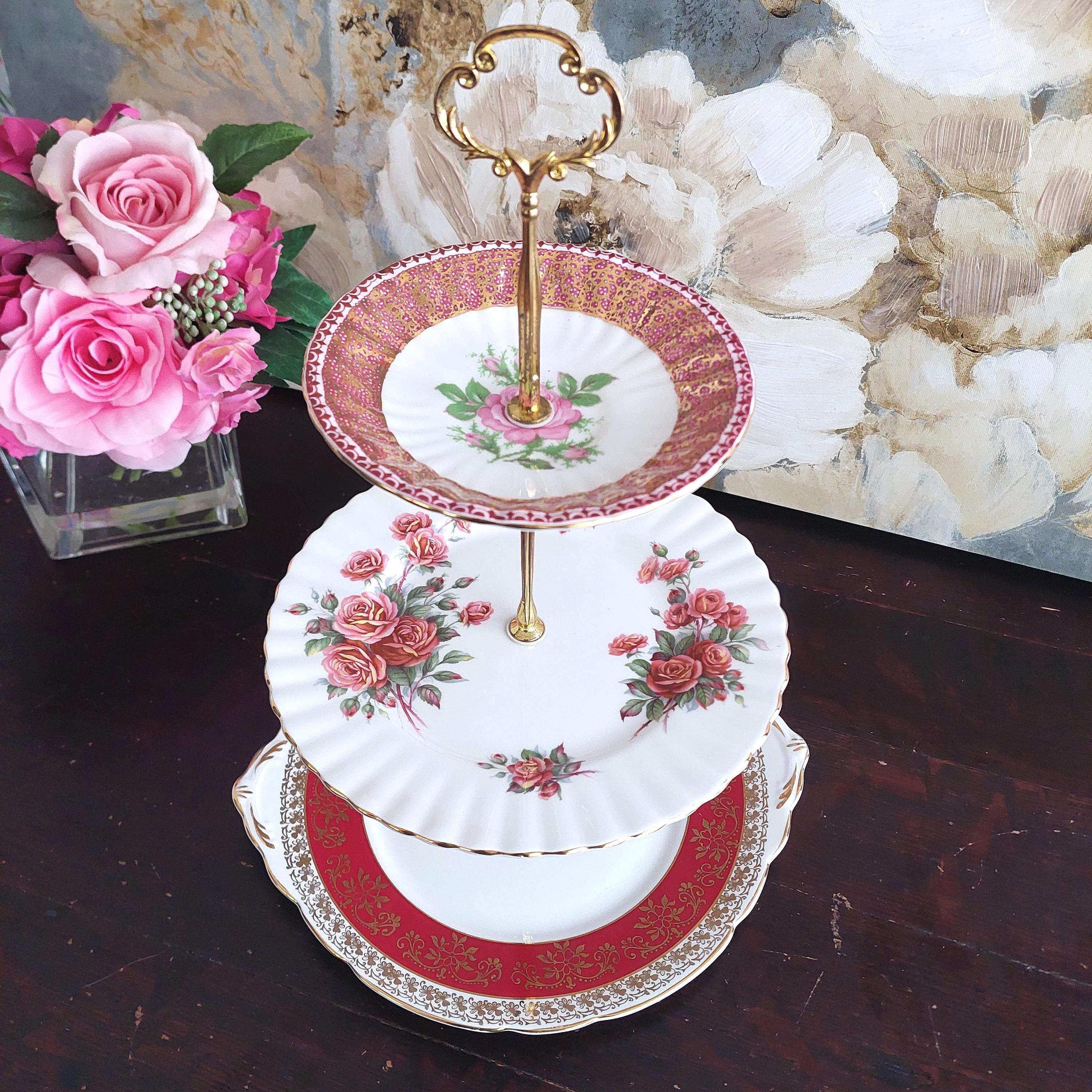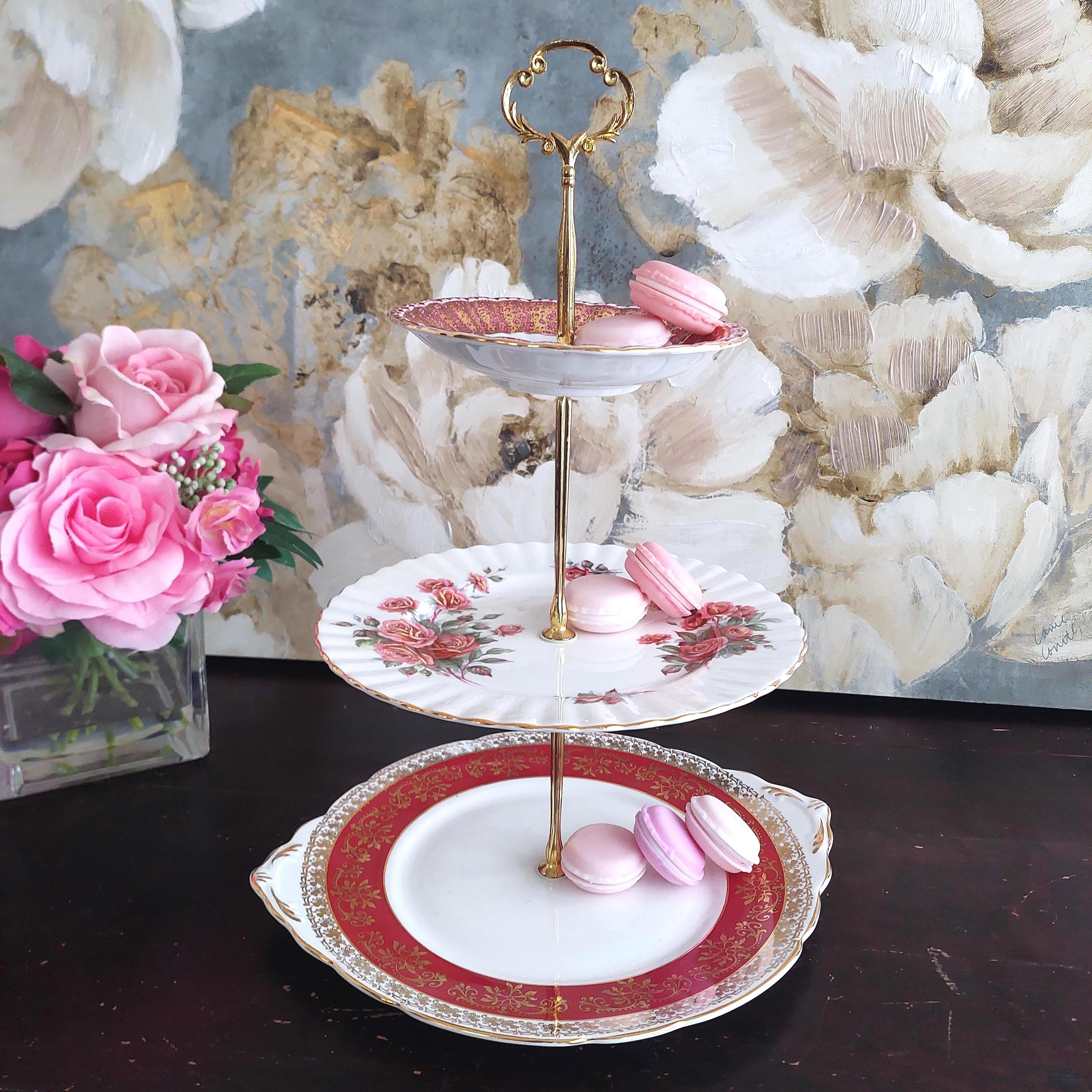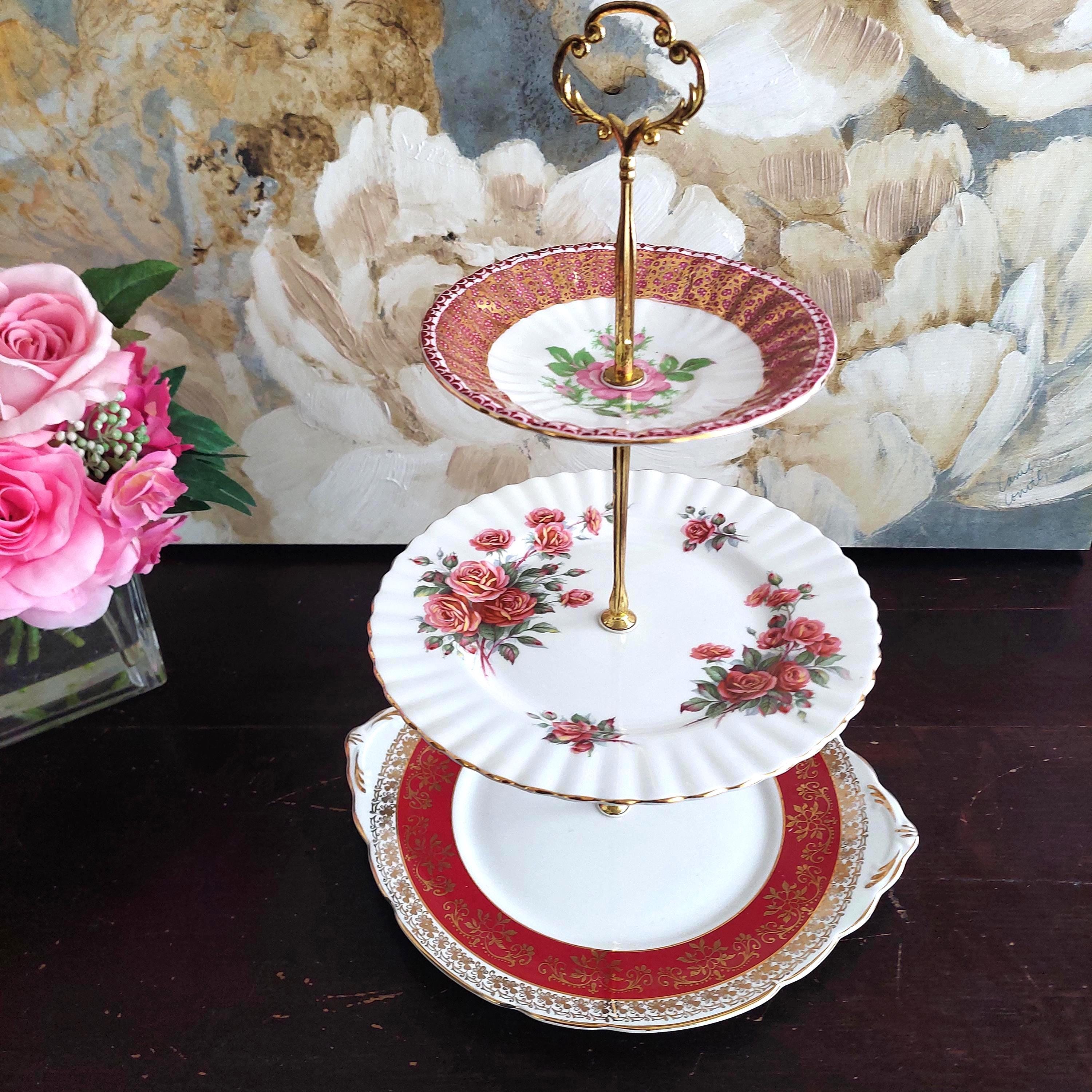 Elegant 3-tier cake stand, handmade by me using vintage English bone china floral plates.