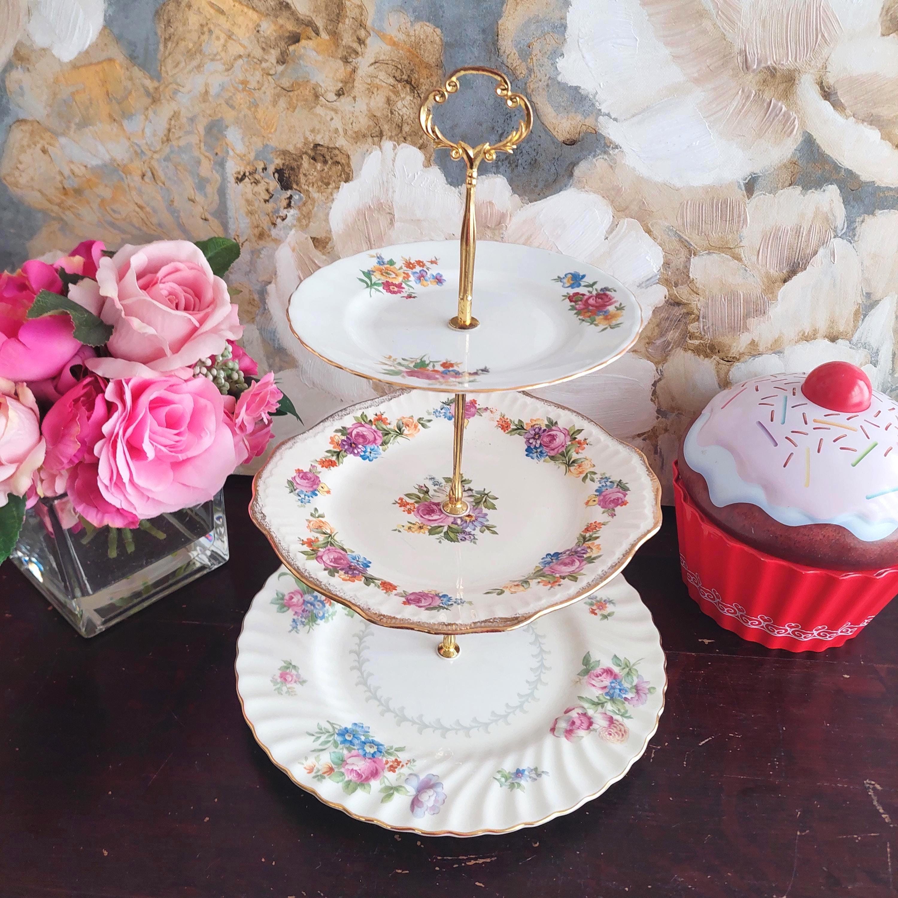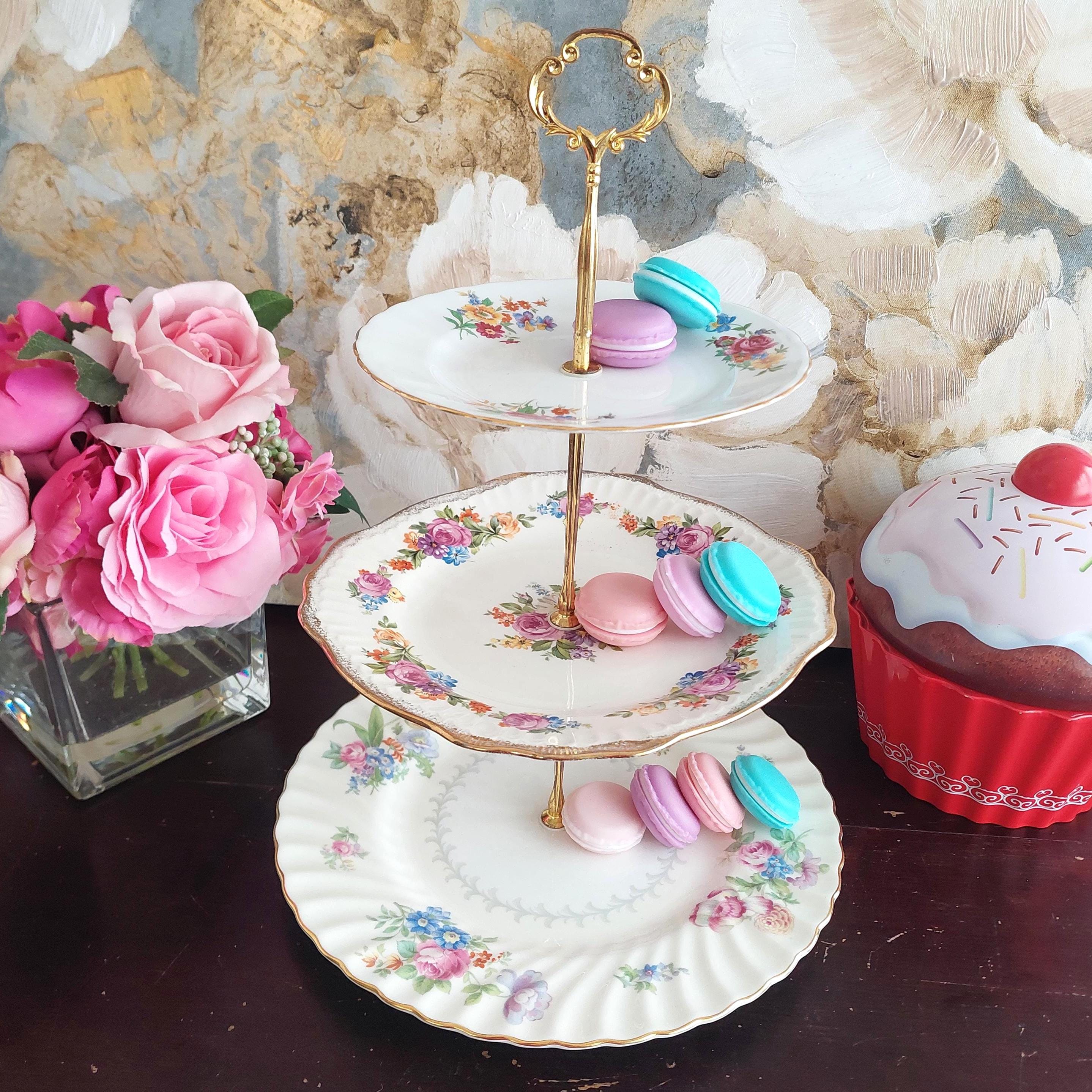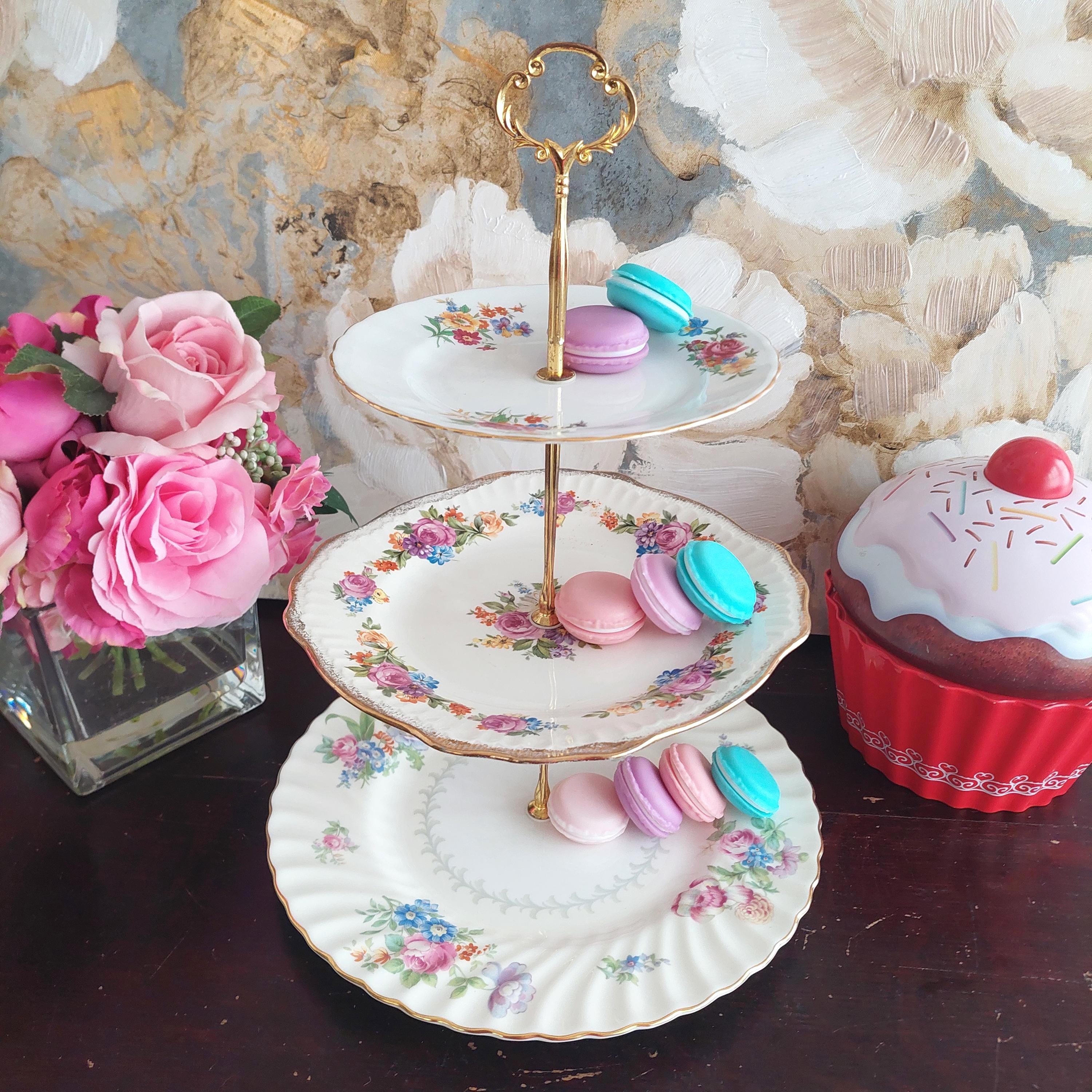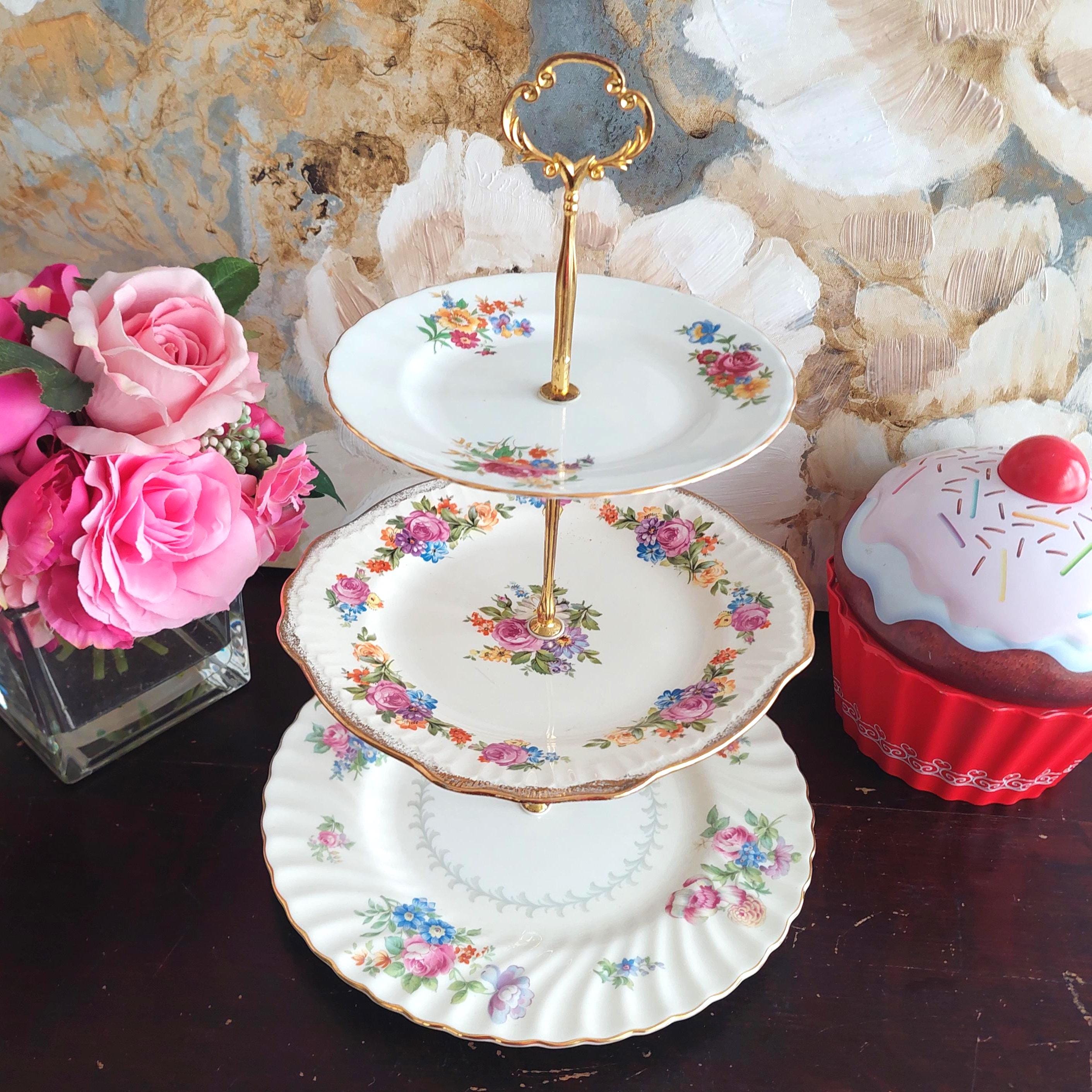Elegant 3-tier cake stand, handmade by me mismatched vintage English bone china plates
