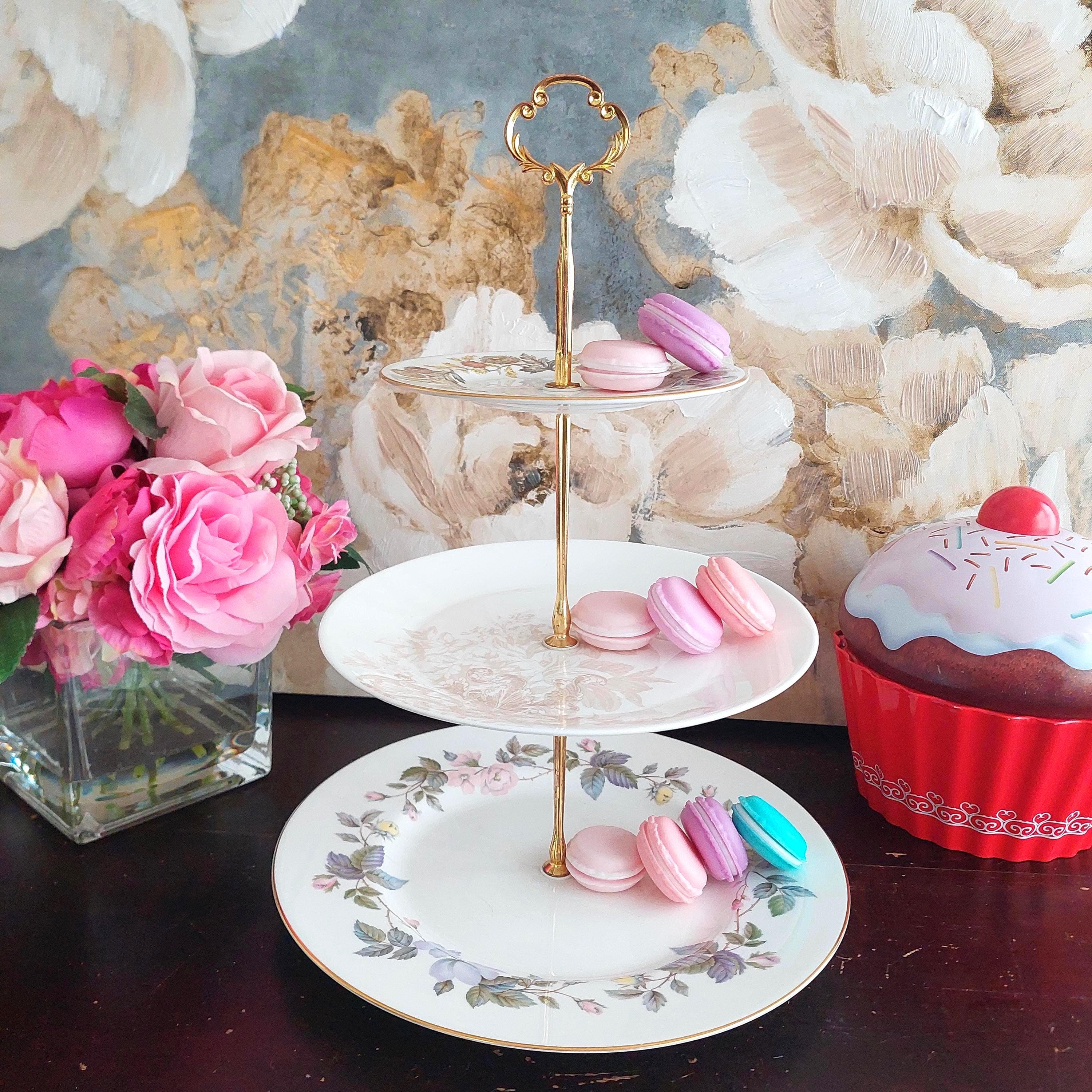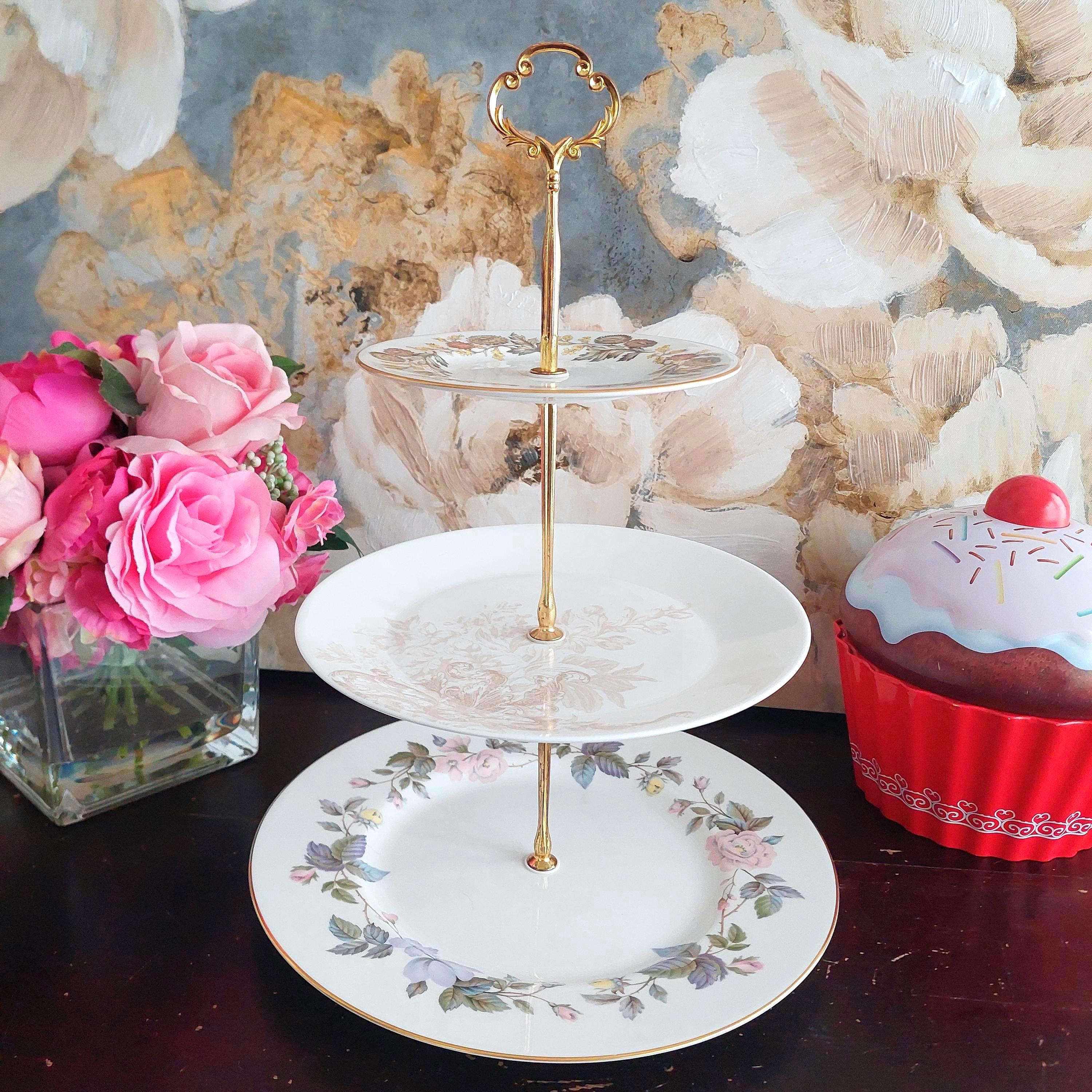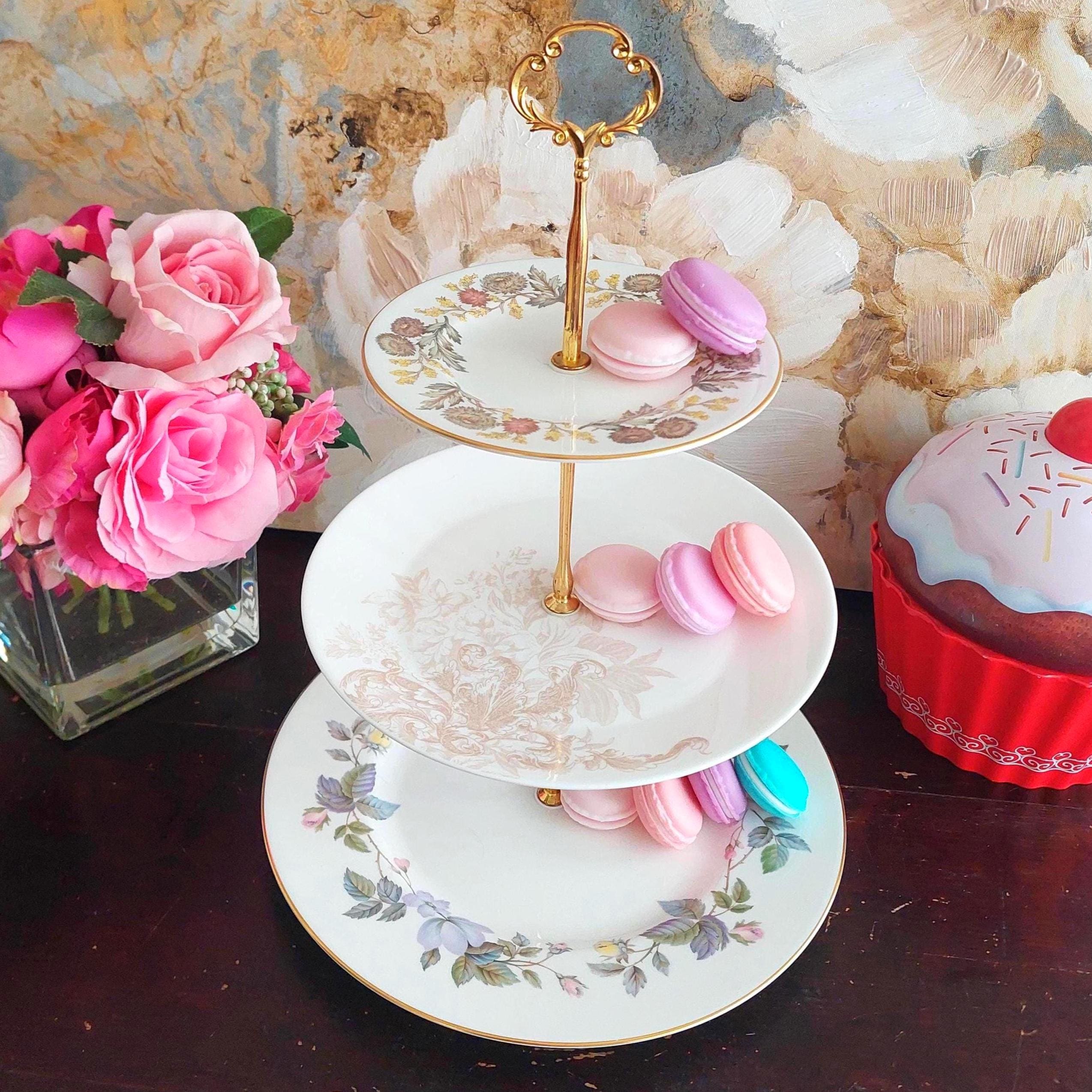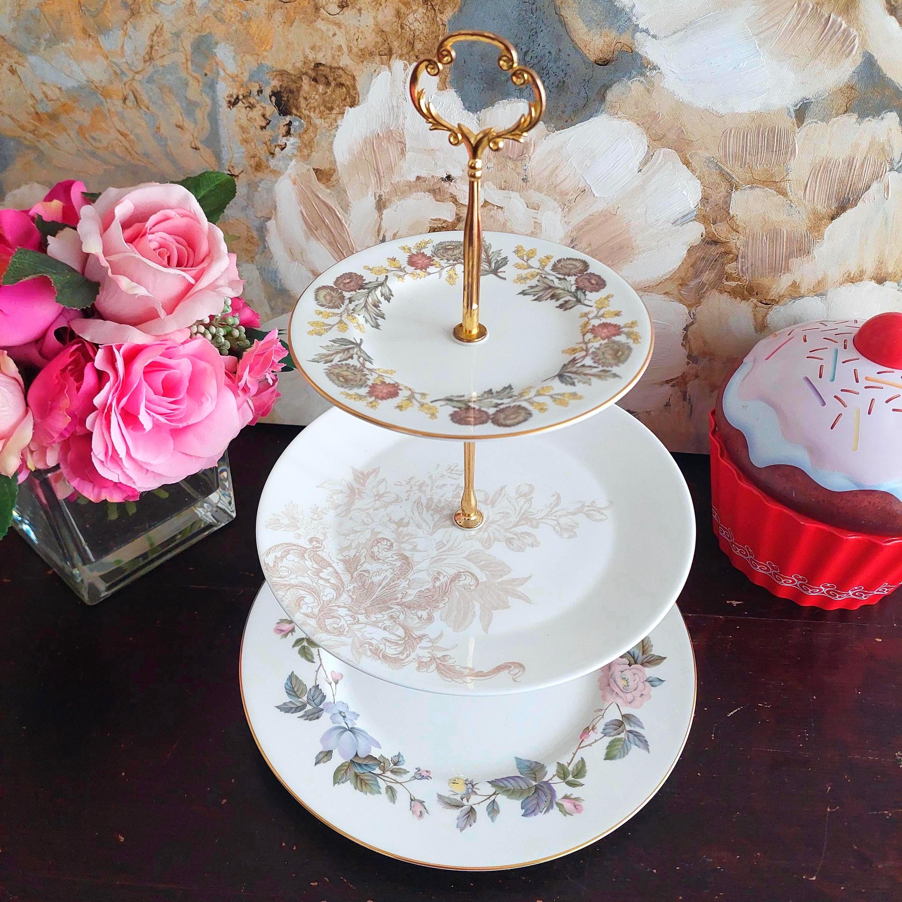 Elegant 3-tier cake stand, handmade by me using vintage mismatched English bone china plates