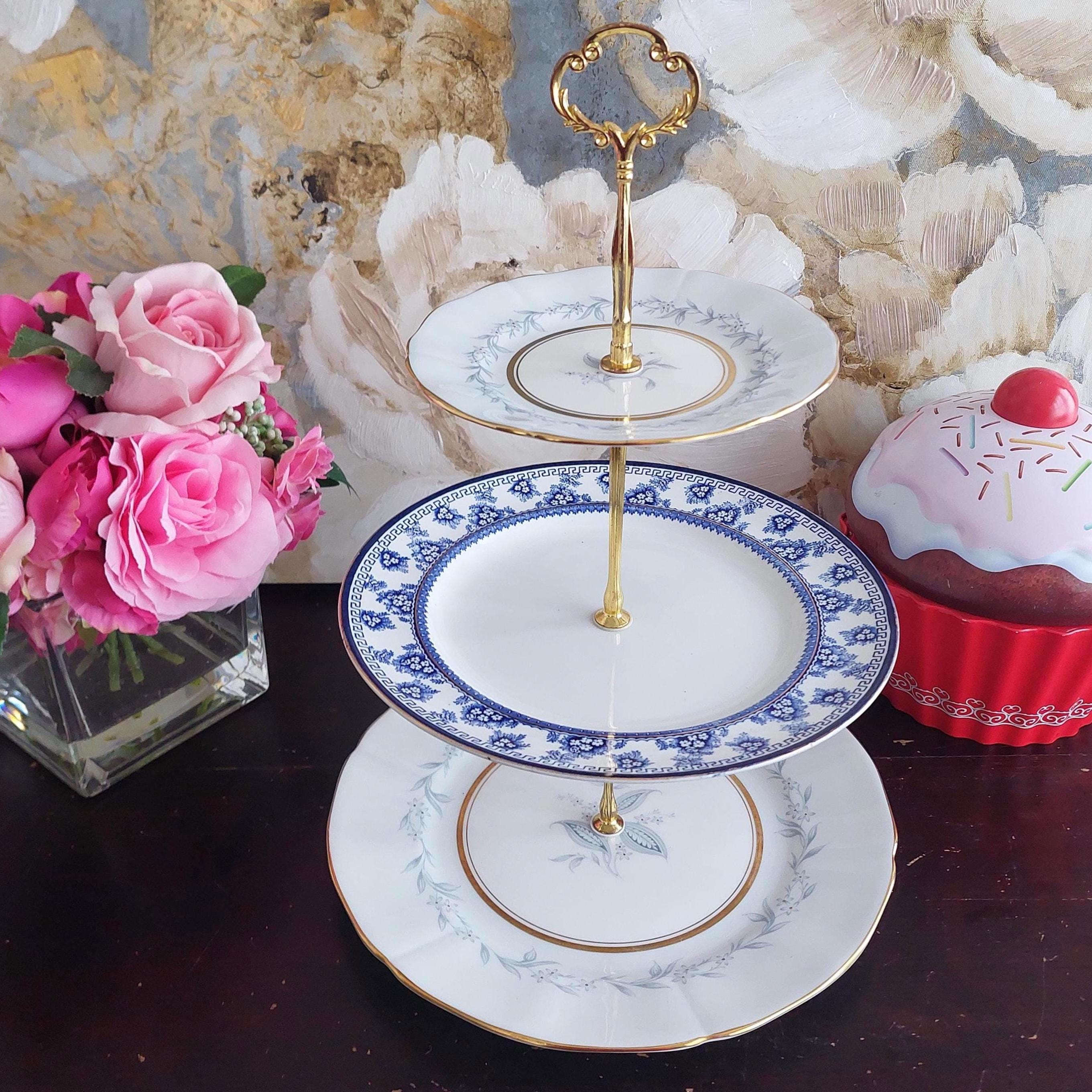 Elegant 3-tier cake stand, handmade by me mismatched English bone china and ironstone plates.