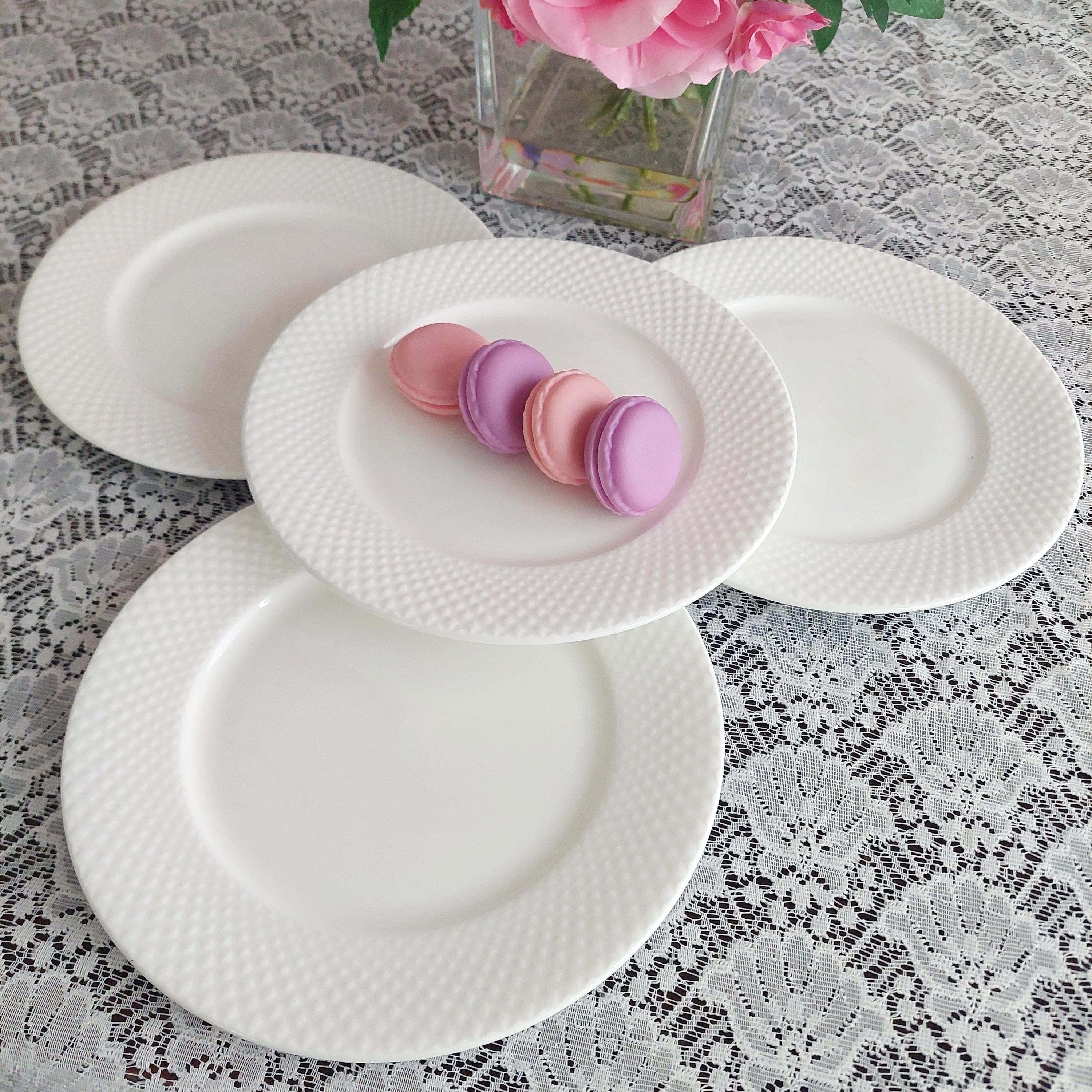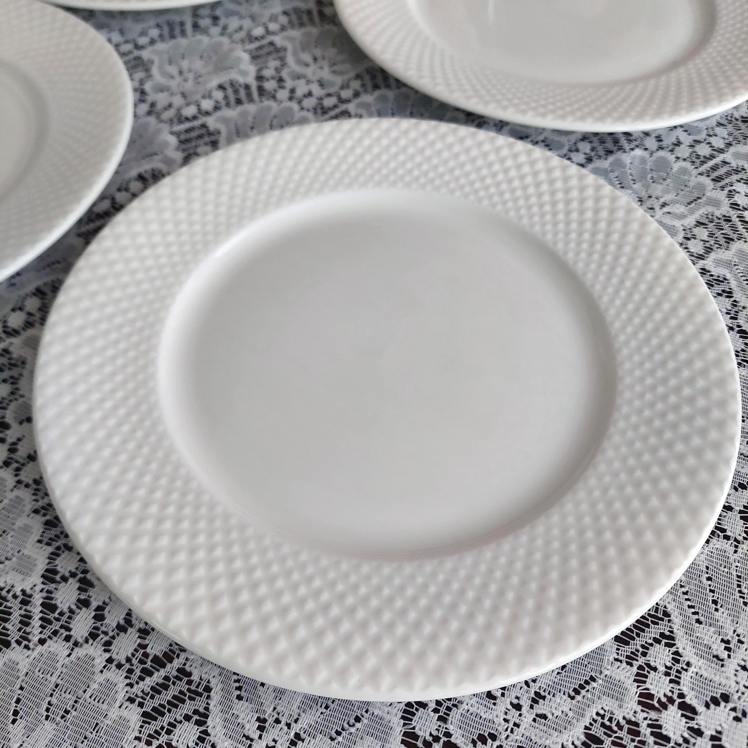 Vintage Mikasa Huntinton crisp white bone china salad plates with embossed crisscross design on rim.