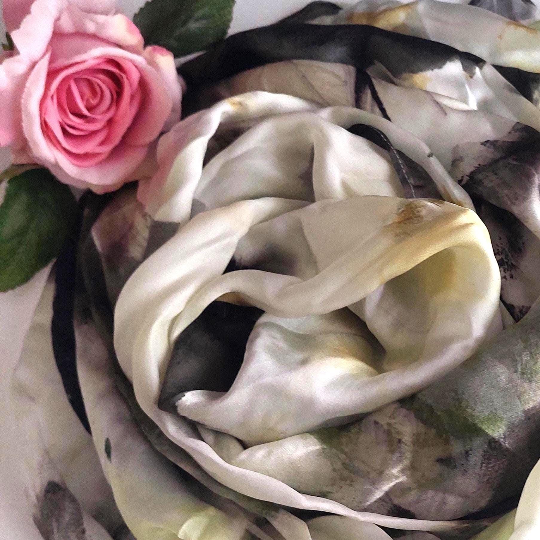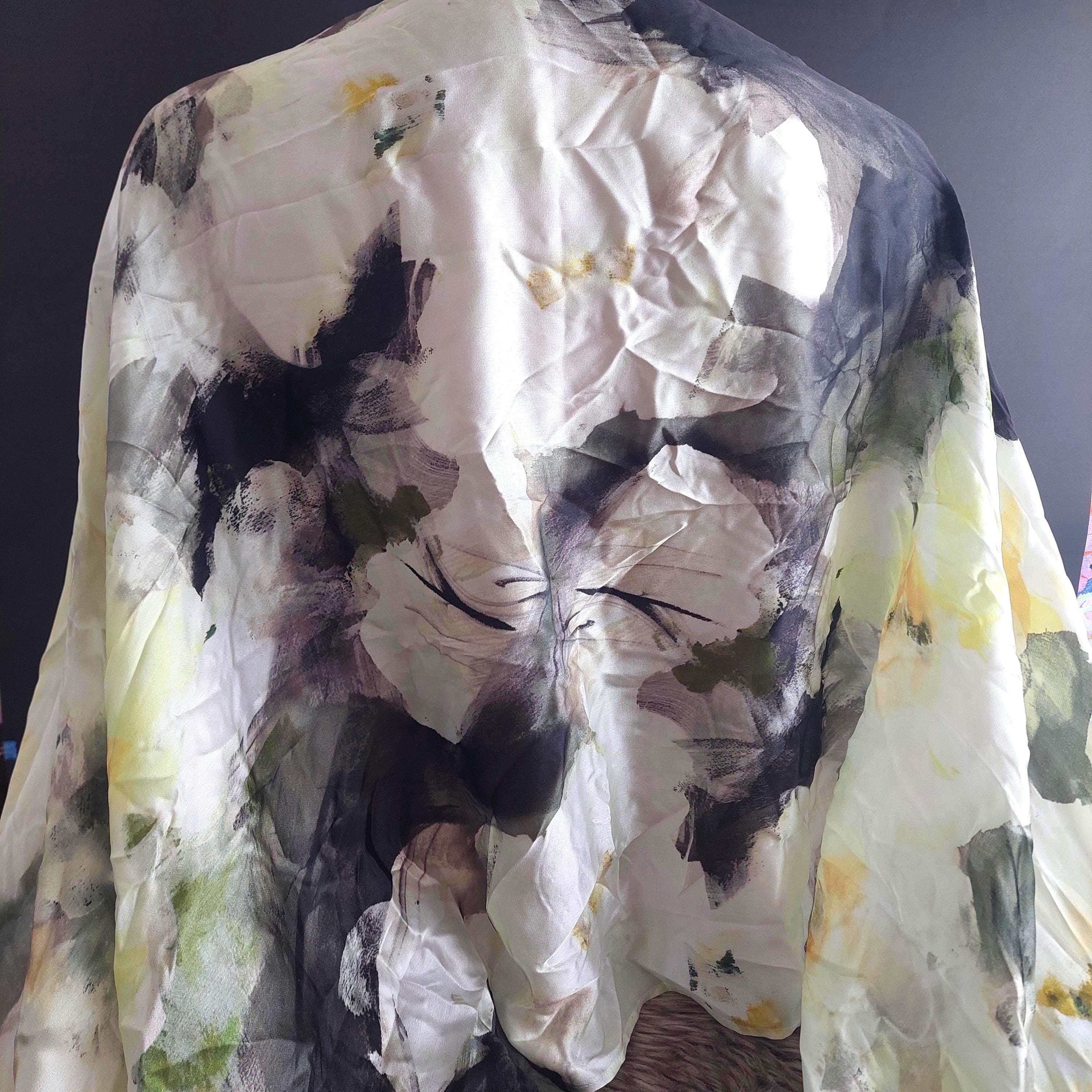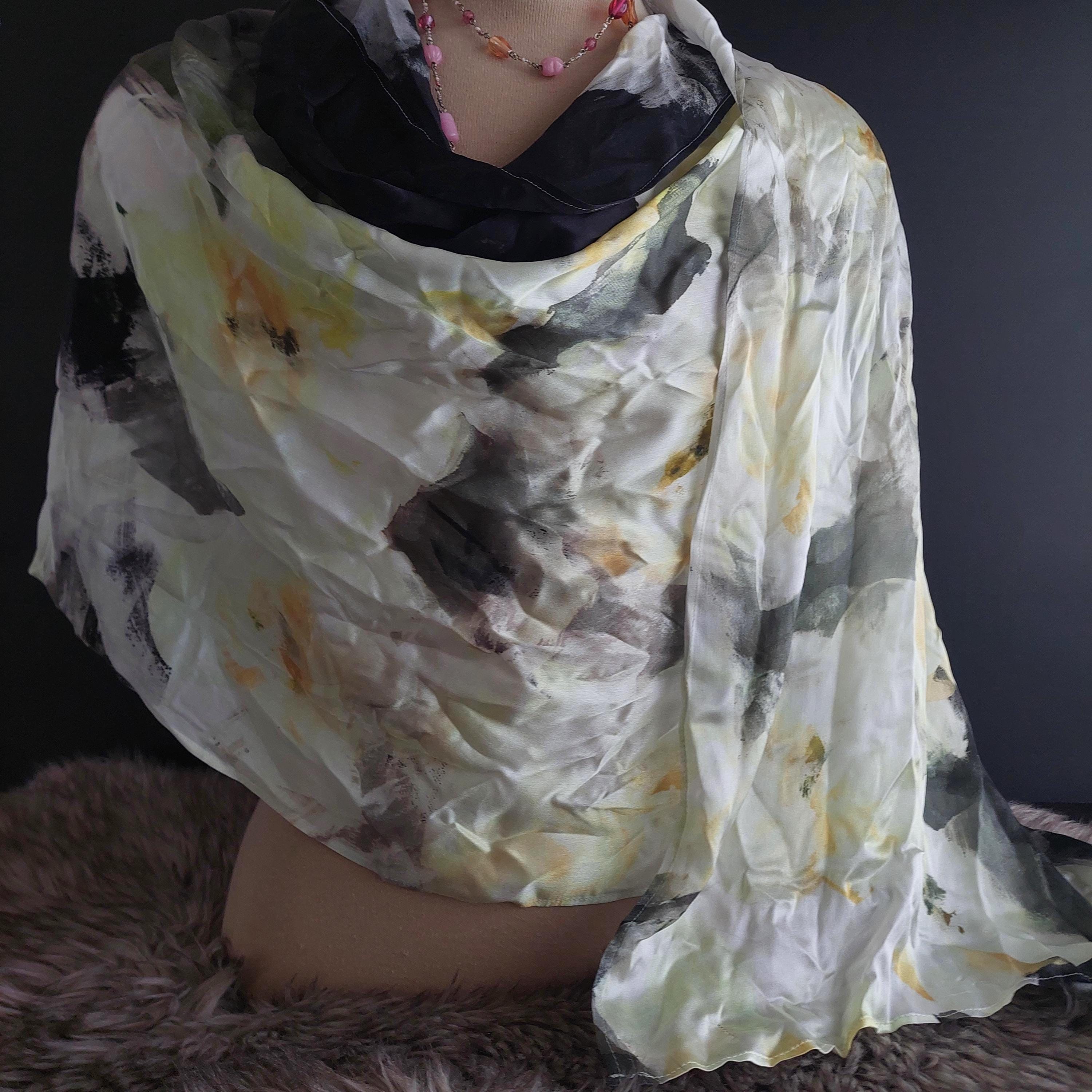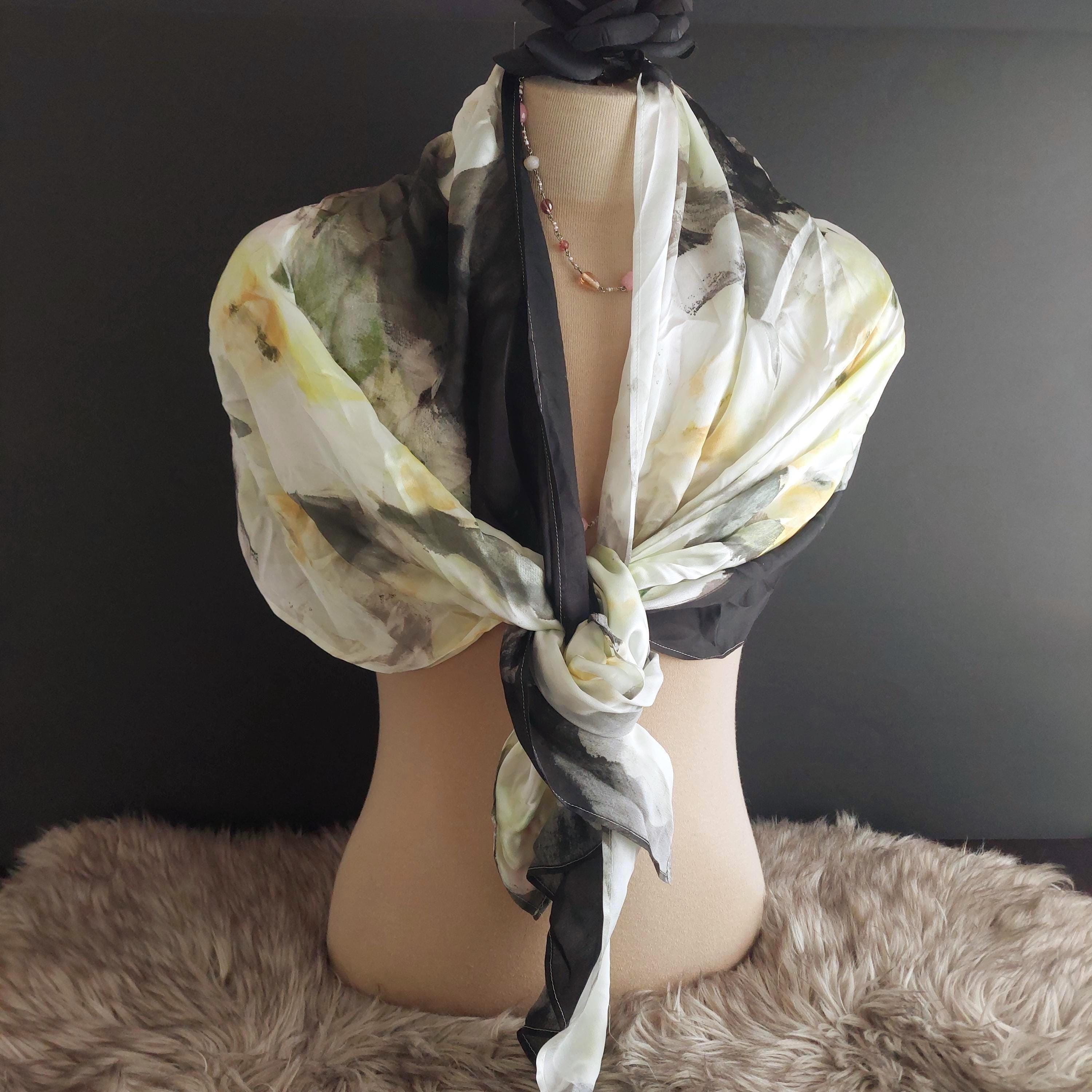 Vintage 100% silk scarf featuring an abstract floral pattern of creamy white and soft yellow large flowers