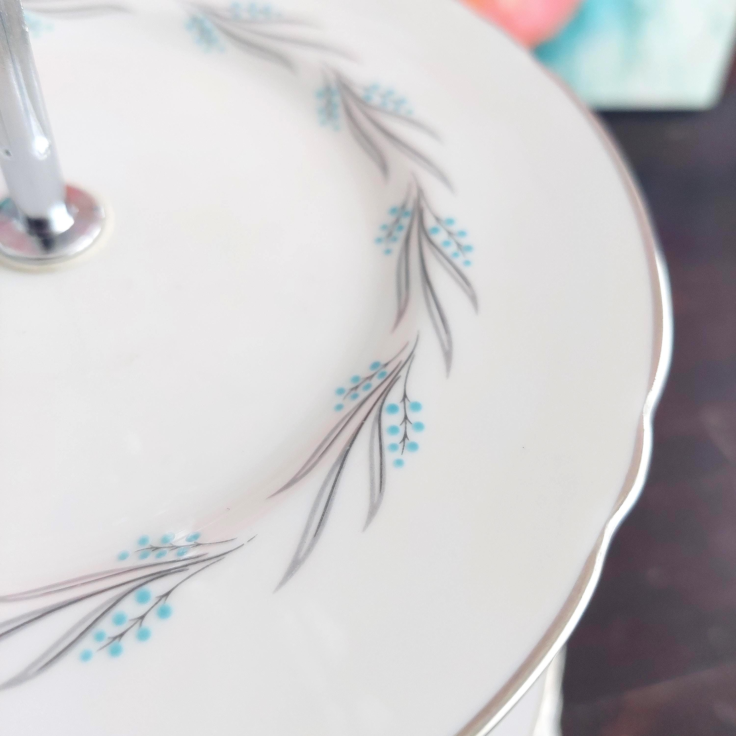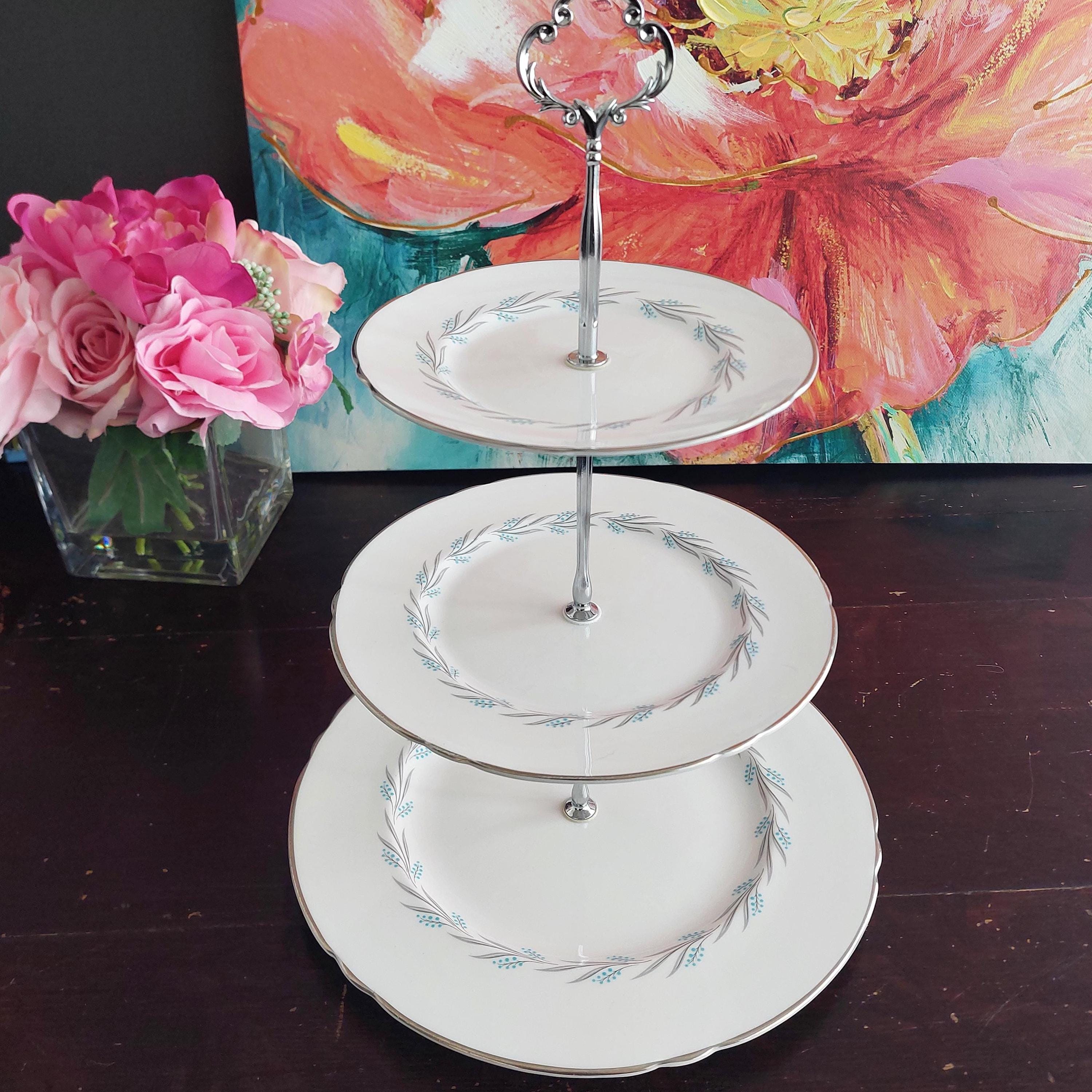 Elegant 3-tier cake stand, handmade by me using Lichfield English bone china in Grey Mist pattern.