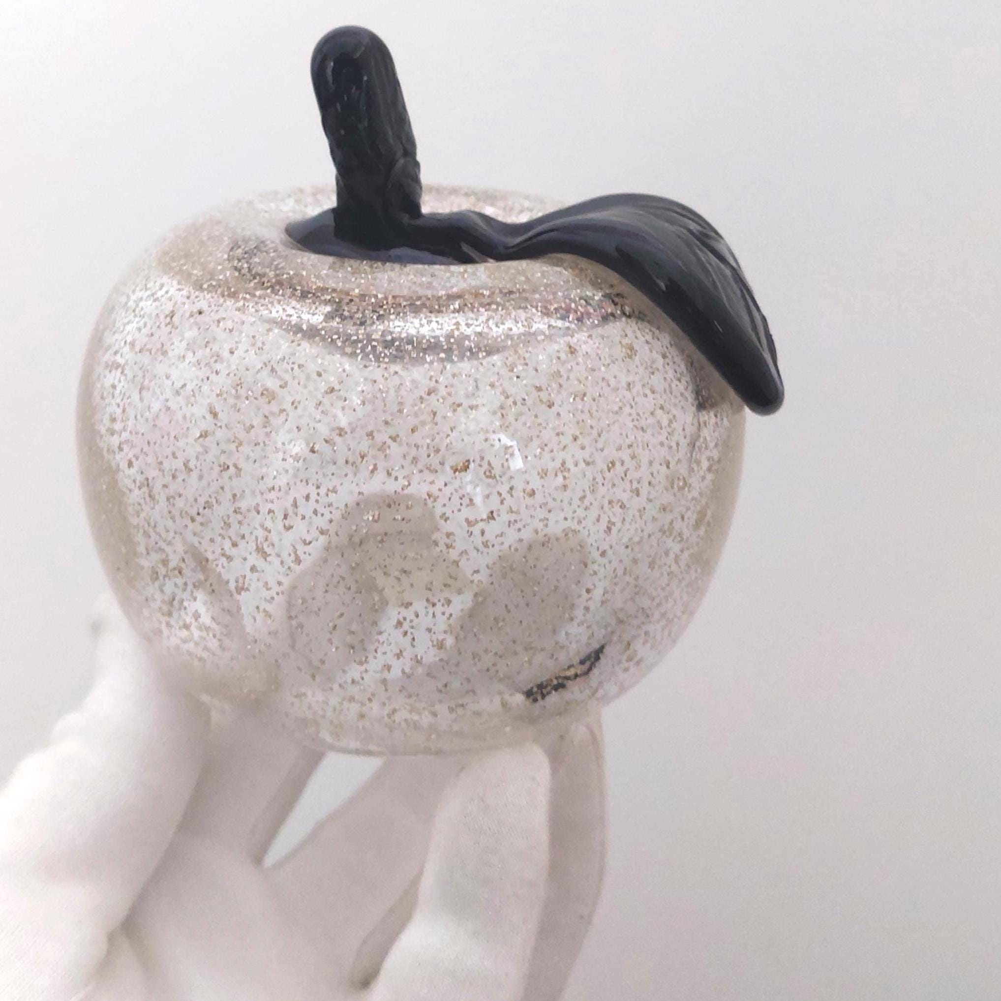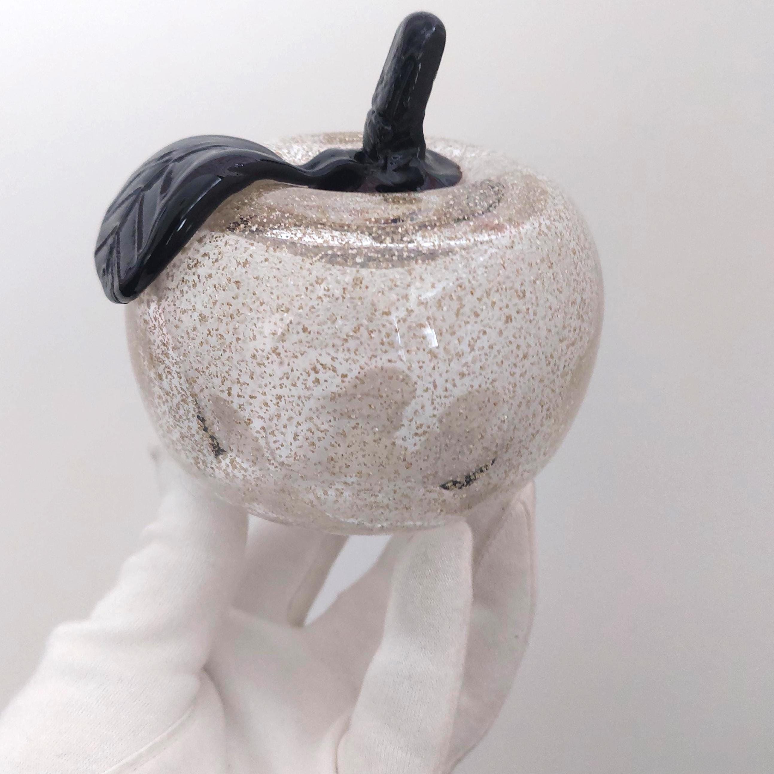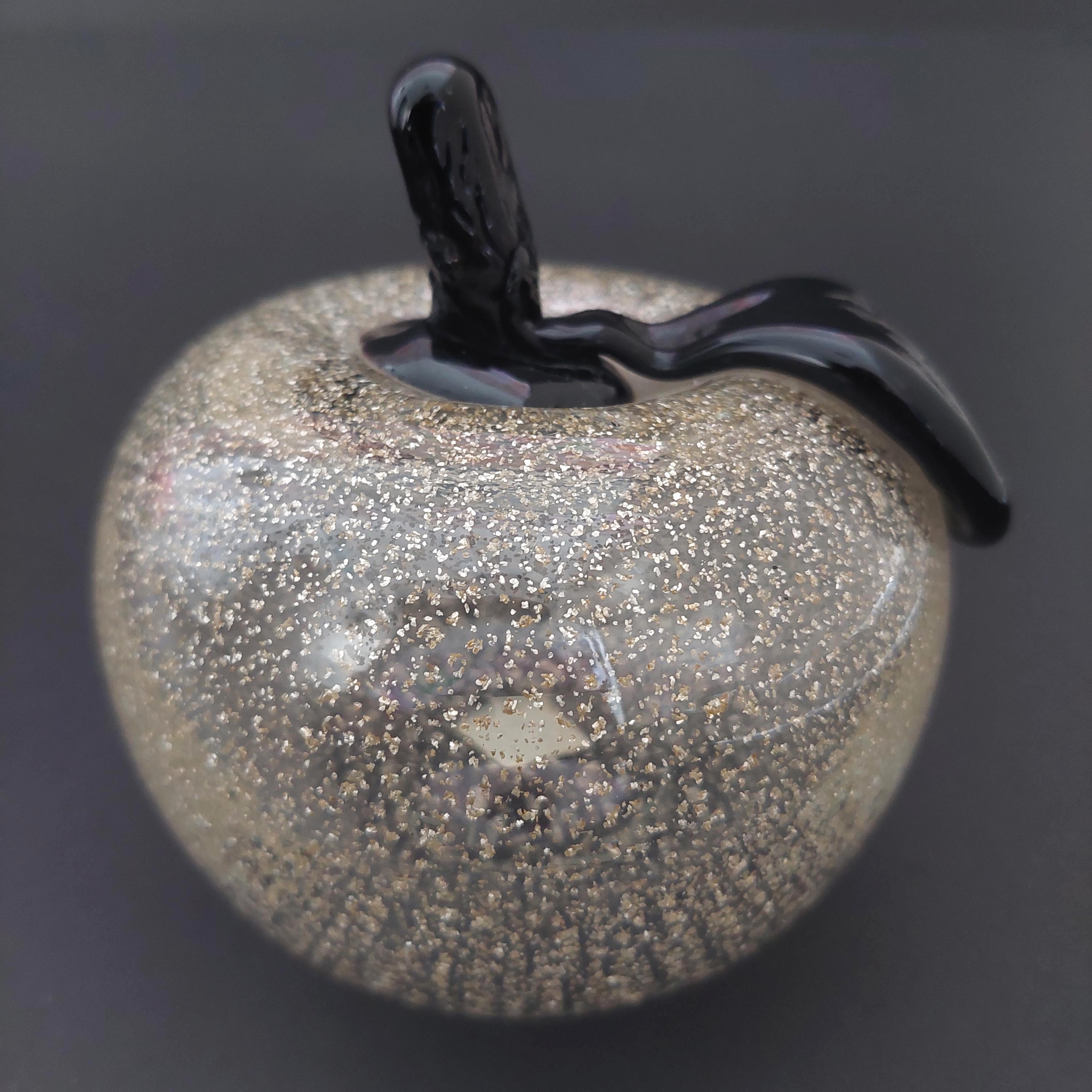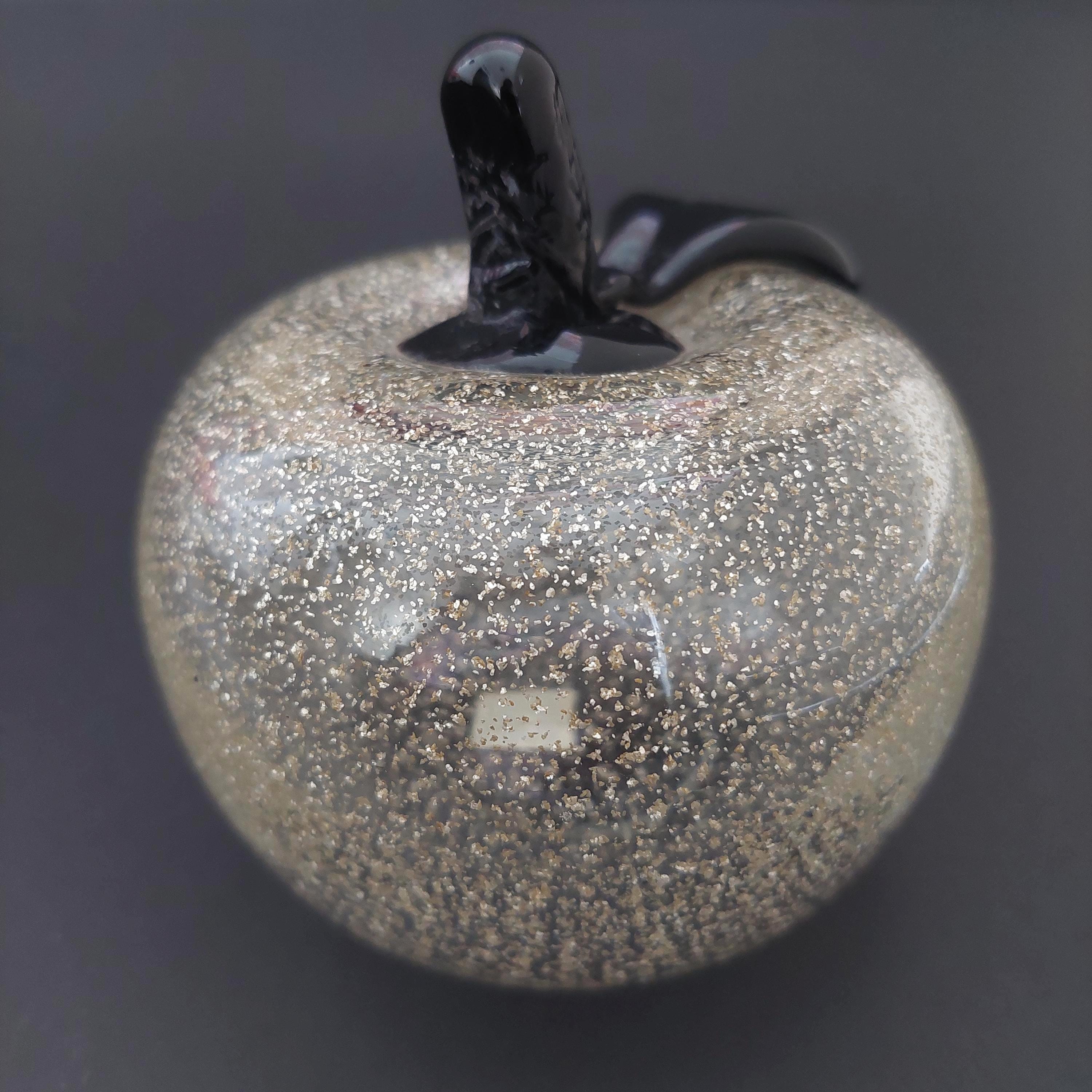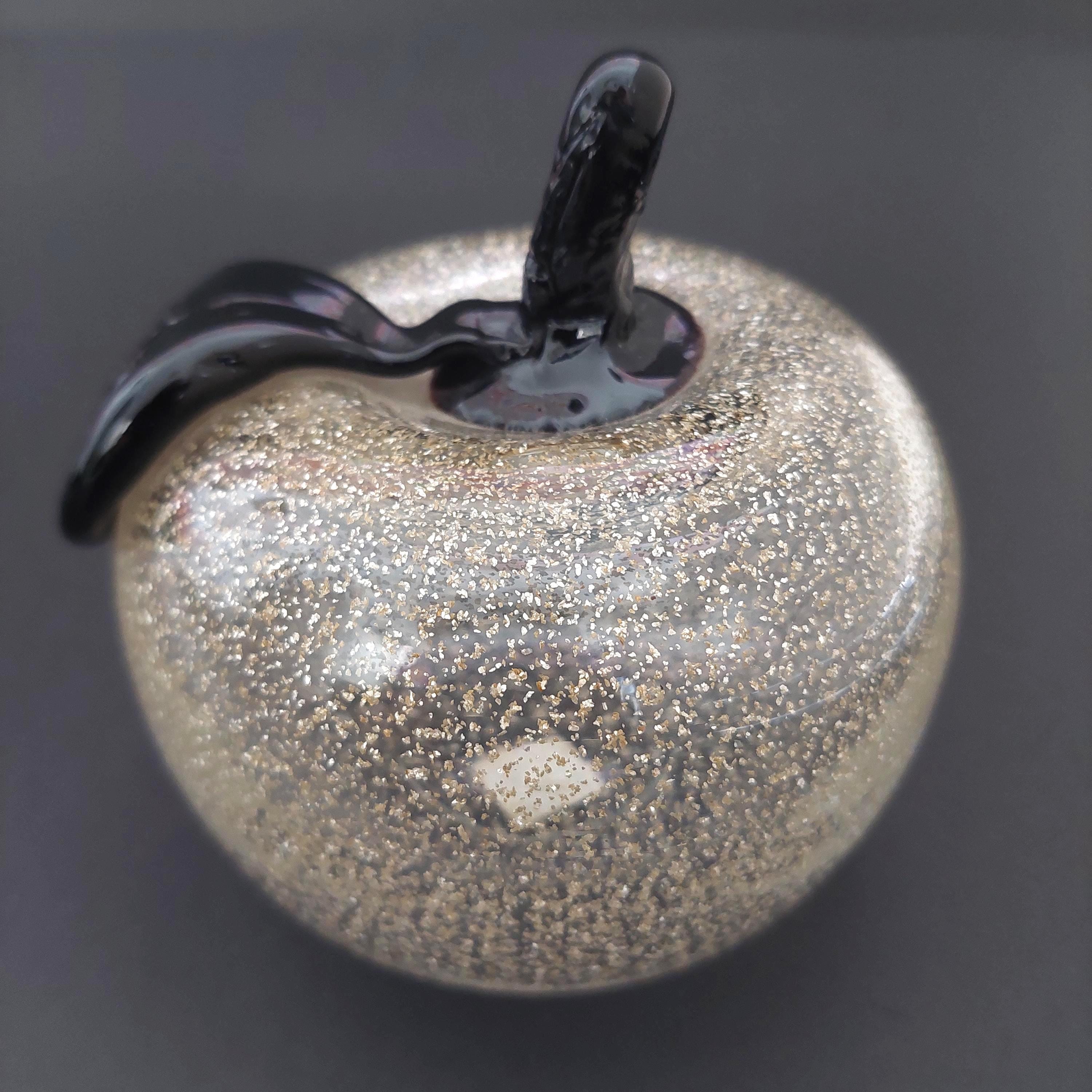 Murano thick, clear glass apple with golden flecks and black glass stem and leaf.