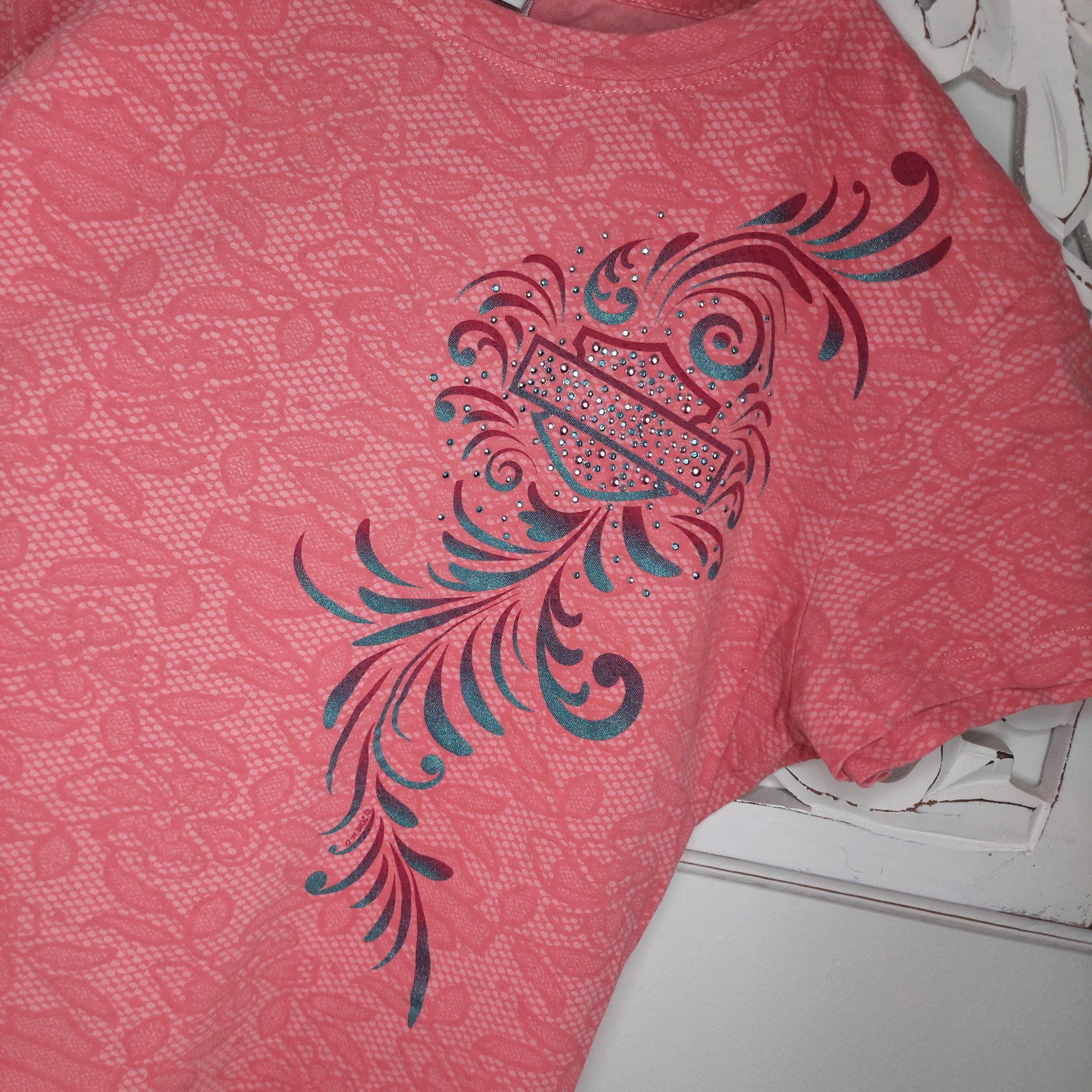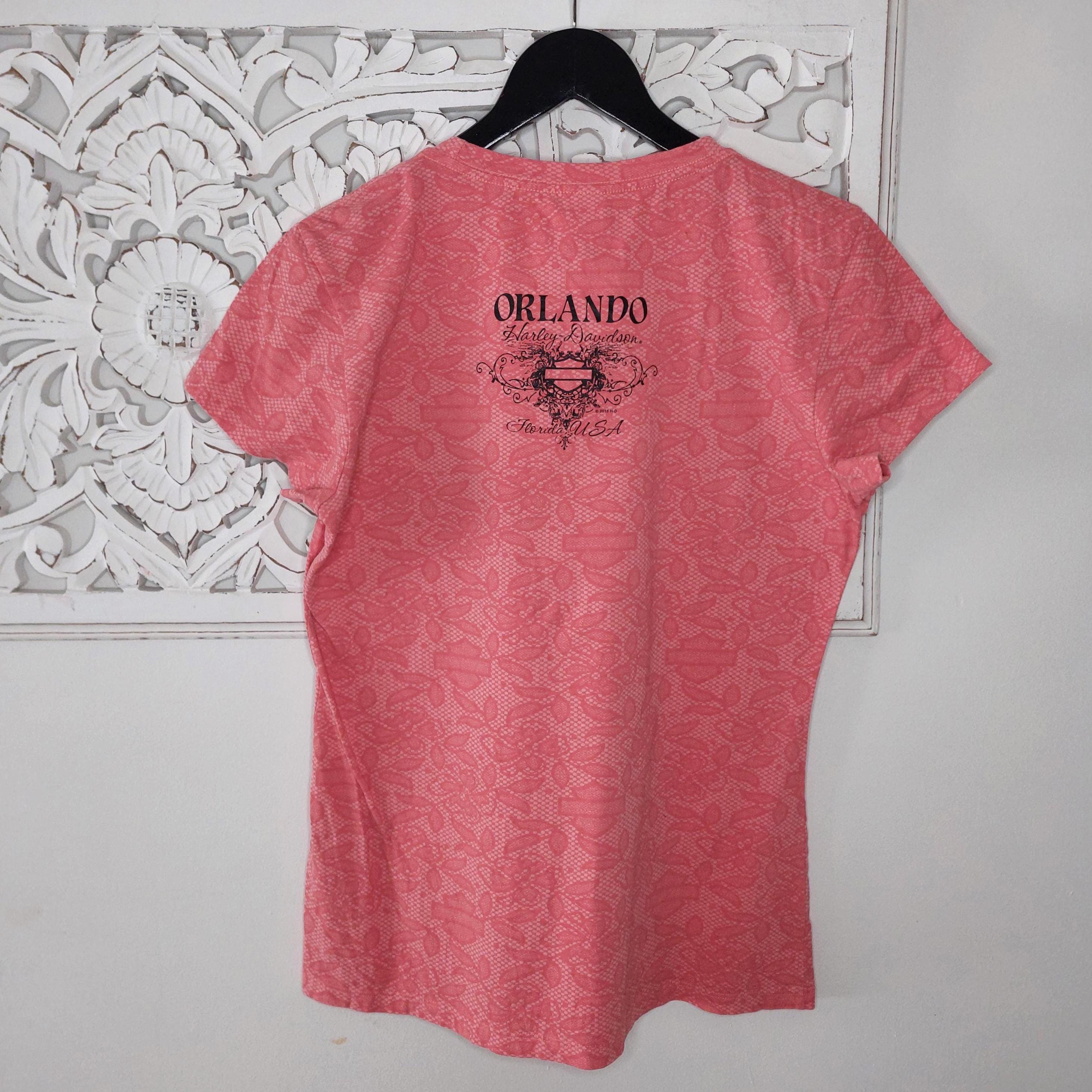 Vintage Harley Davidson Orlando Florida coral-orange short sleeve t-shirt. Featuring applied bling scrollwork with rhinestones.