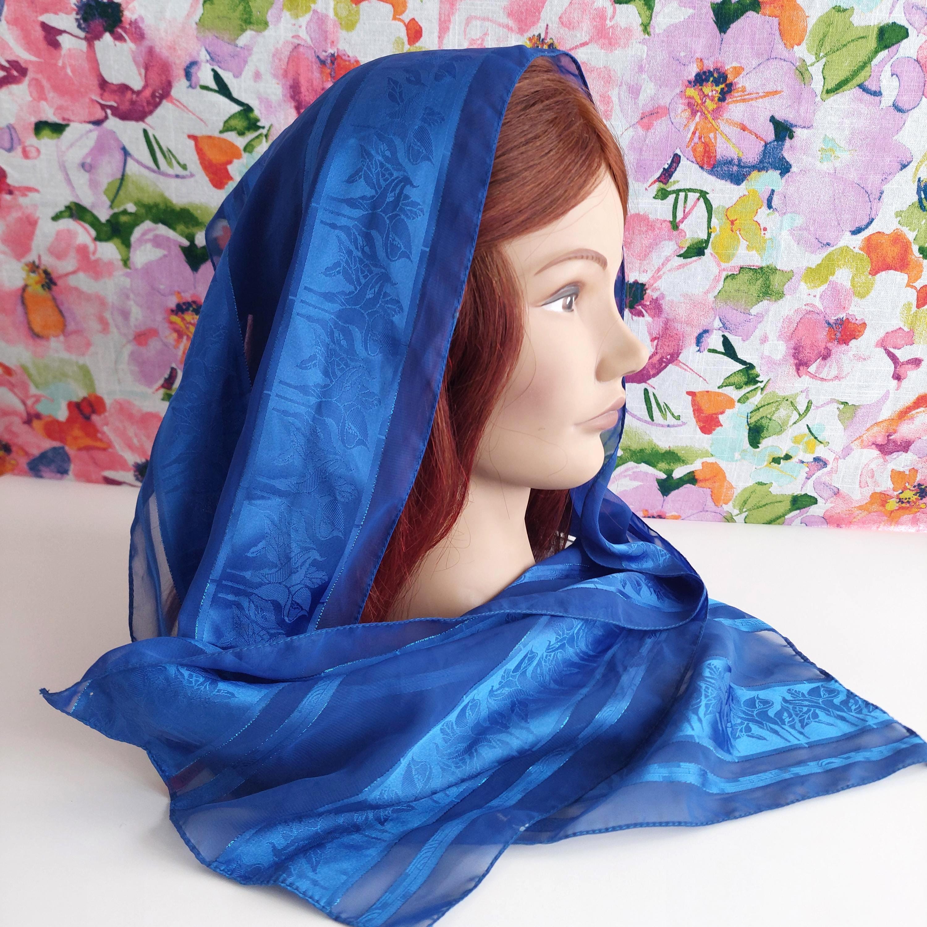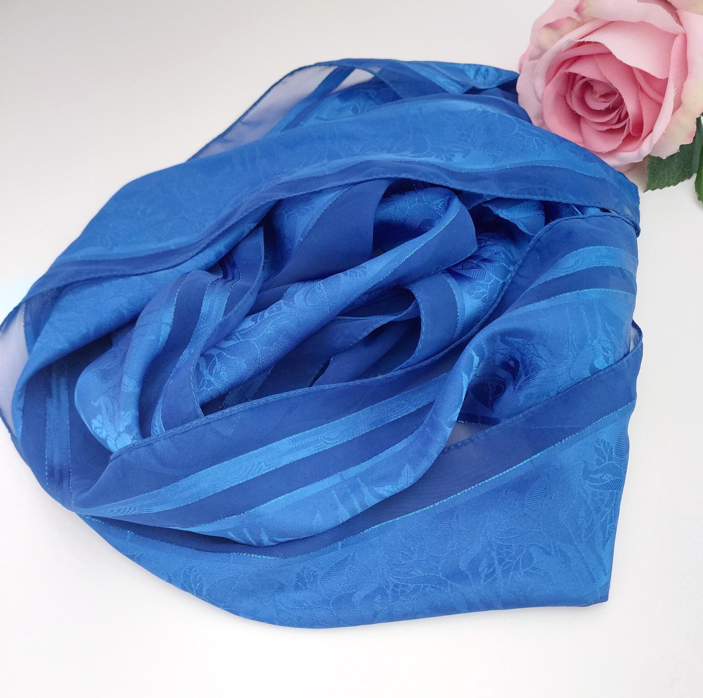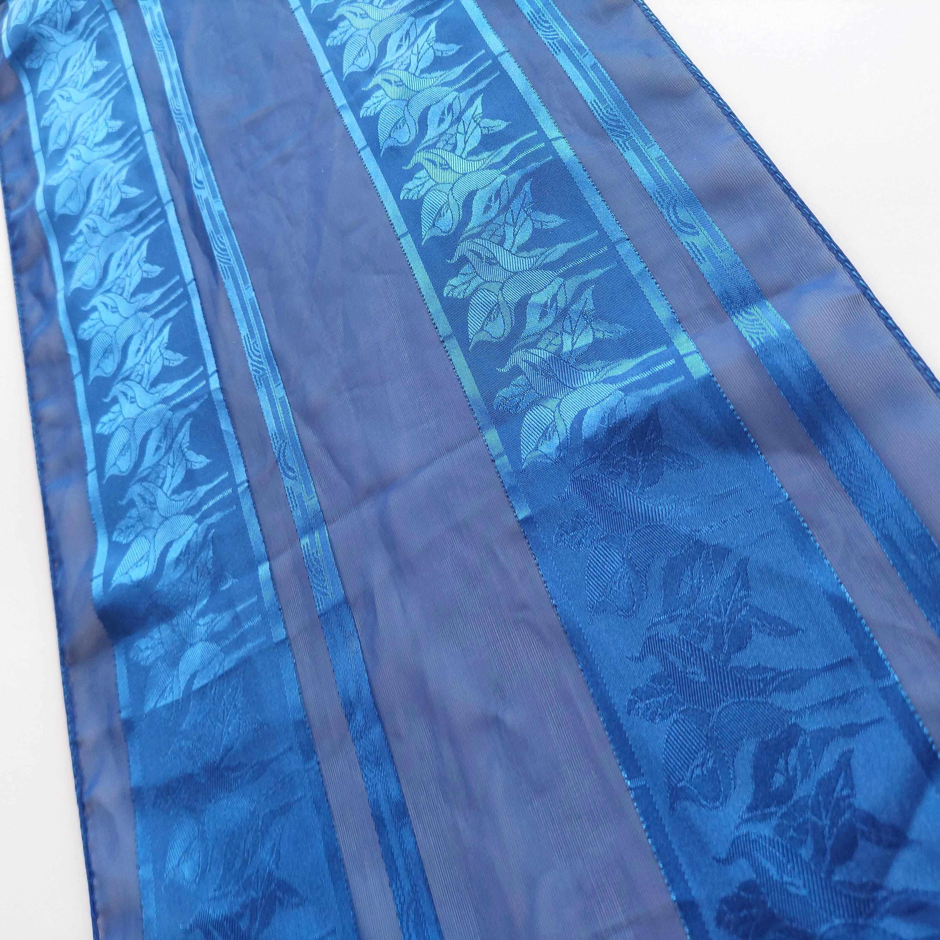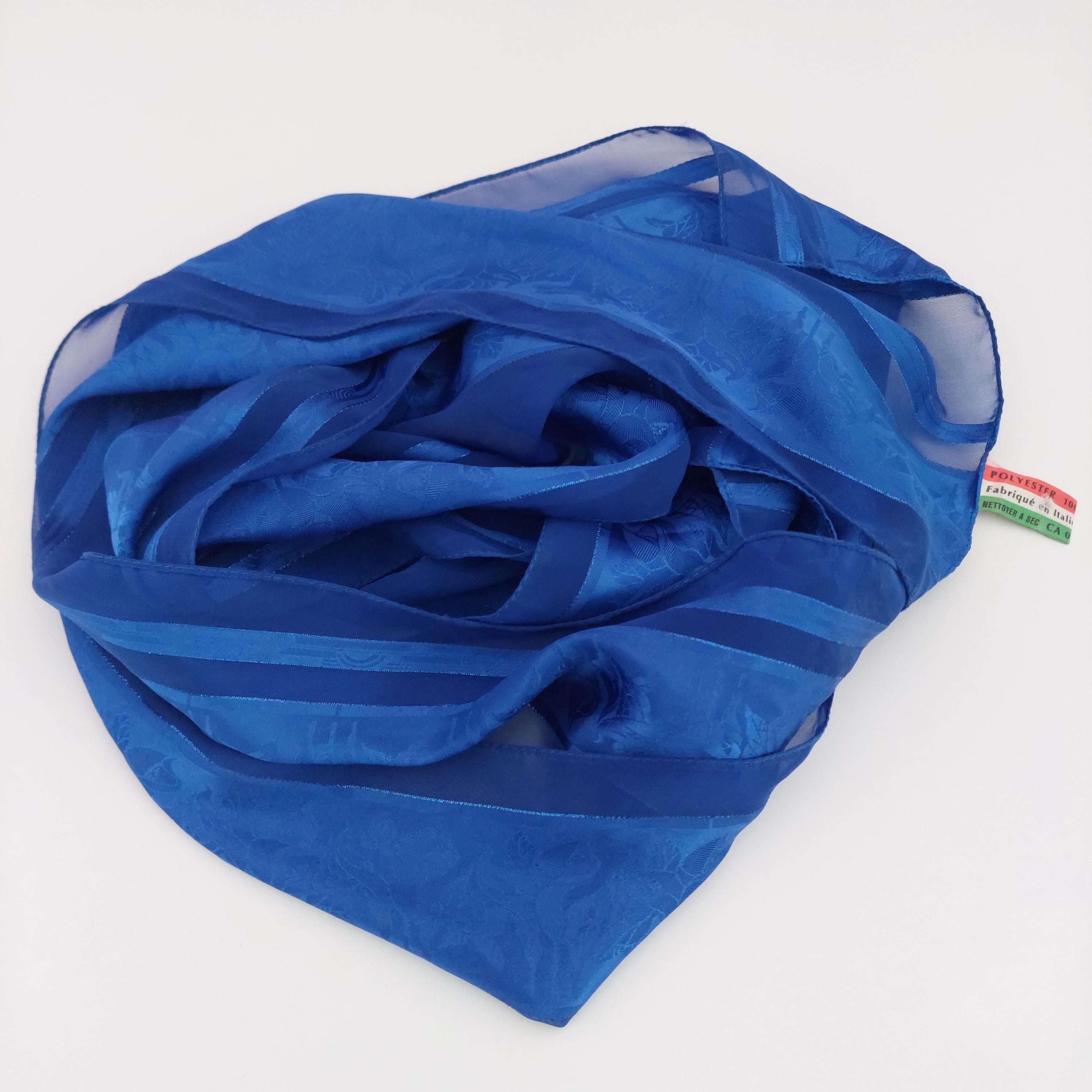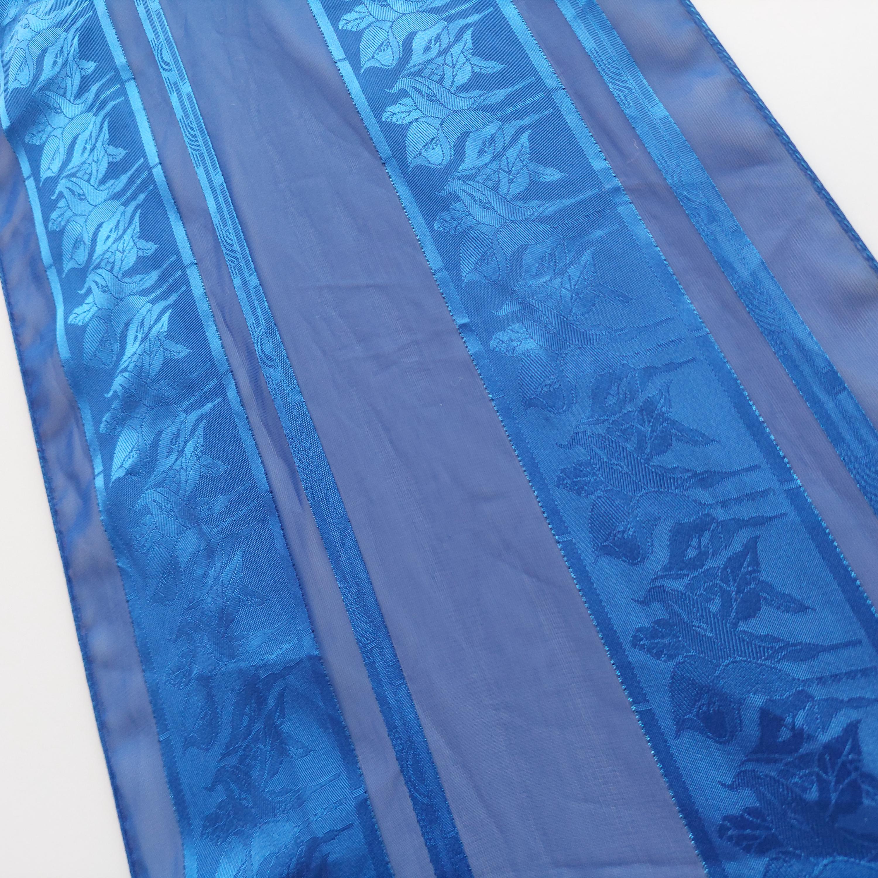 Italian royal blue polyester long scarf featuring alternating sheer panels and a floral jacquard pattern that is visible when caught in the light.