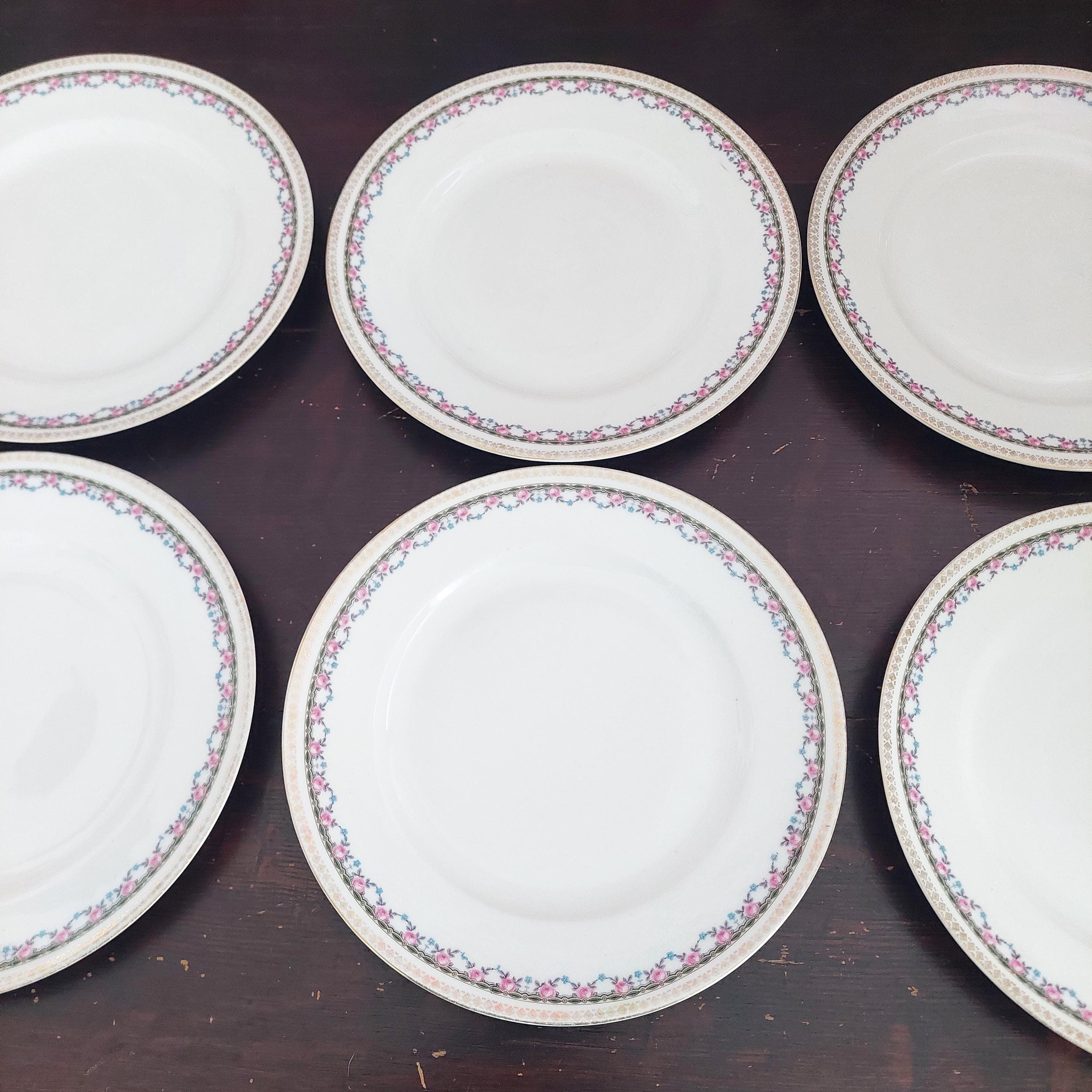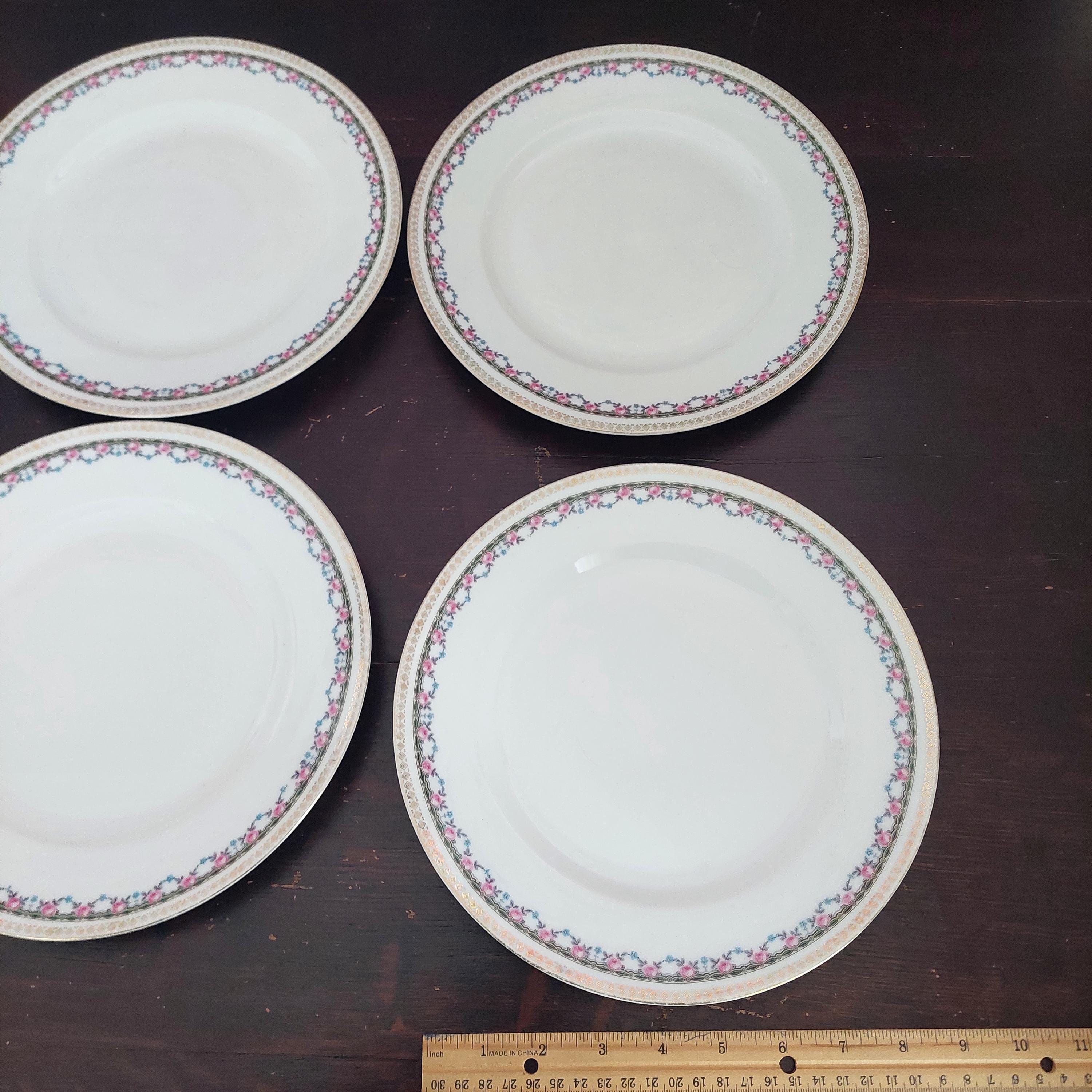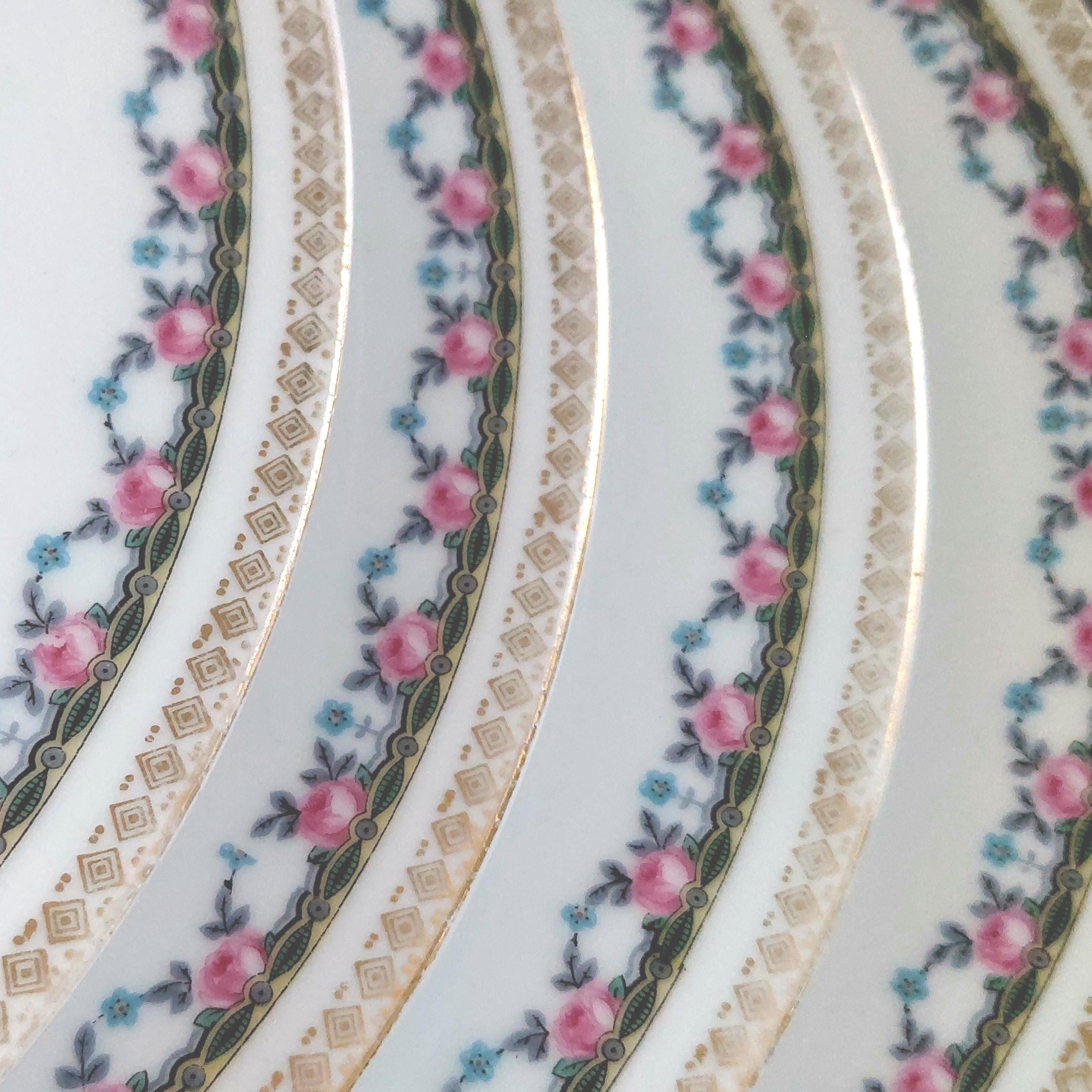 4-piece or set of 2 vintage porcelain dinner plate set. Plates feature pink rose and blue flower floral swags, a geometric band in yellow, green and black and a gold diamond shaped border on the edge.