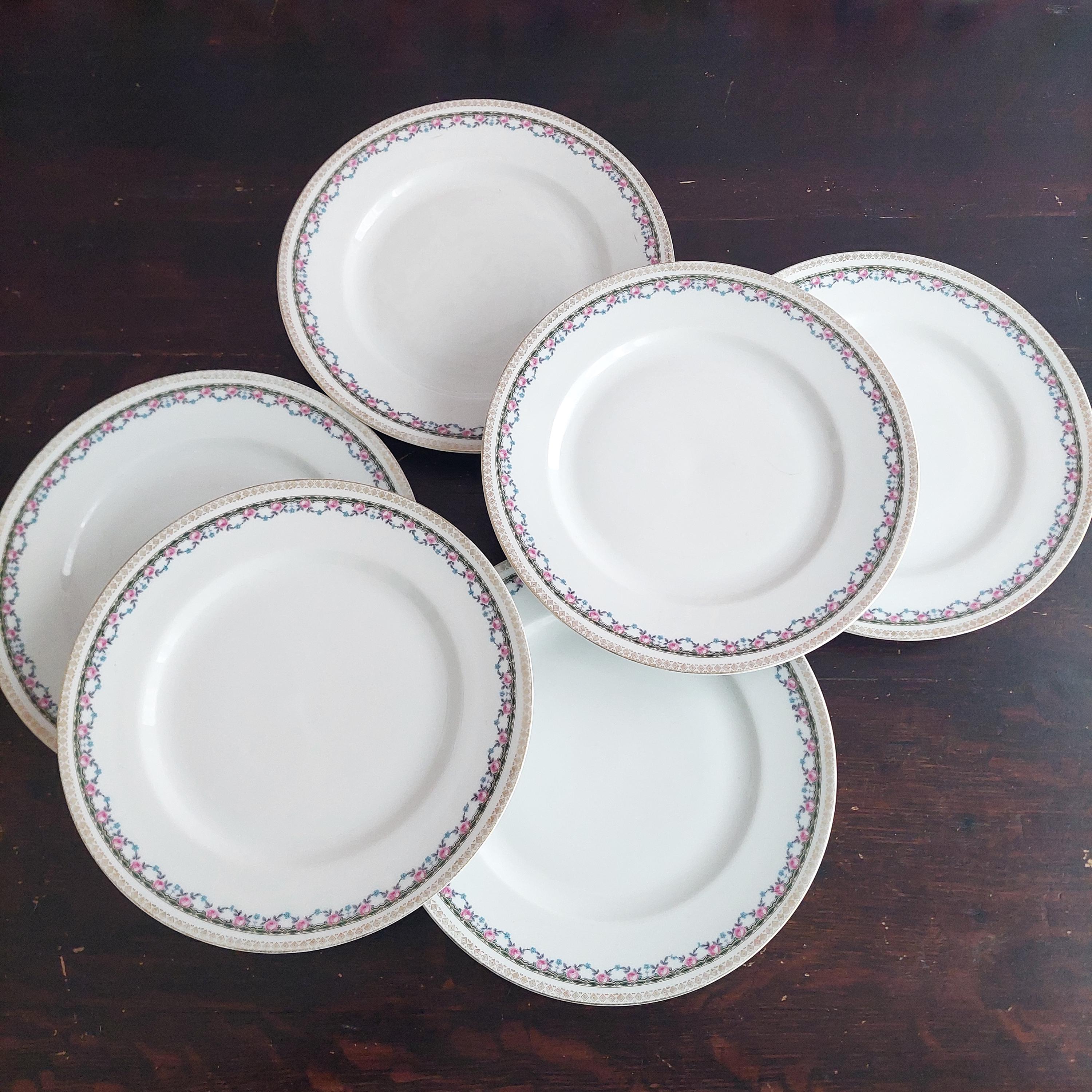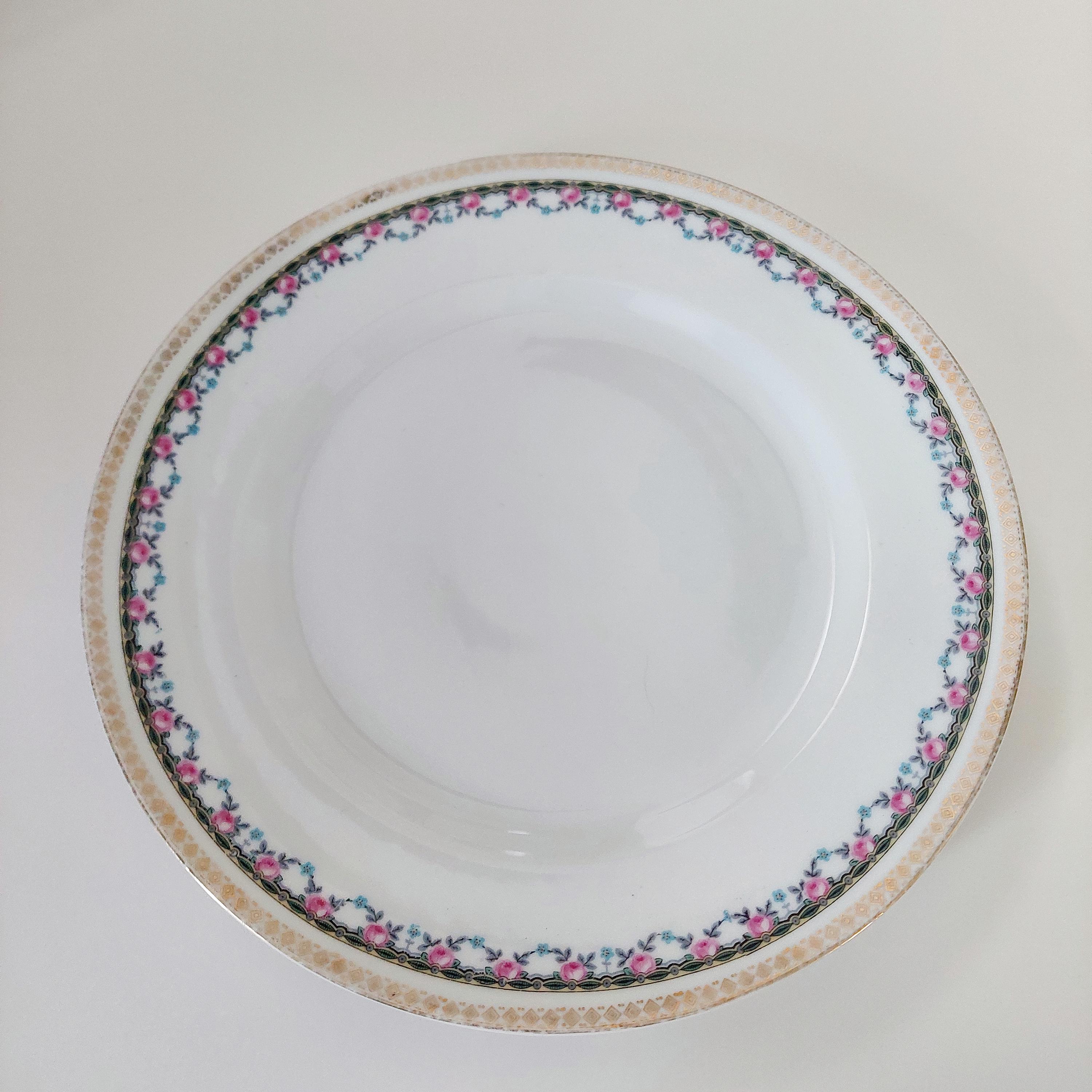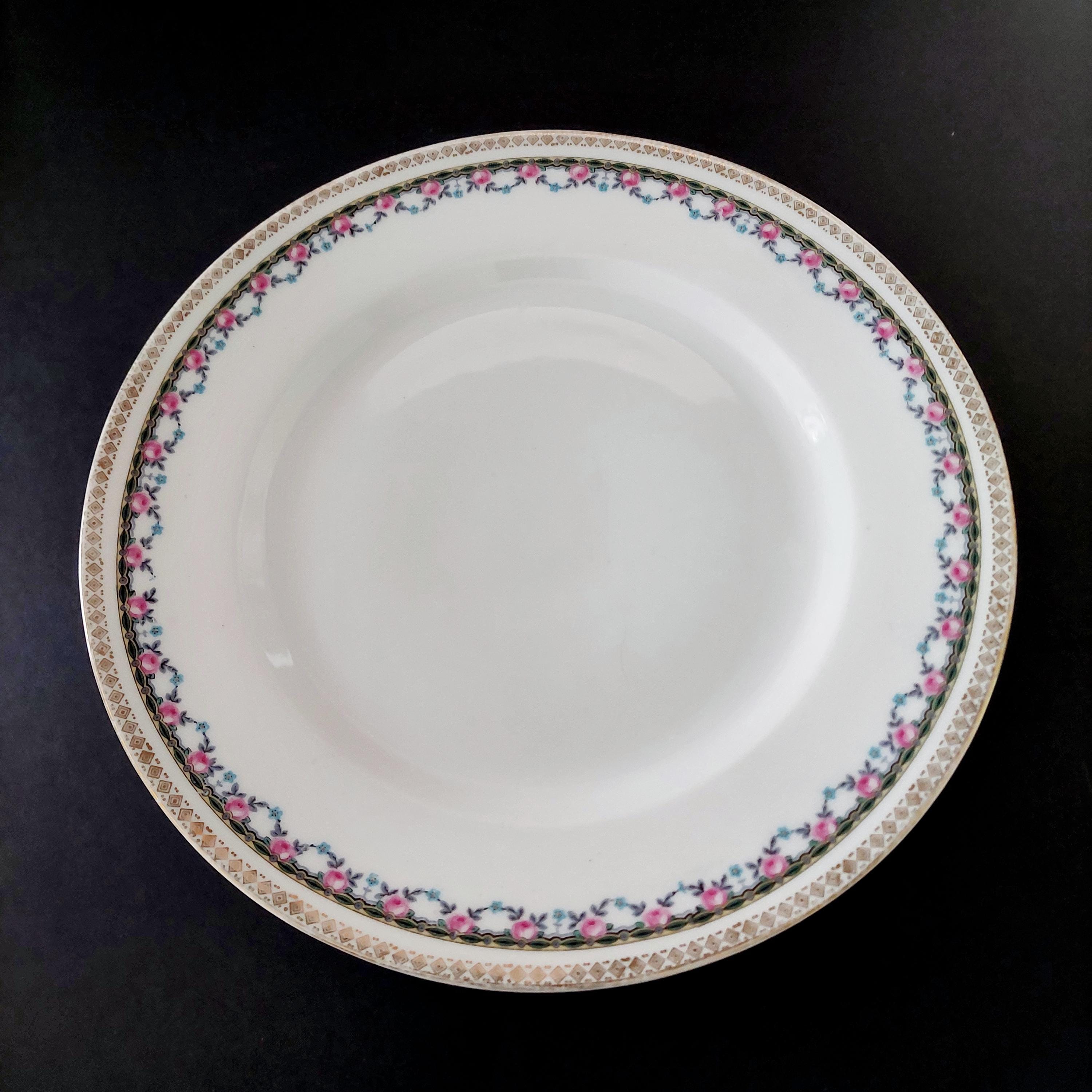 4-piece or set of 2 vintage porcelain dinner plate set. Plates feature pink rose and blue flower floral swags, a geometric band in yellow, green and black and a gold diamond shaped border on the edge.