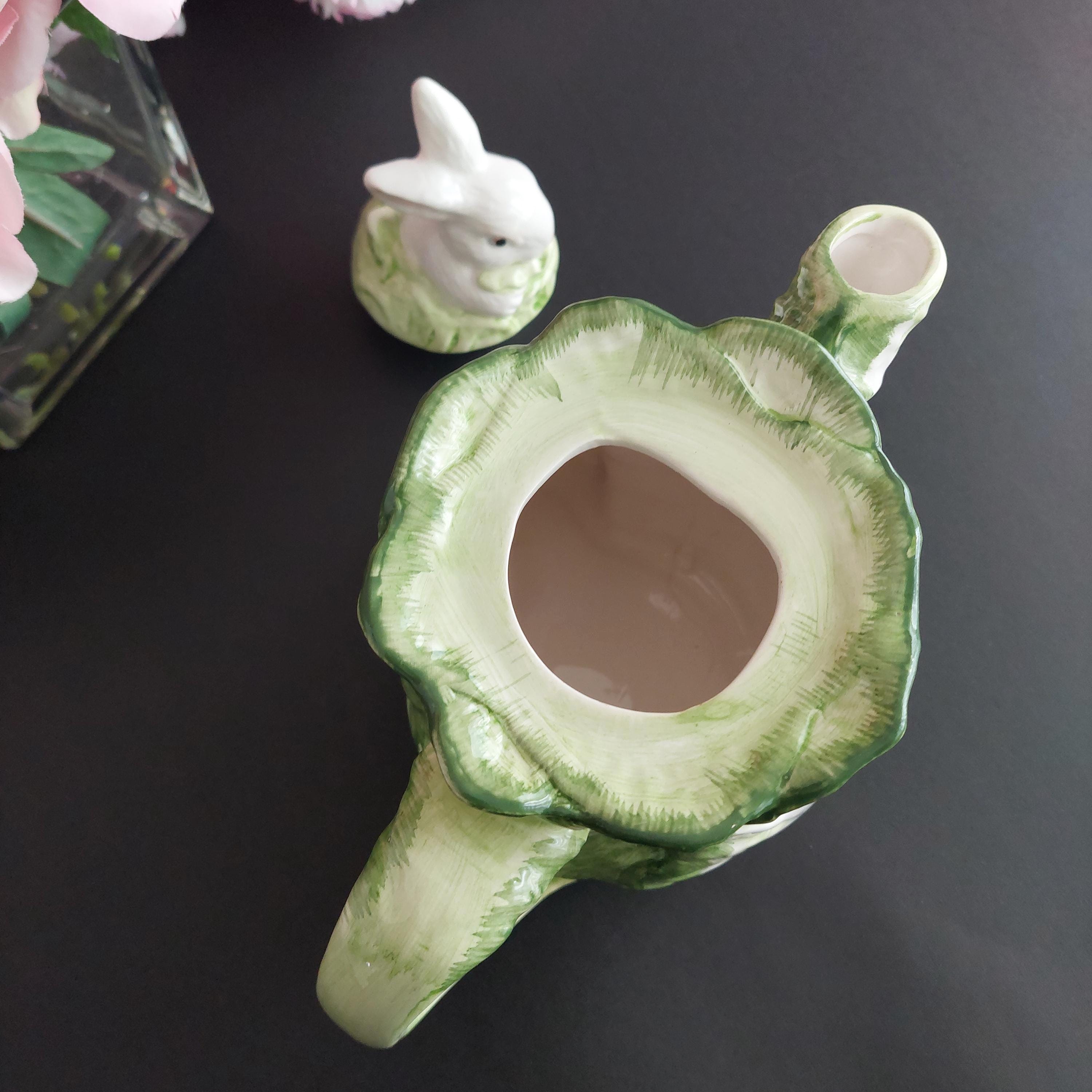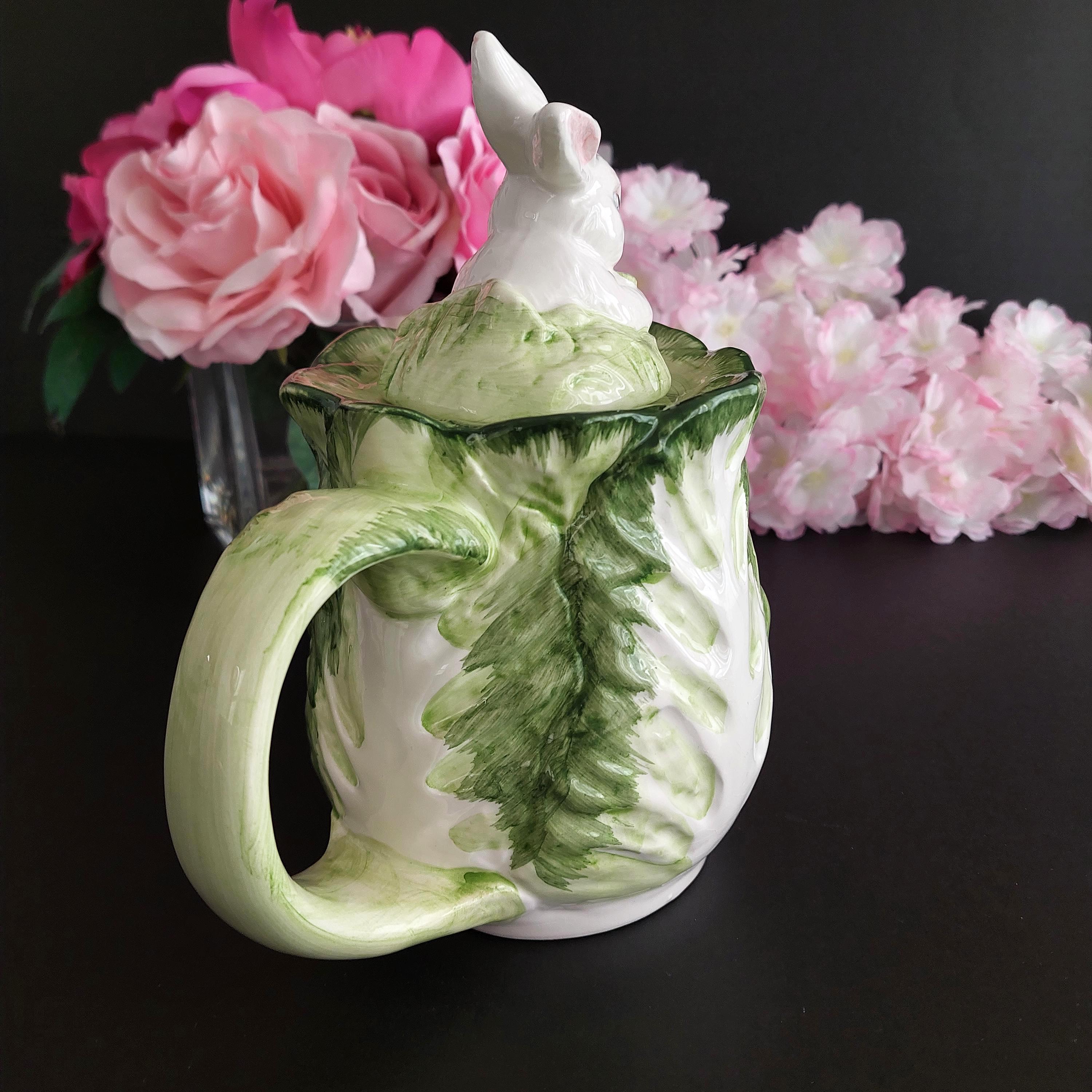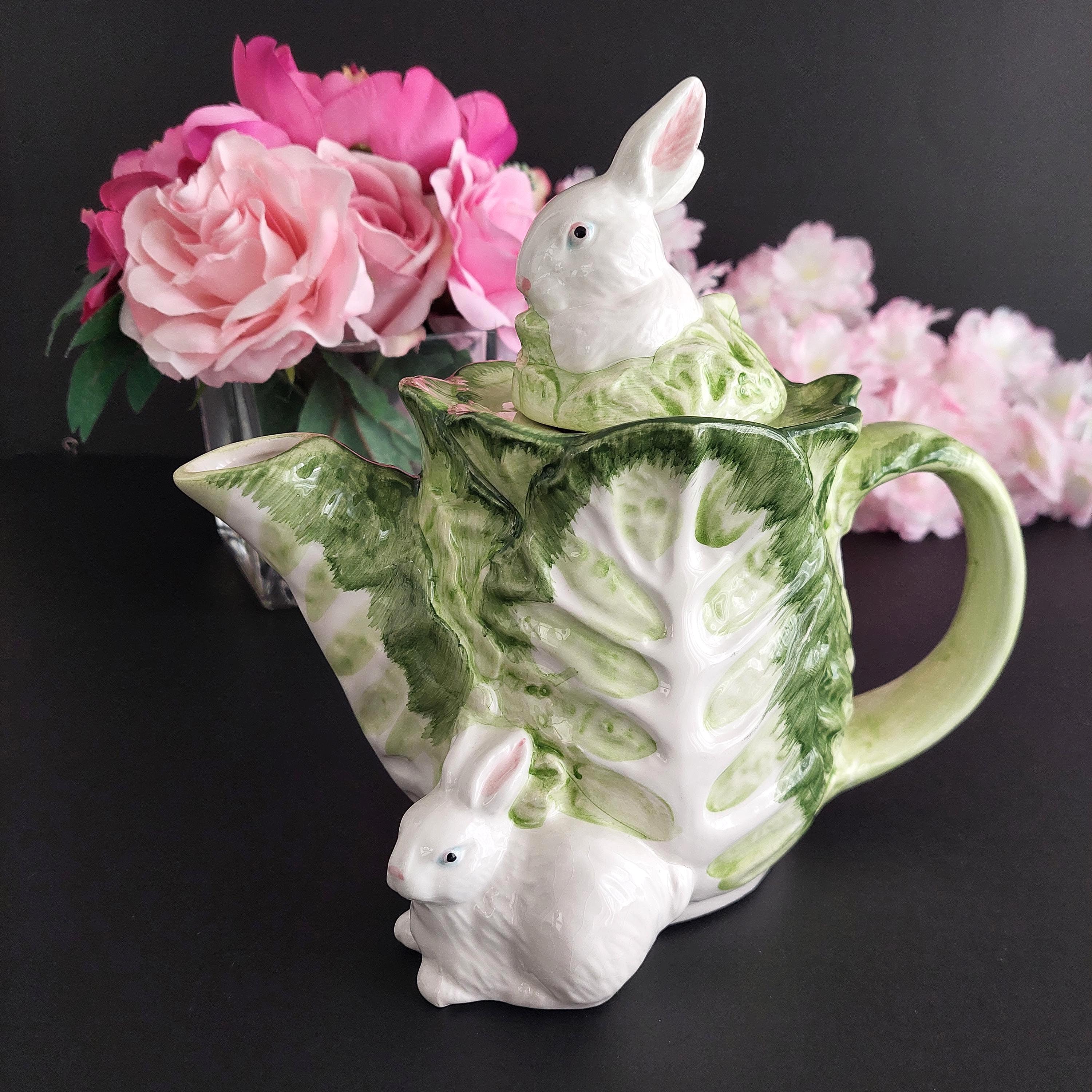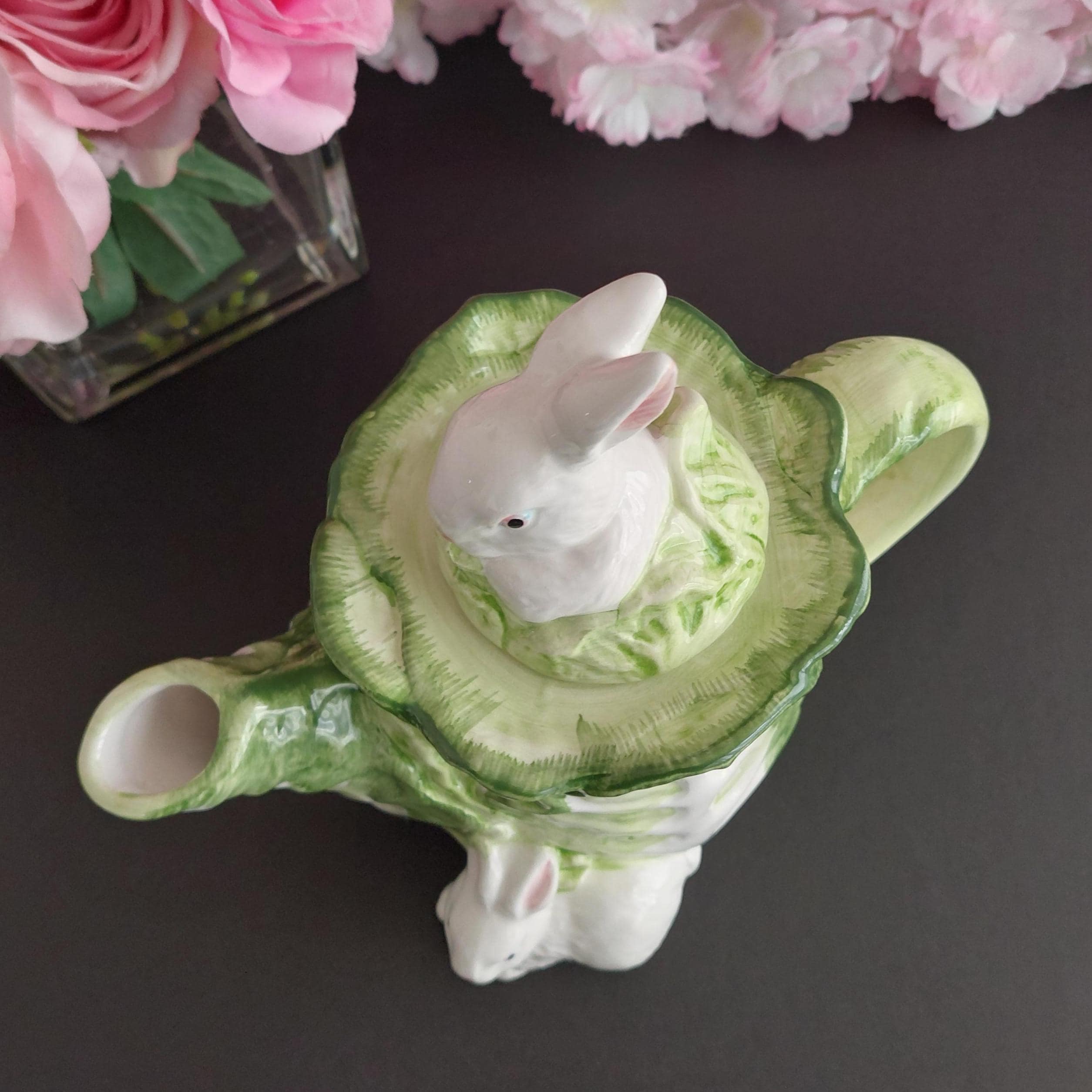 Vintage figural teapot featuring cute white bunnies in a cabbage patch.