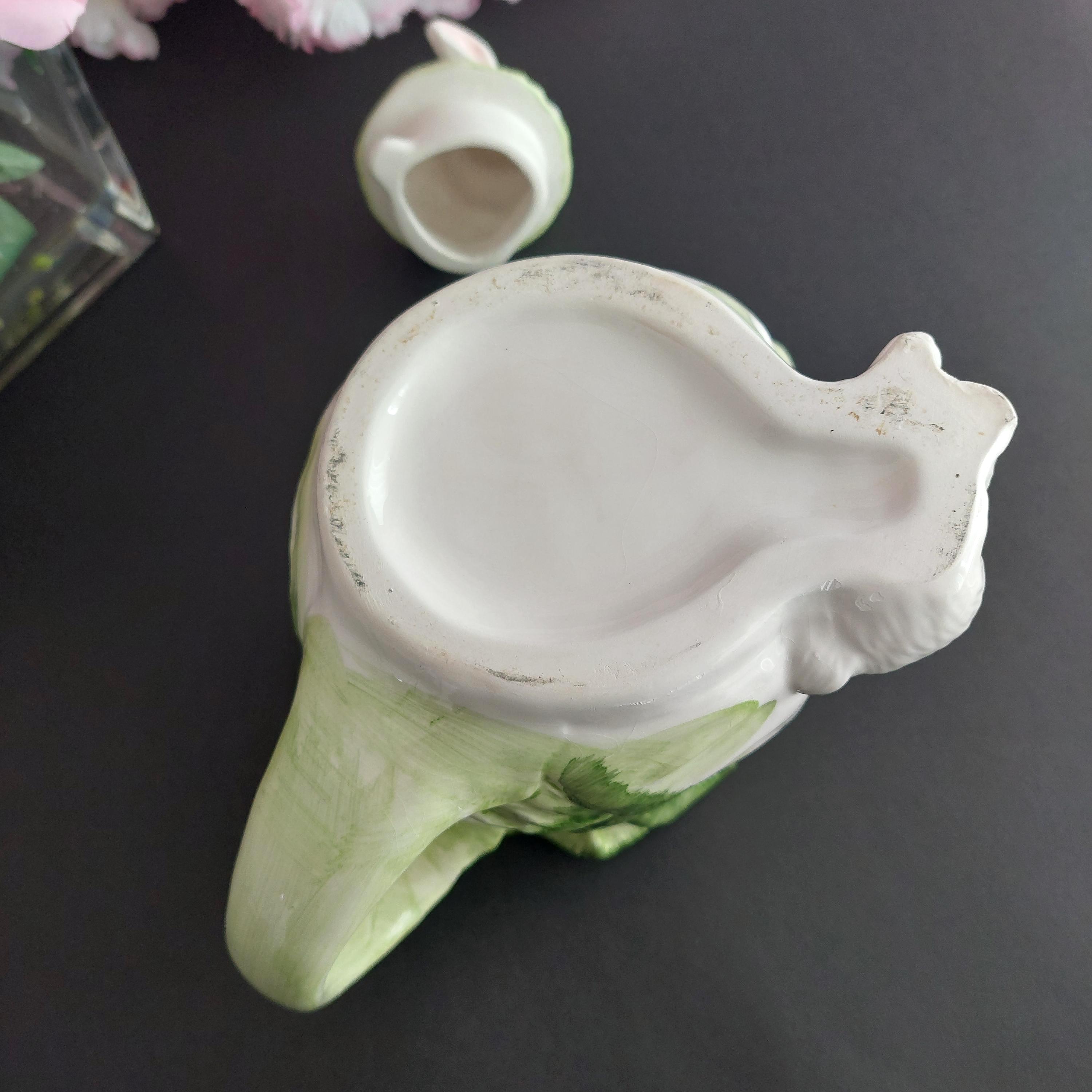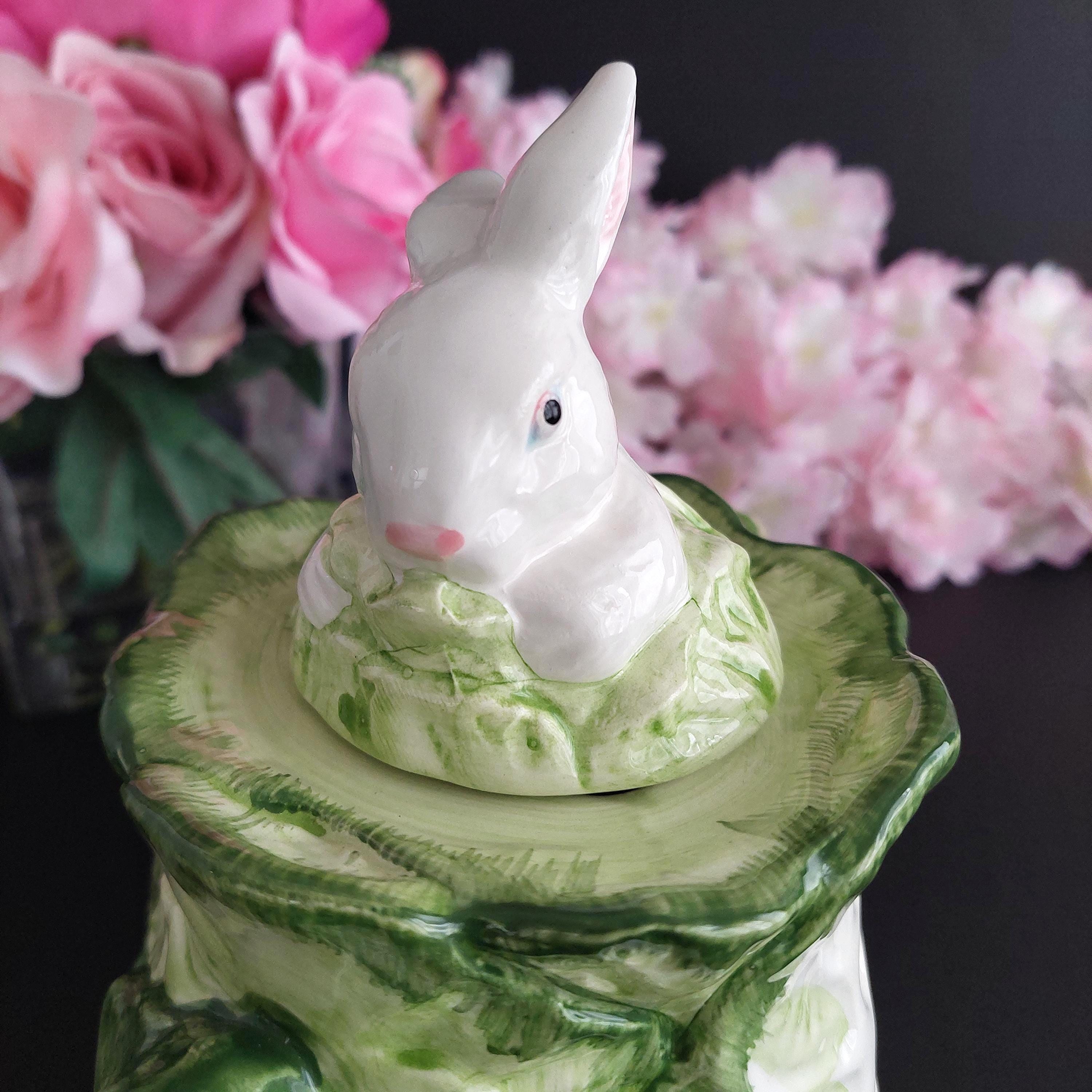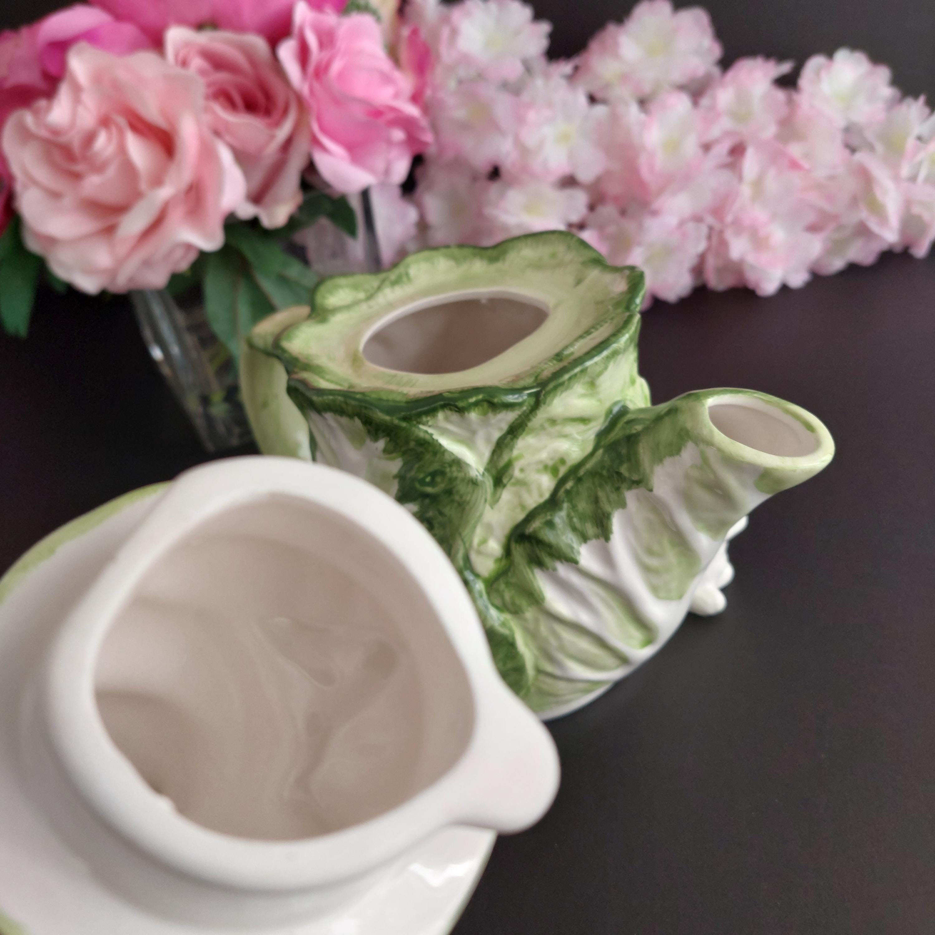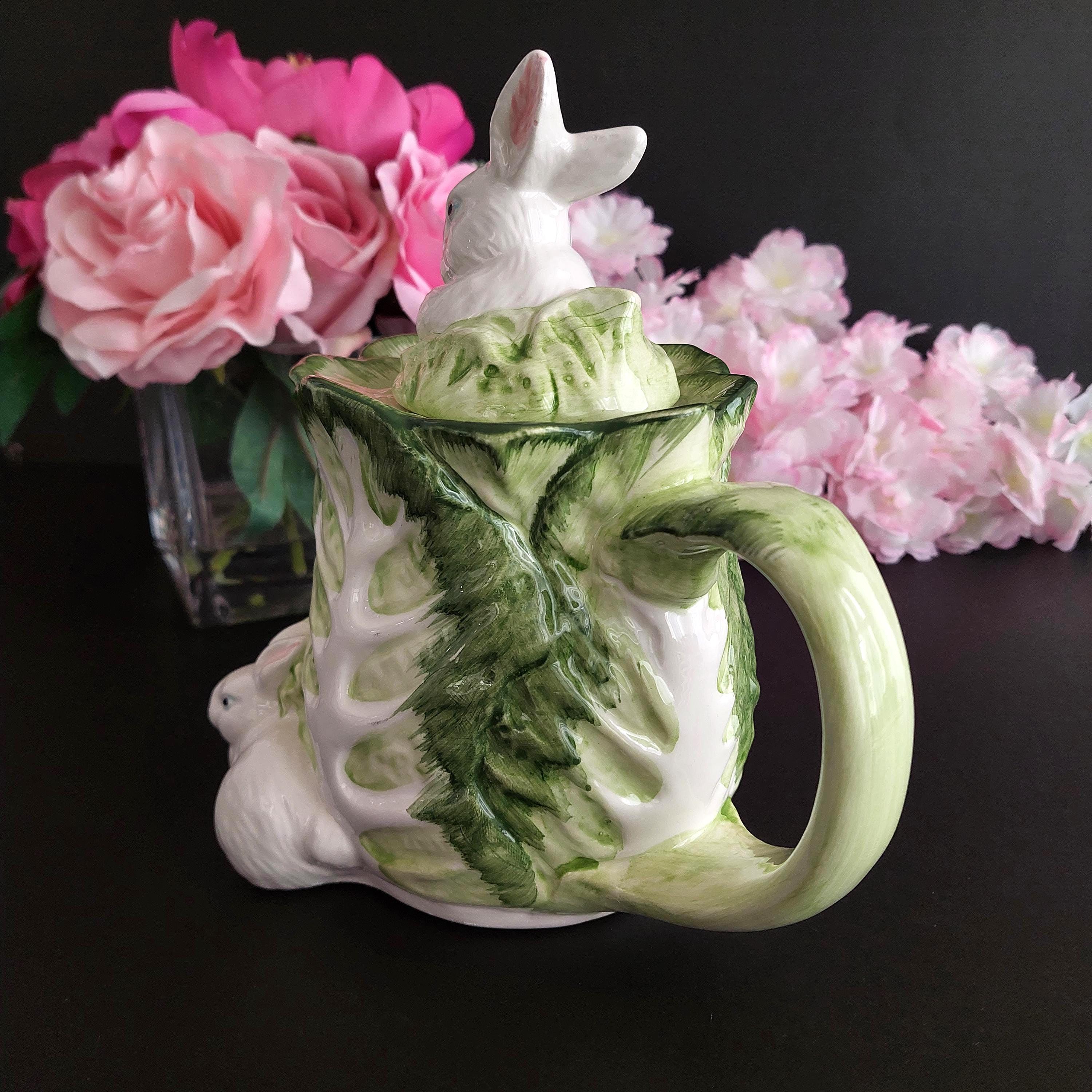 Vintage figural teapot featuring cute white bunnies in a cabbage patch.
