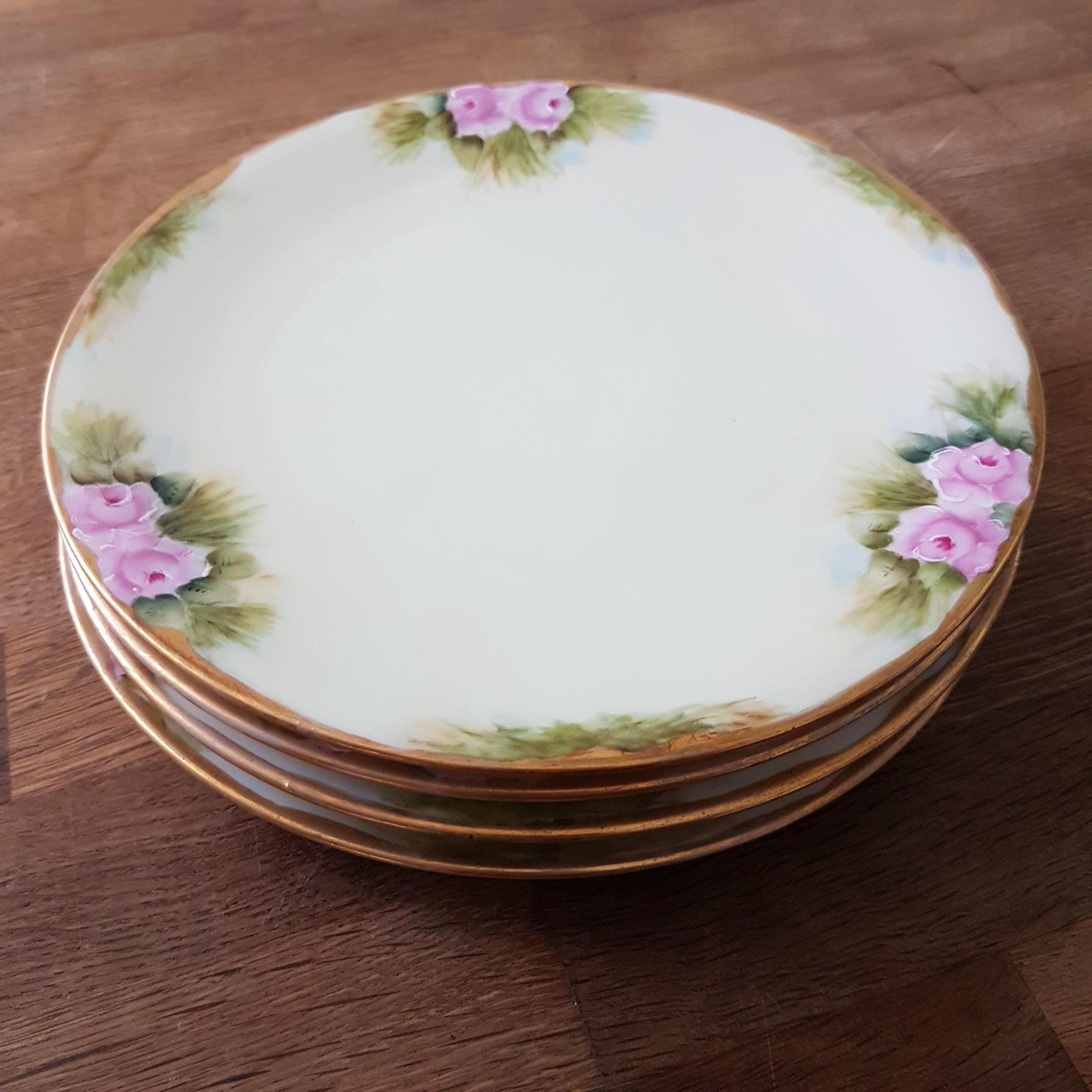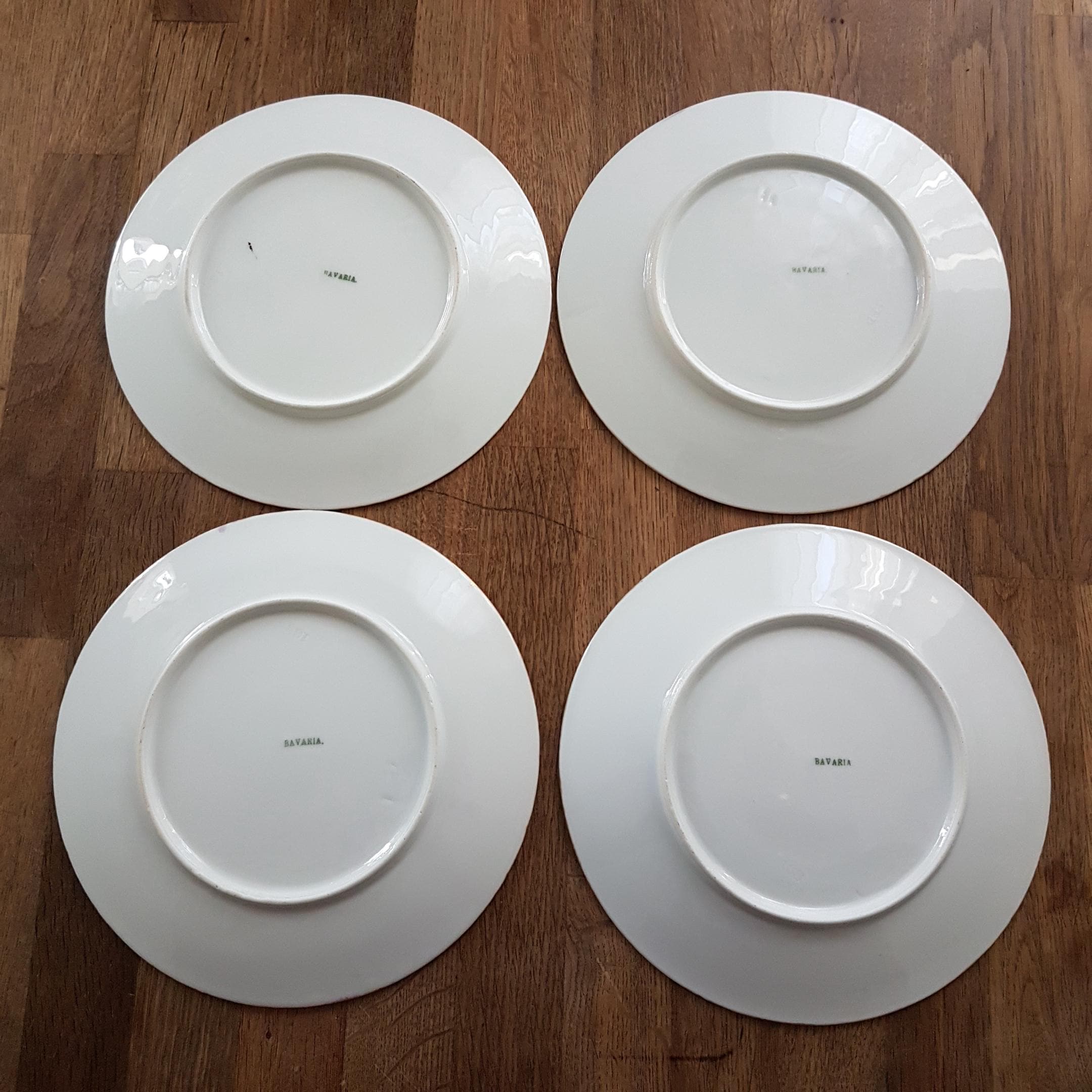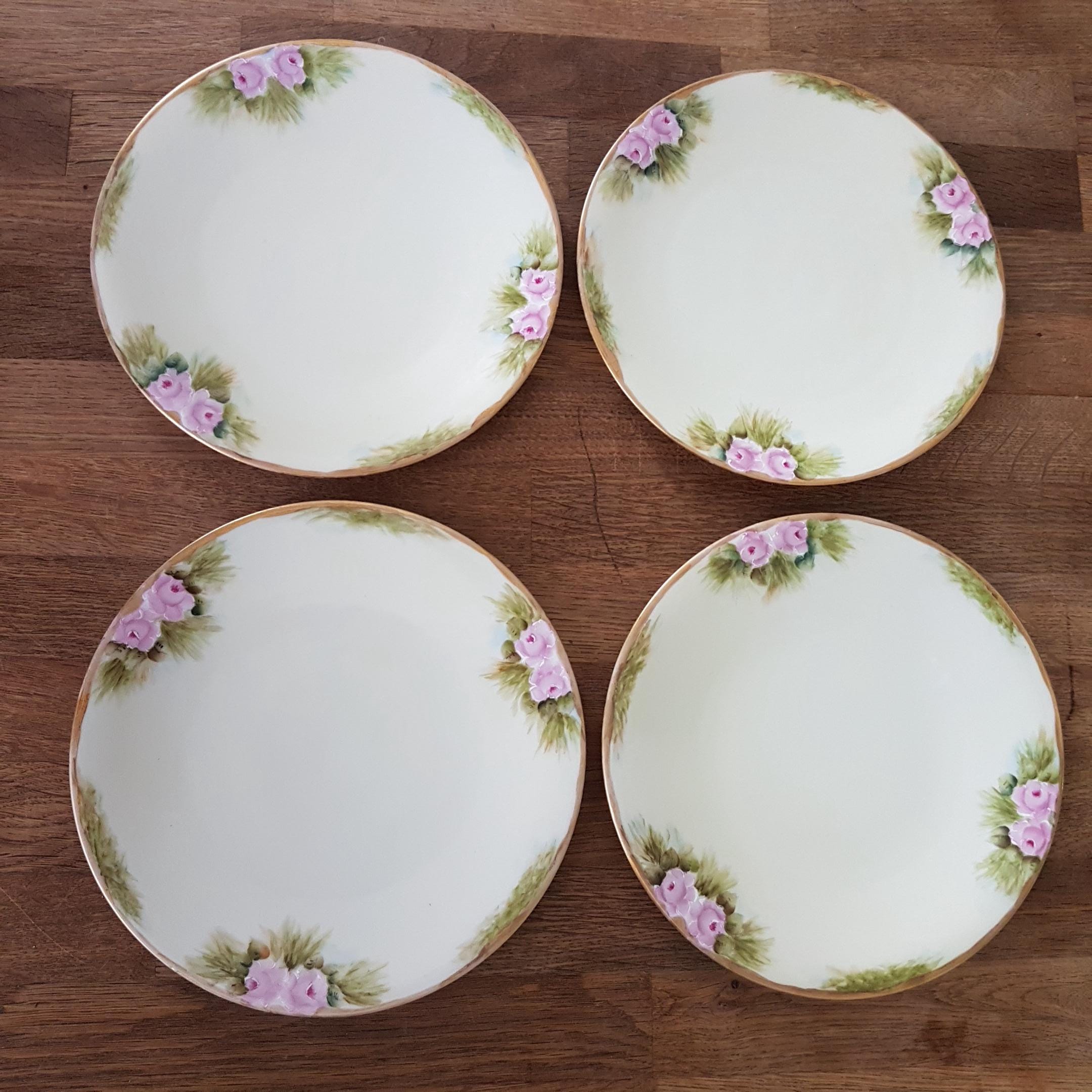 4-piece vintage Bavaria hand painted porcelain dessert plates featuring delicate light pink roses and green foliage on a soft pastel green background. Hand painted gold edge. Made in Bavaria, Germany