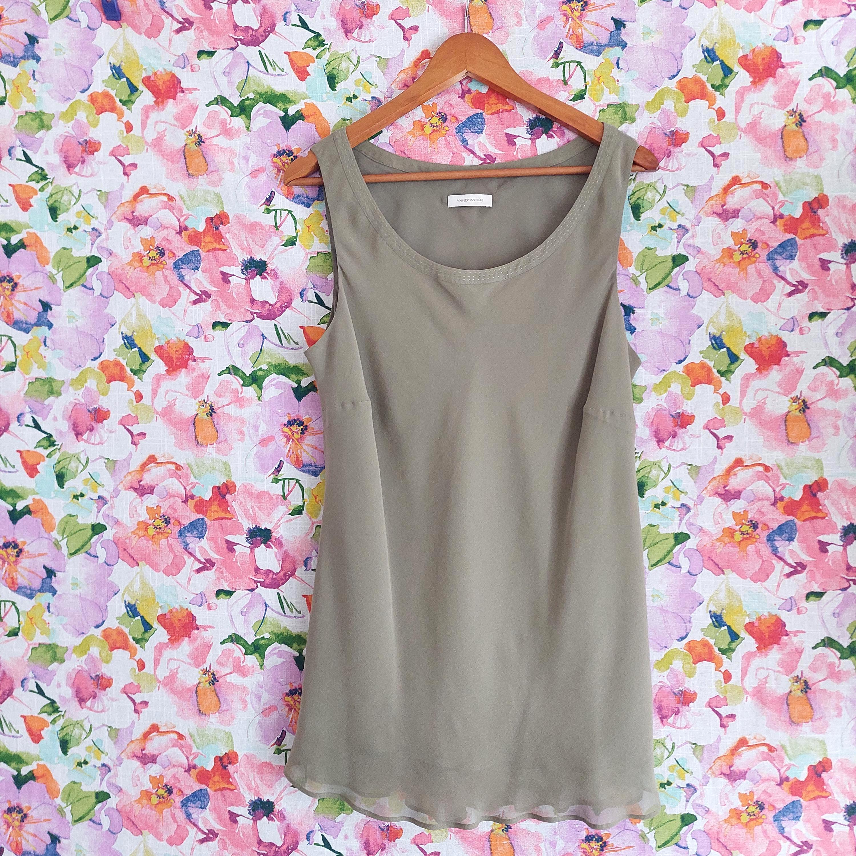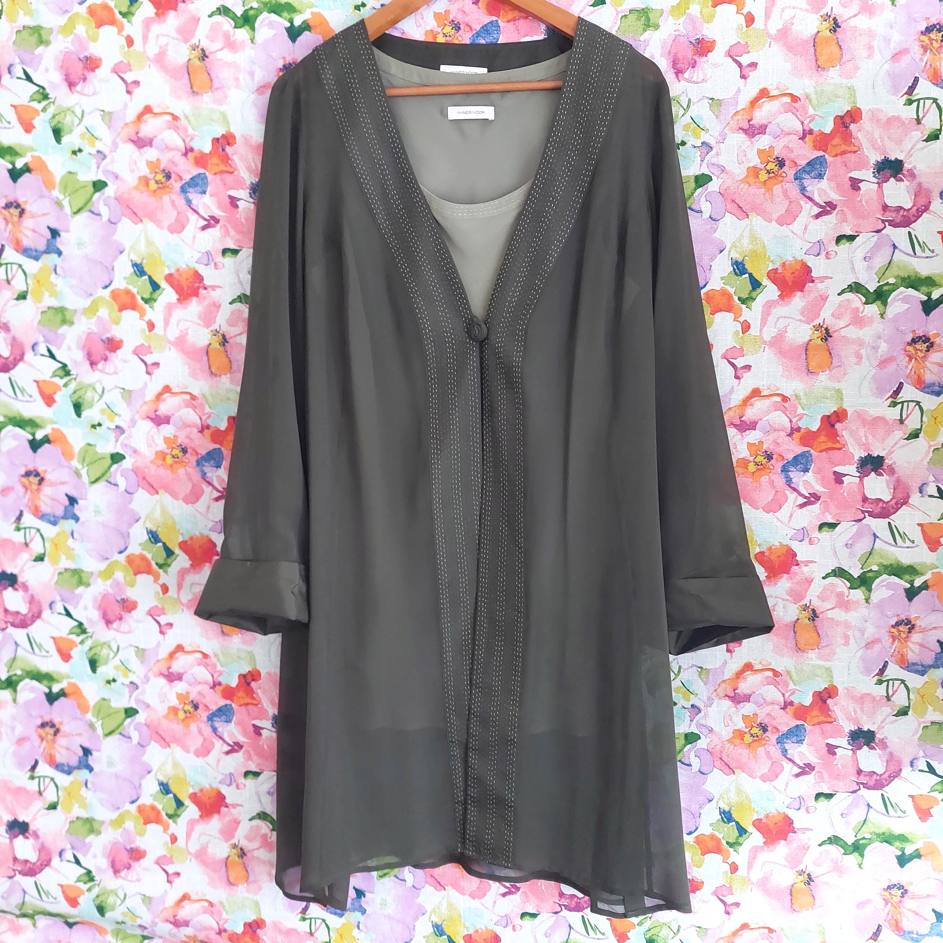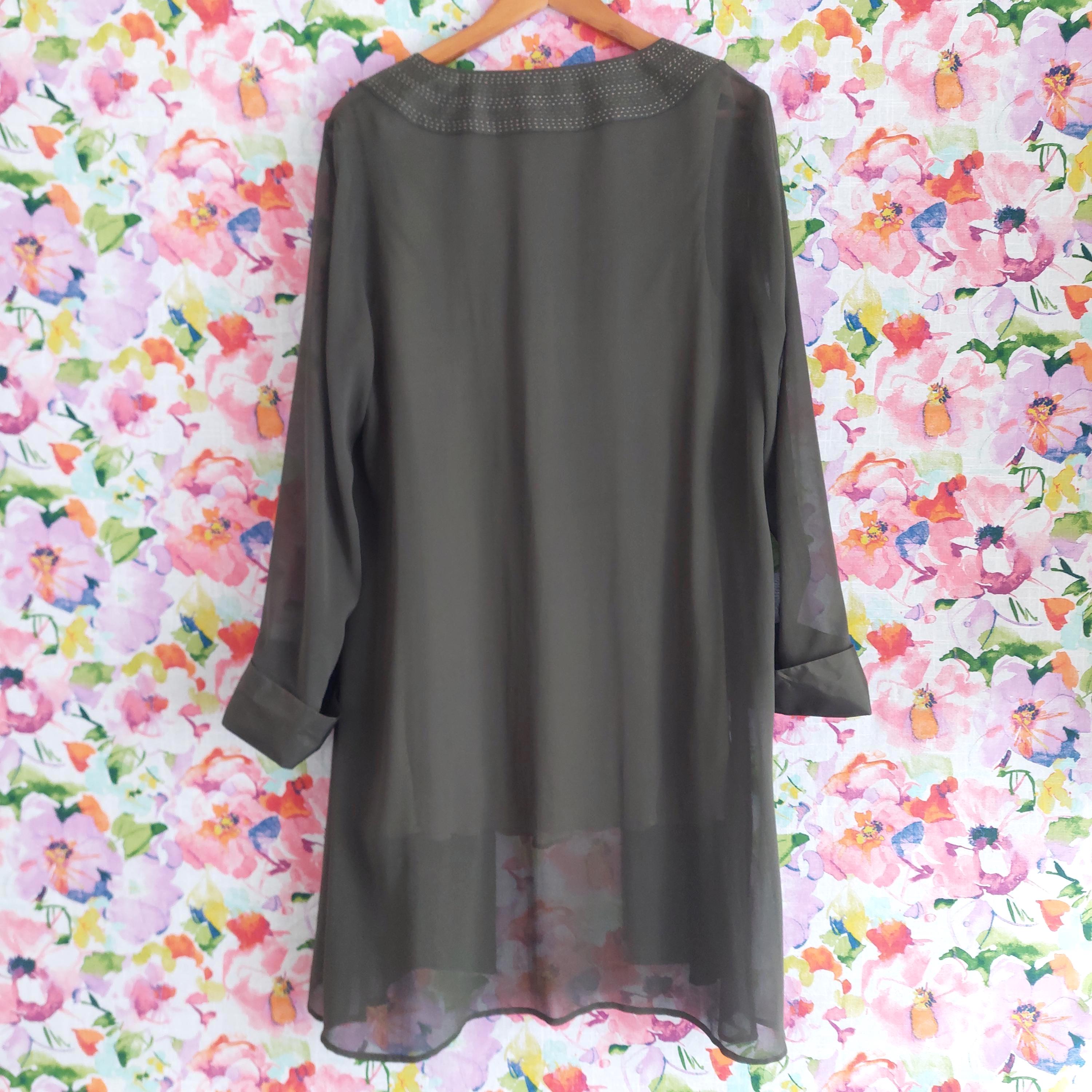Olive-toned sheer silk chiffon long-line jacket with matching sleeveless chiffon polyester double-layered tank top.