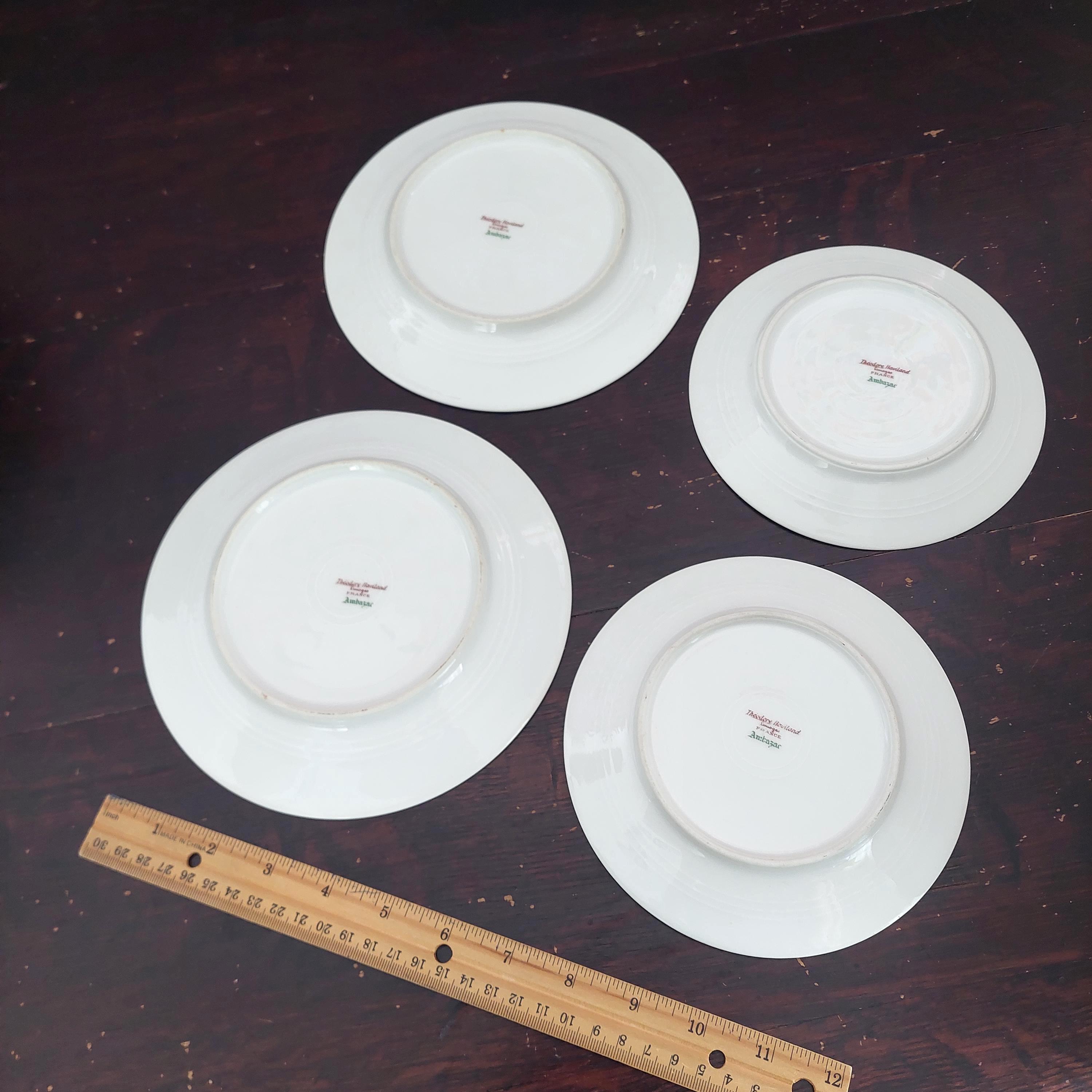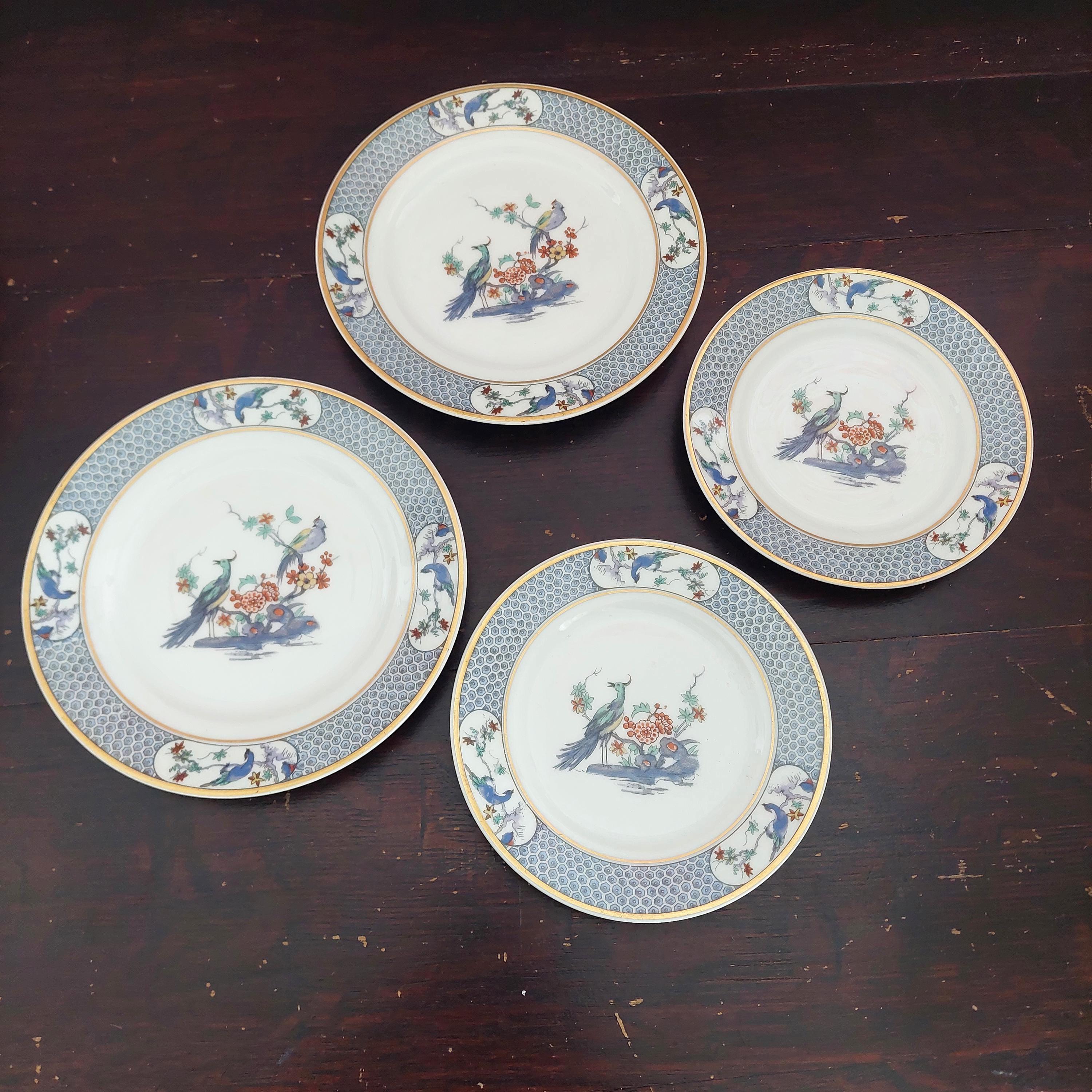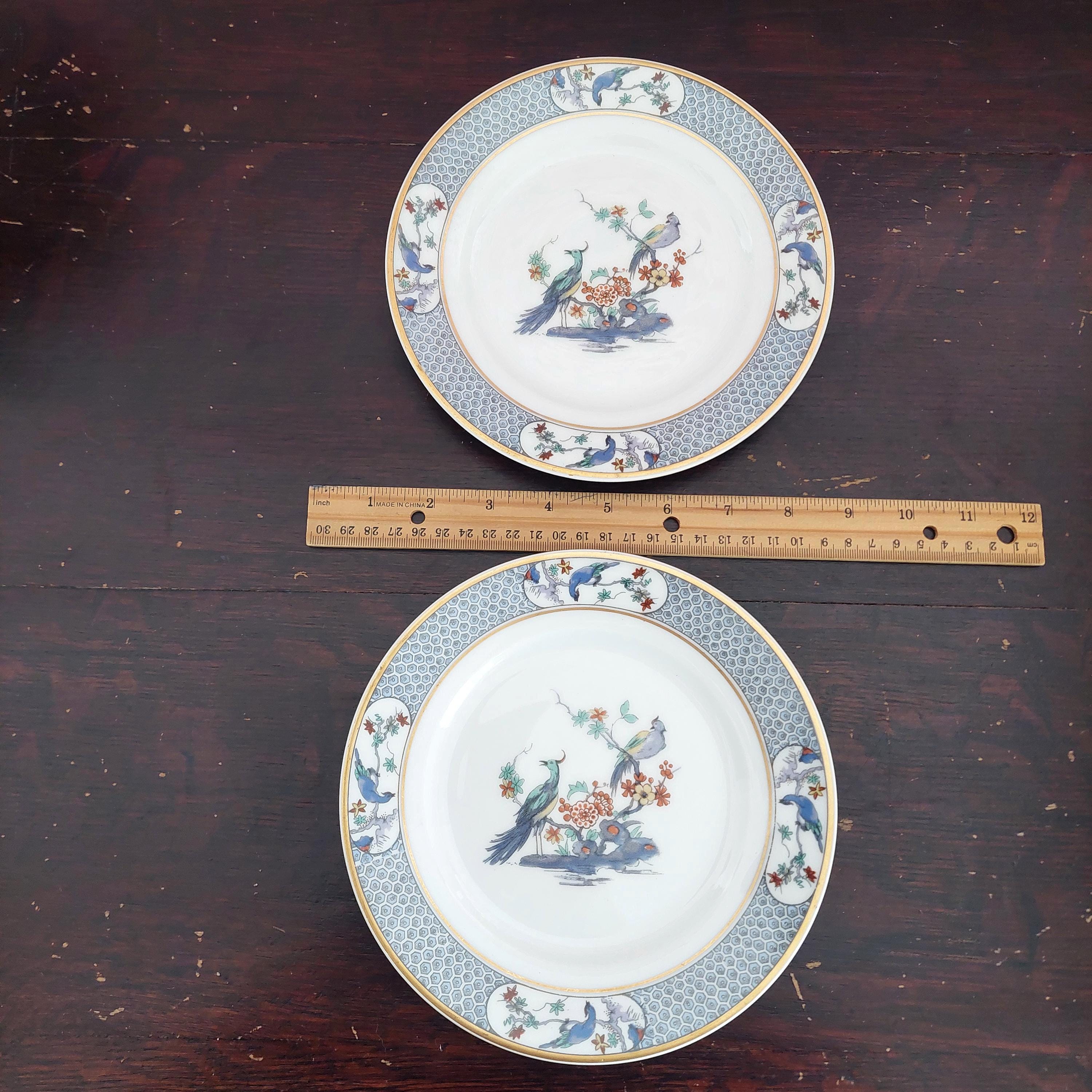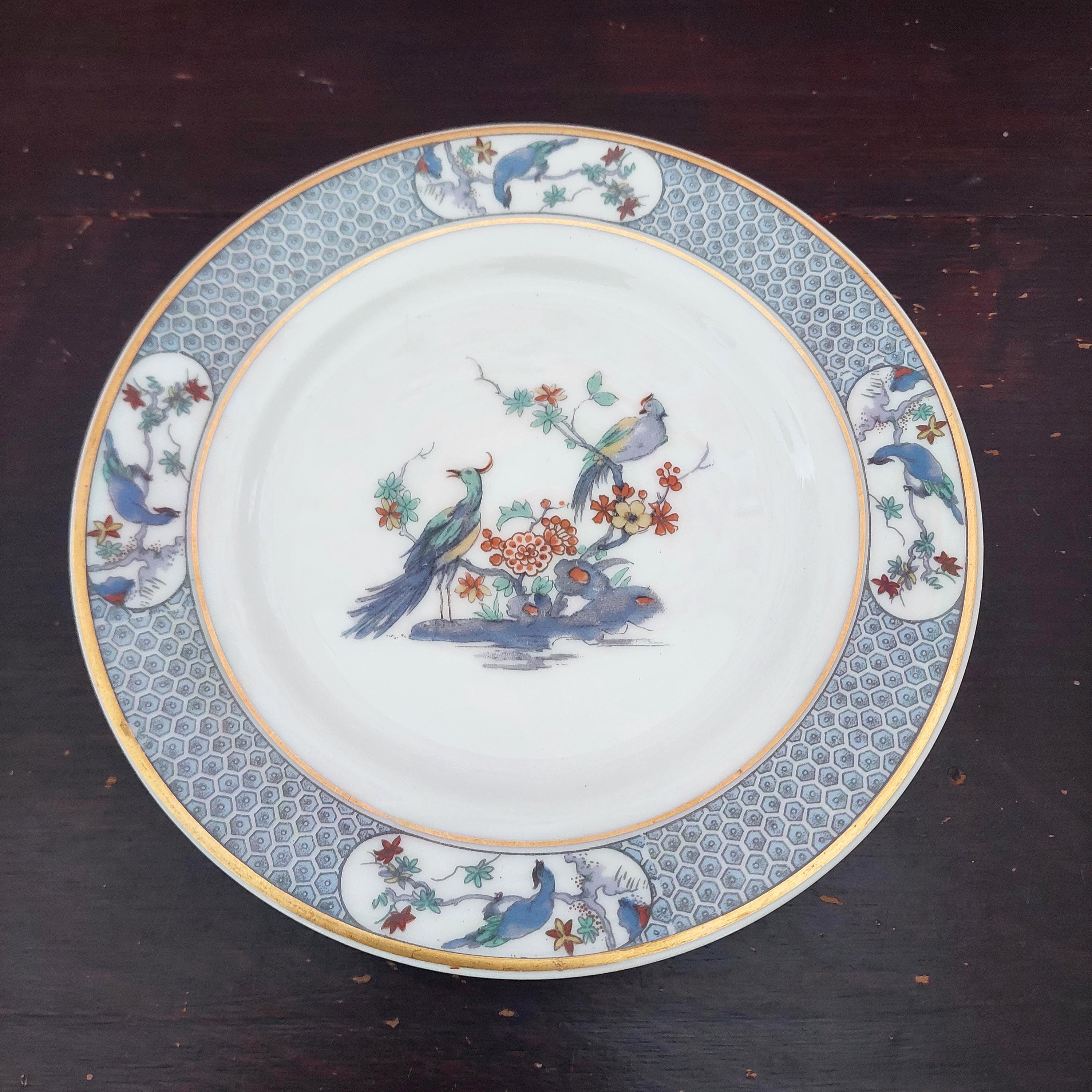 Antique Haviland LImoges Ambazar or also called Rajah. Plates feature birds of paradise on branches with a blue scale border and gold trim. Made in France, circa 1920s