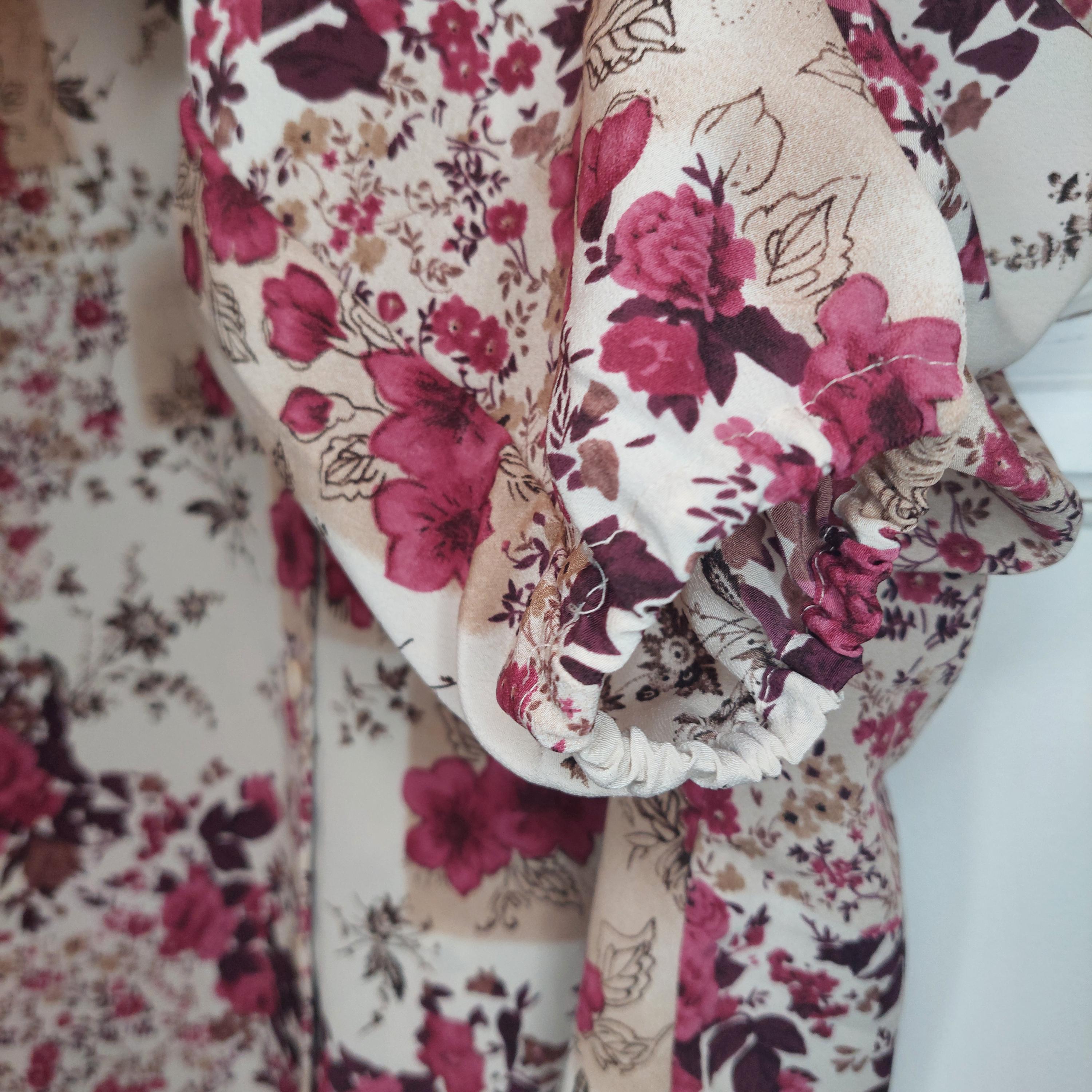 V-neckline, button front, long sleeve in deep pink, maroon, browns and tan with side slit.