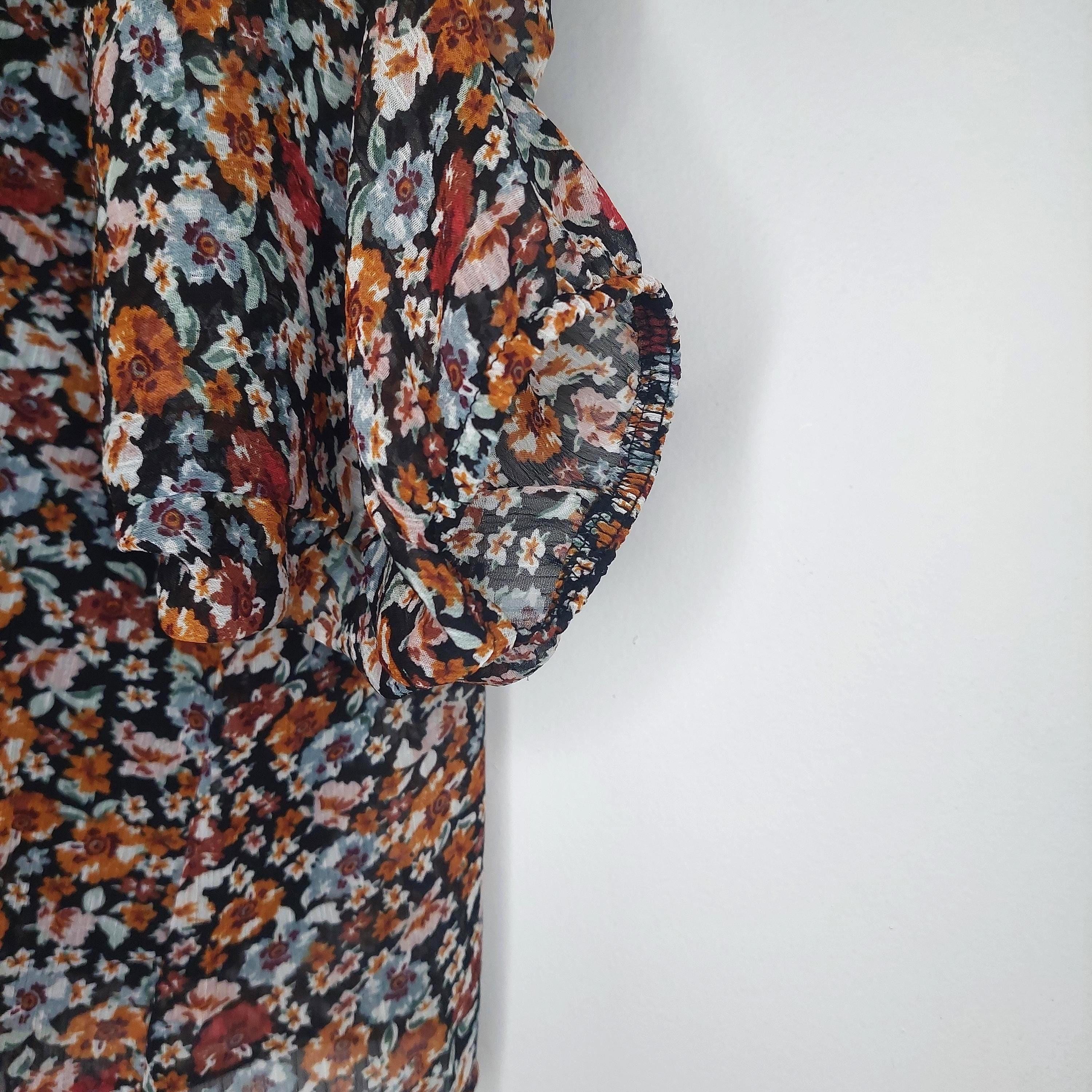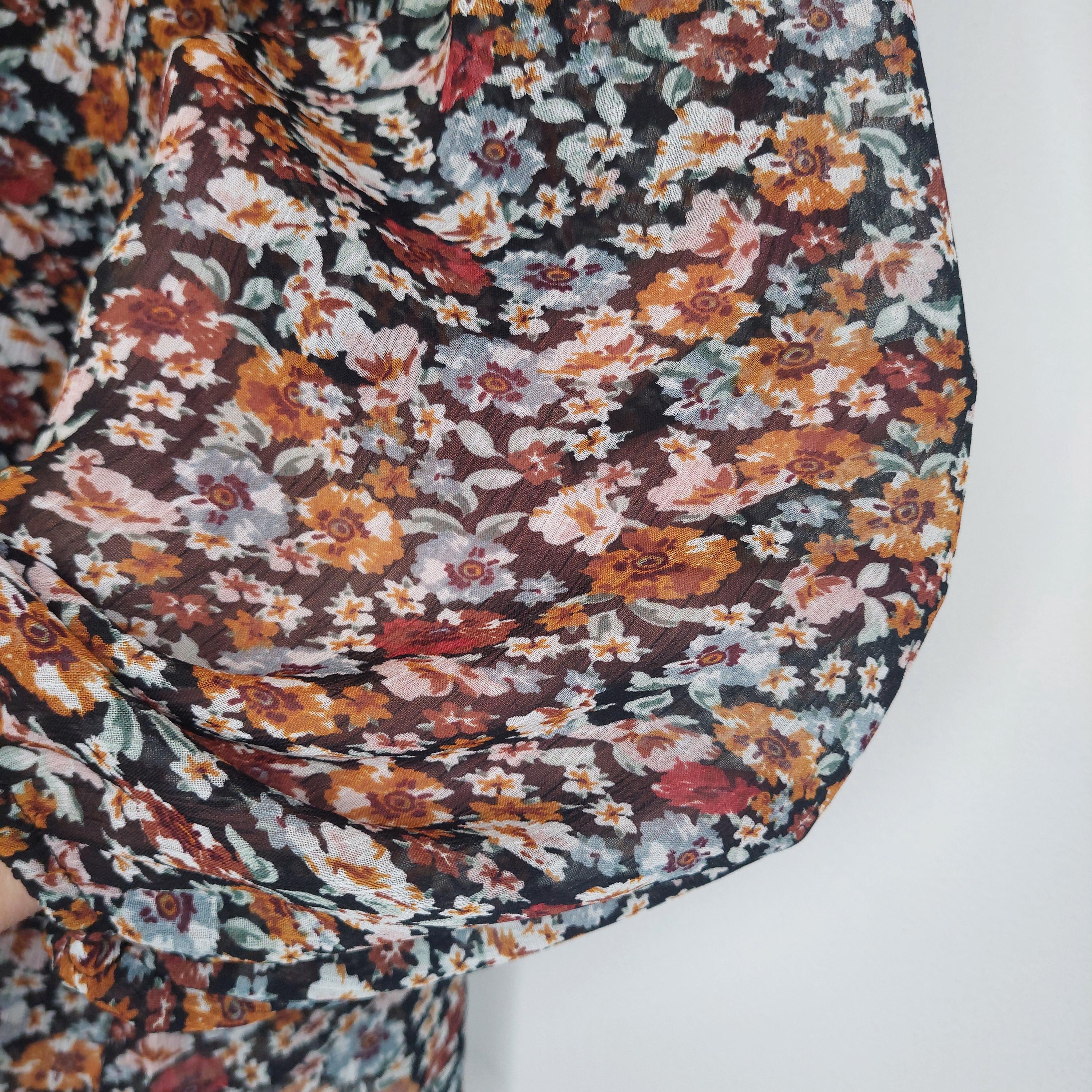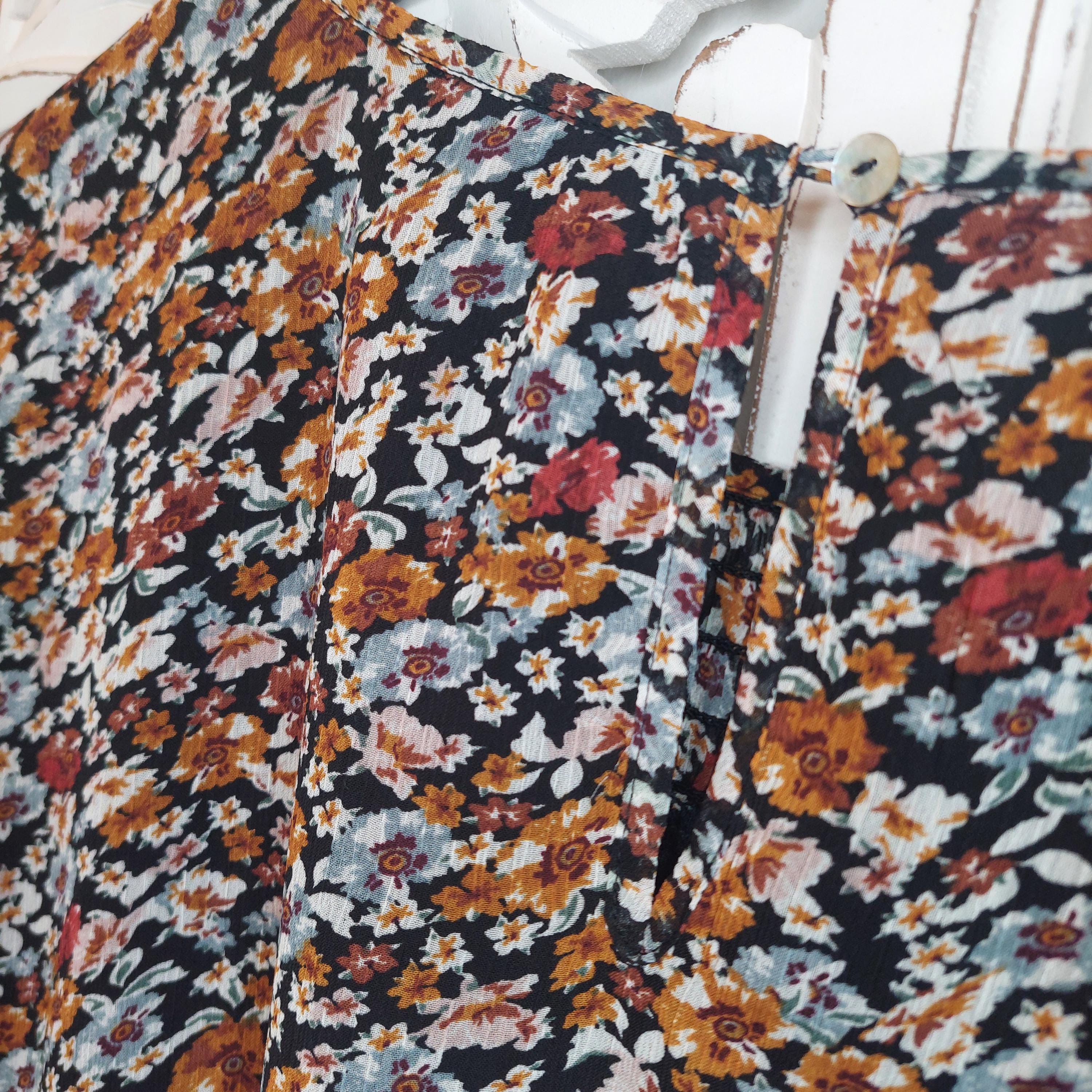 Black lined bodice with flowy outer floral layer, shirred upper yoke and relaxed fit.