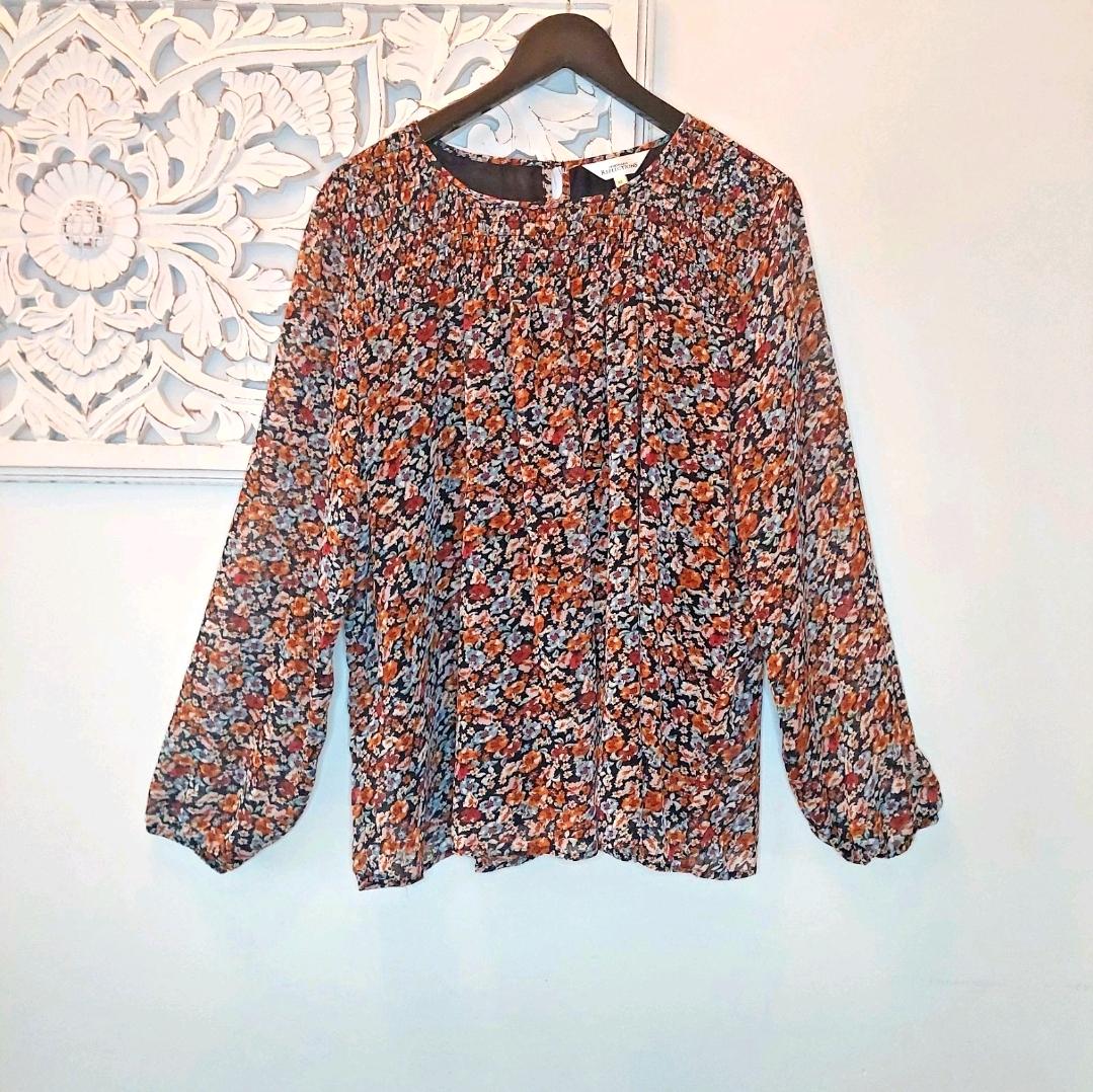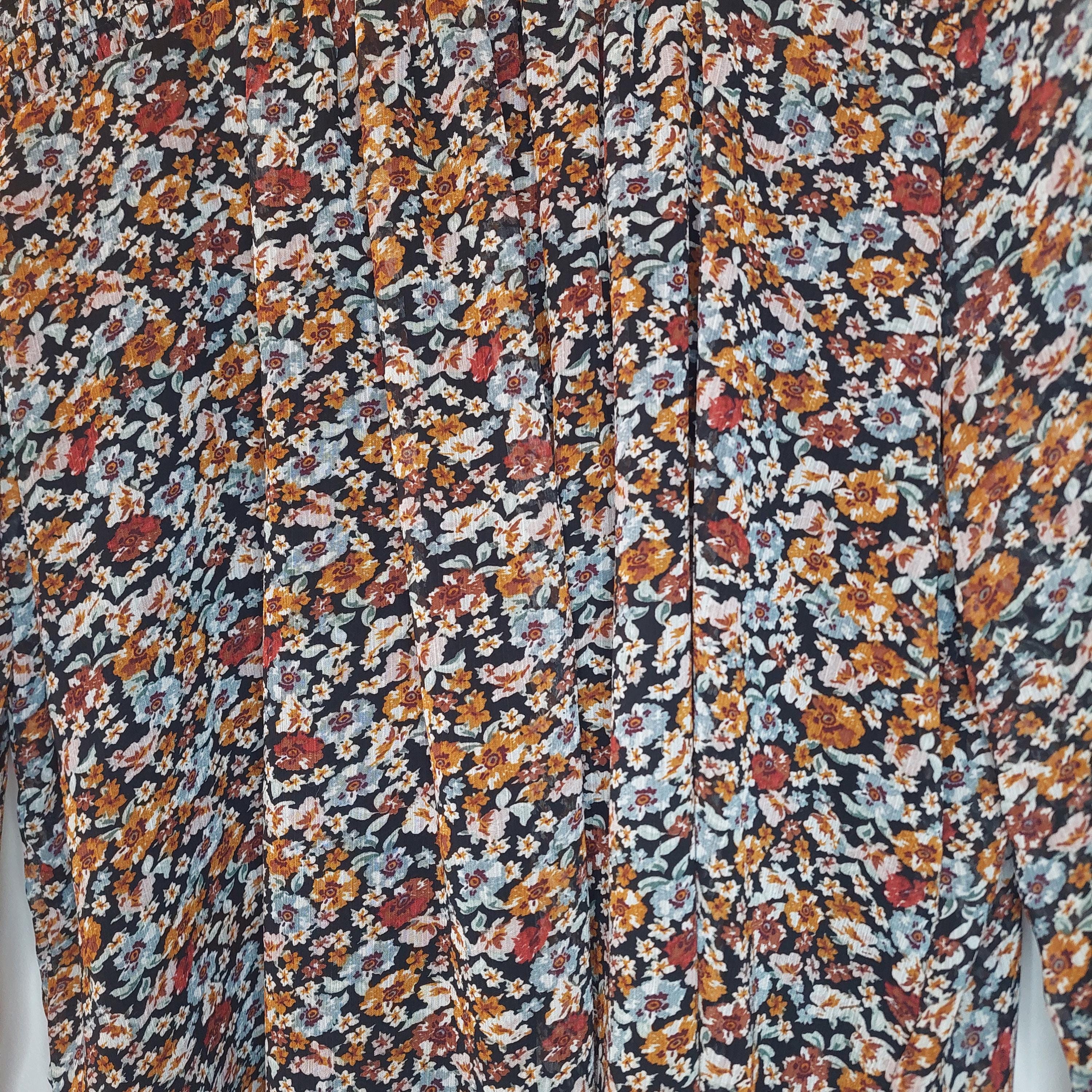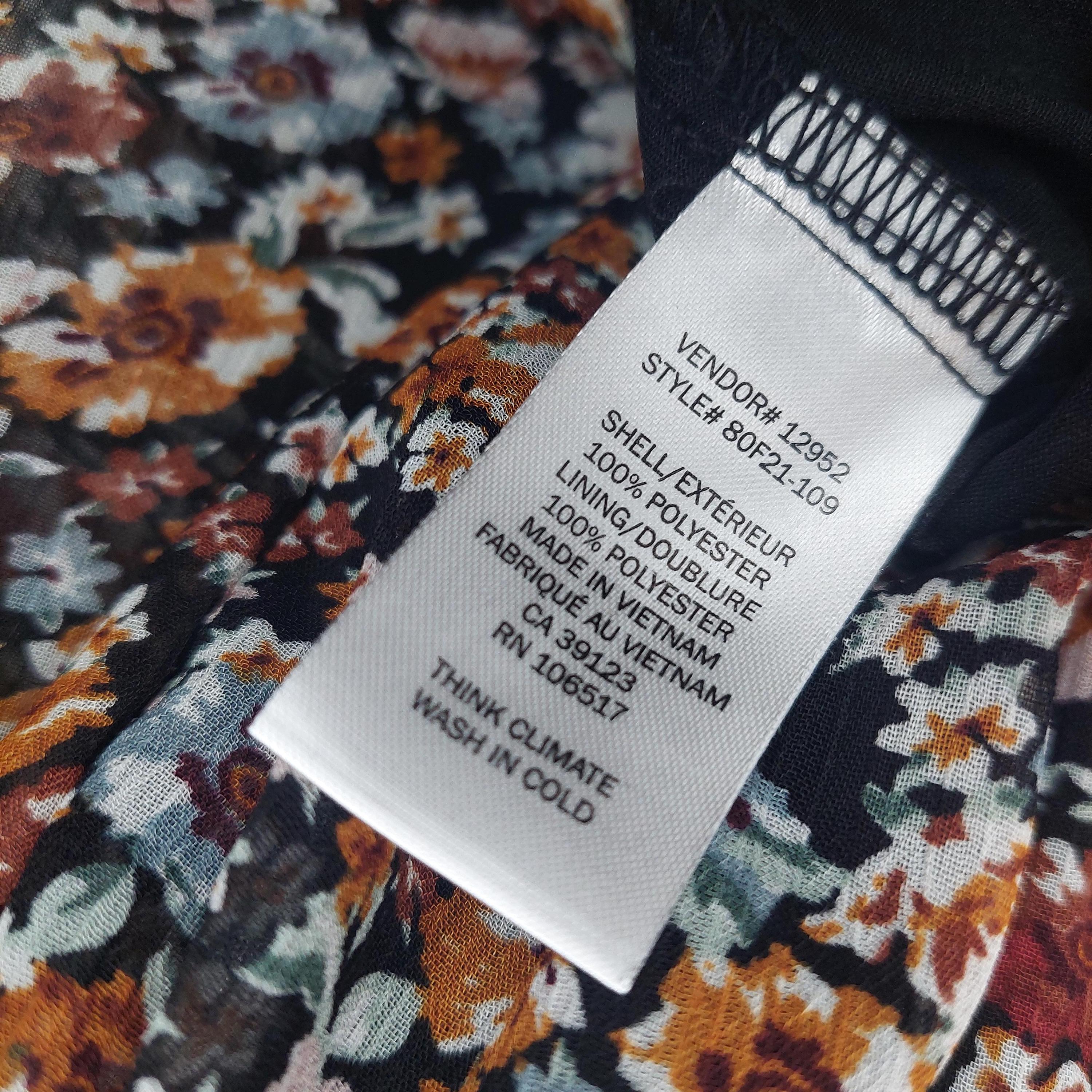 Black lined bodice with flowy outer floral layer, shirred upper yoke and relaxed fit.