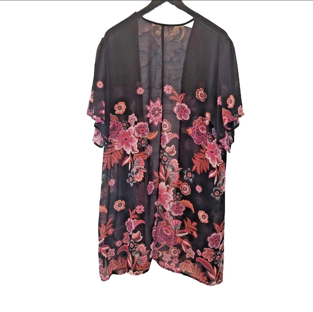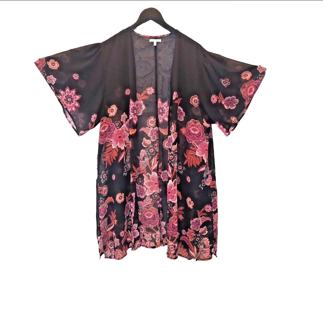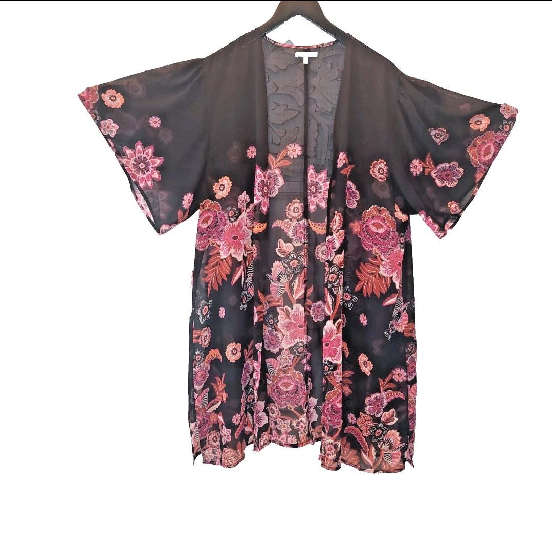 Vintage Maurices sheer black kimono with vibrant a floral print in burnt orange, pink, deep purple, black and white.