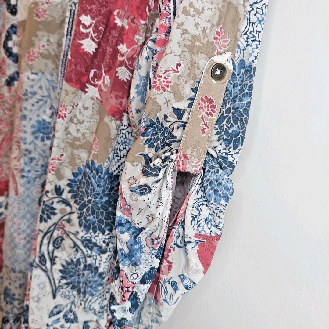 Vintage Northern Reflections printed faux patchwork, nature inspired in red, blues, tan and white