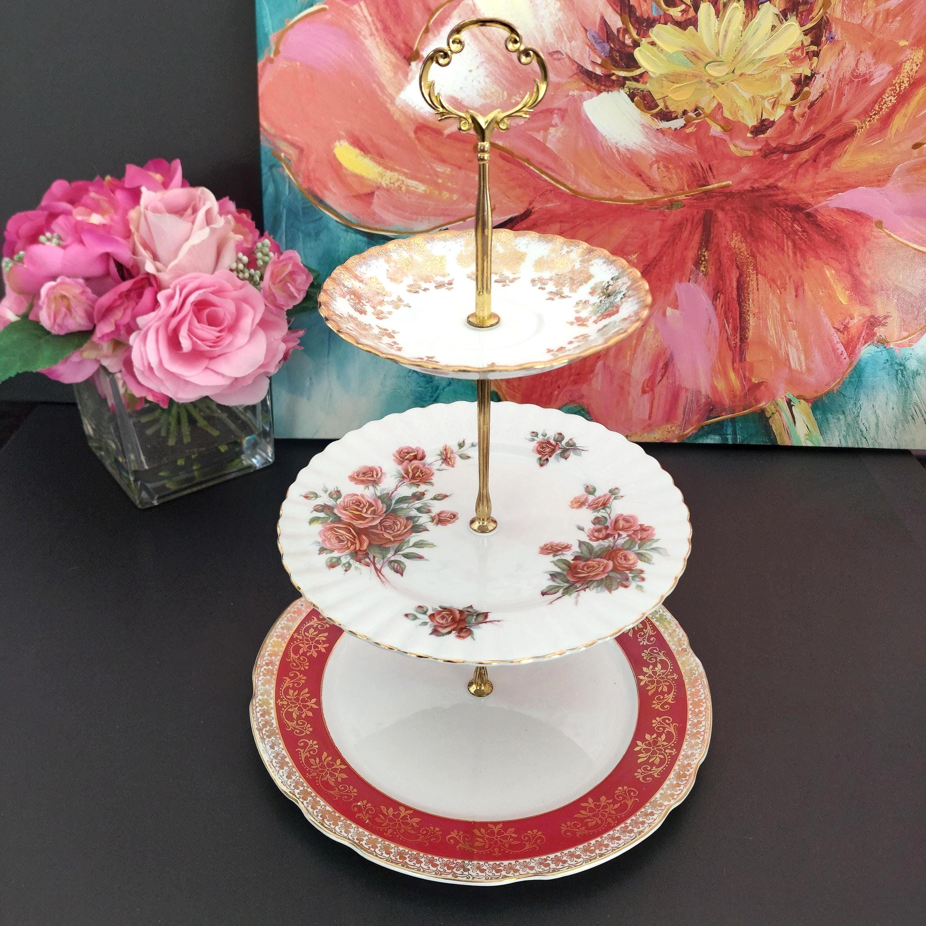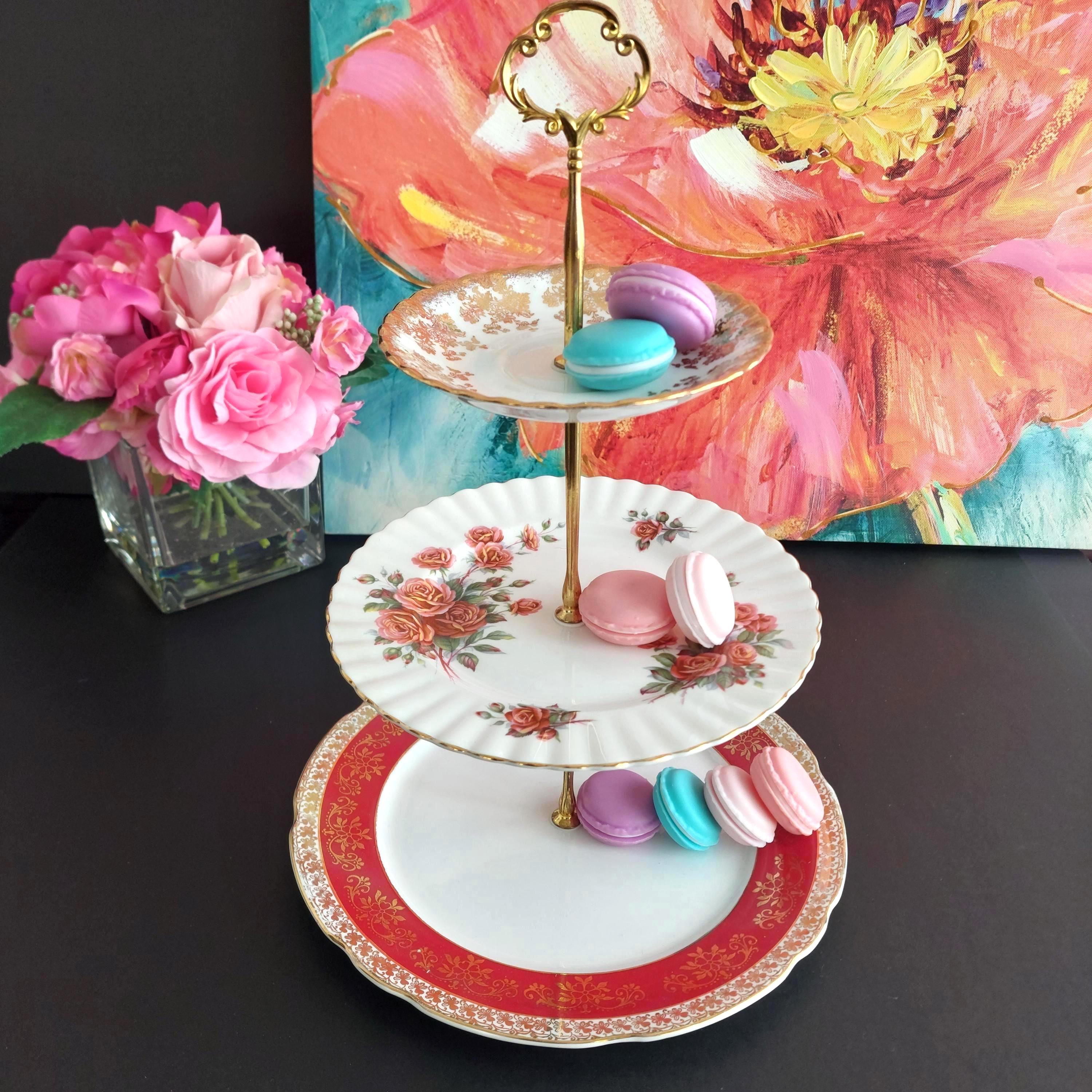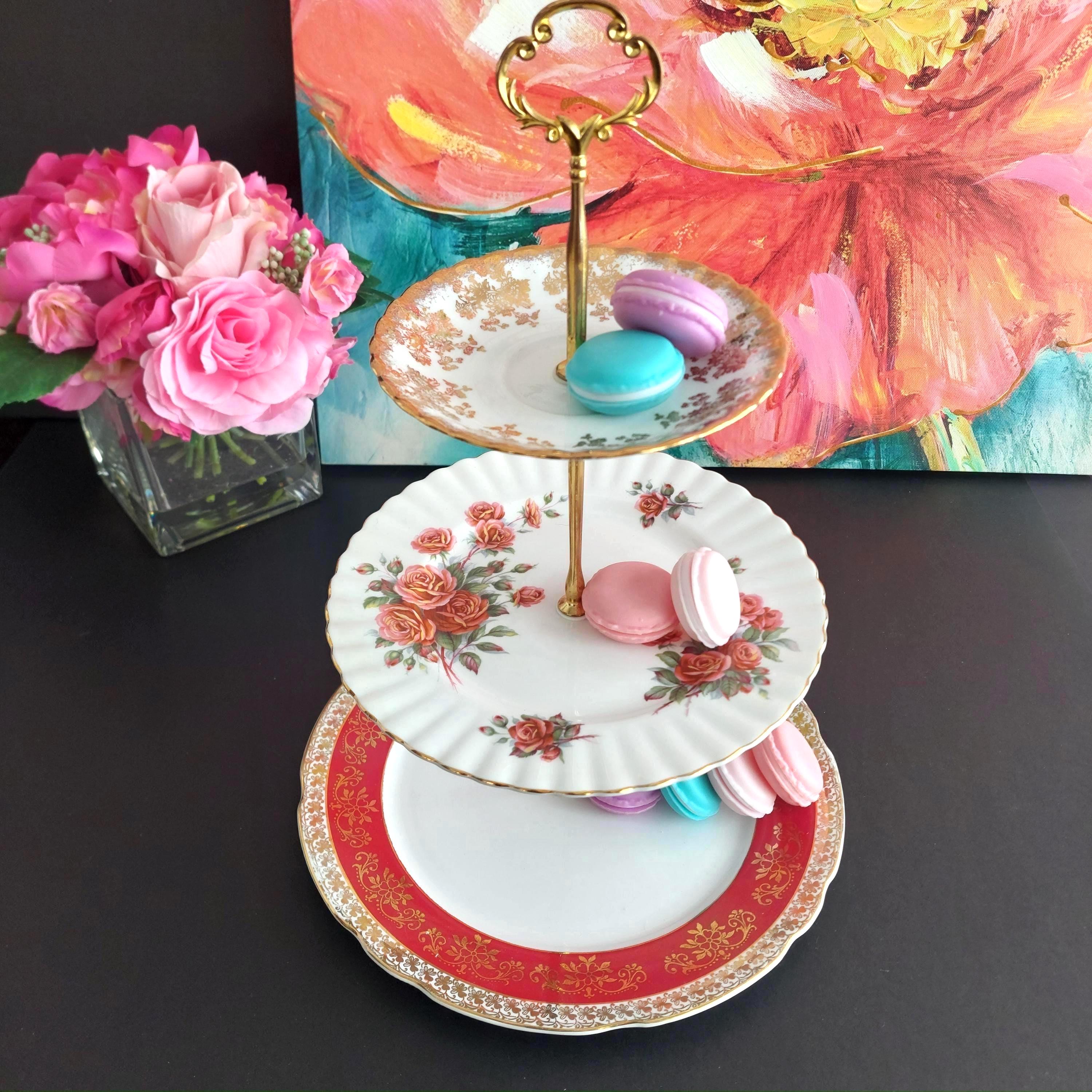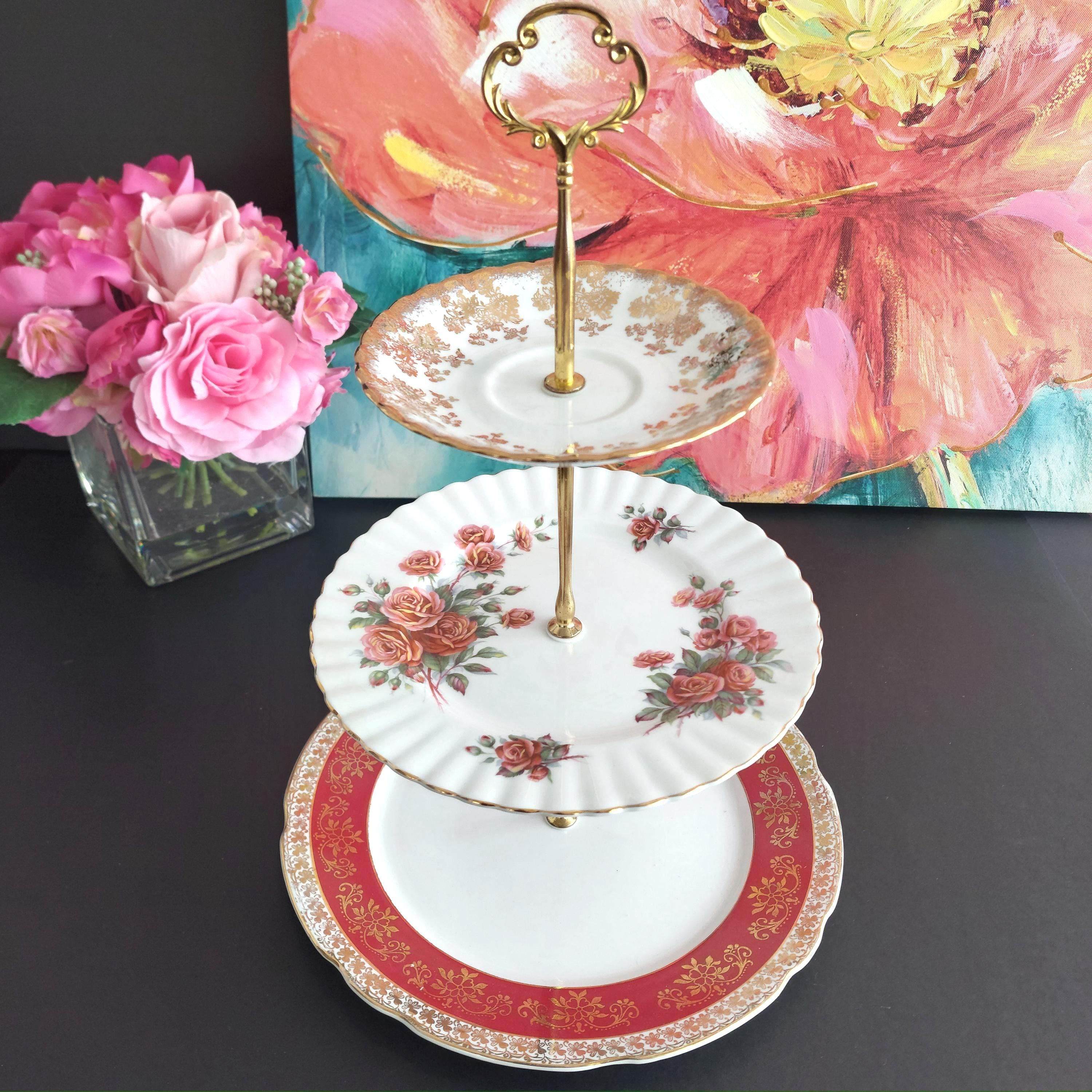Elegant 3-tier cake stand, handmade by me using mismatched English bone china plates.