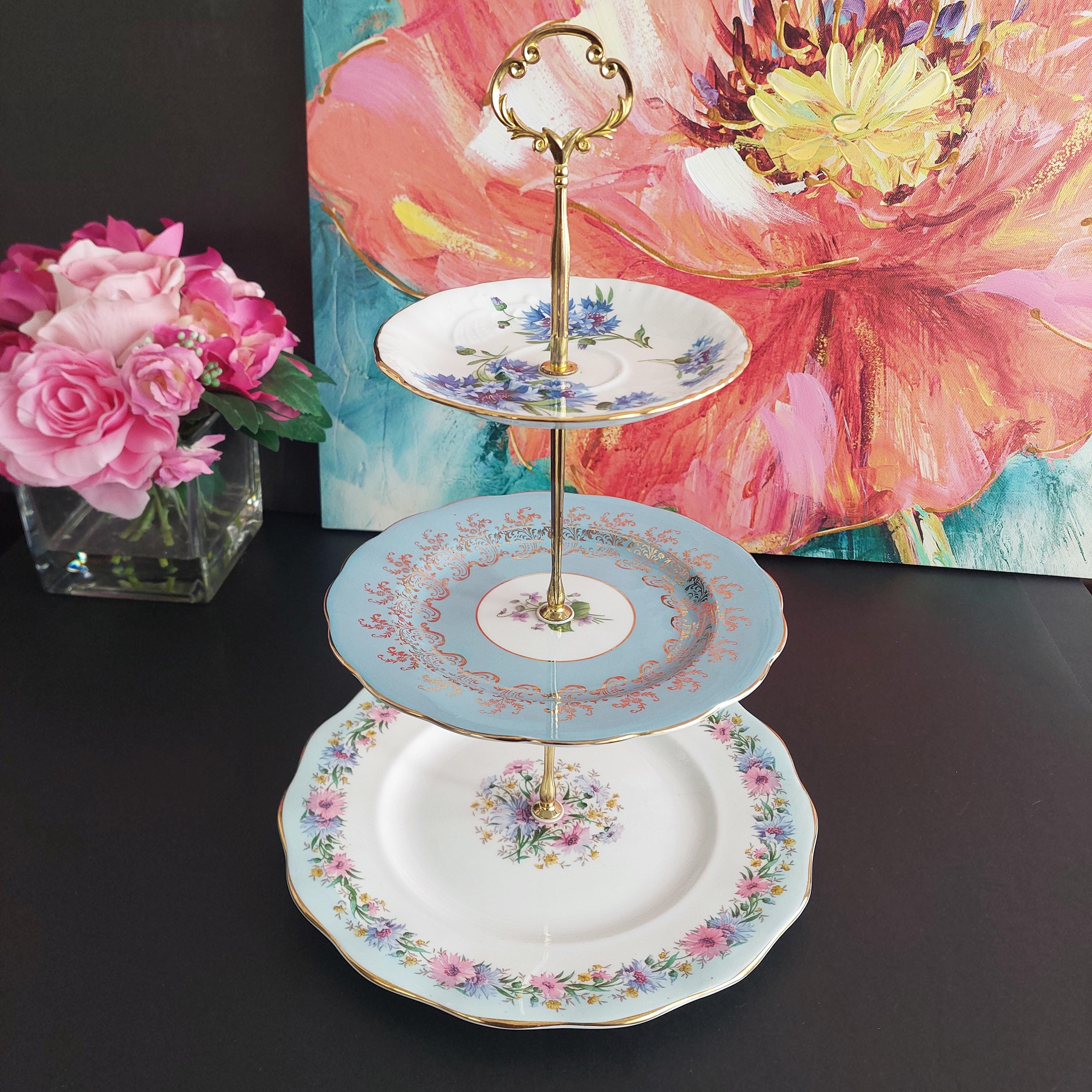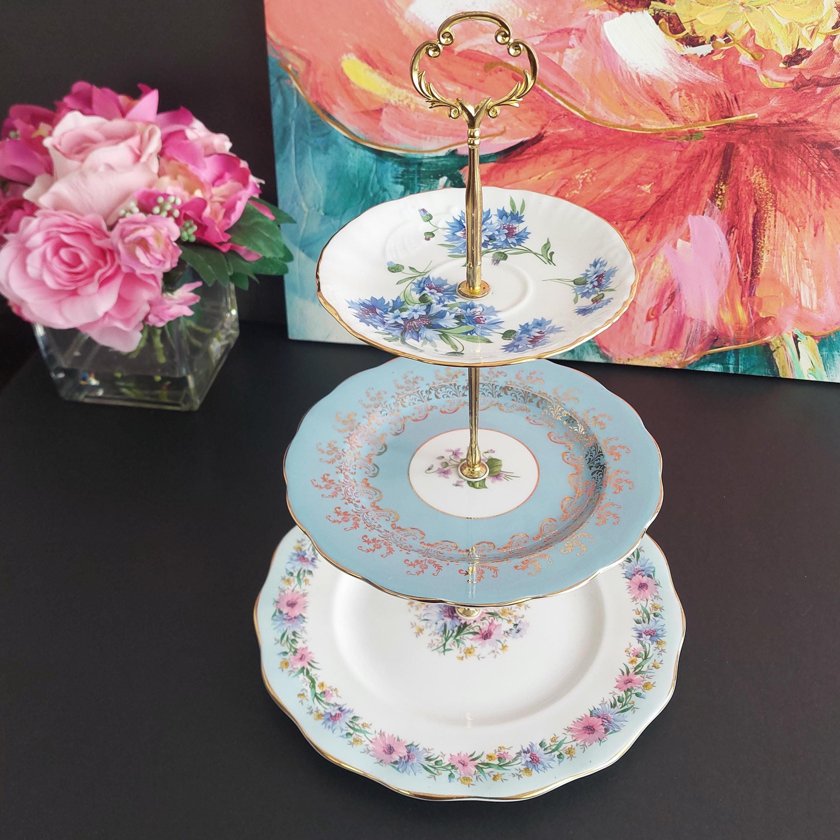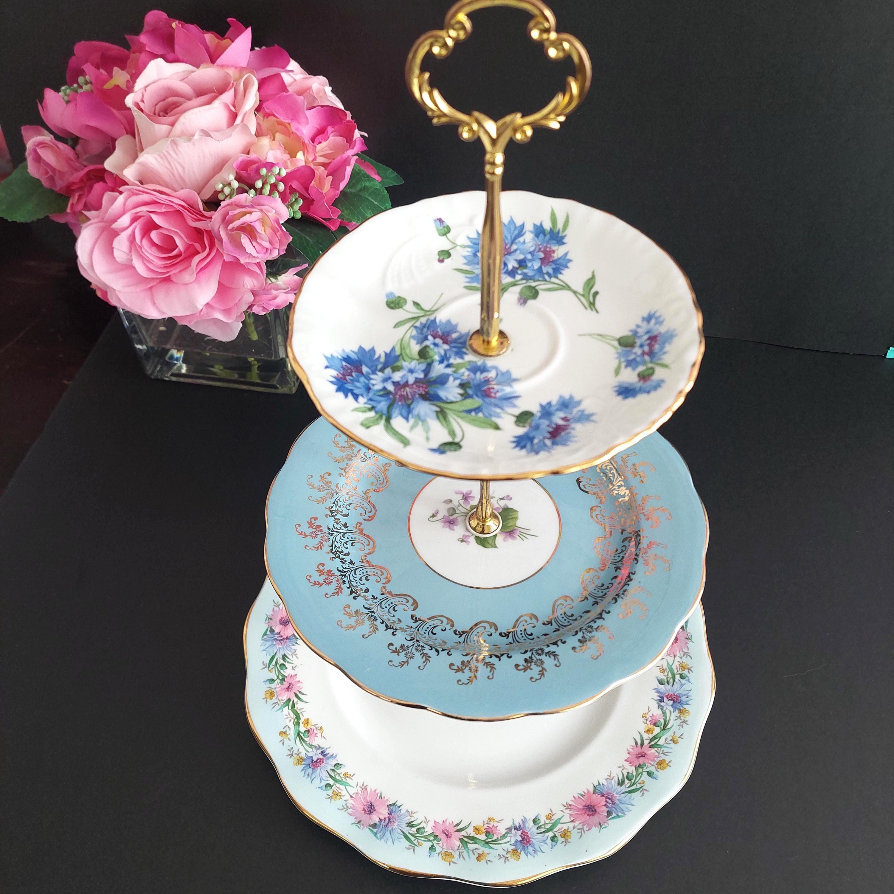 Elegant 3-tier cake stand, handmade by me using mismatched English bone china plates in blue and white.