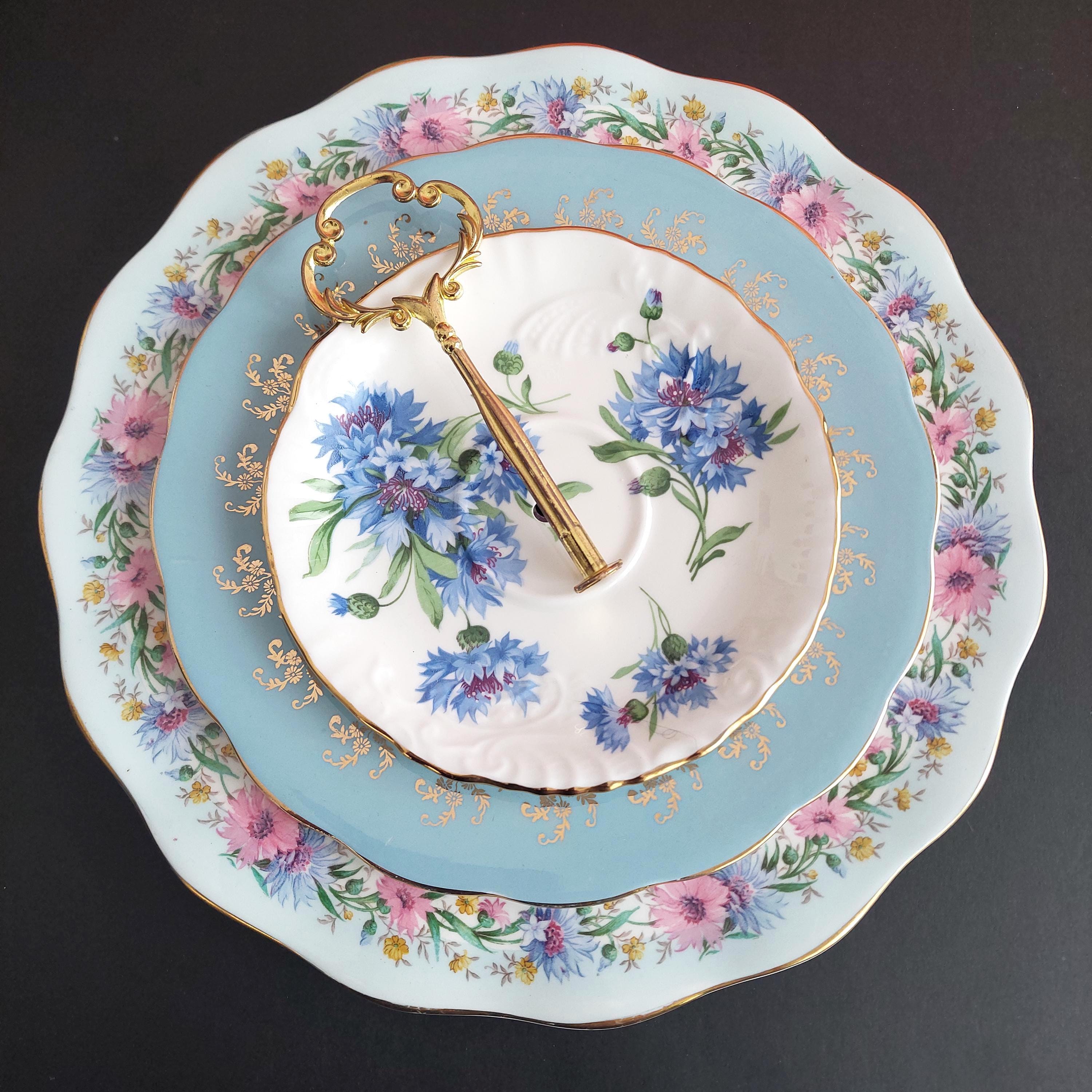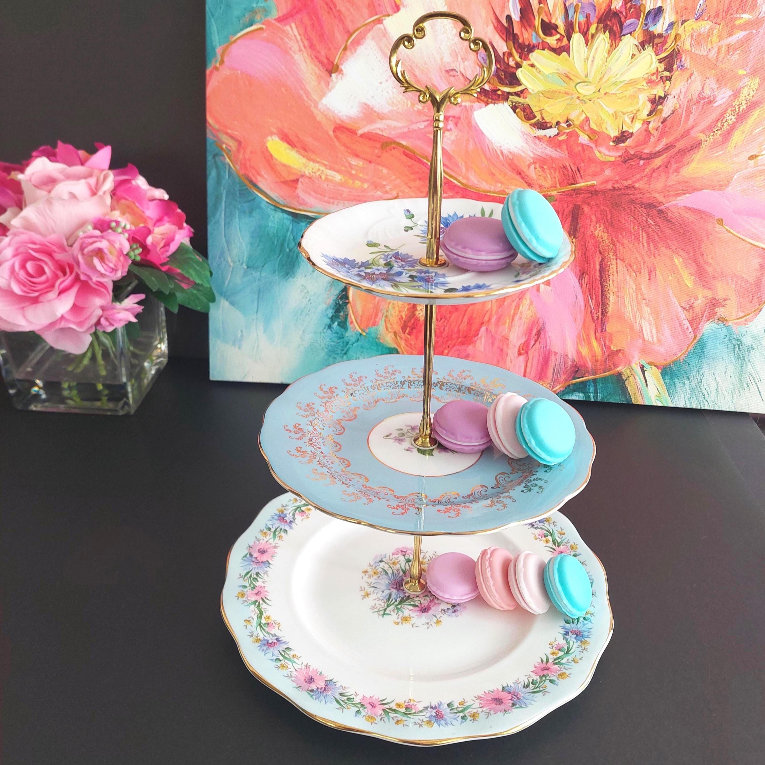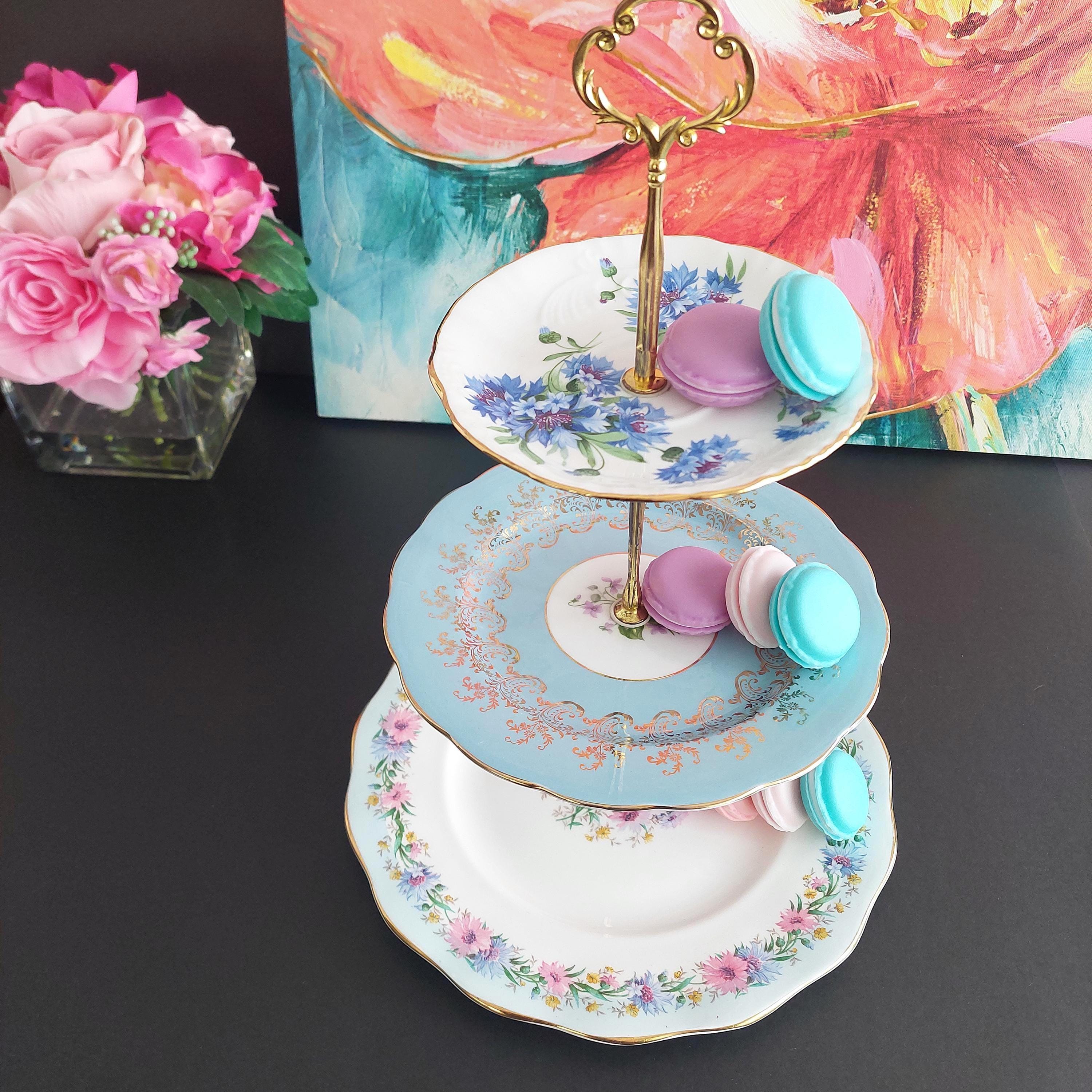 Elegant 3-tier cake stand, handmade by me using mismatched English bone china plates in blue and white.