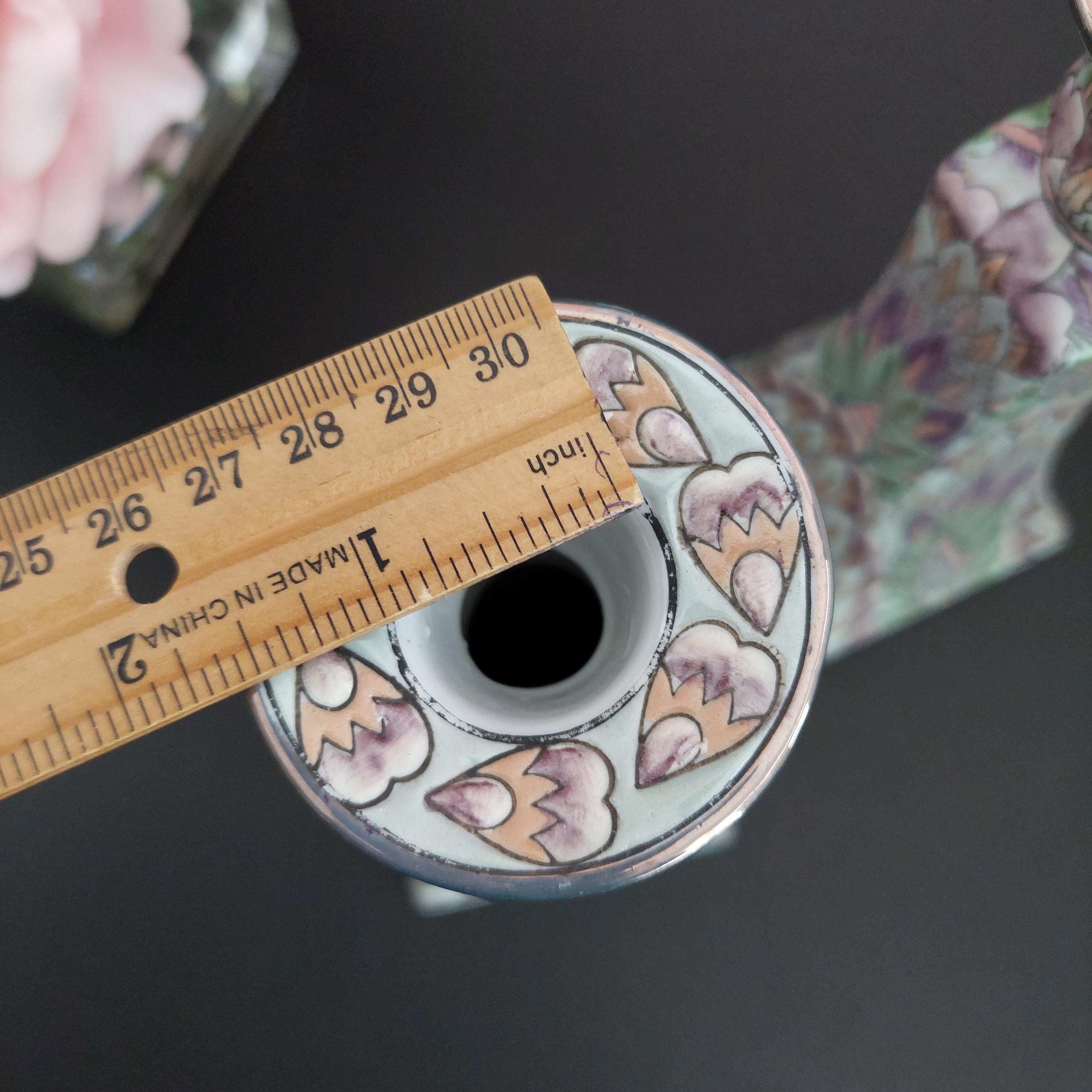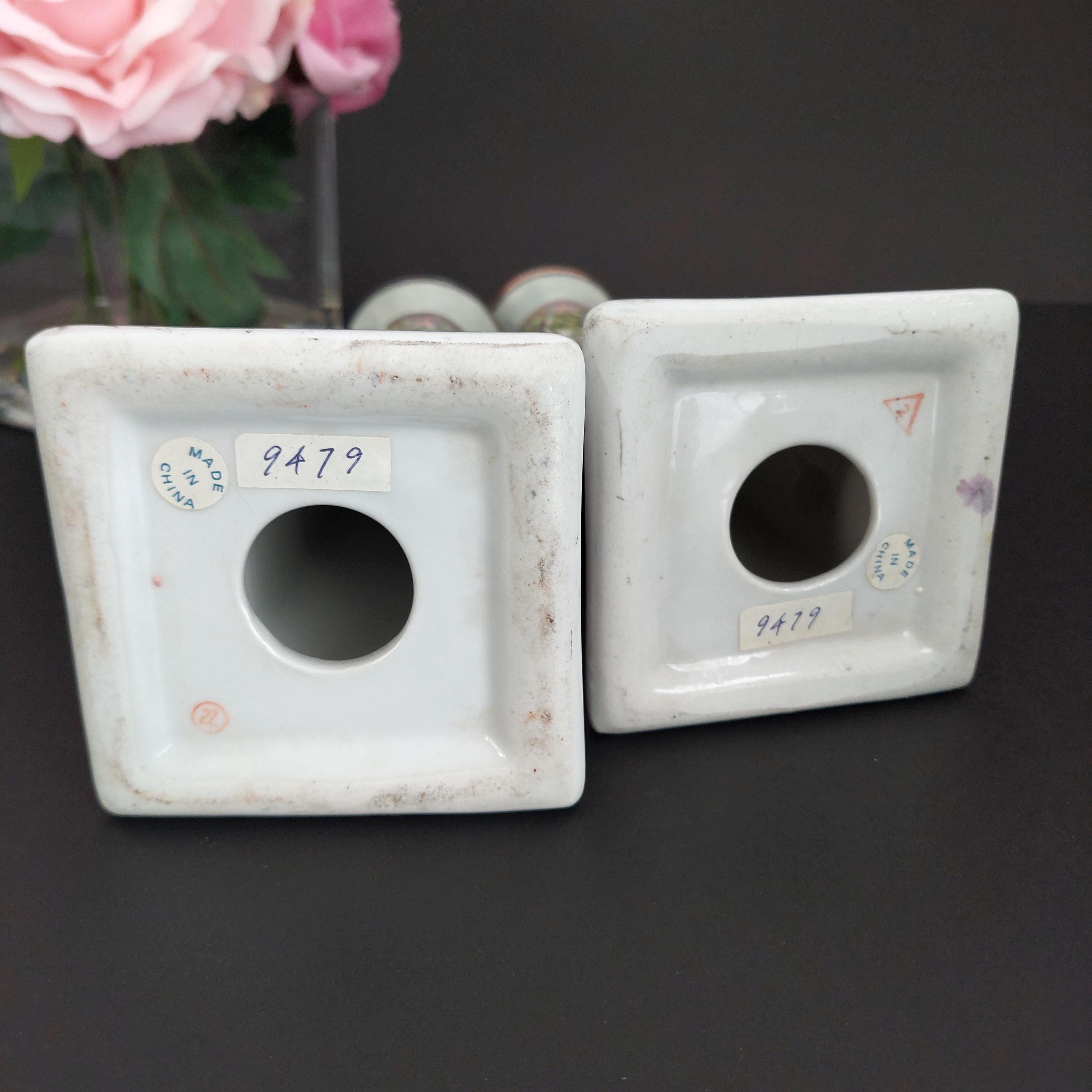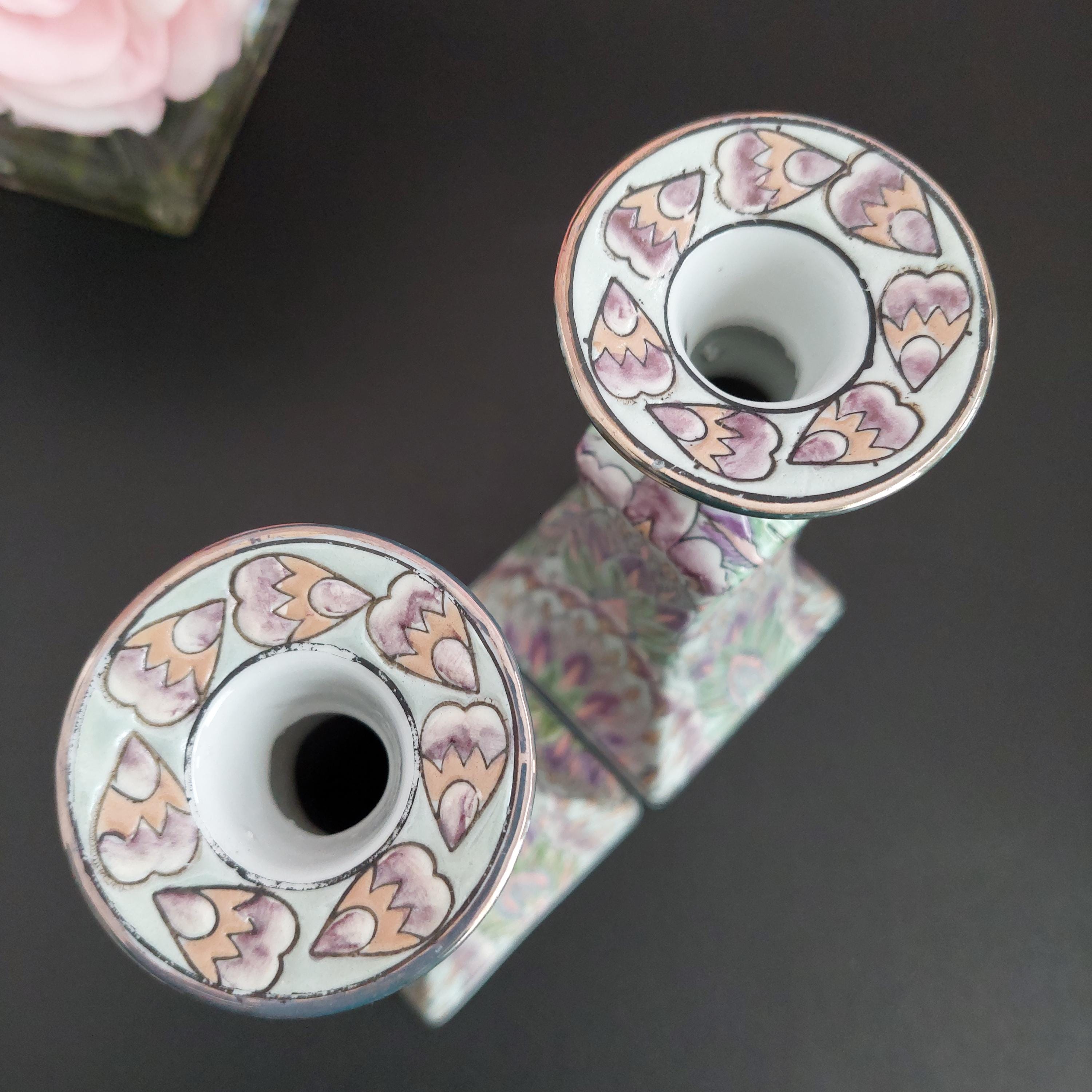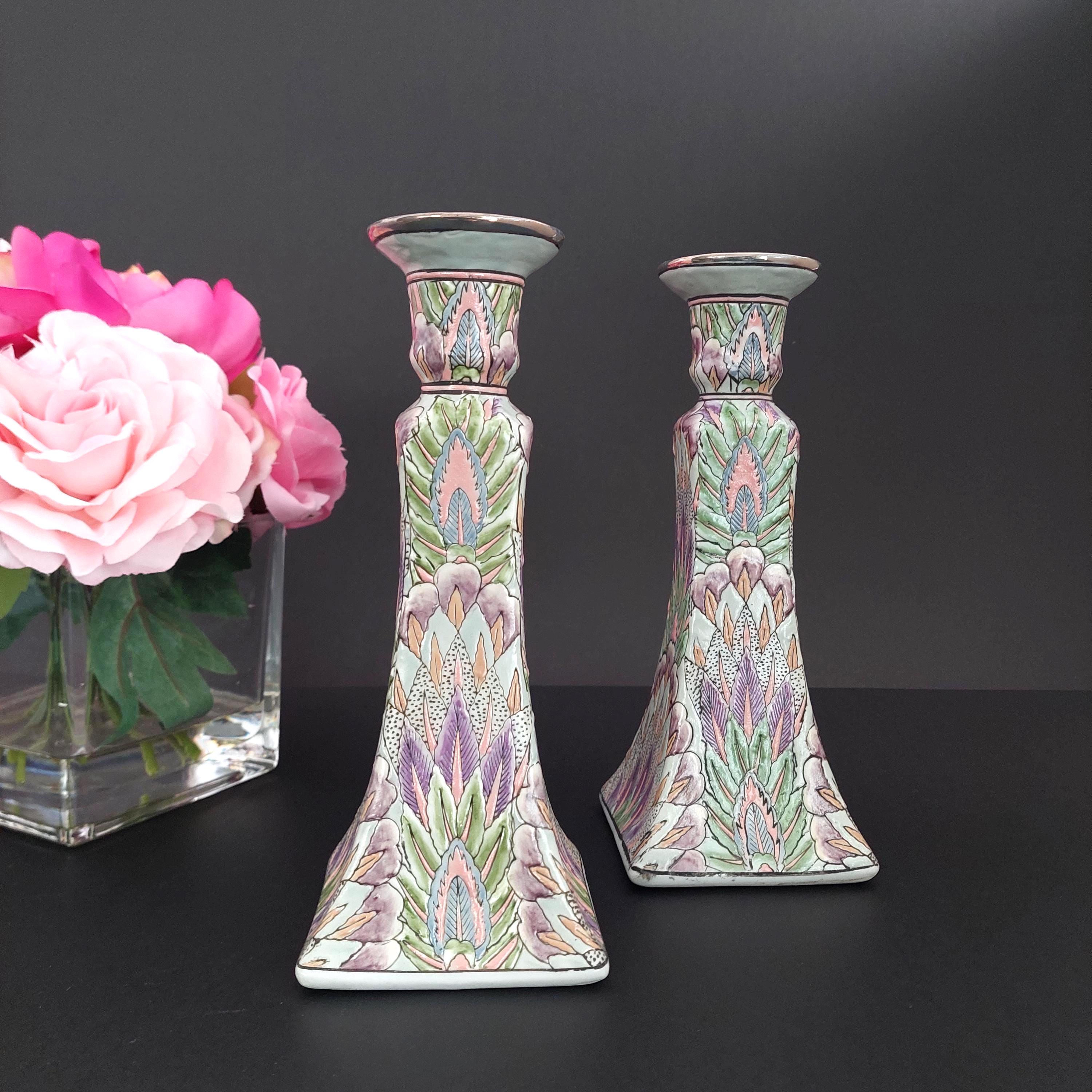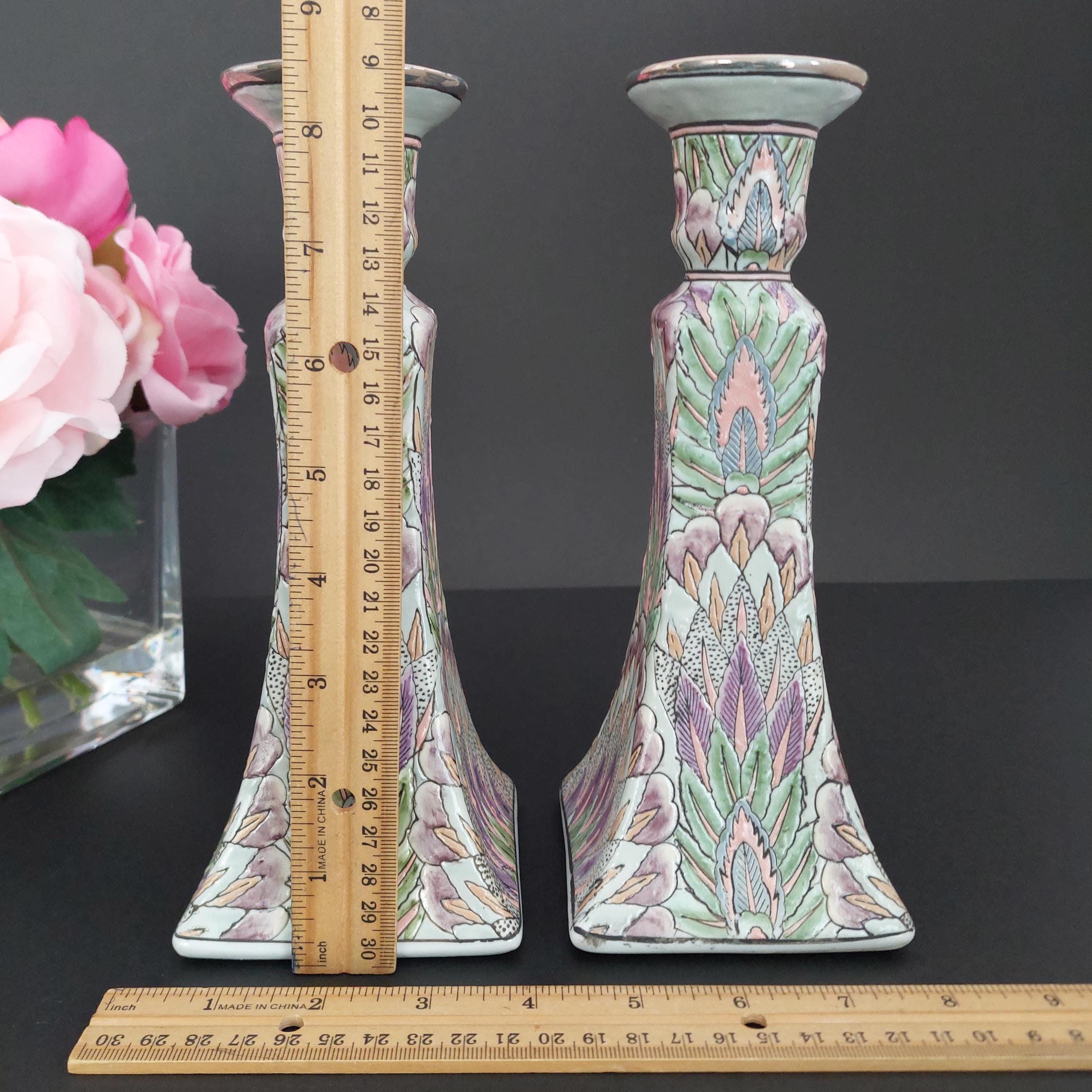 Pair of vintage Chinese porcelain candlestick holders featuring a hand-painted Chinoiserie floral pattern in green and purple. Textured design with a glossy finish. Made in China sticker on bottoms