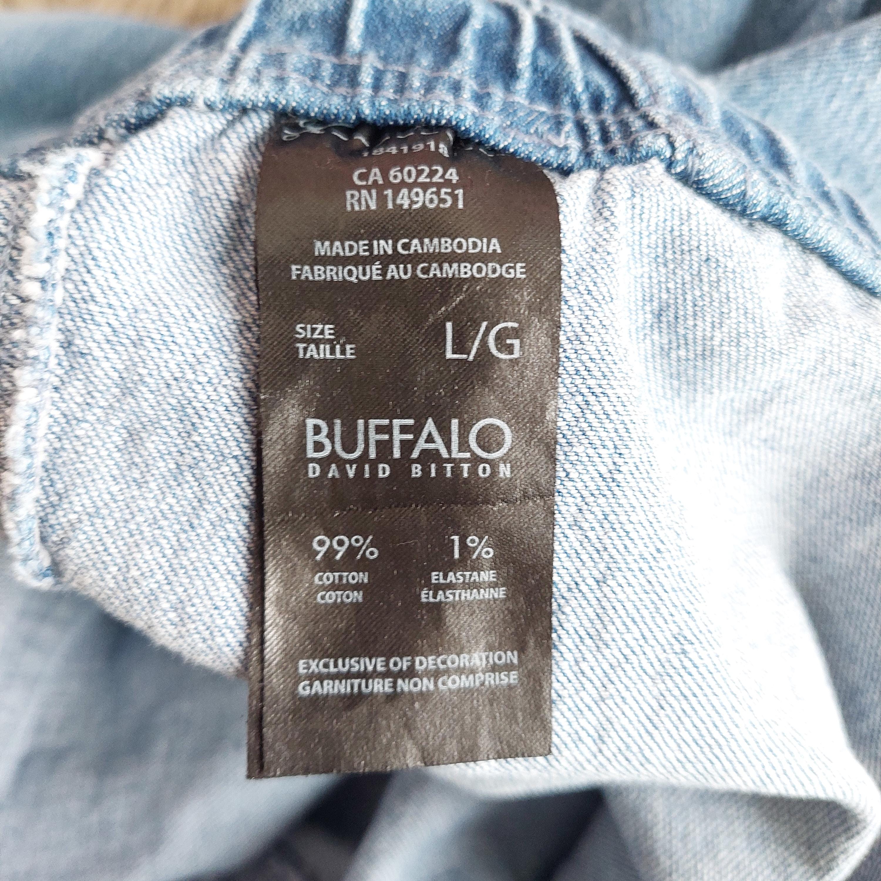 Tag: "Buffalo David Bitton - Size Large - 99% Cotton, 1% Elastane - Machine Wash, Dry Flat - Made in Cambodia "