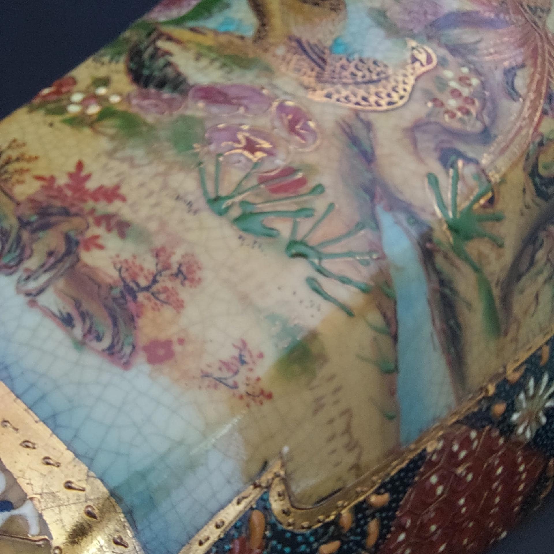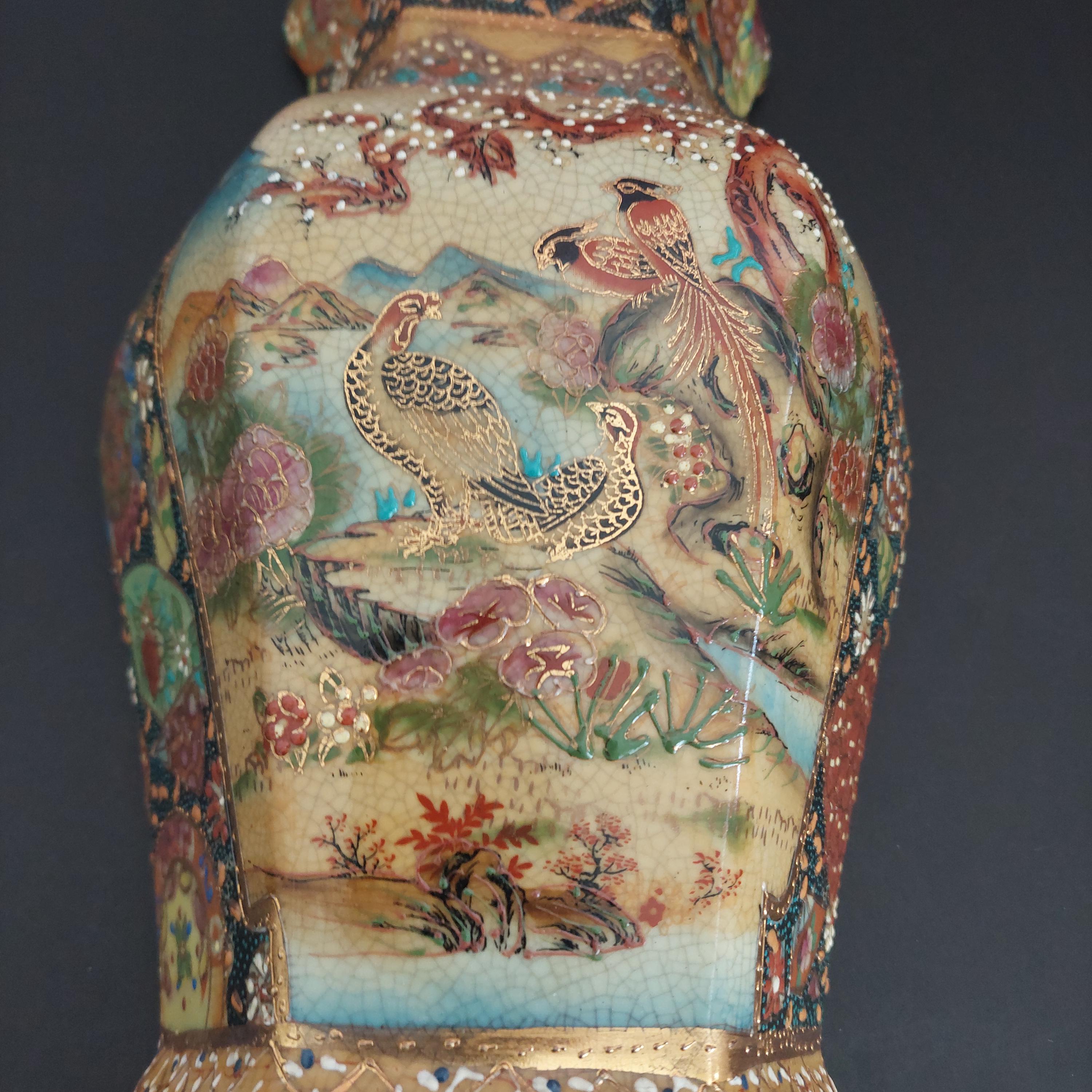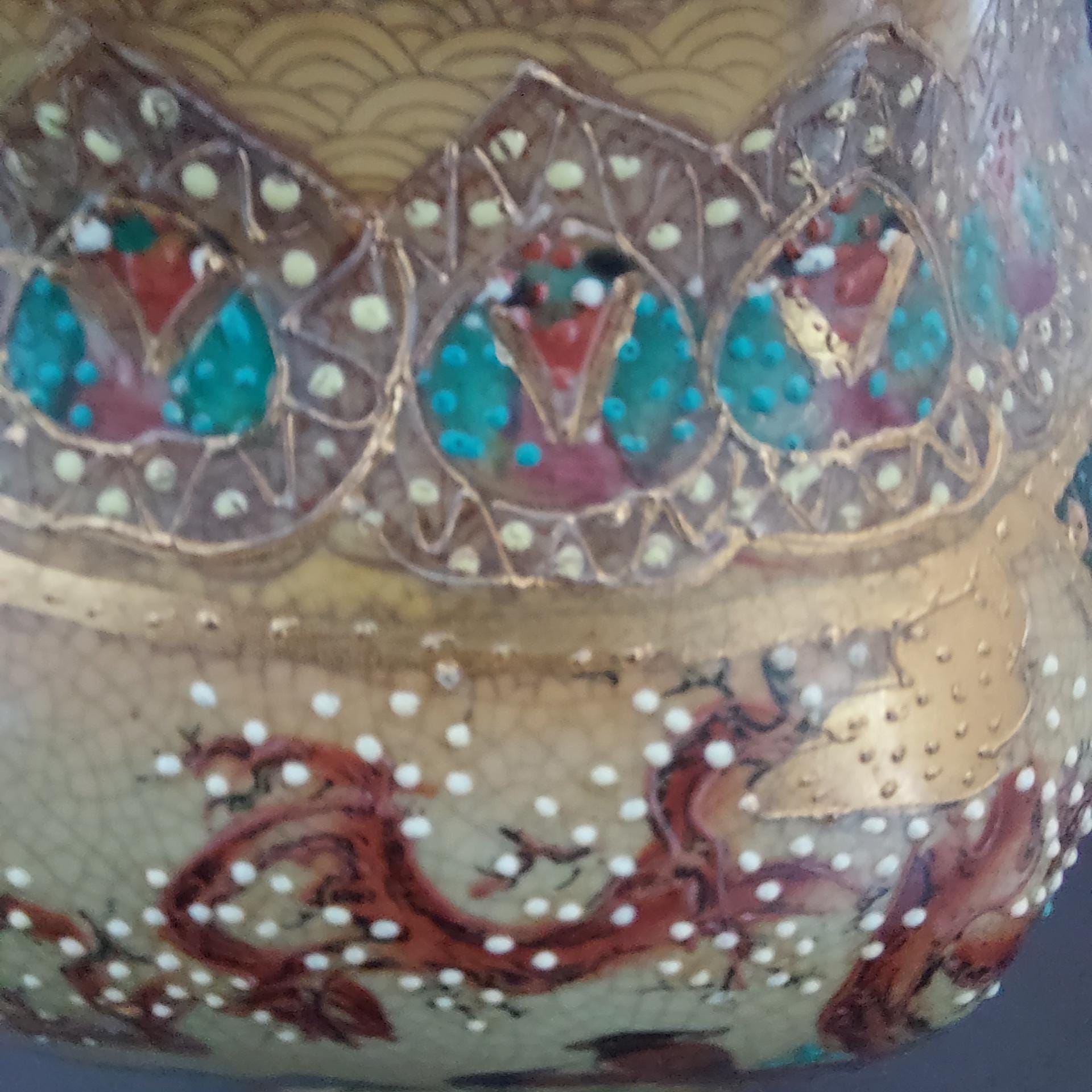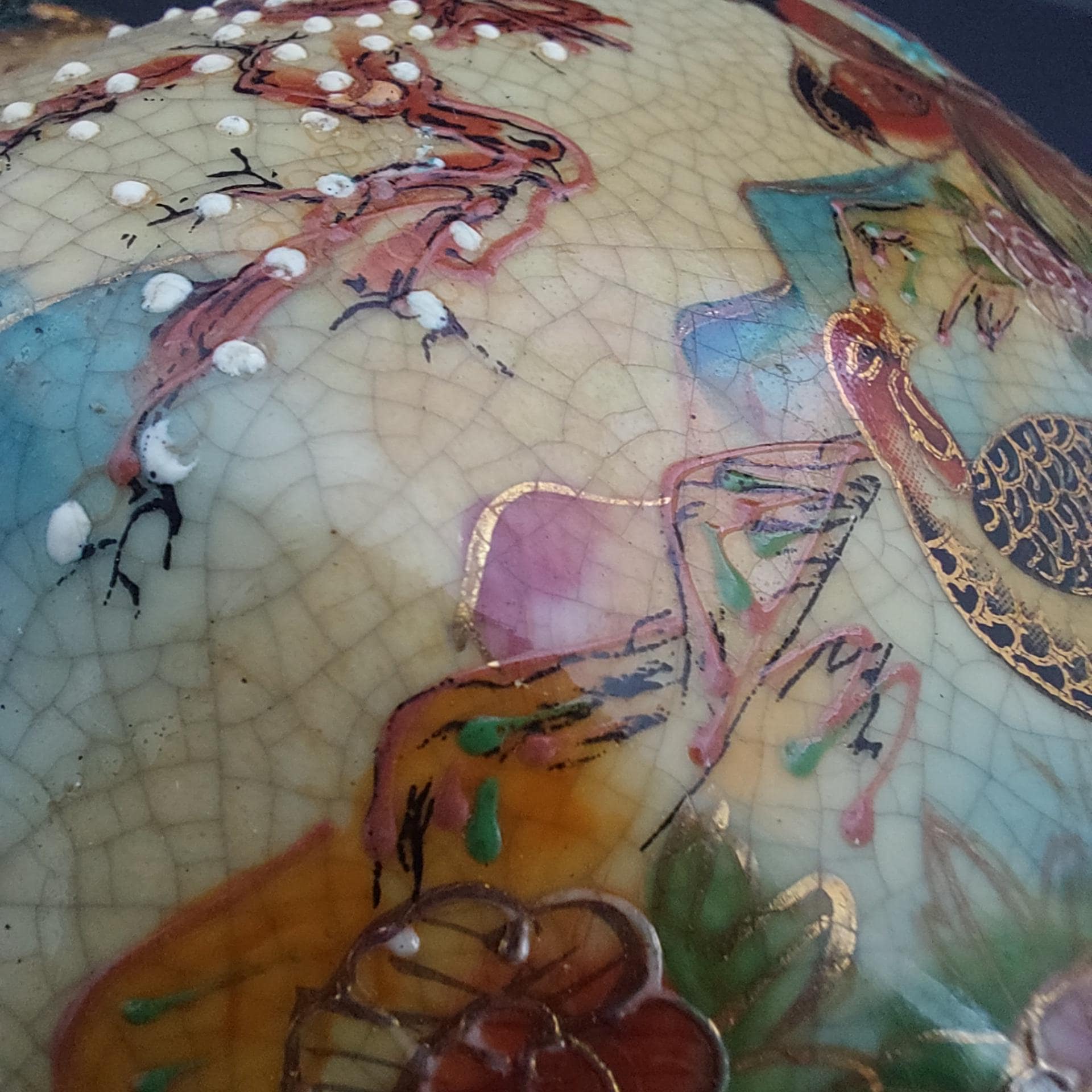 Rich colors of rust, tan, brown, blue, green, heavy gold gilding (moriage), and a distinctive crackle-glaze finish
