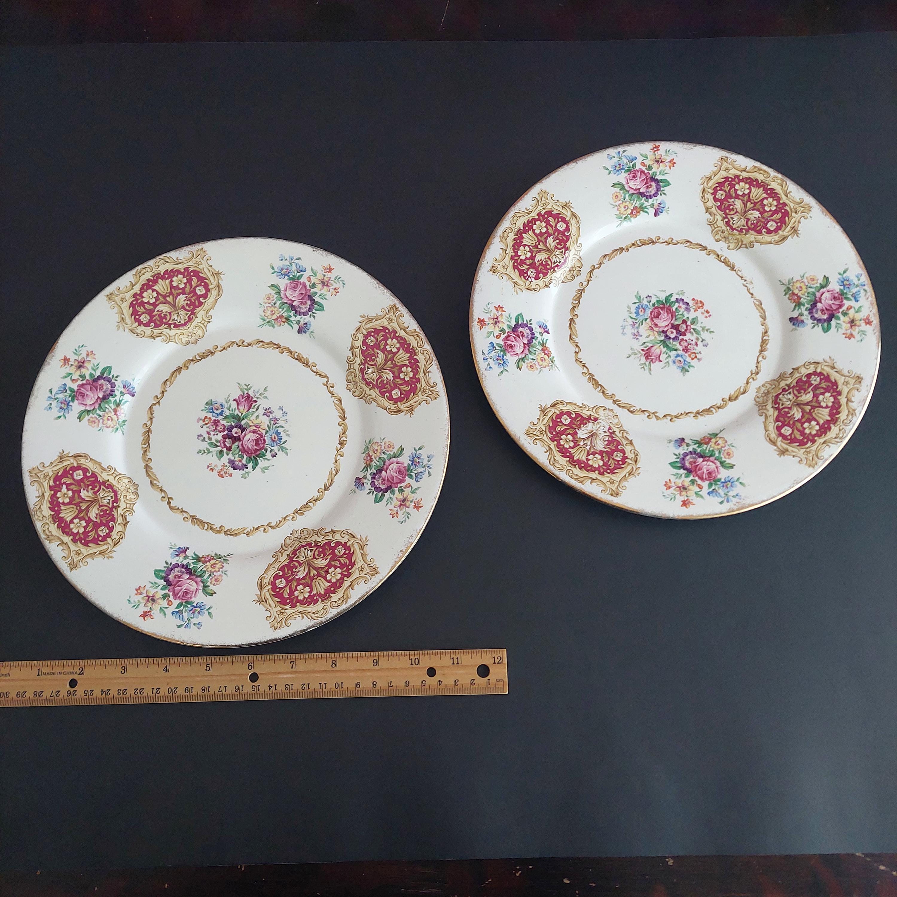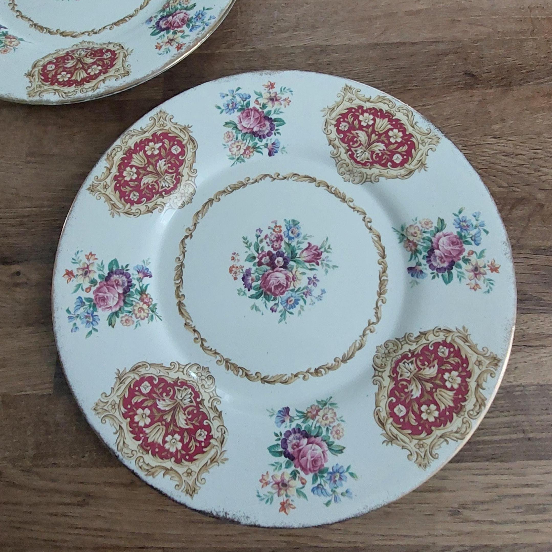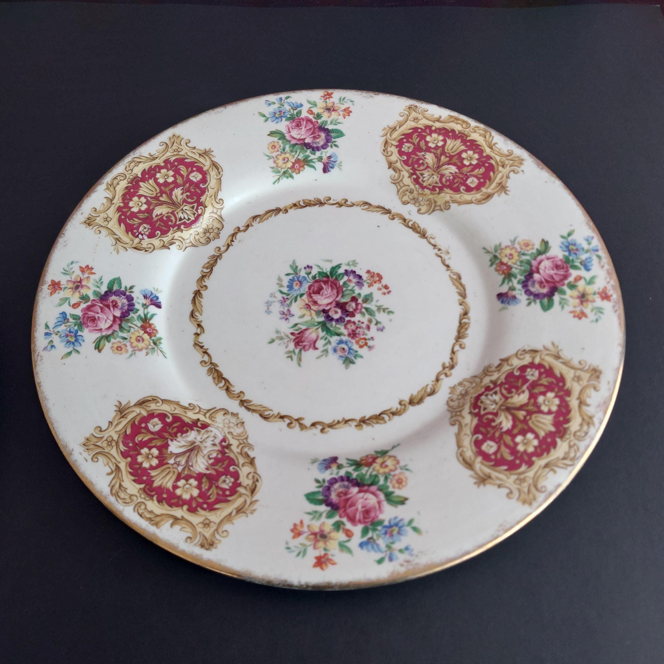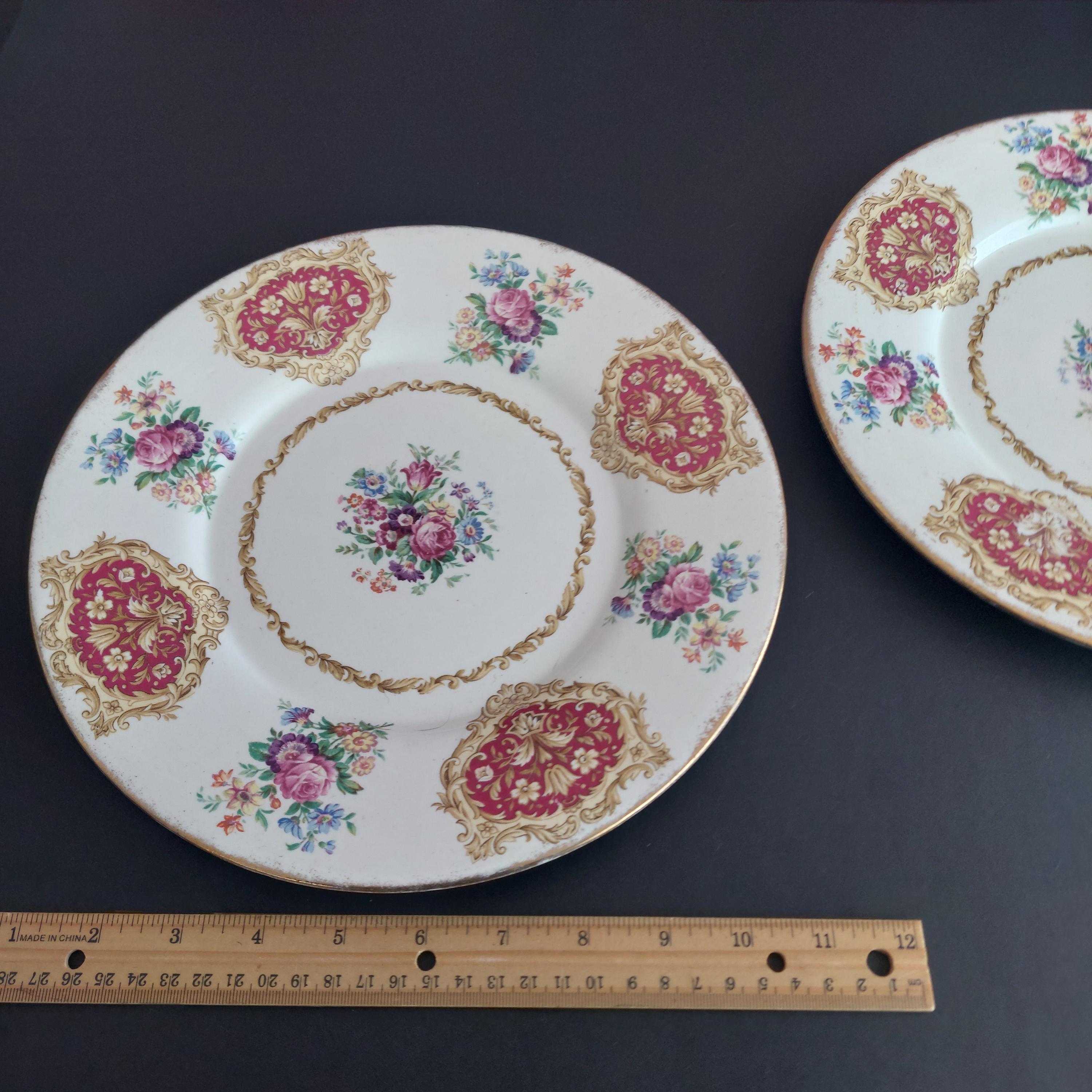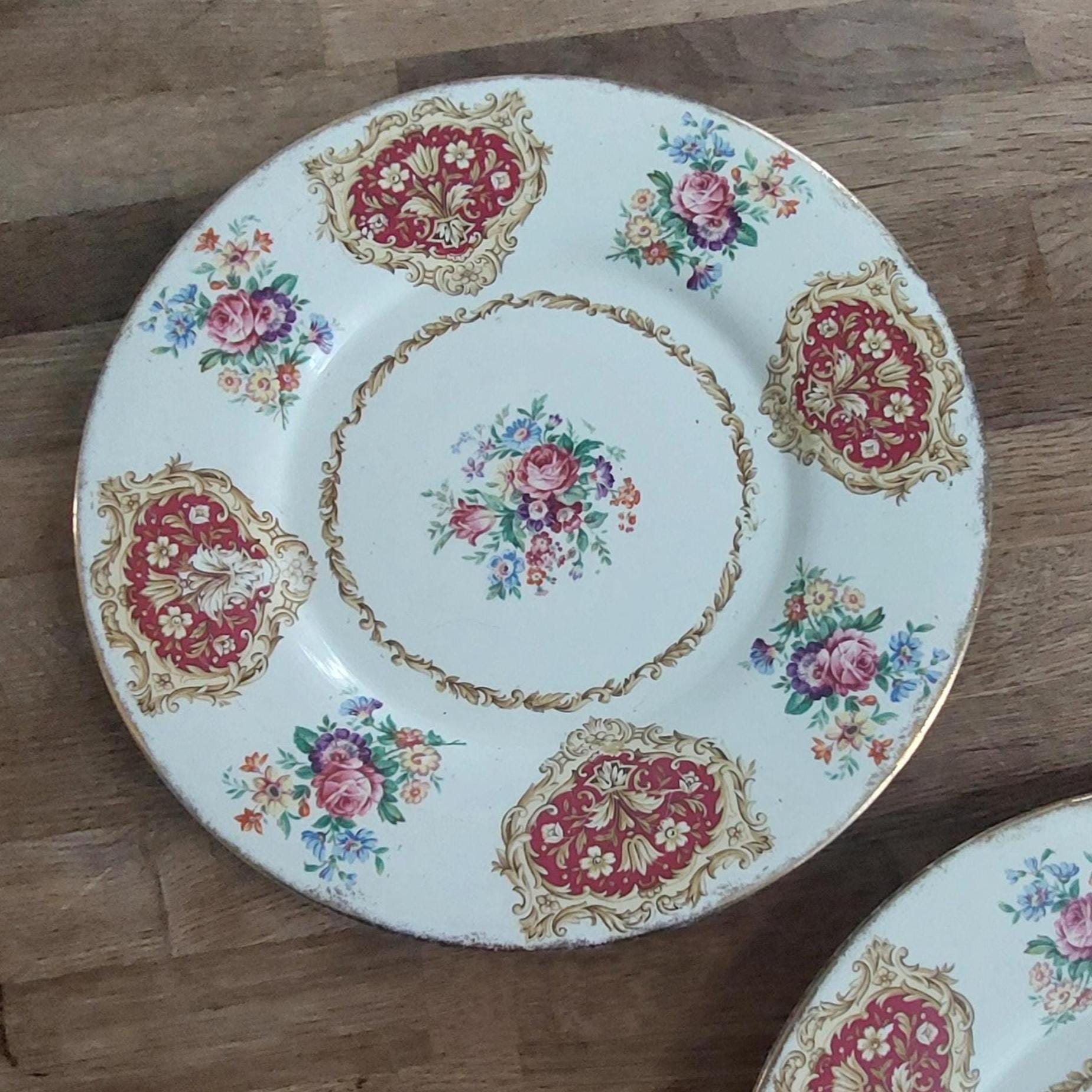 Plates feature maroon red insets, tan scrolls and multicolored florals on a cream background. Gold brushed edge.