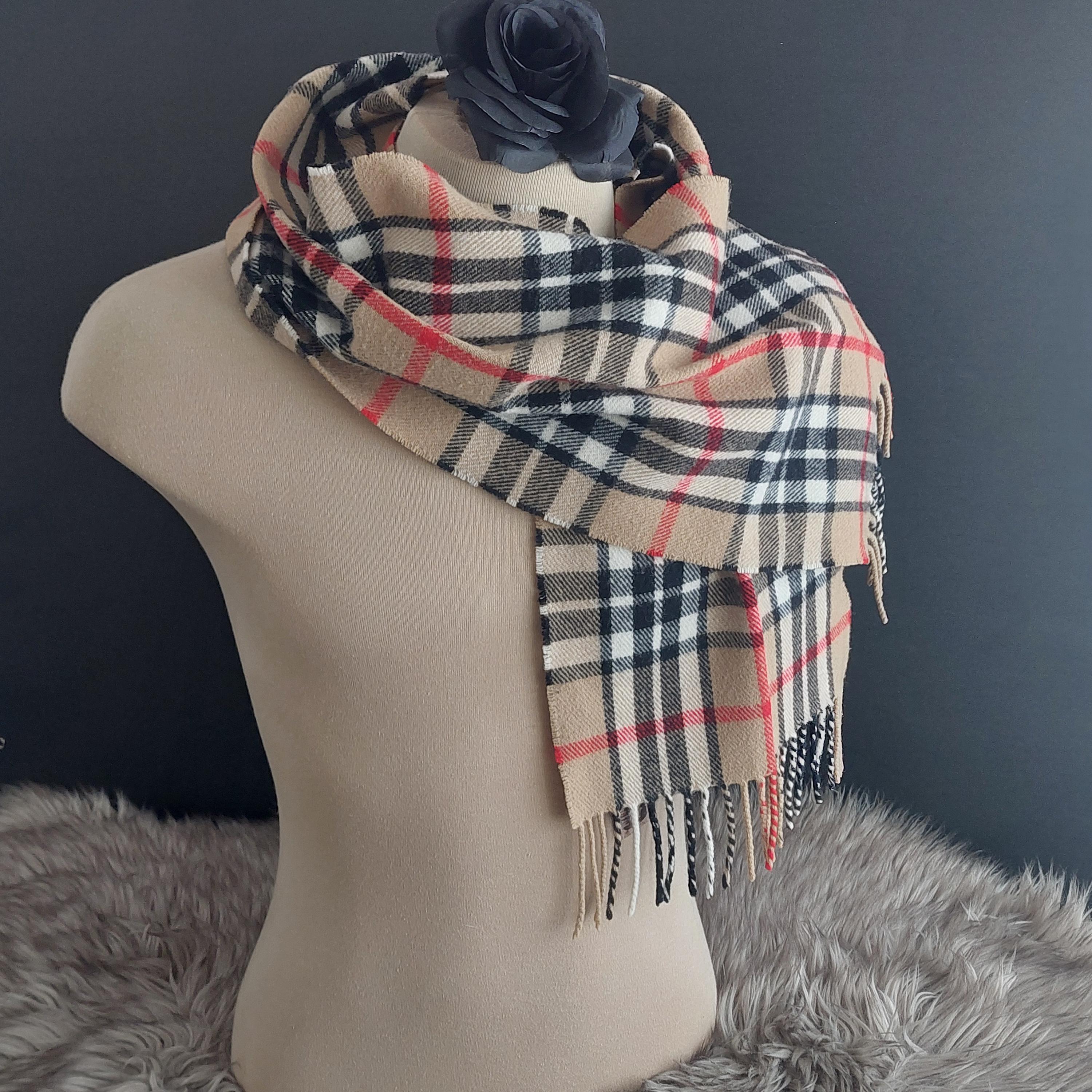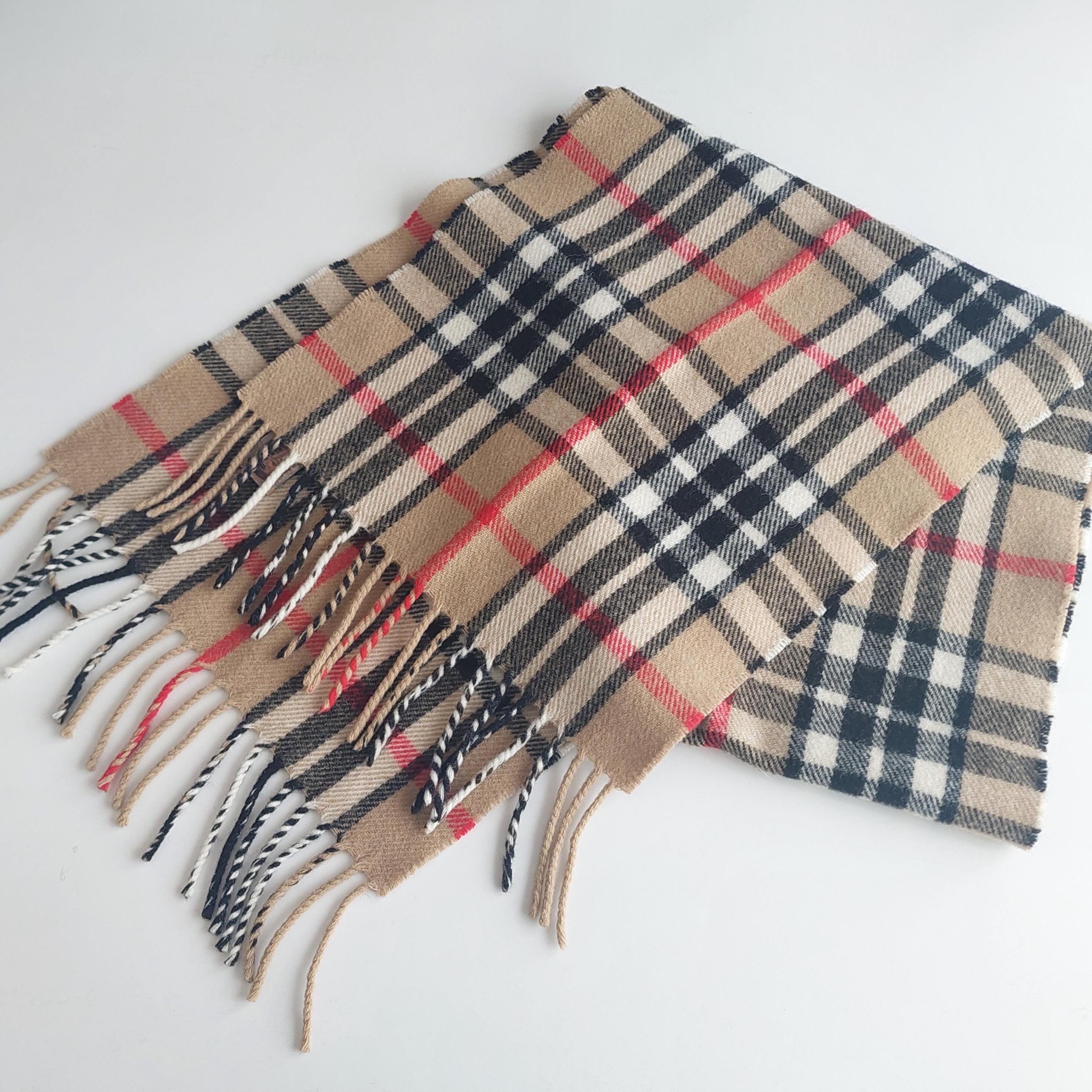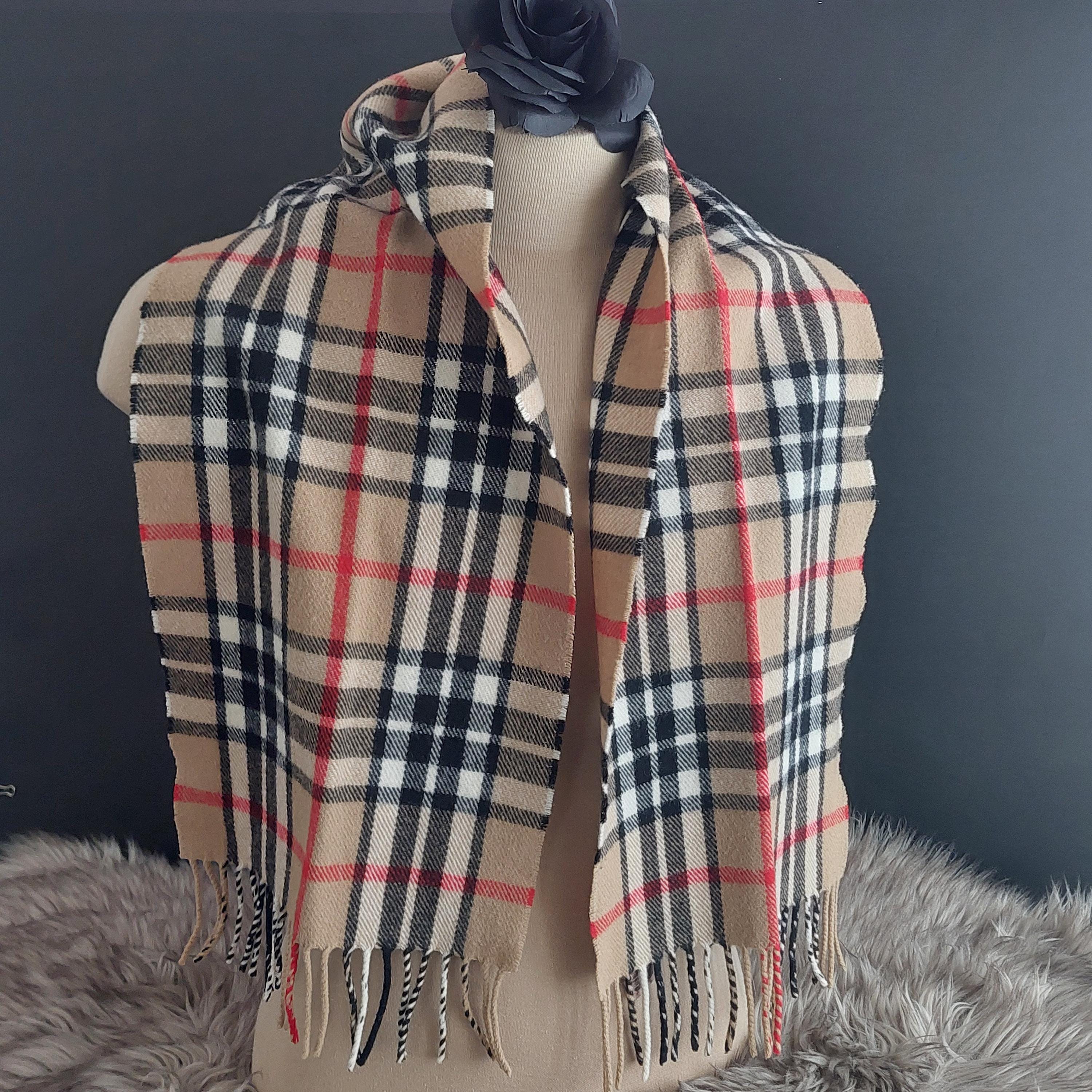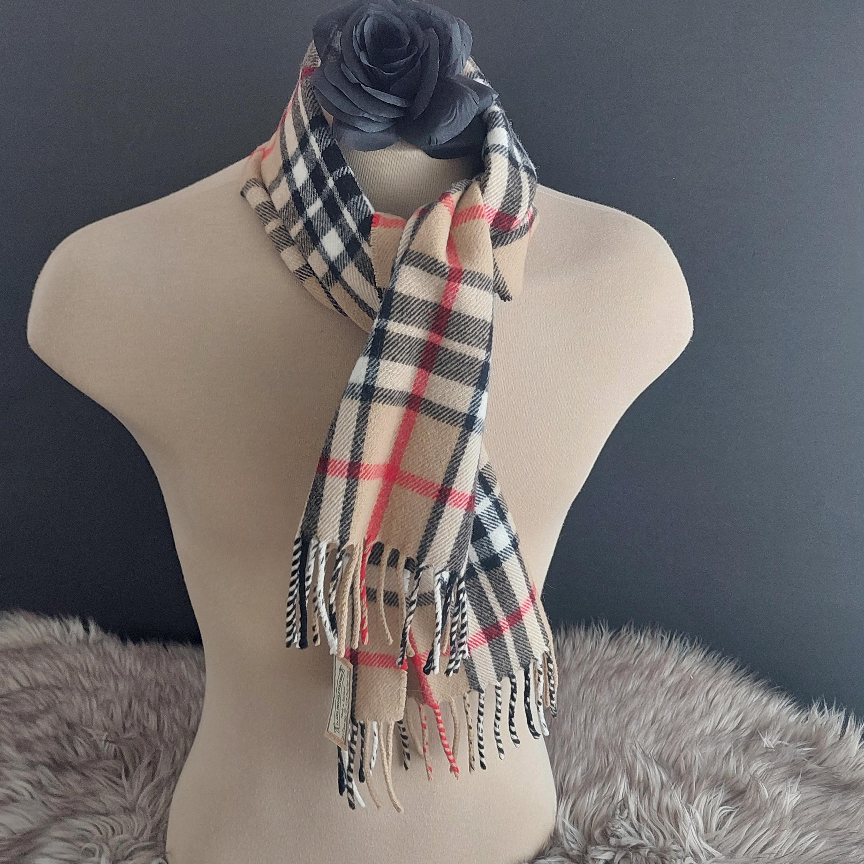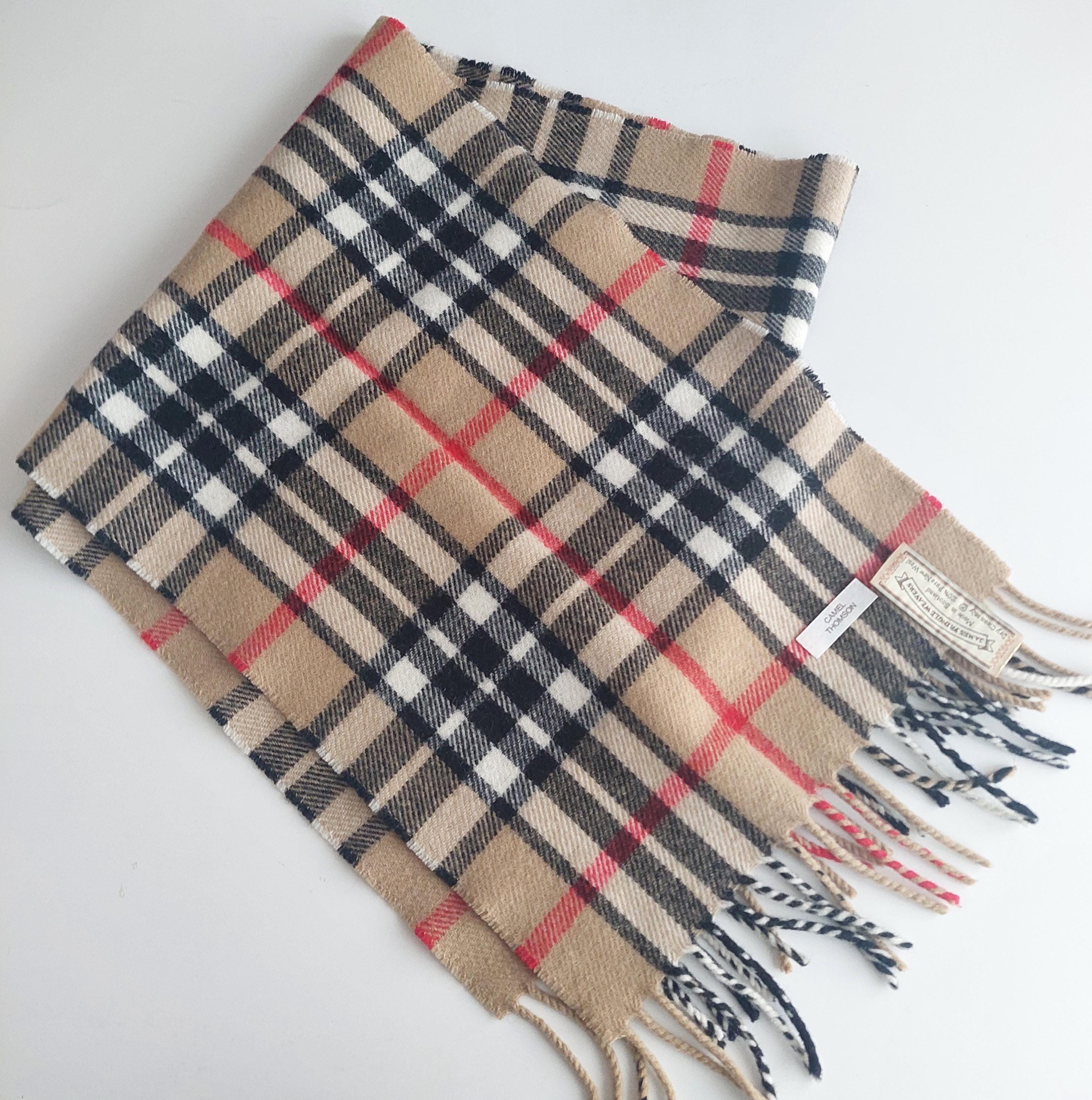 Vintage James Pringle Weavers of Scotland wool neck scarf in Thomson tartan in camel/tan, black, white and red.