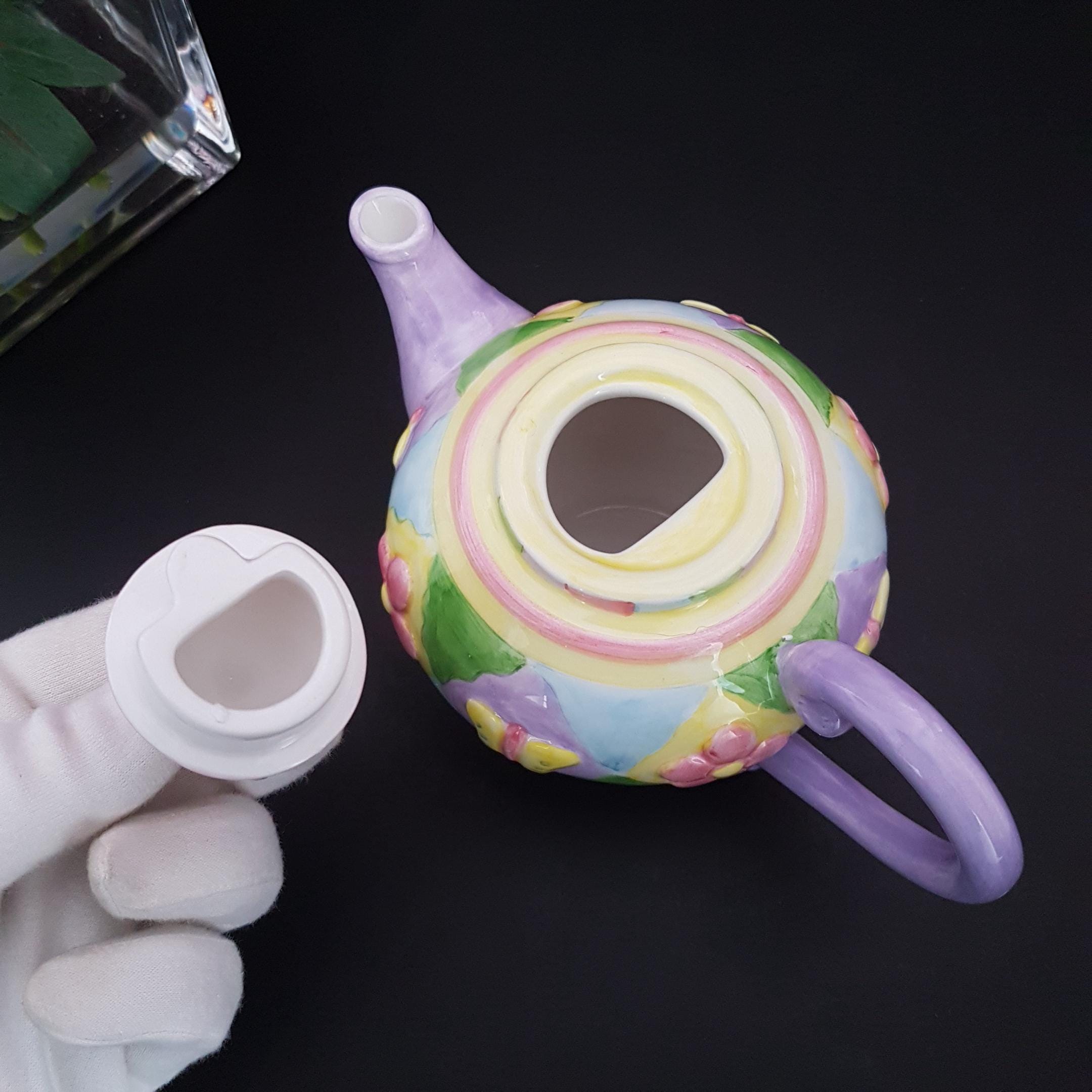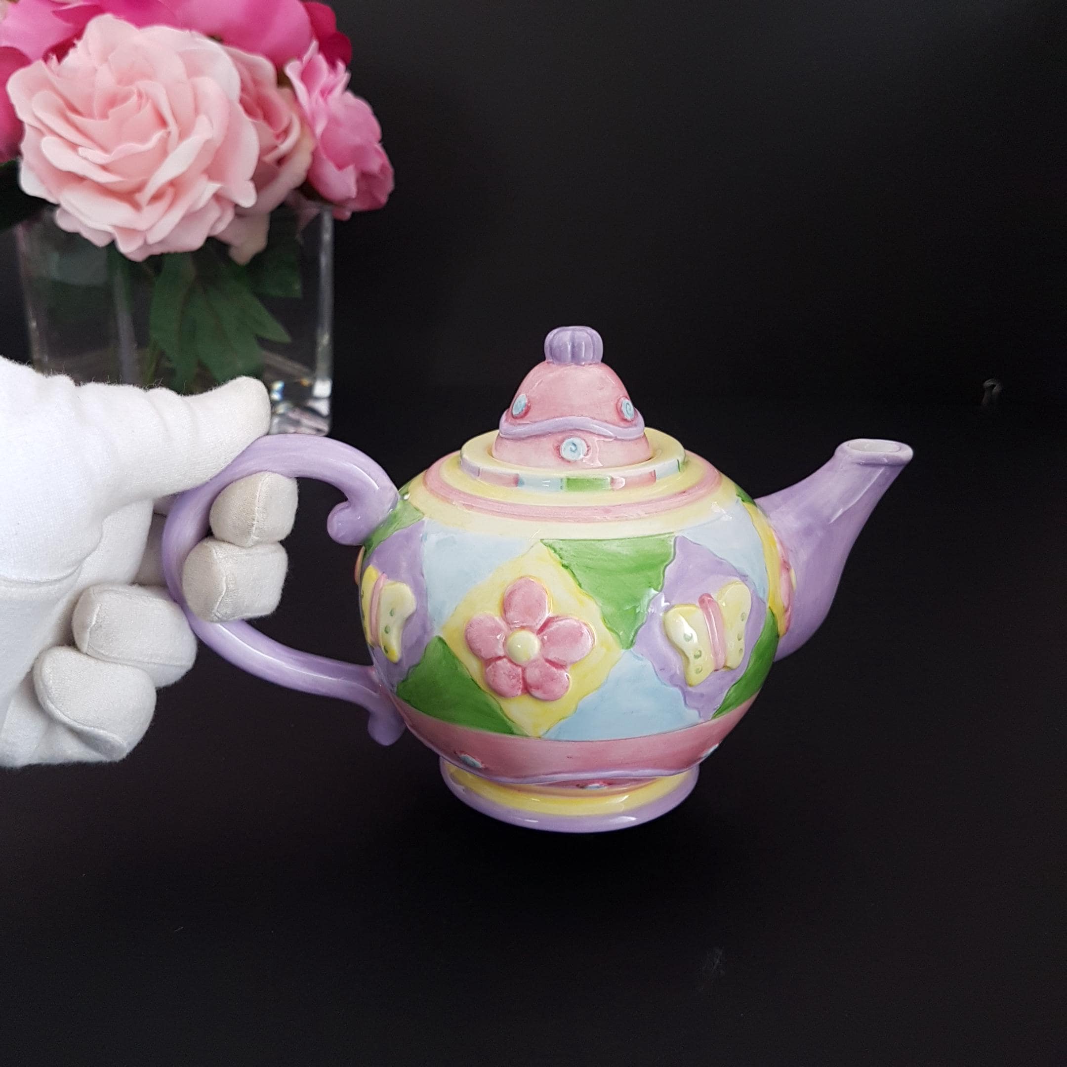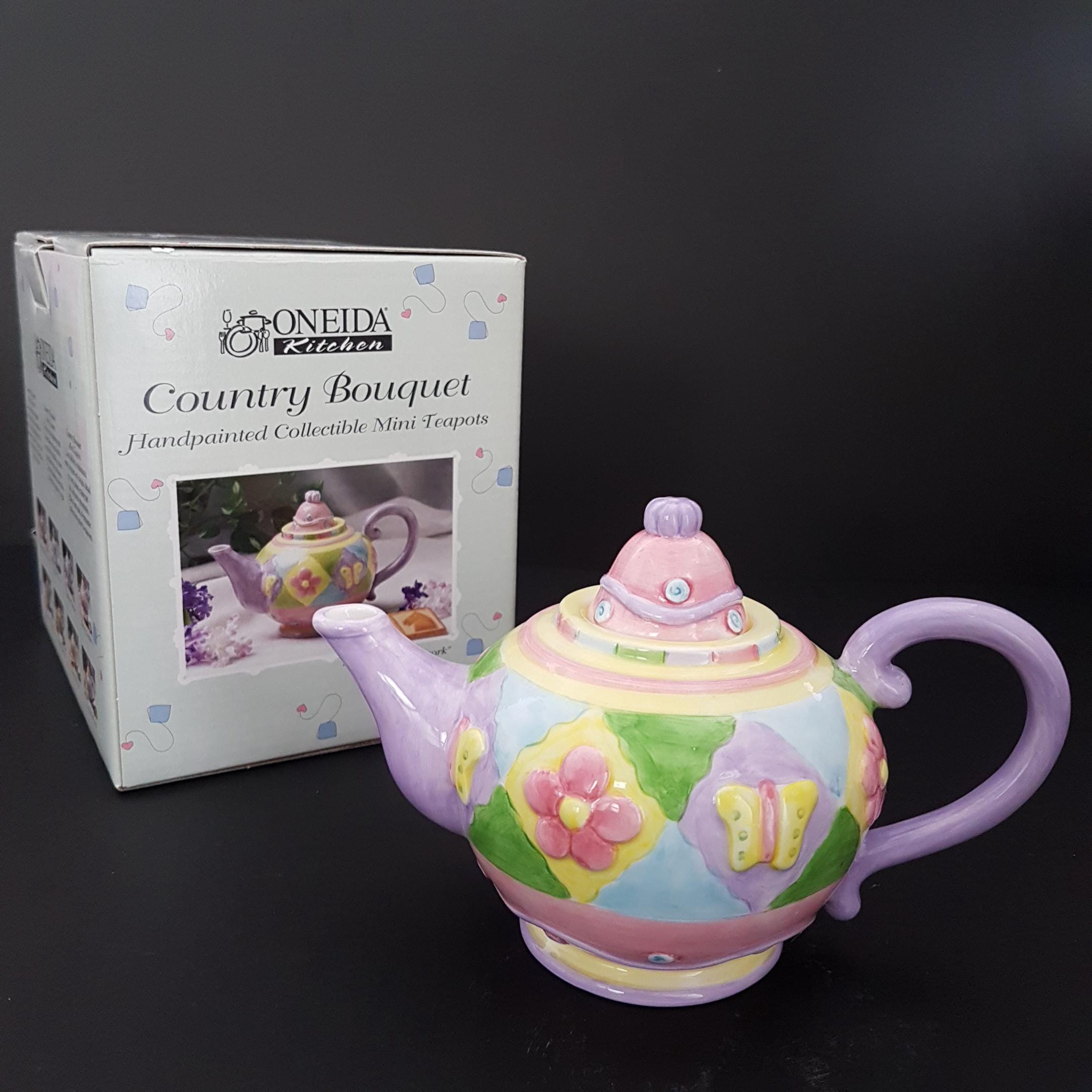 2001 Butterfly Patchwork mini teapot, part of the Oneida Kitchen Country Bouquet Handpainted Collectible Mini Teapots series.