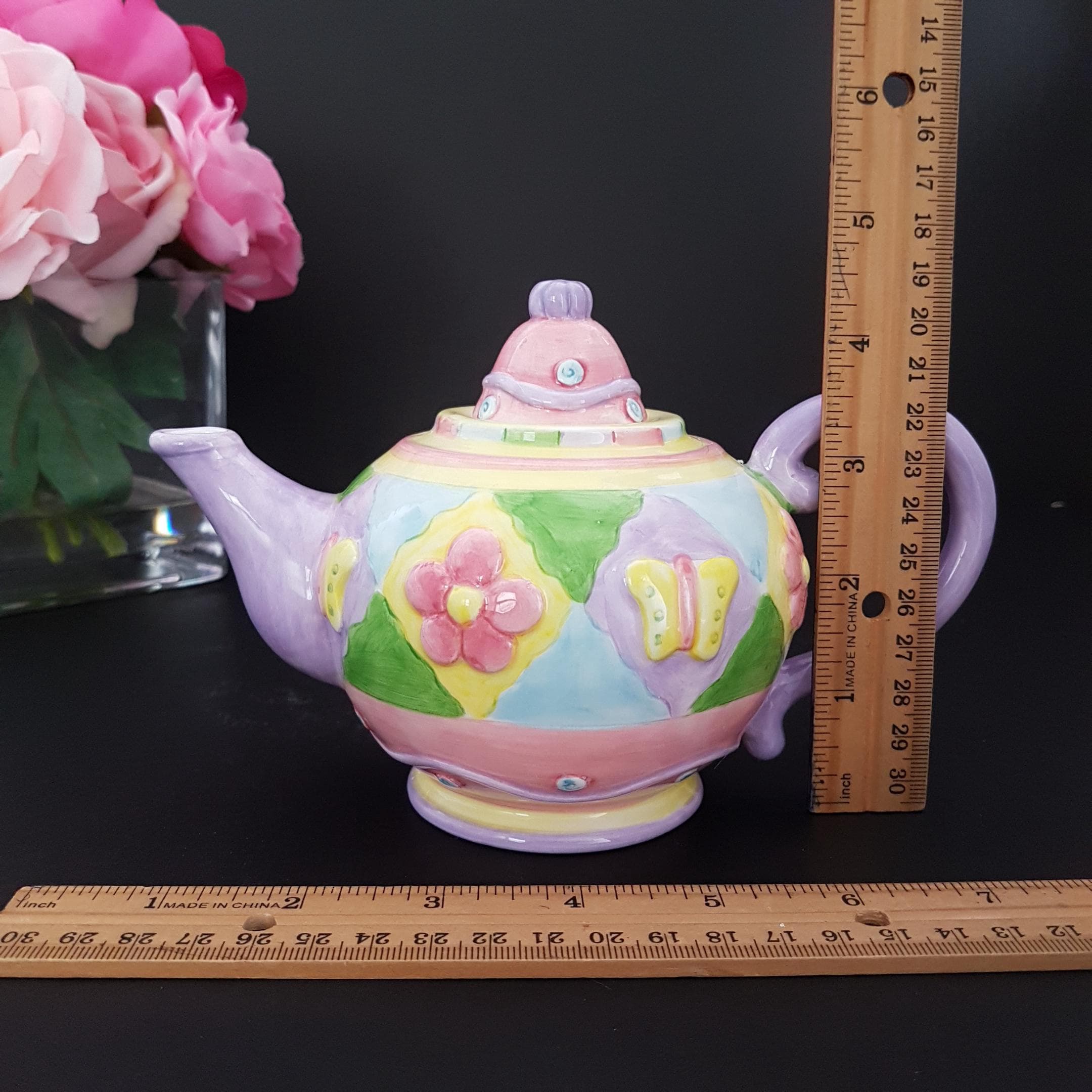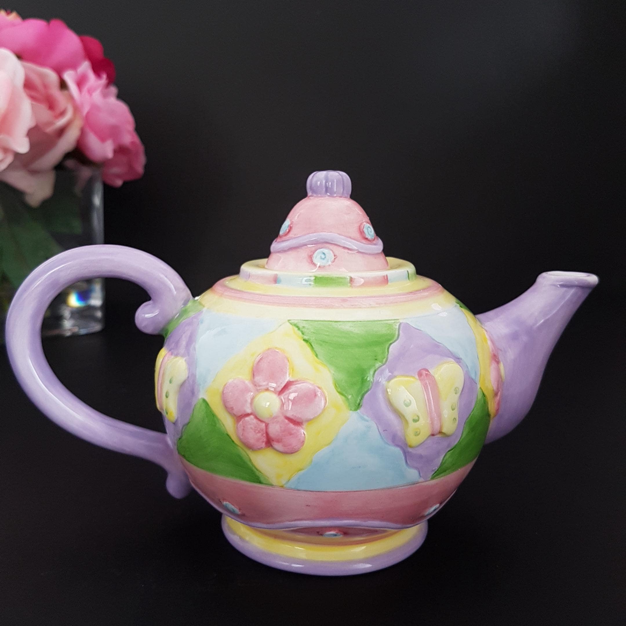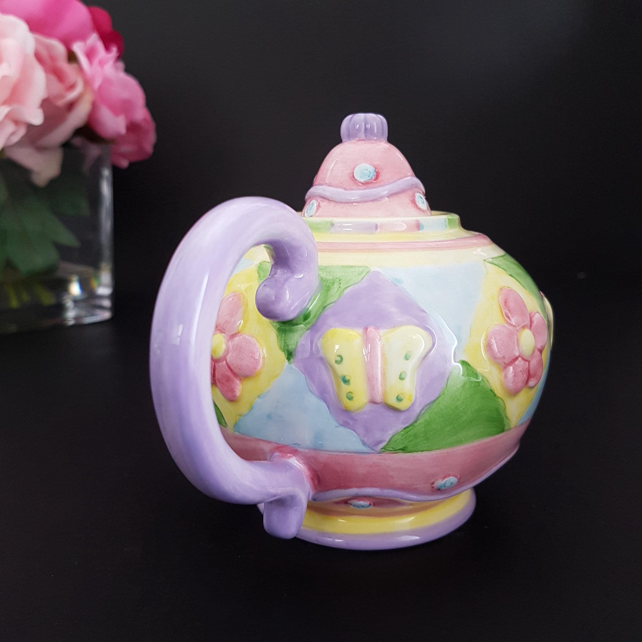 2001 Butterfly Patchwork mini teapot, part of the Oneida Kitchen Country Bouquet Handpainted Collectible Mini Teapots series.