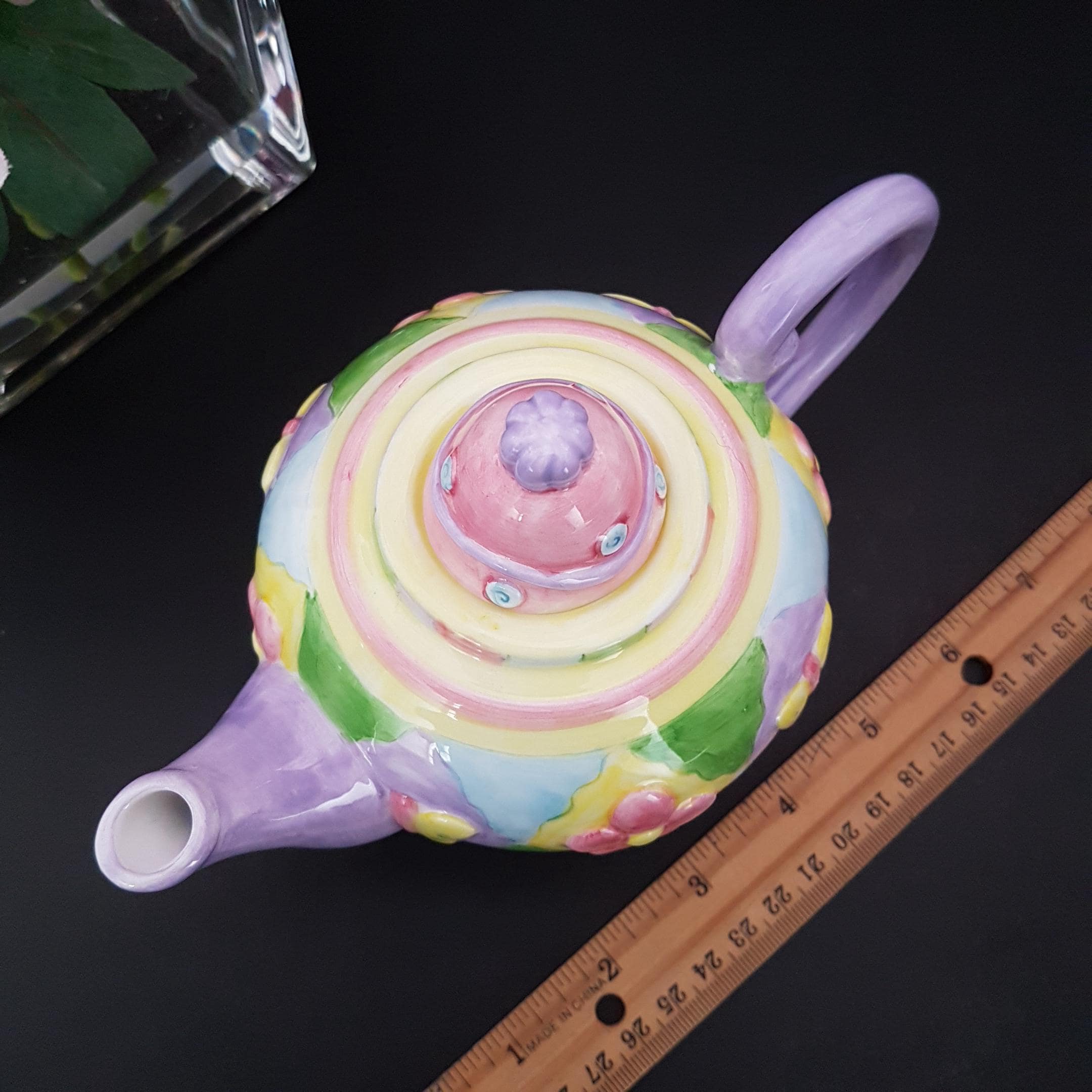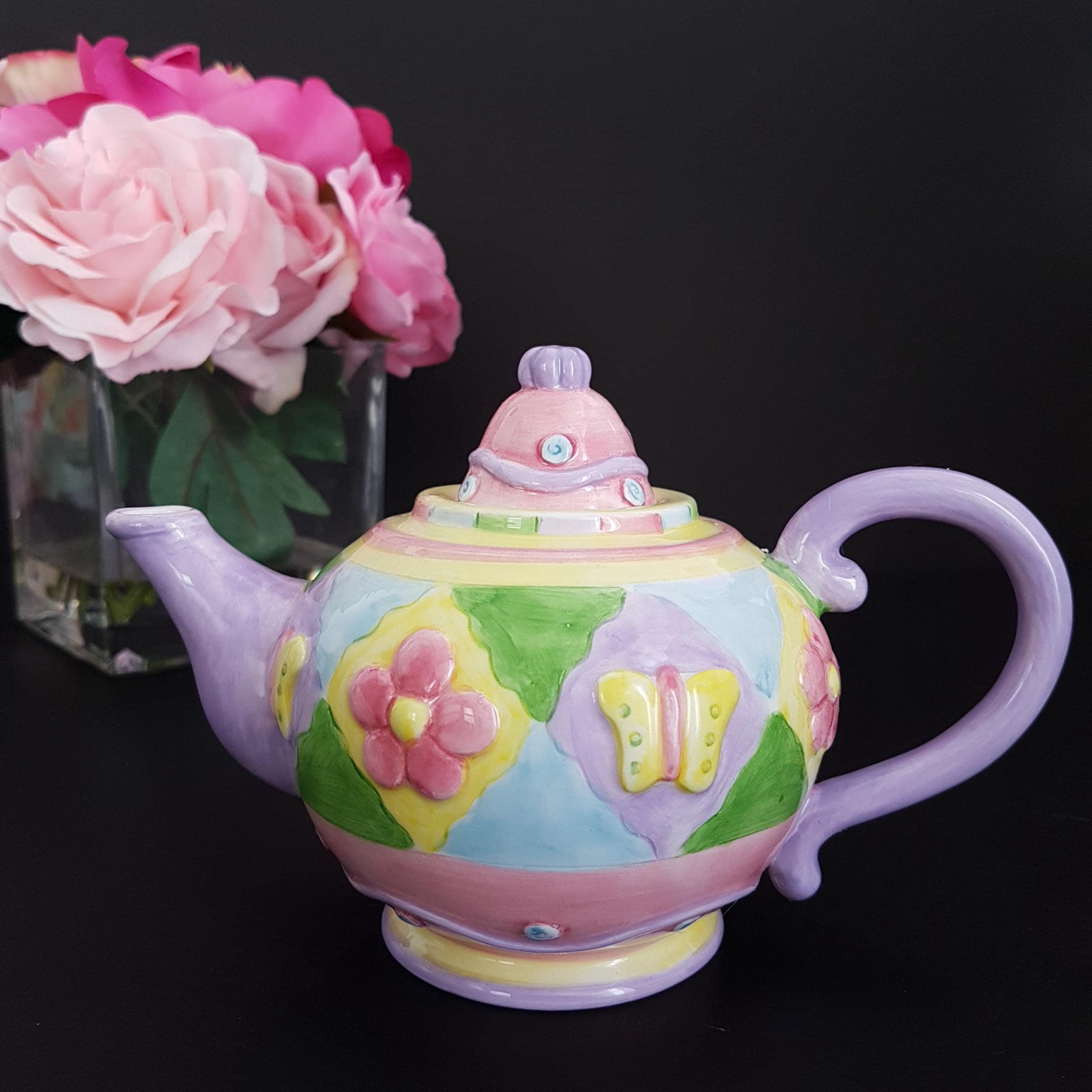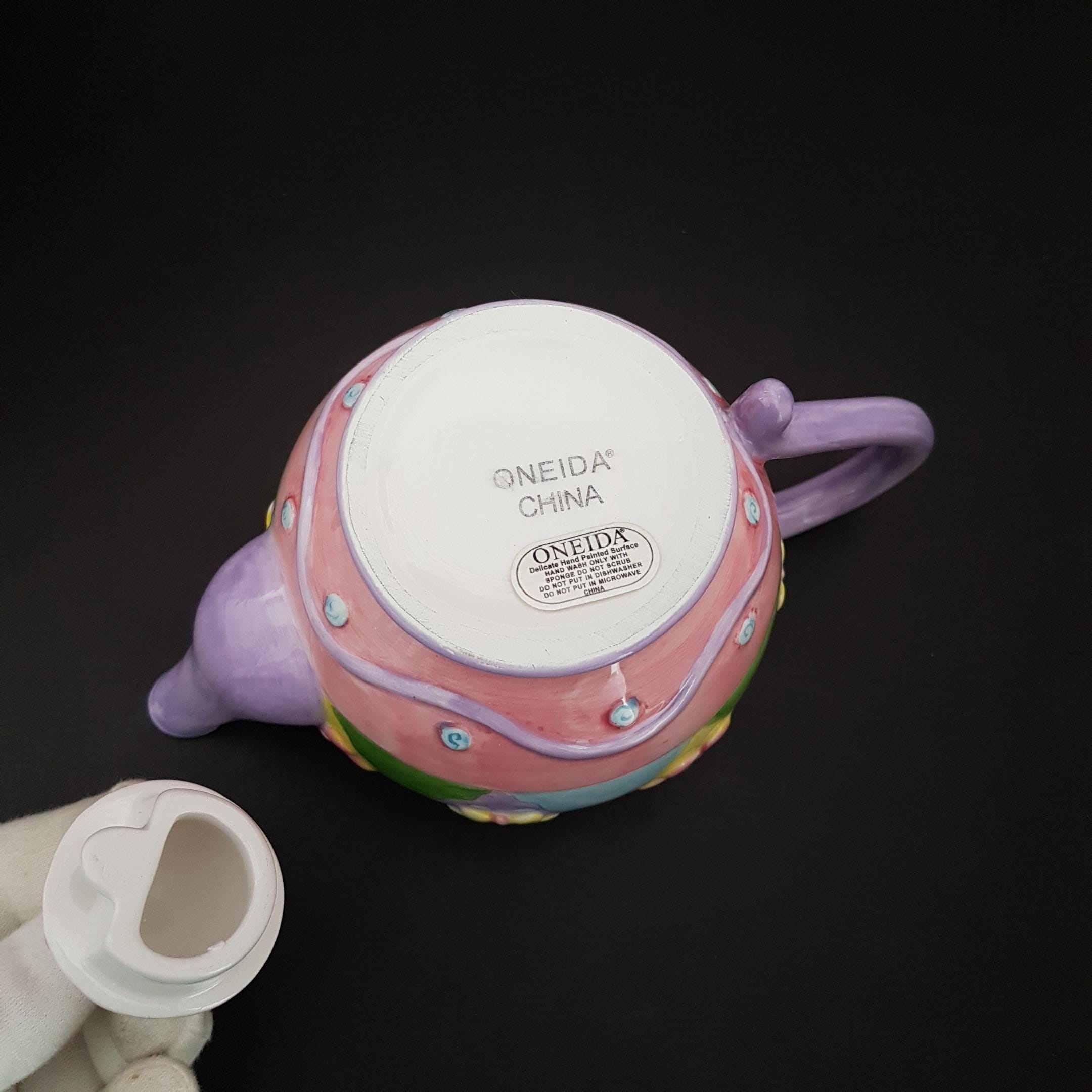 Tea pot is hand painted in mauve, pink, yellow and green.