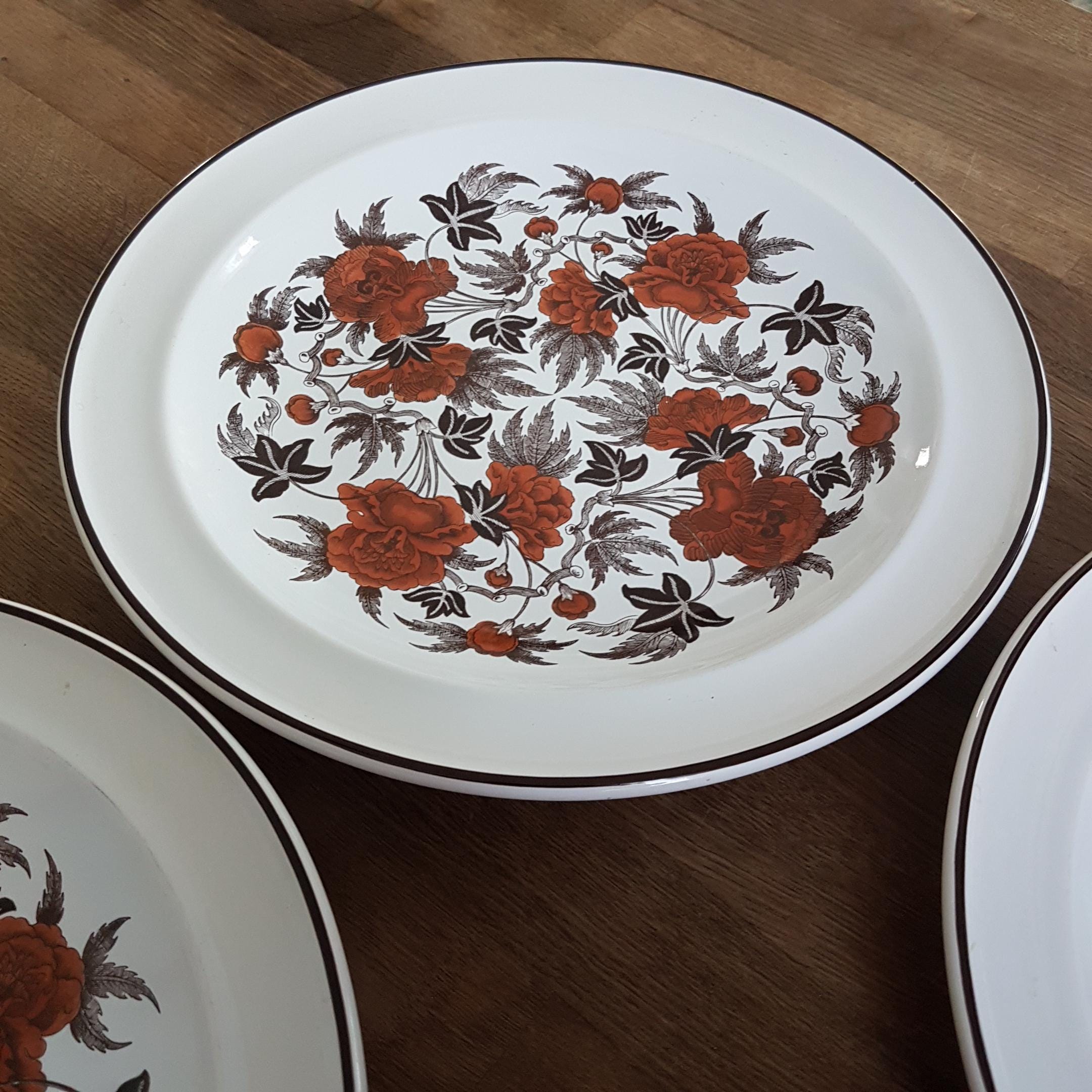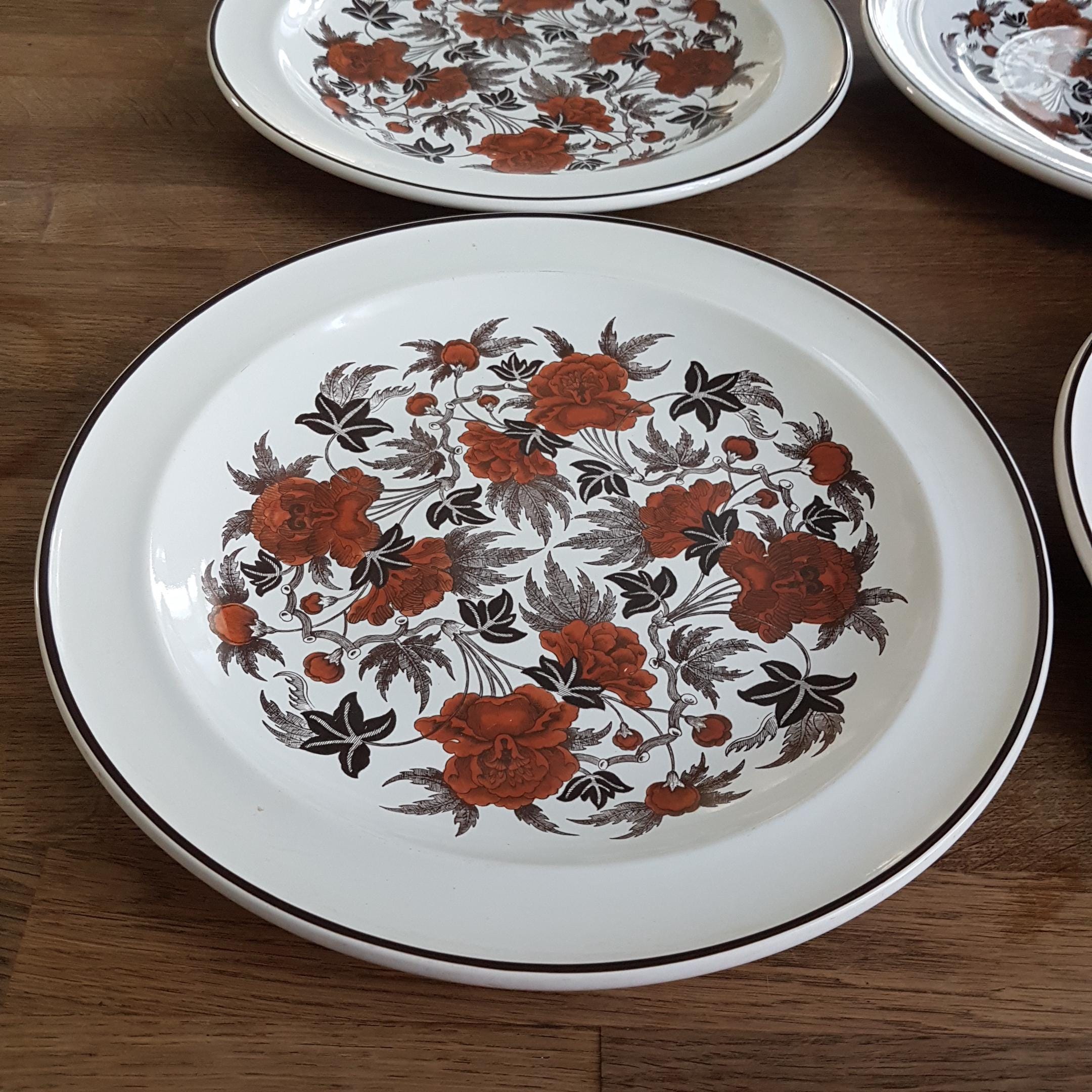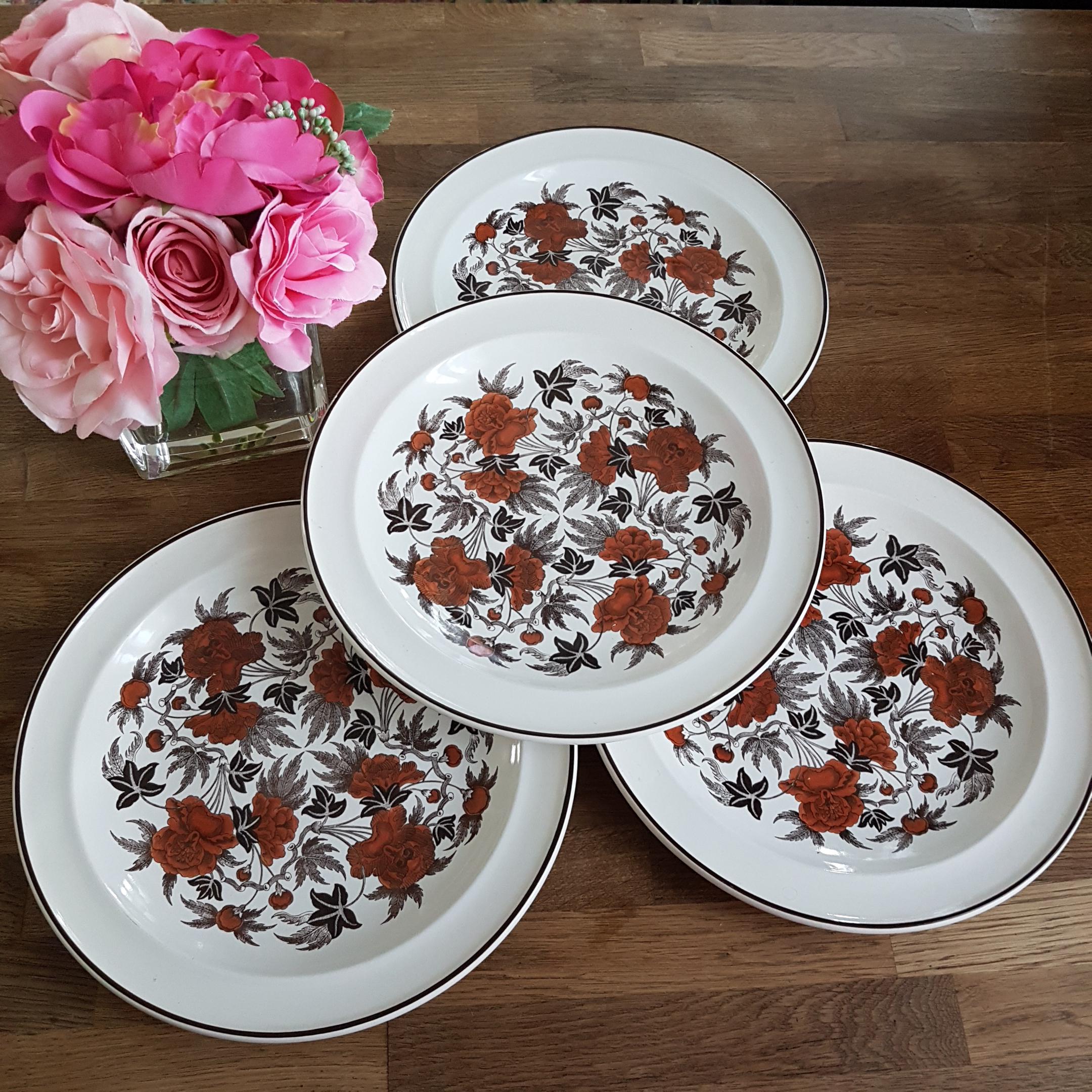 4-piece Wedgwood Peony dinner plates. Pattern features rust flowers and brown leaves. Convenience of oven-to-table.