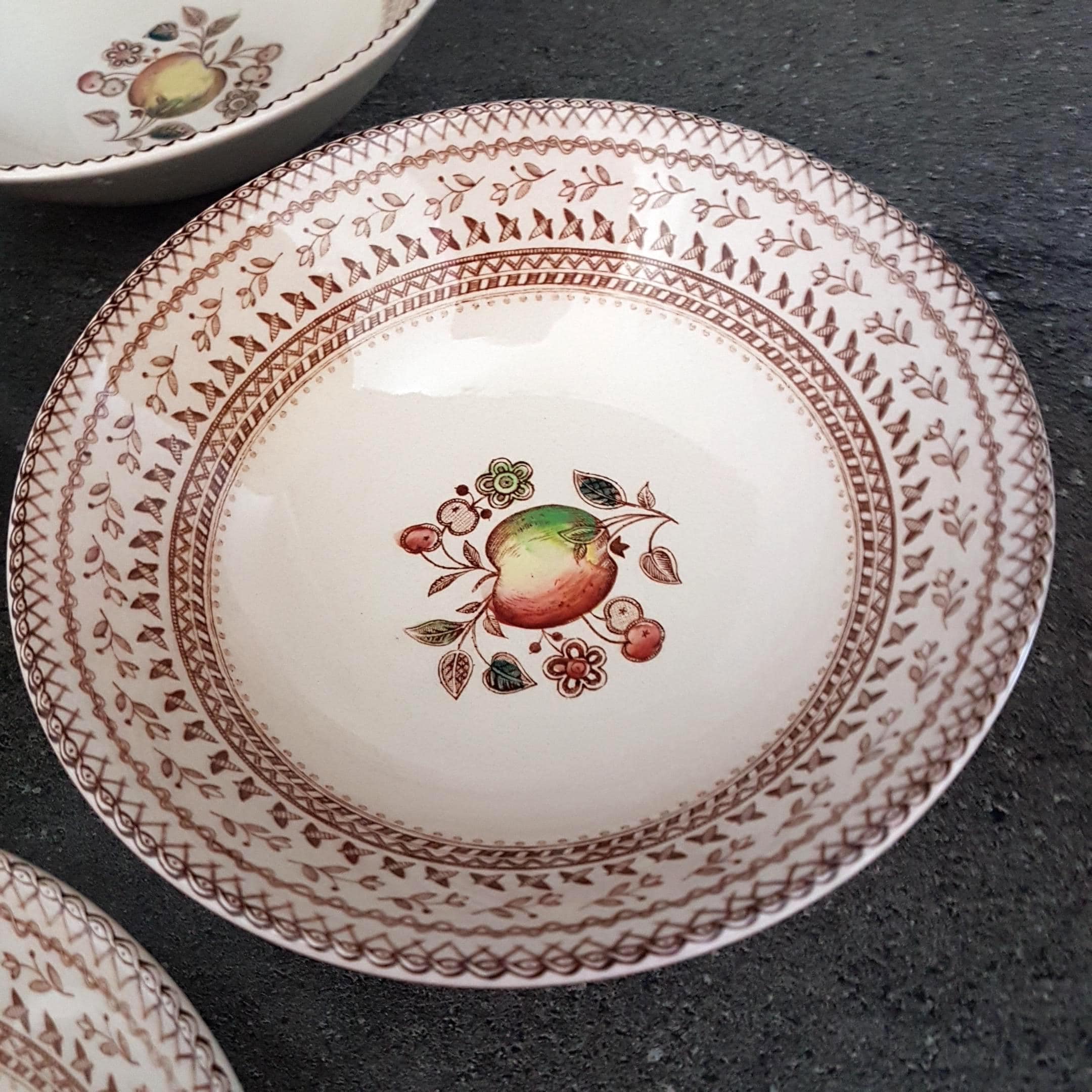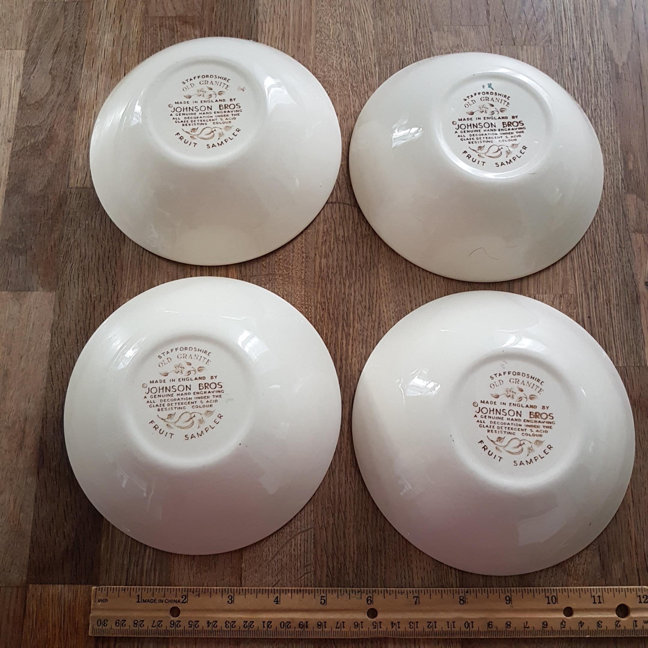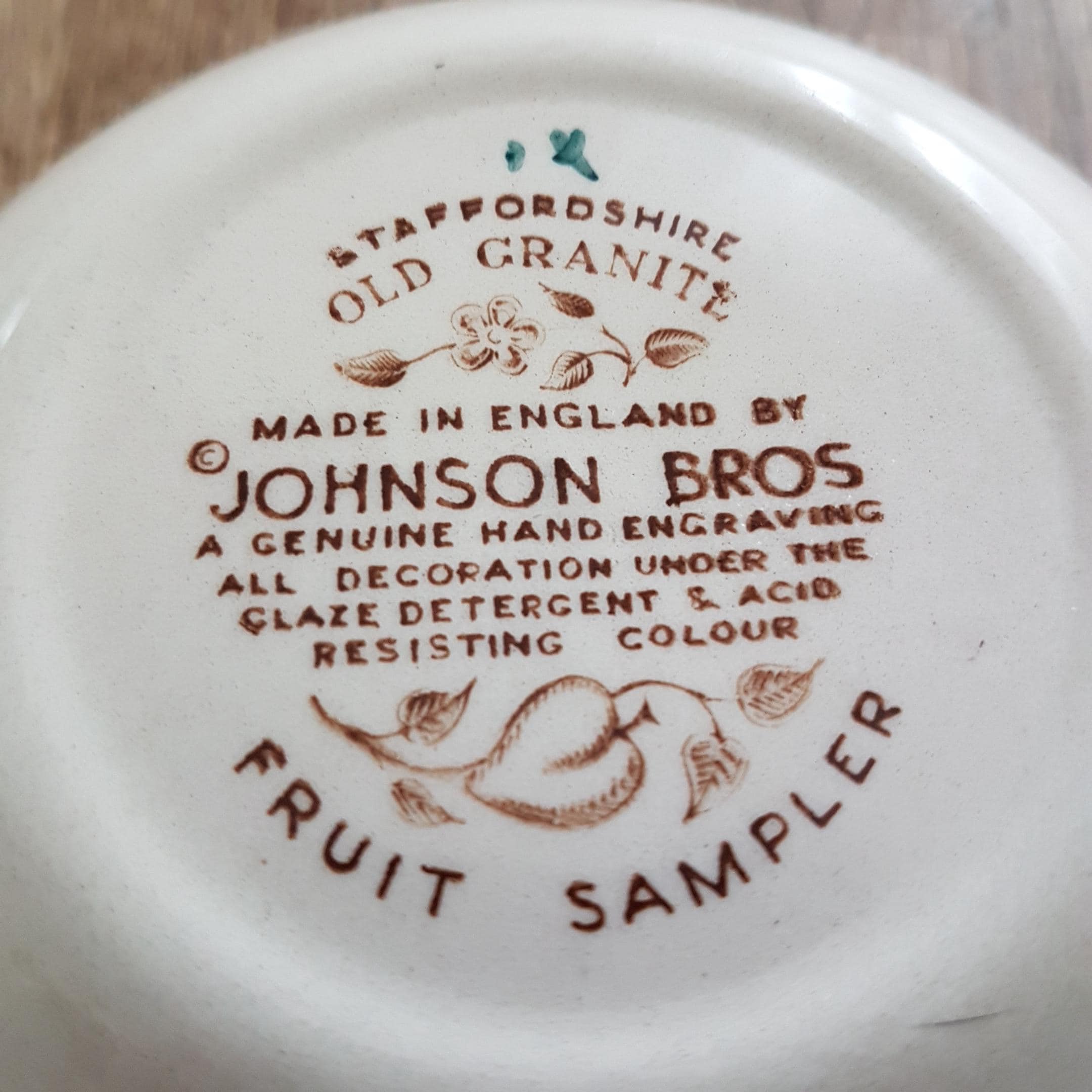 Backstamp: "Staffordshire Old Granite - Made in England by Johnson Bros - A Genuine Hand Engraving - All Decoration Under The Glaze - Detergent & Acid Resisting Colours - Fruit Sampler"