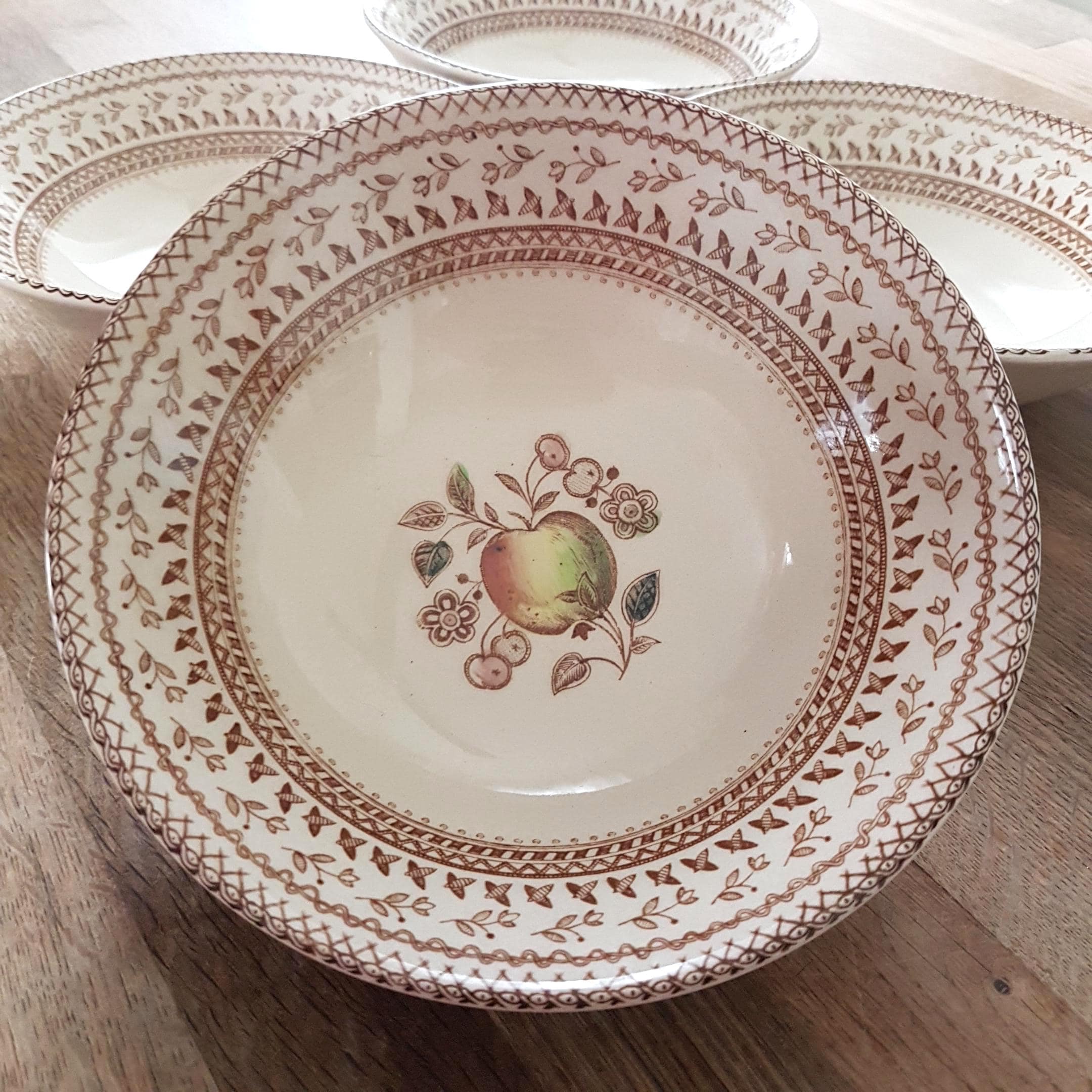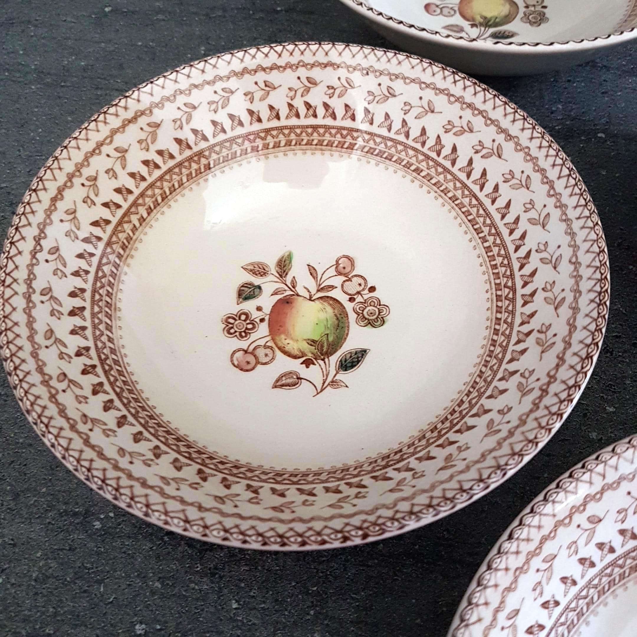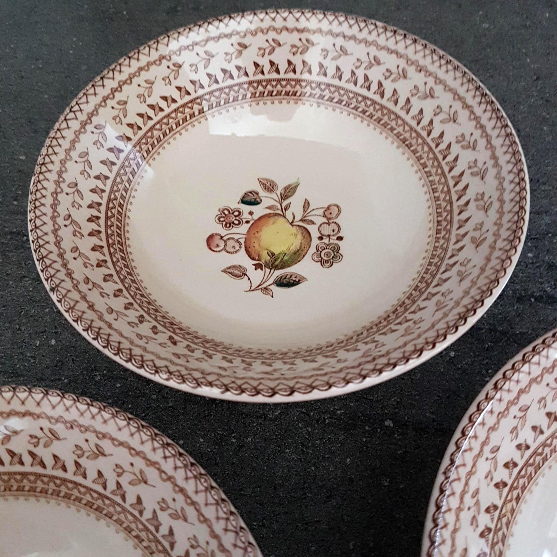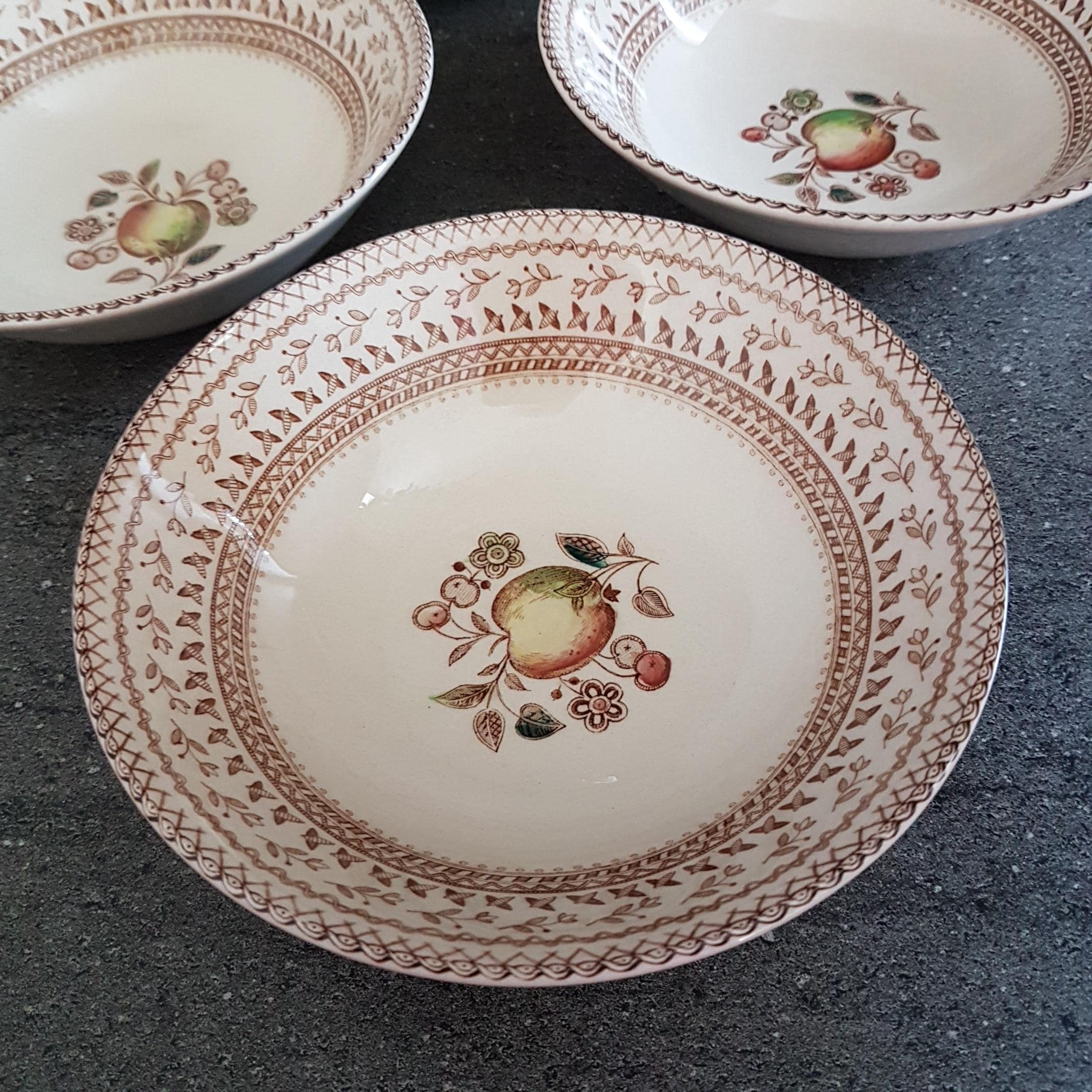 Backstamp: "Staffordshire Old Granite - Made in England by Johnson Bros - A Genuine Hand Engraving - All Decoration Under The Glaze - Detergent & Acid Resisting Colours - Fruit Sampler"