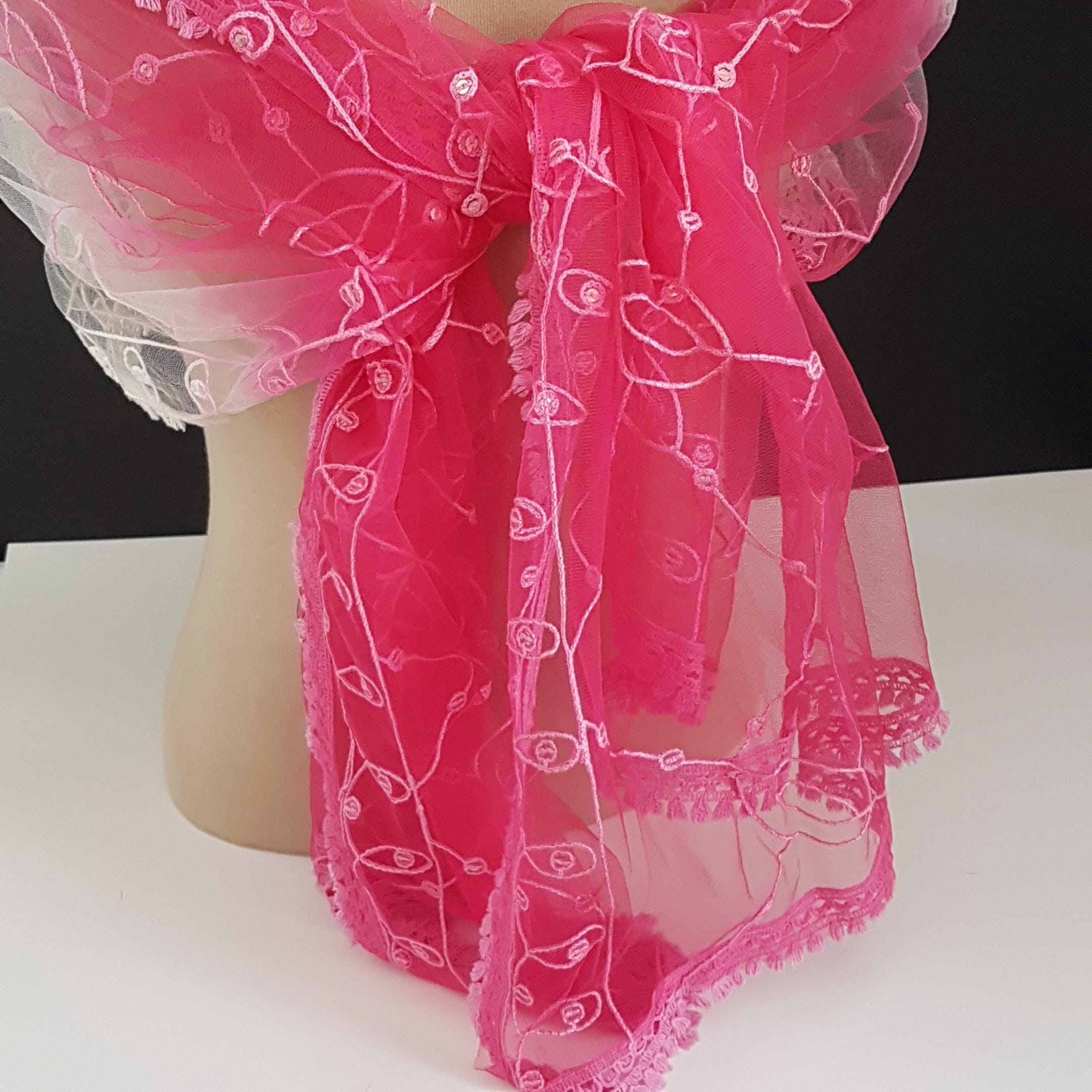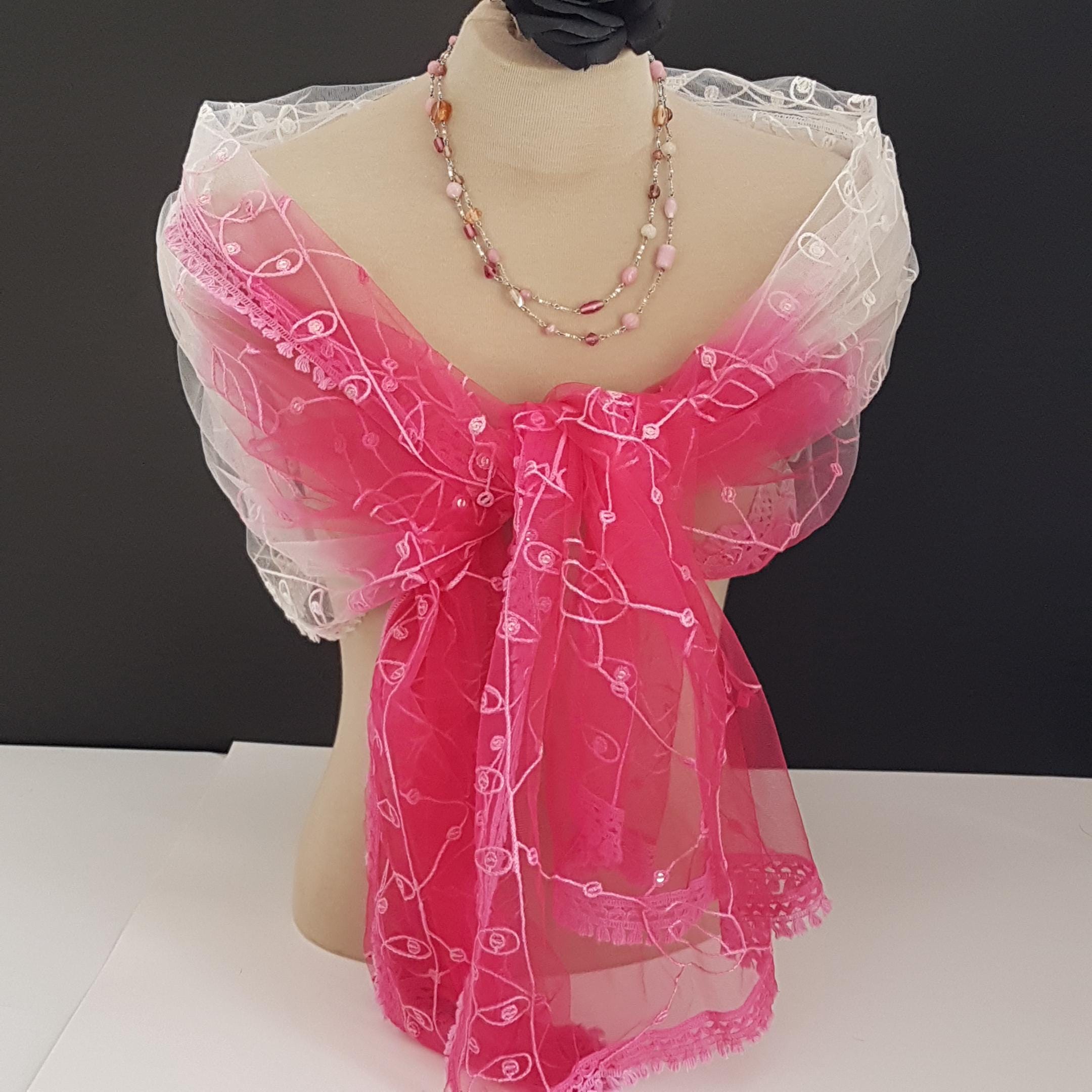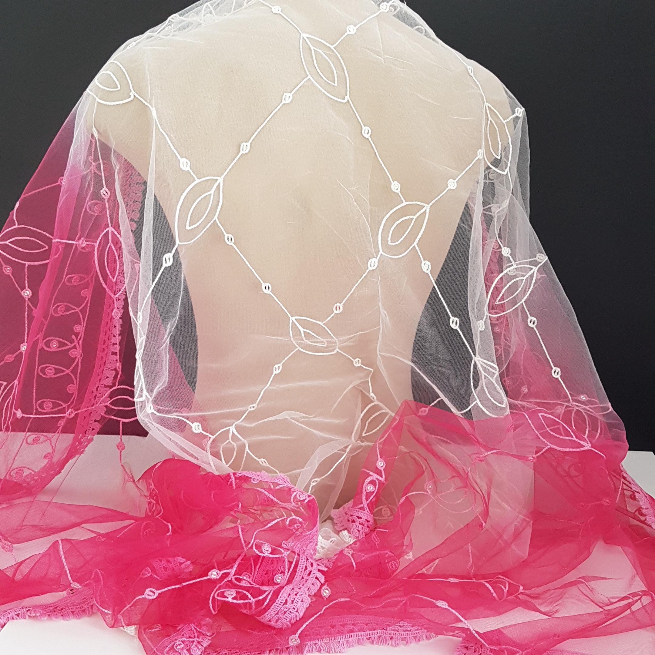 Vintage oversized should wrap featuring soft tulle-like or chiffon sheer fabric with machine embroidered leaf pattern with individual silver sequins sewn in. Embroidered edge in gradient pinks.