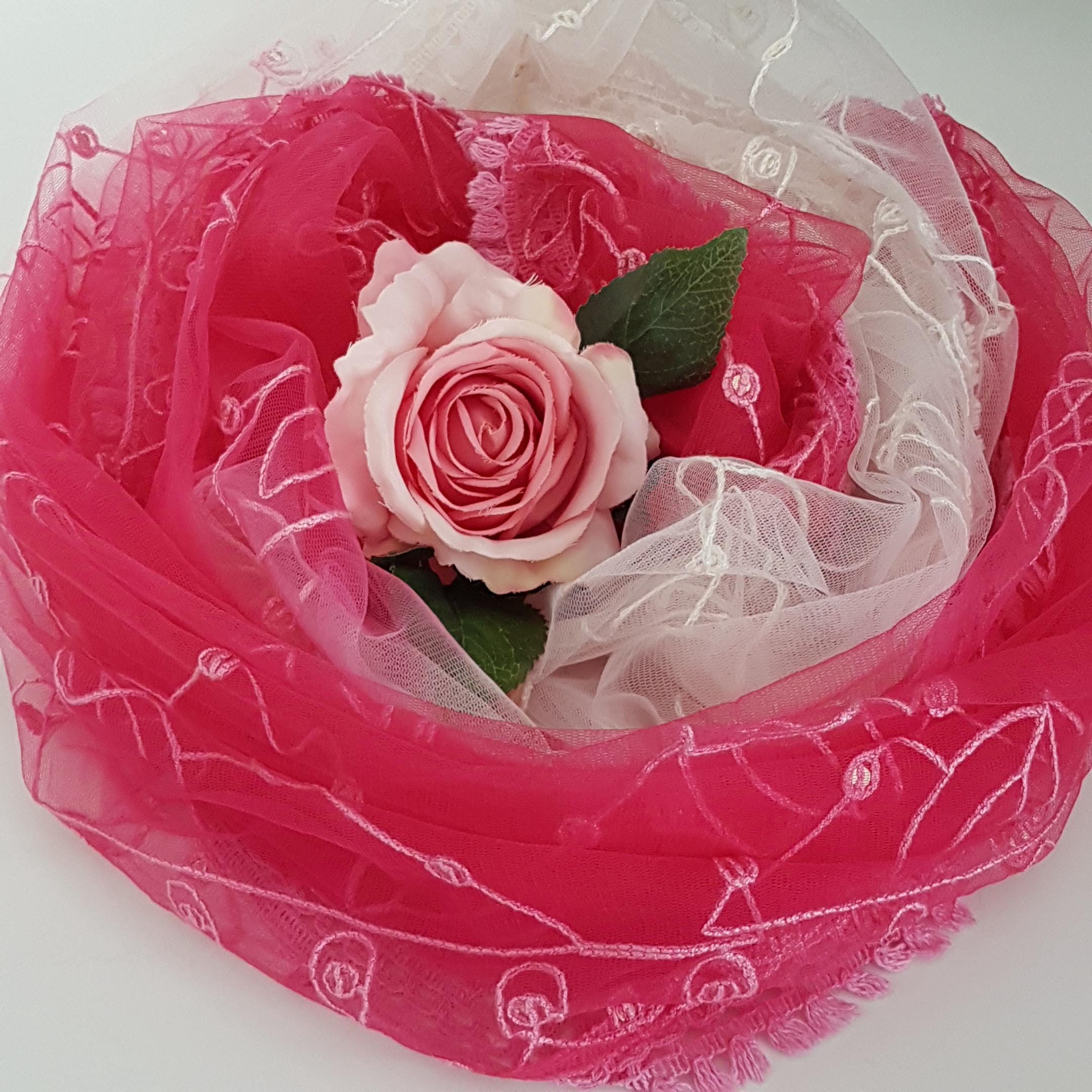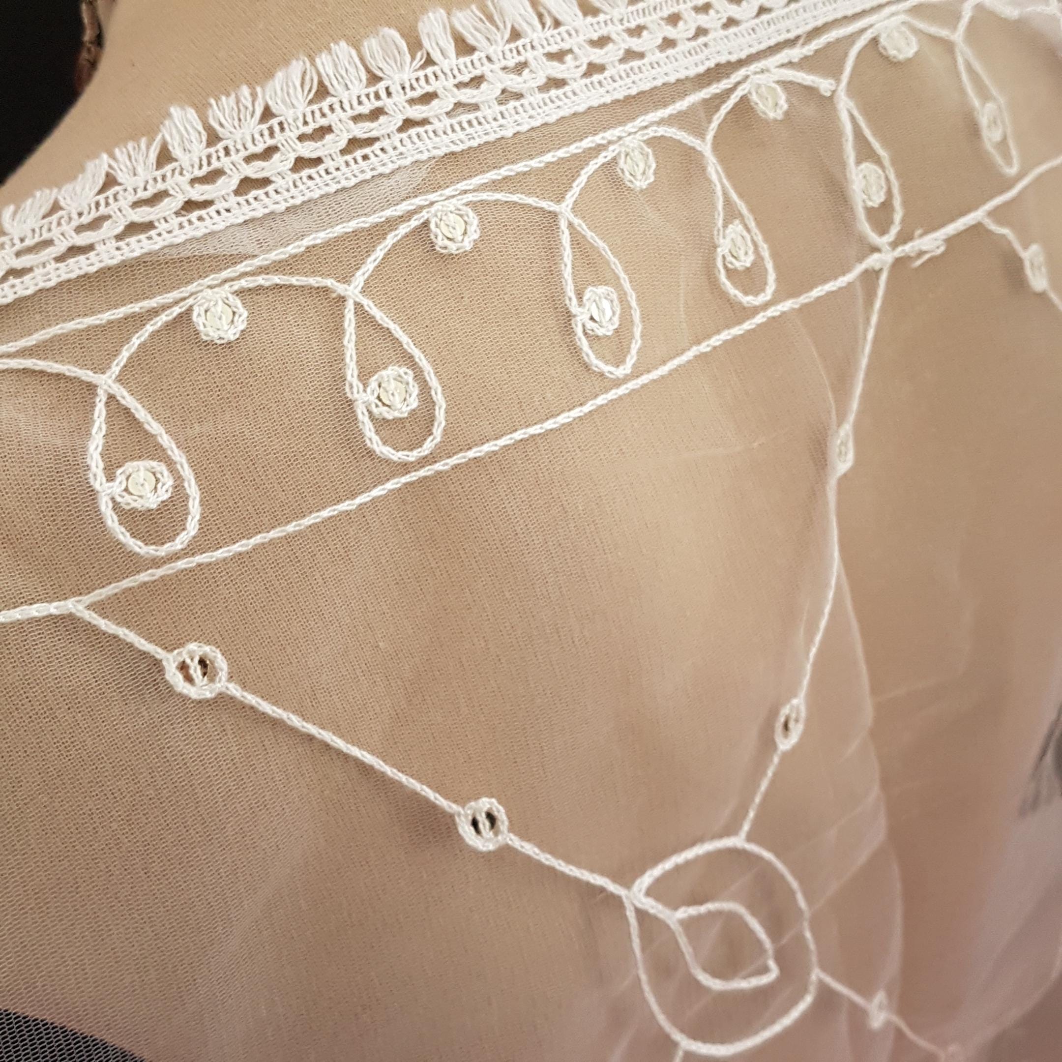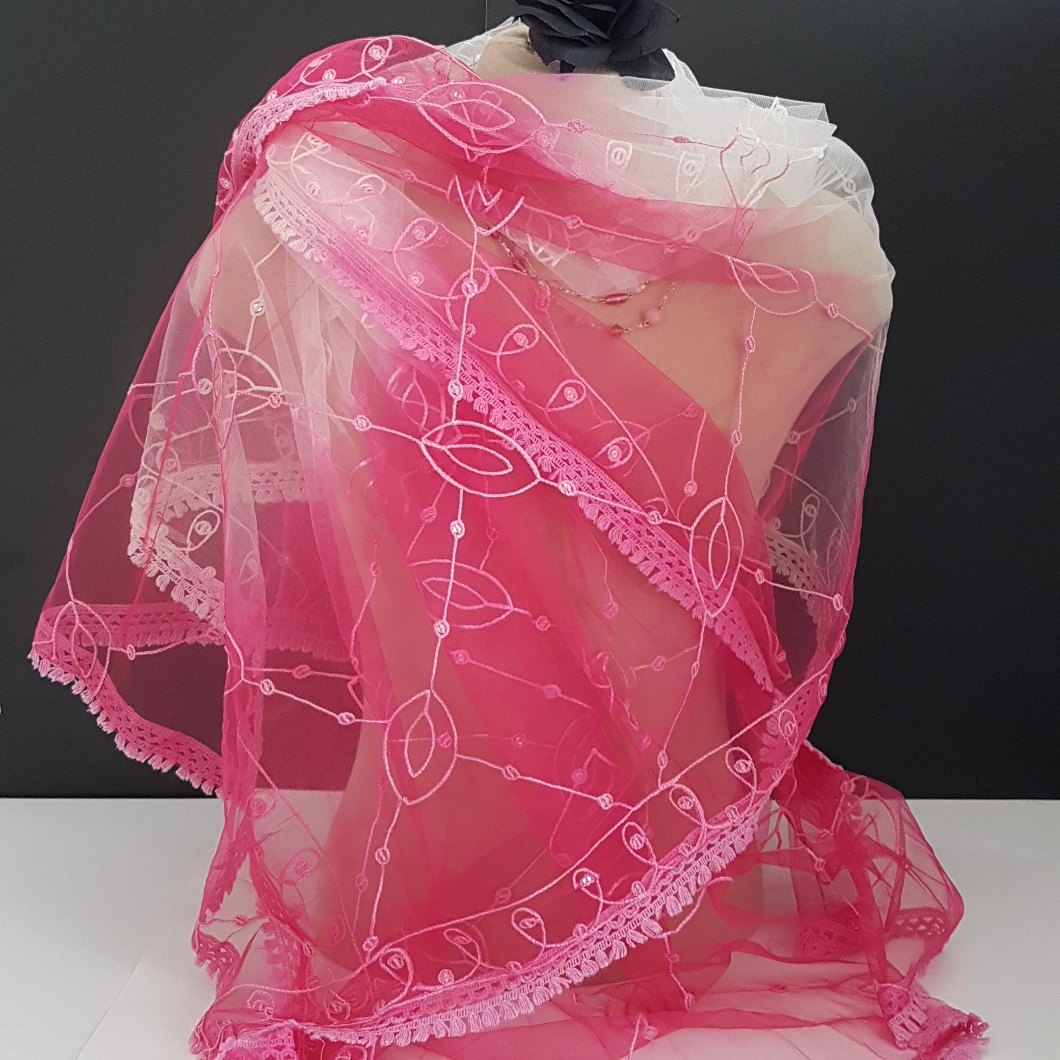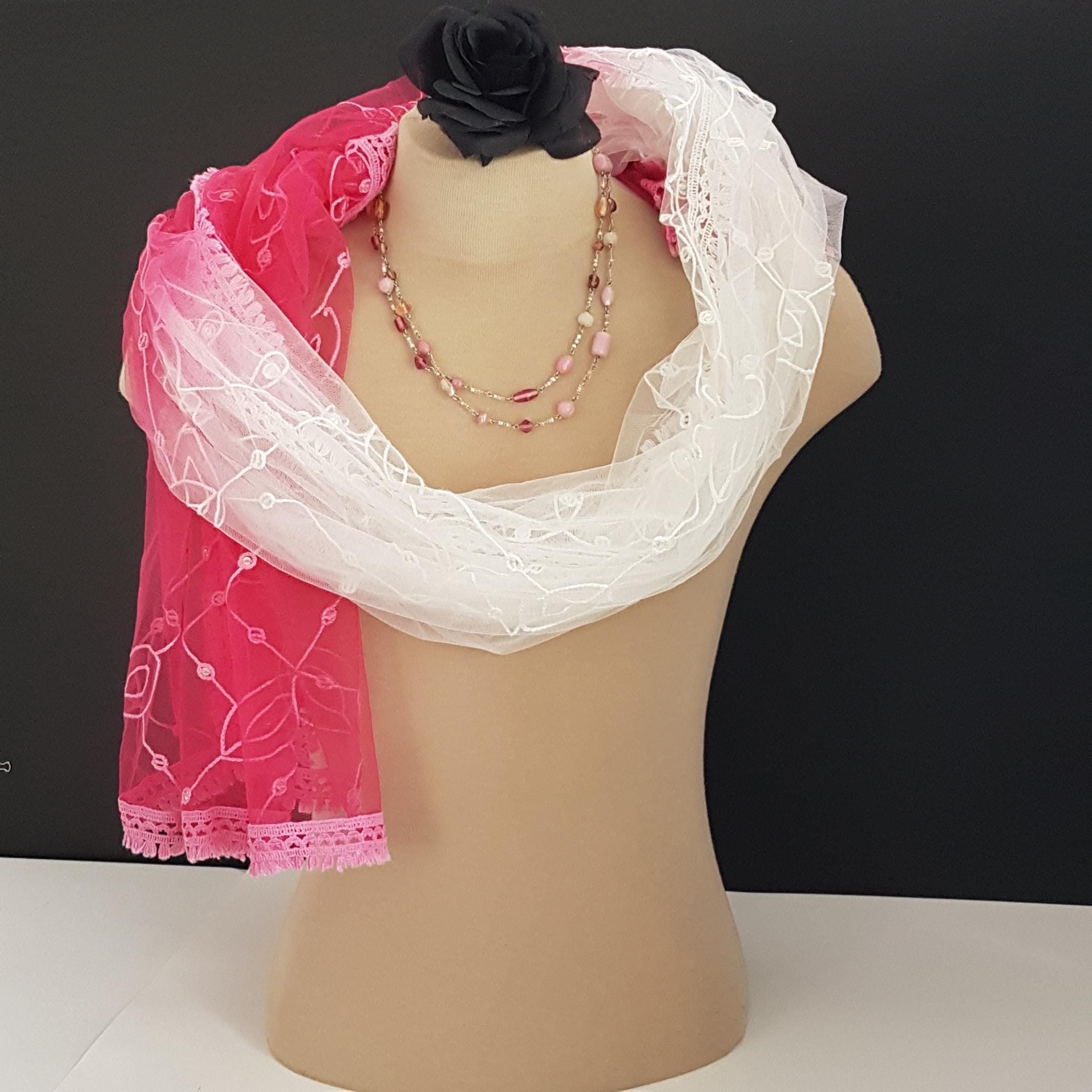 Vintage oversized should wrap featuring soft tulle-like or chiffon sheer fabric with machine embroidered leaf pattern with individual silver sequins sewn in. Embroidered edge in gradient pinks.