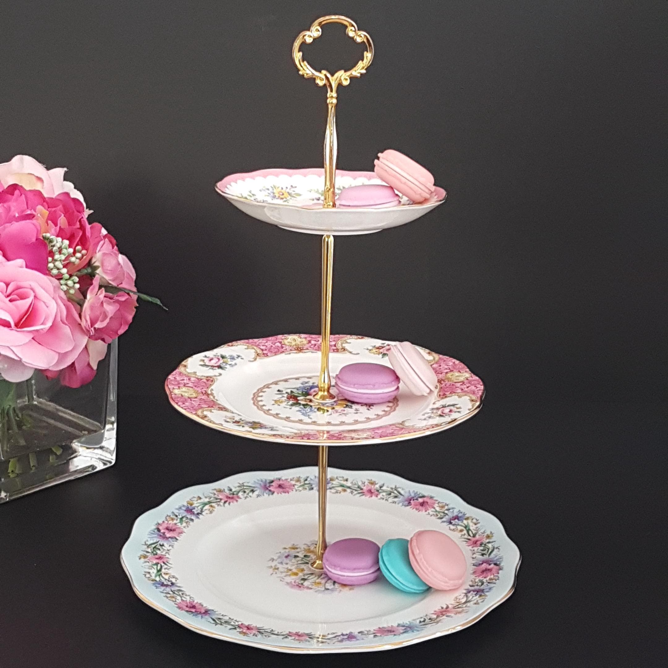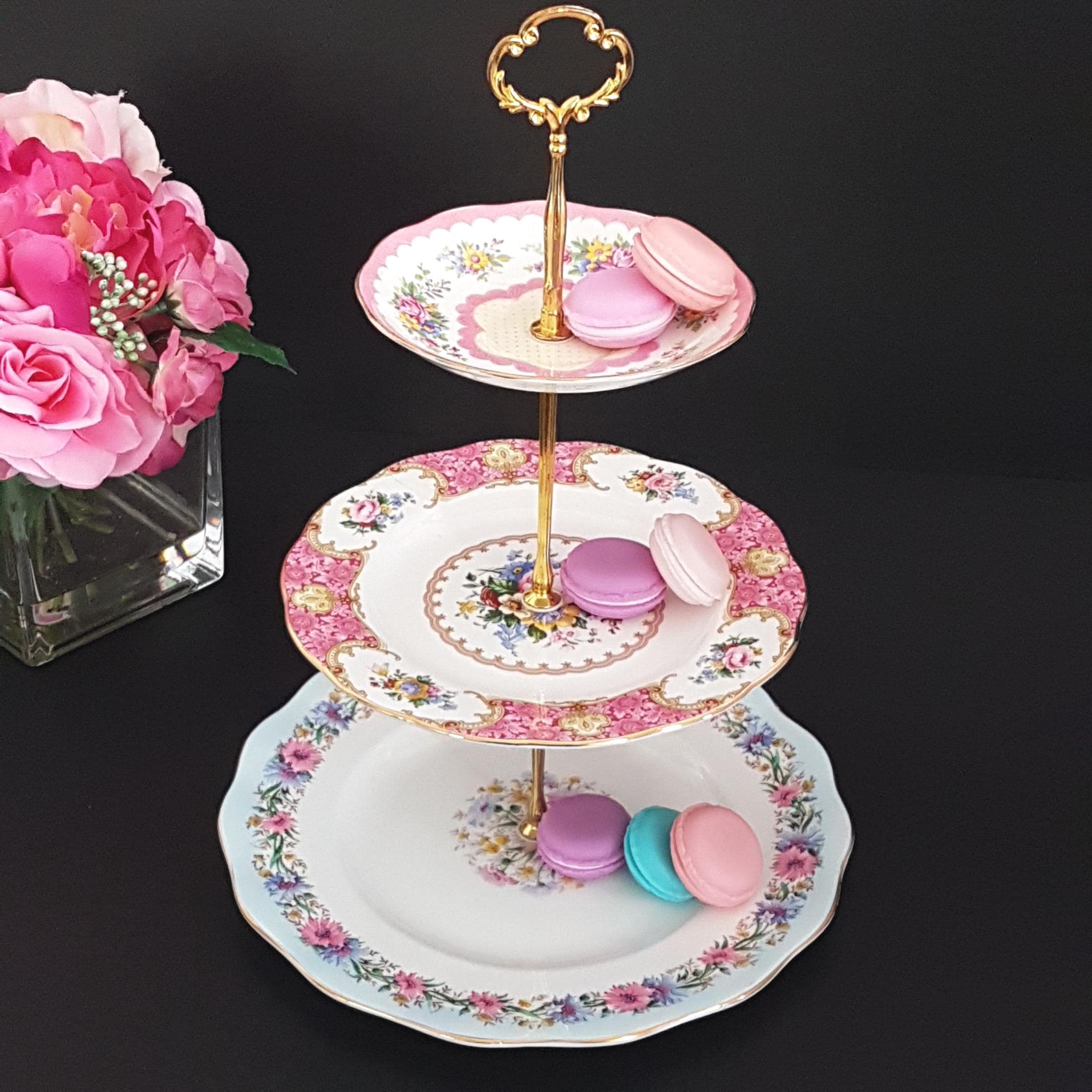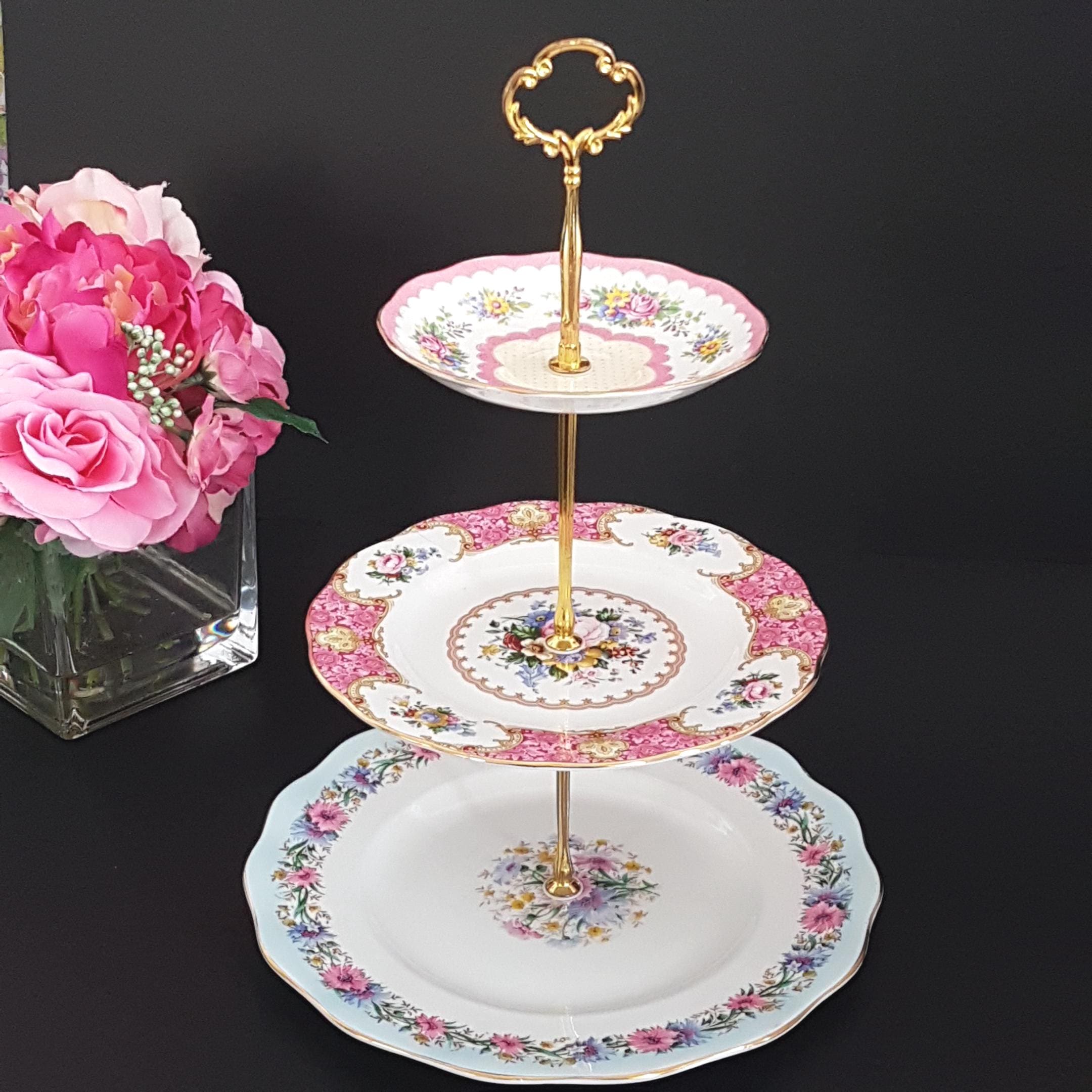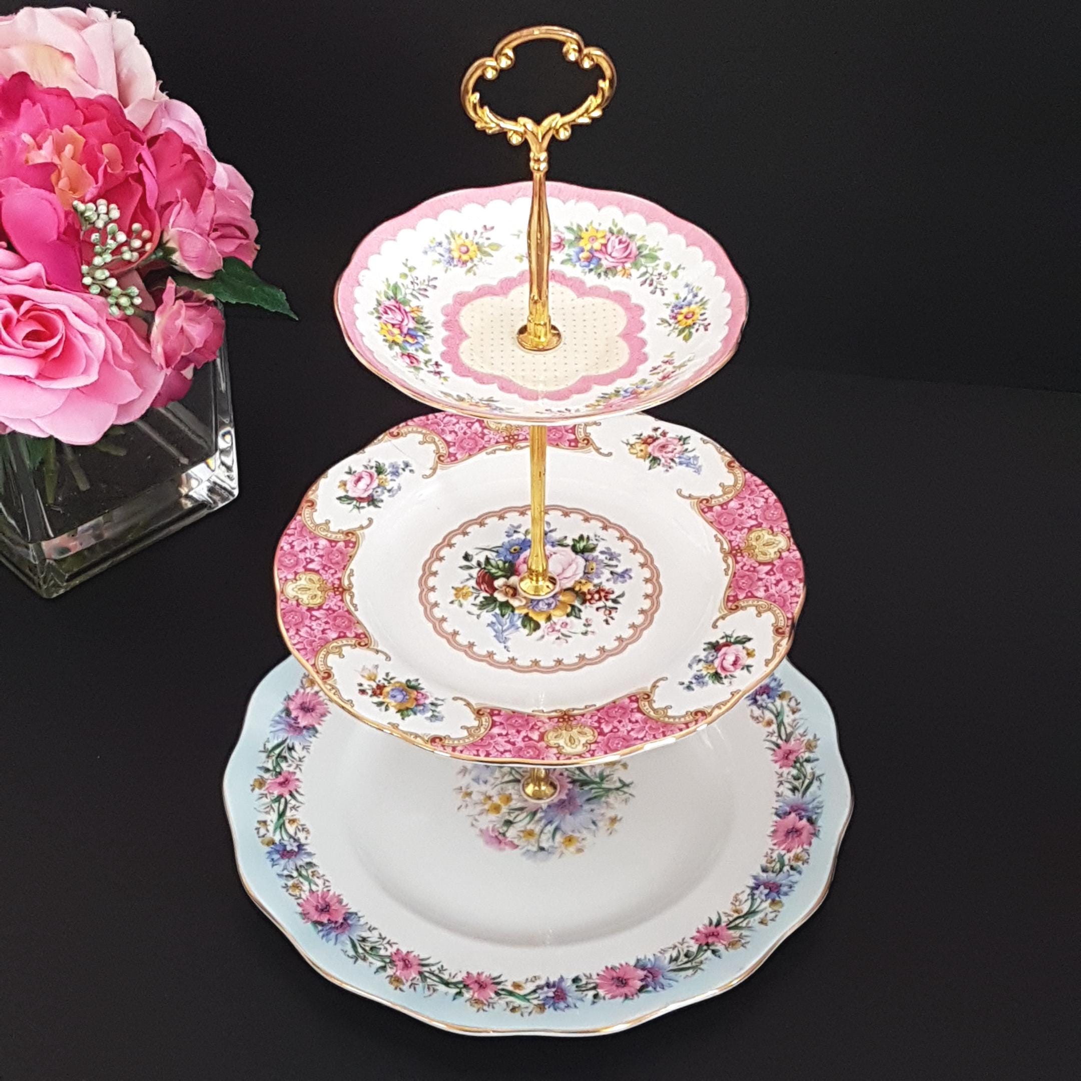 Elegant 3-tier cake stand, handmade by me using English bone china plates.