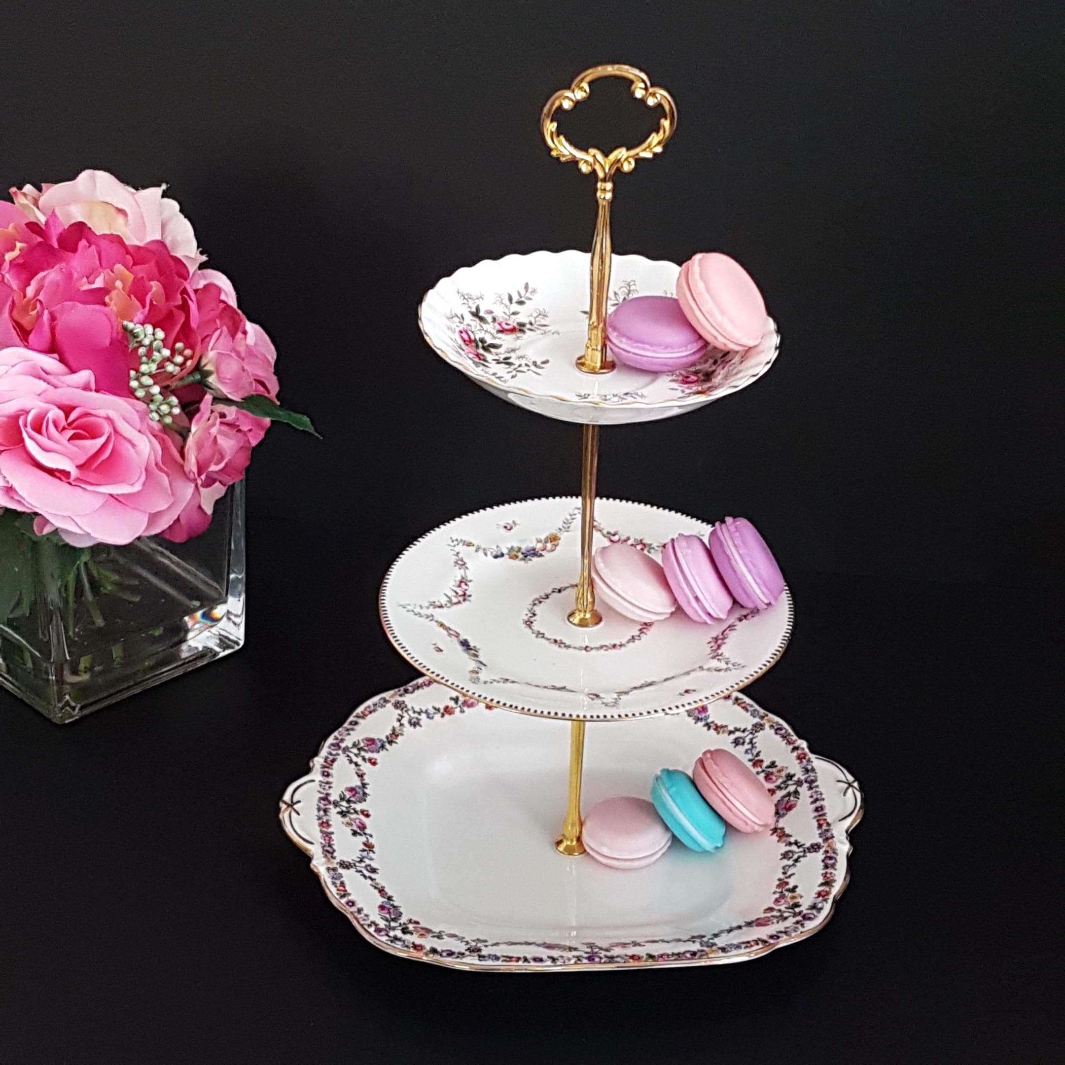 Elegant 3-tier cake stand, handmade by me using vintage English bone china plates.
