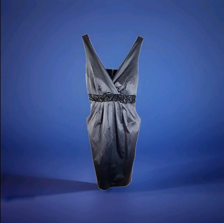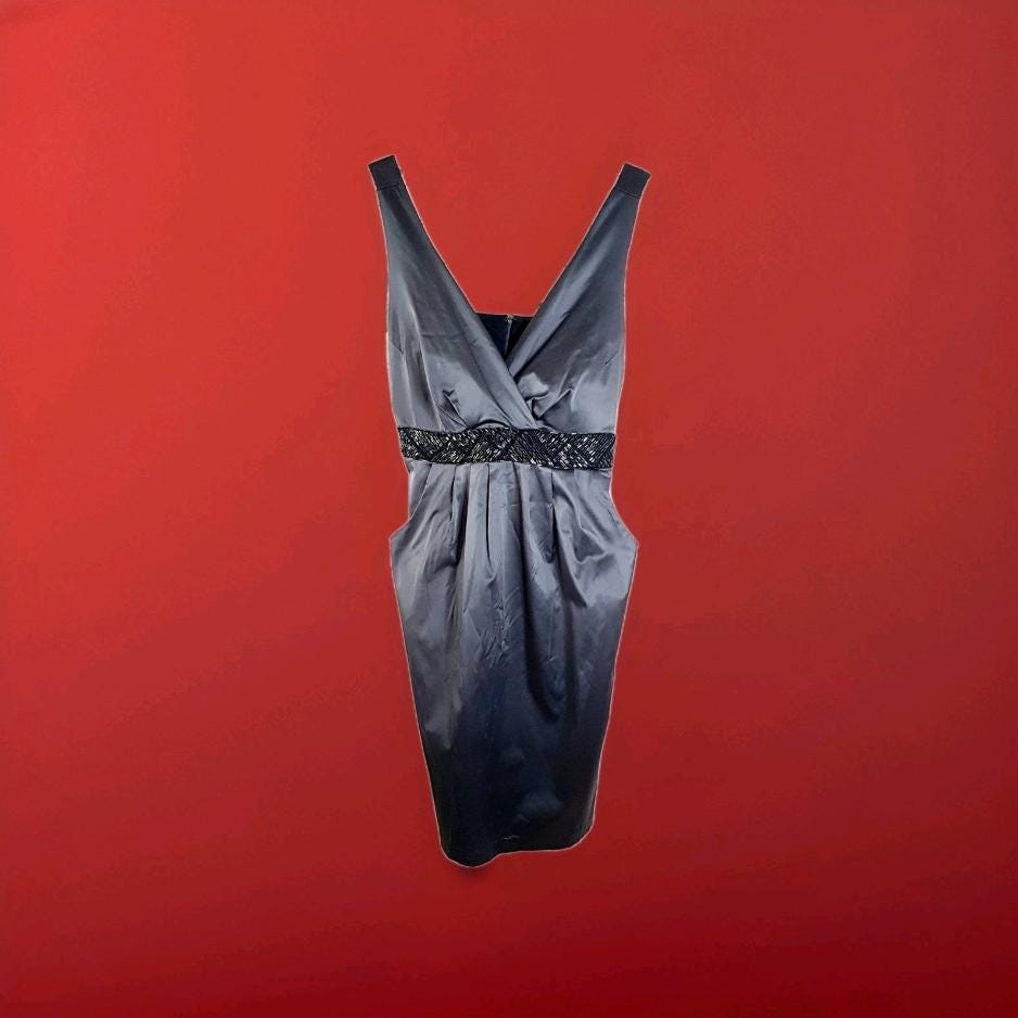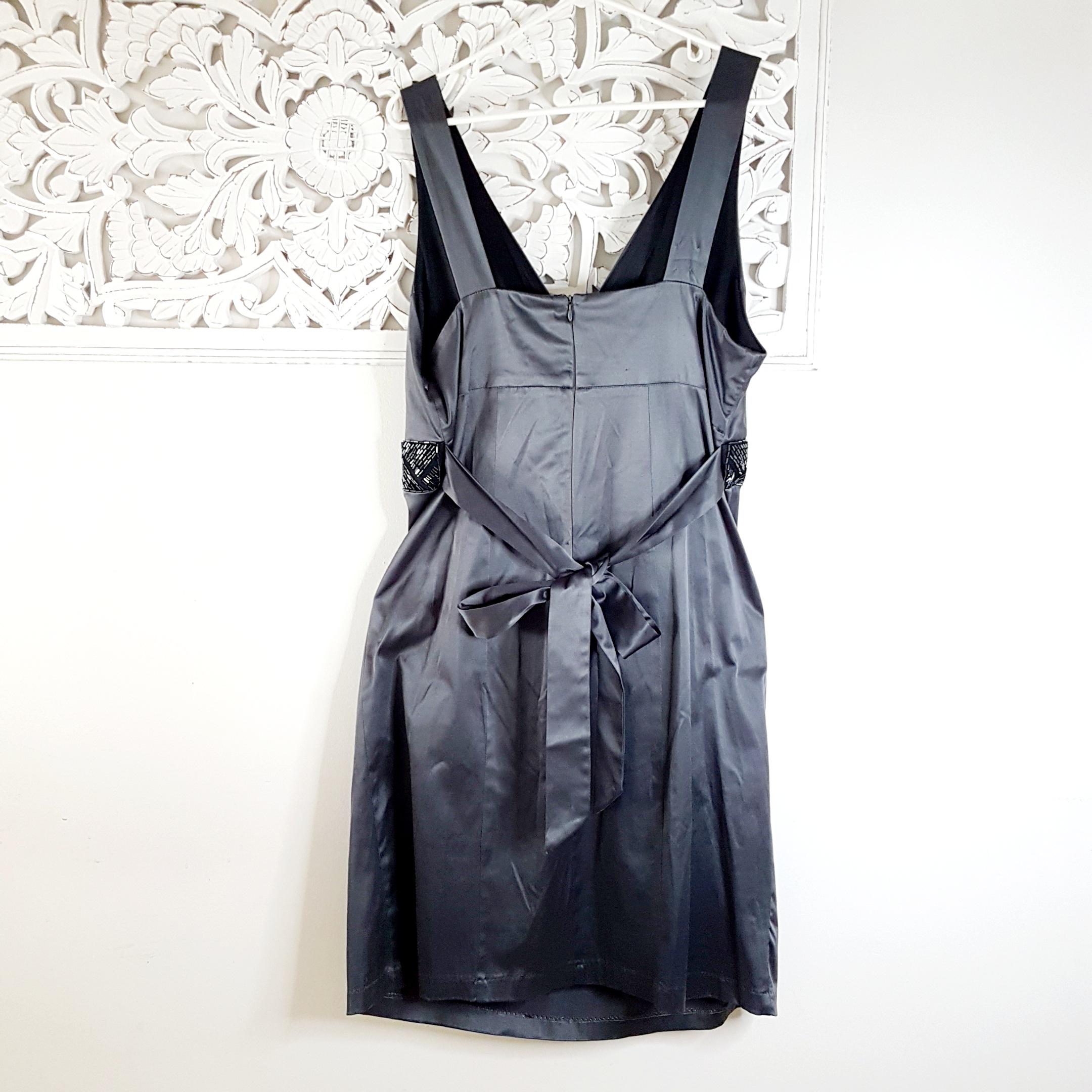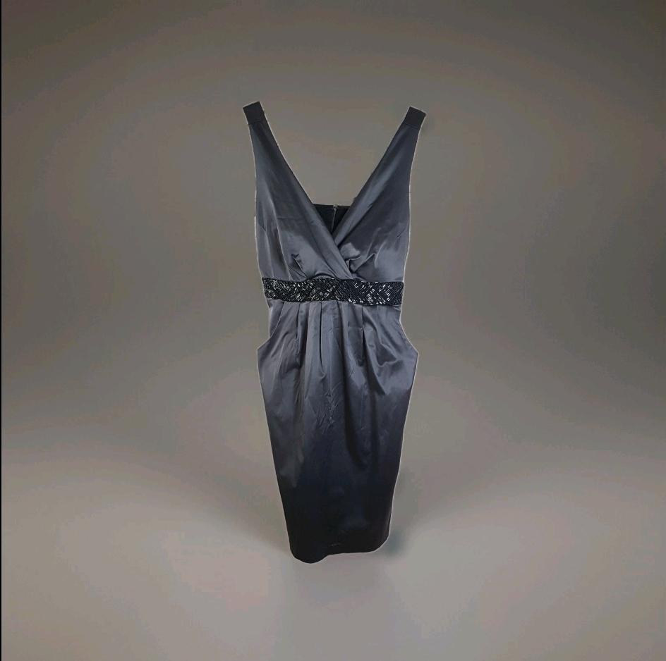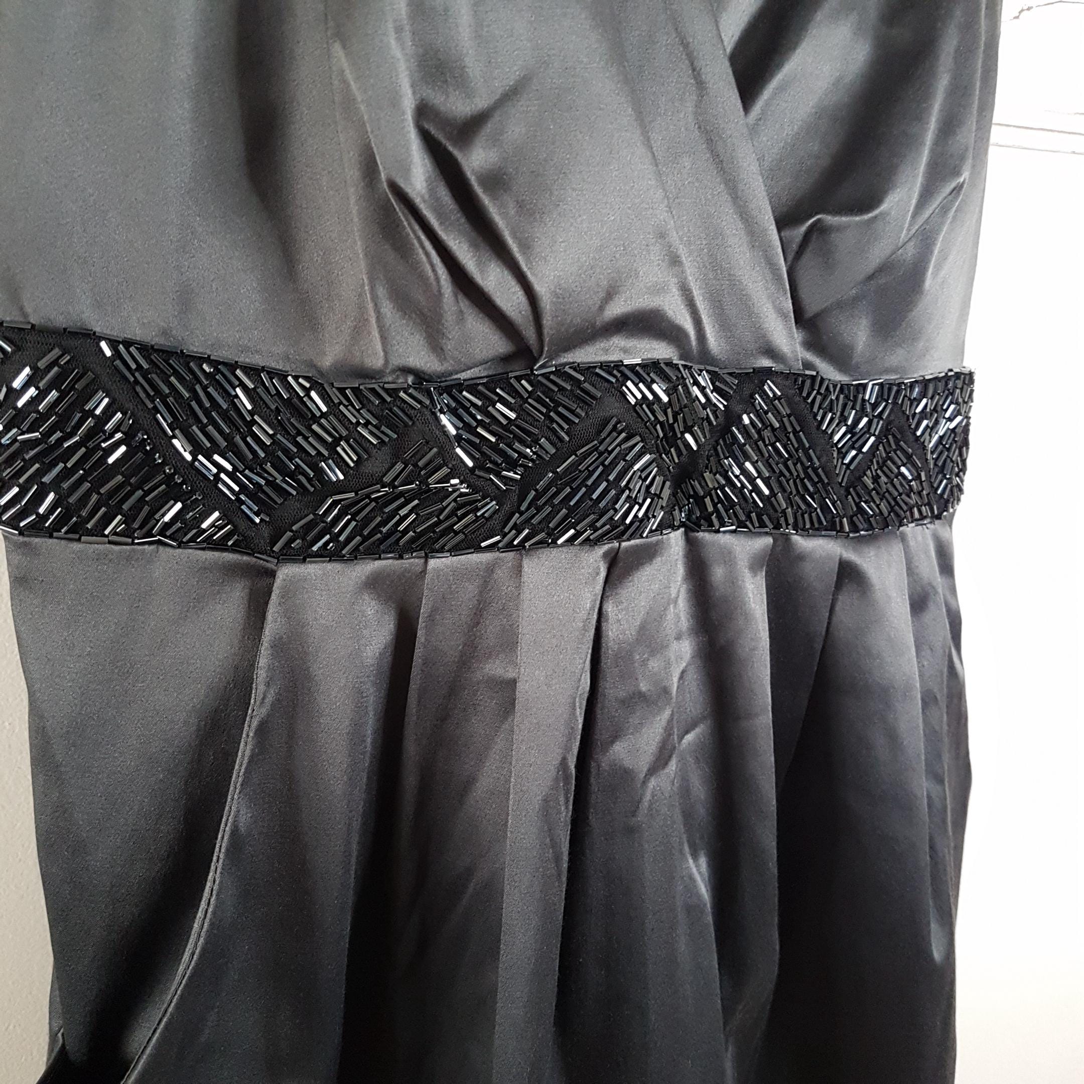 Vintage Michel Antoni charcoal gray satin evening dress featuring a deep surplice v-neckline and black beaded waist belt with ties. Practical side pockets. Lined bodice. Zipper & hook closure.
