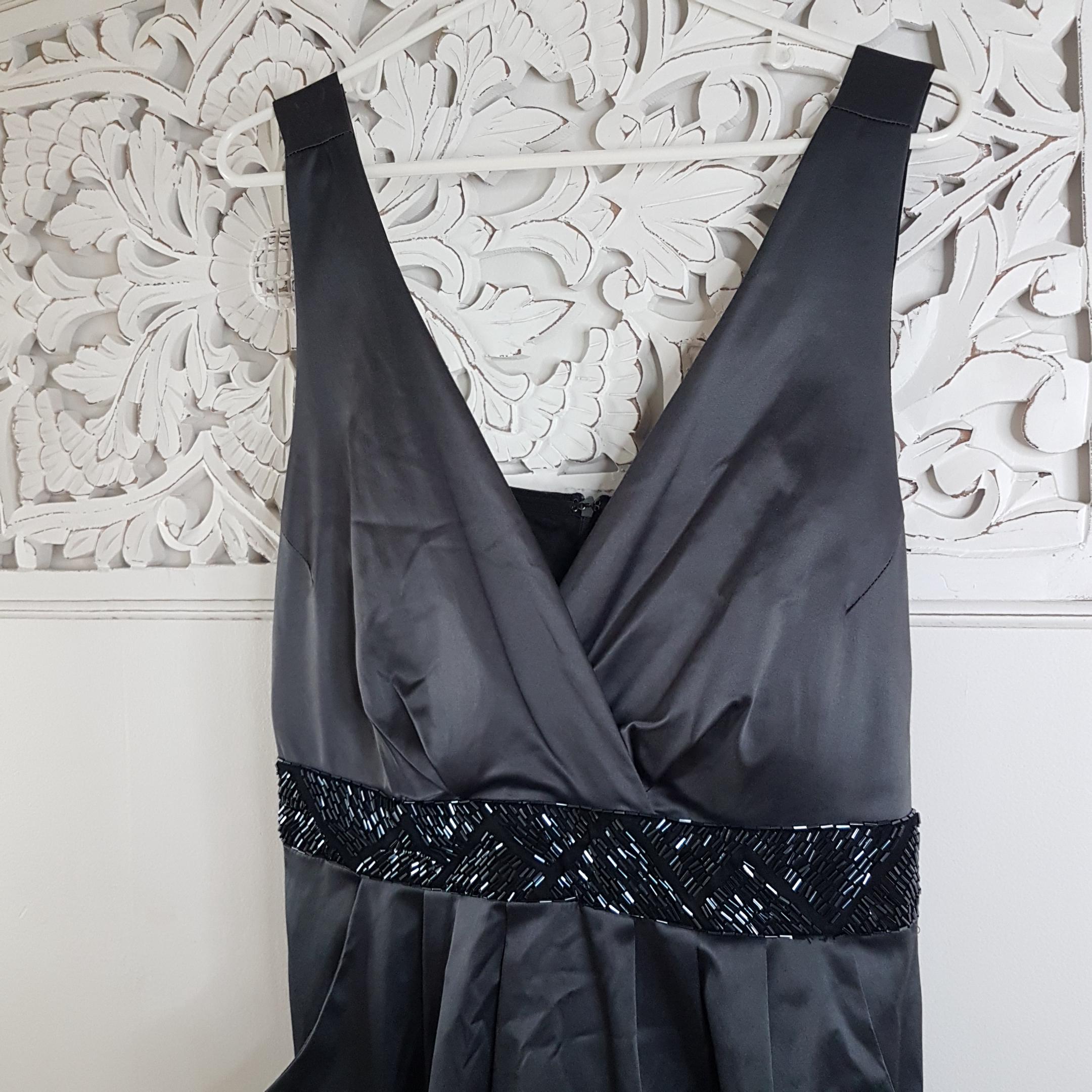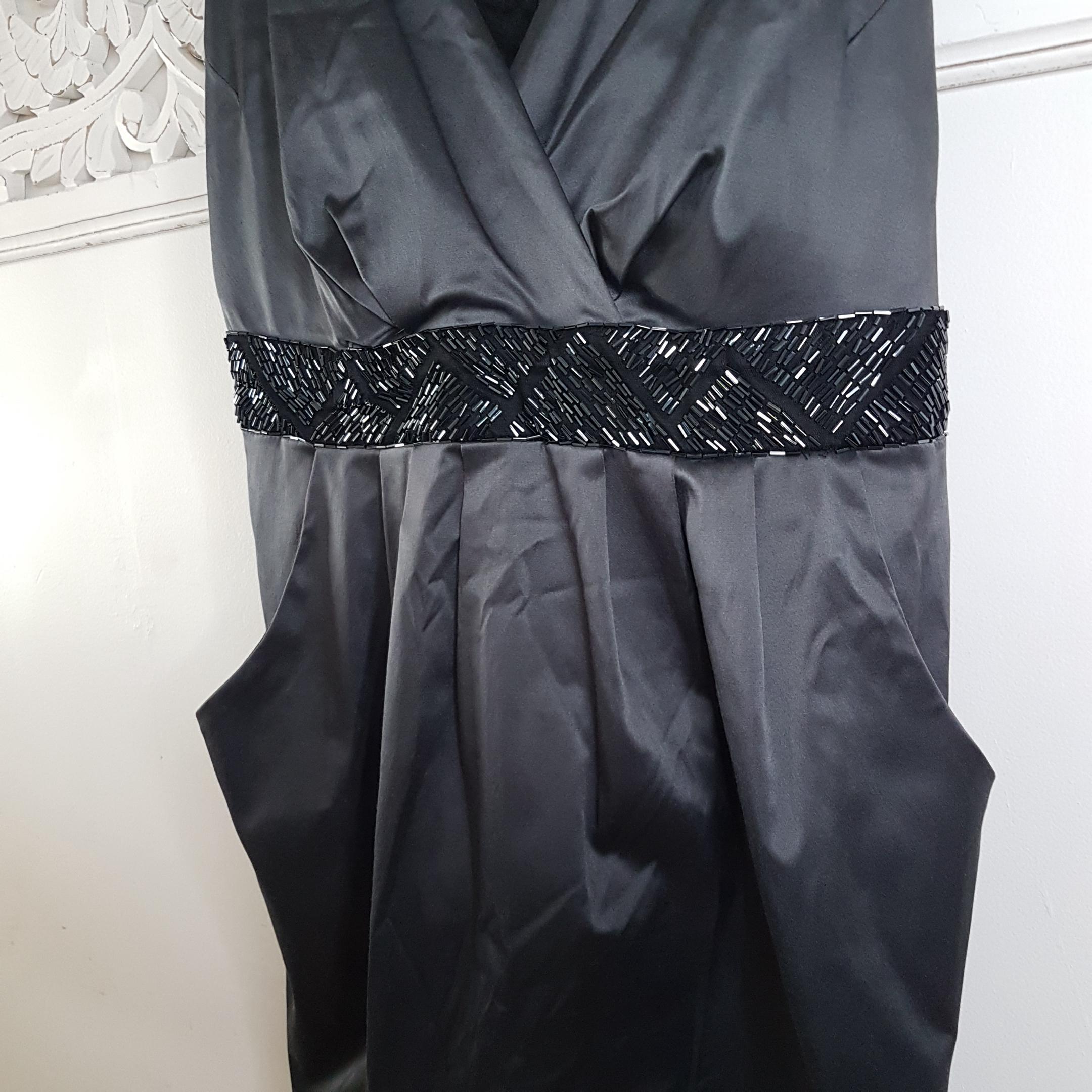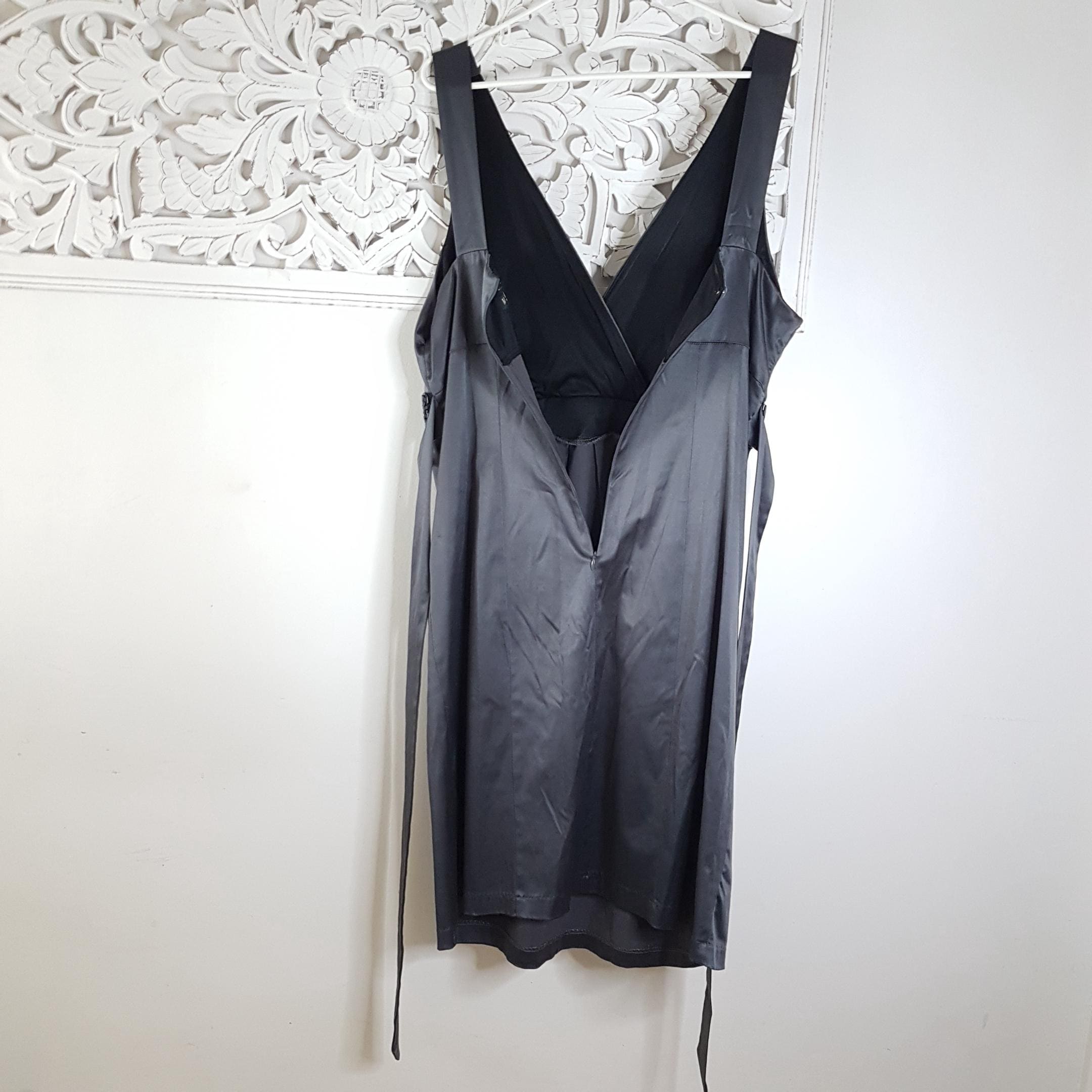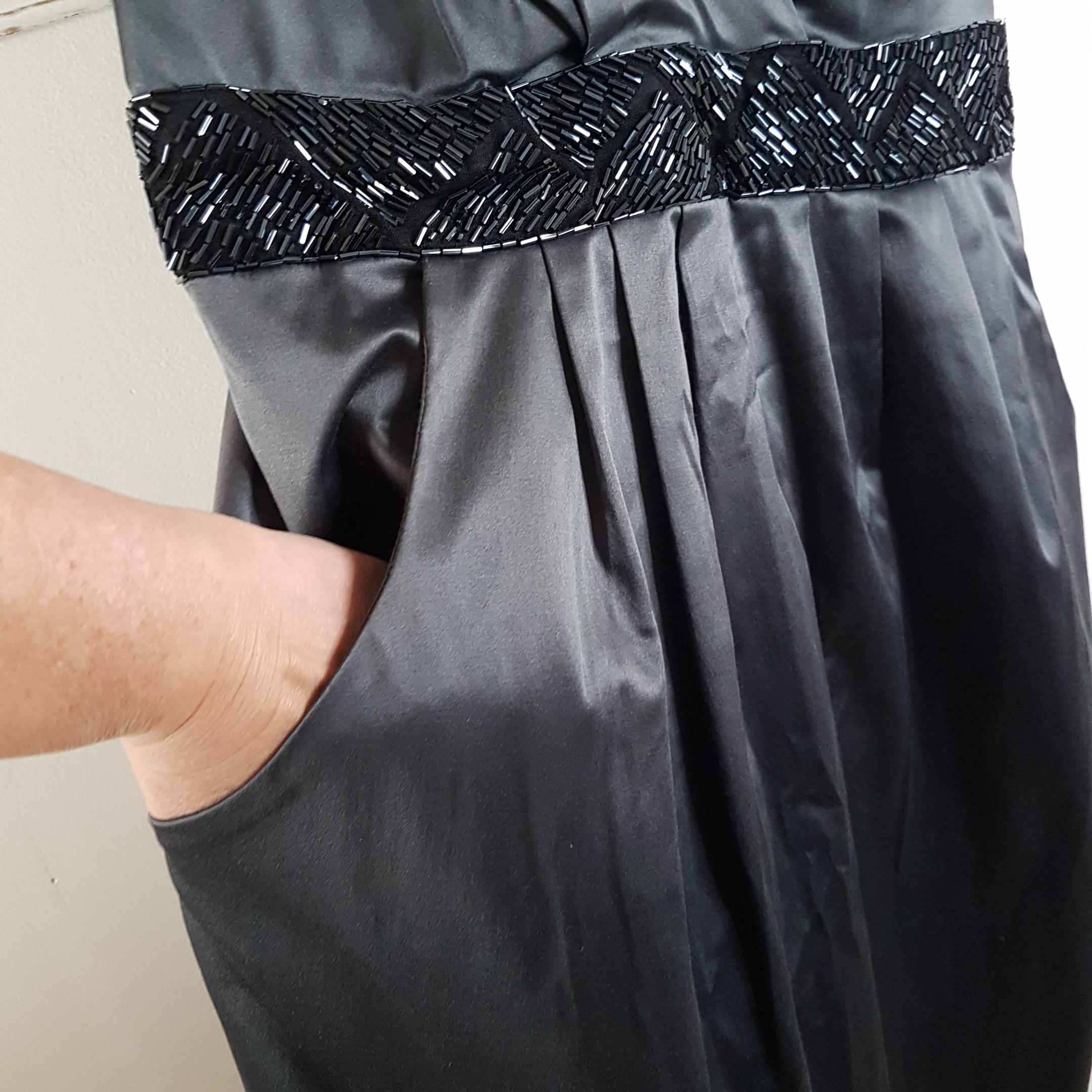 Vintage Michel Antoni charcoal gray satin evening dress featuring a deep surplice v-neckline and black beaded waist belt with ties. Practical side pockets. Lined bodice. Zipper & hook closure.