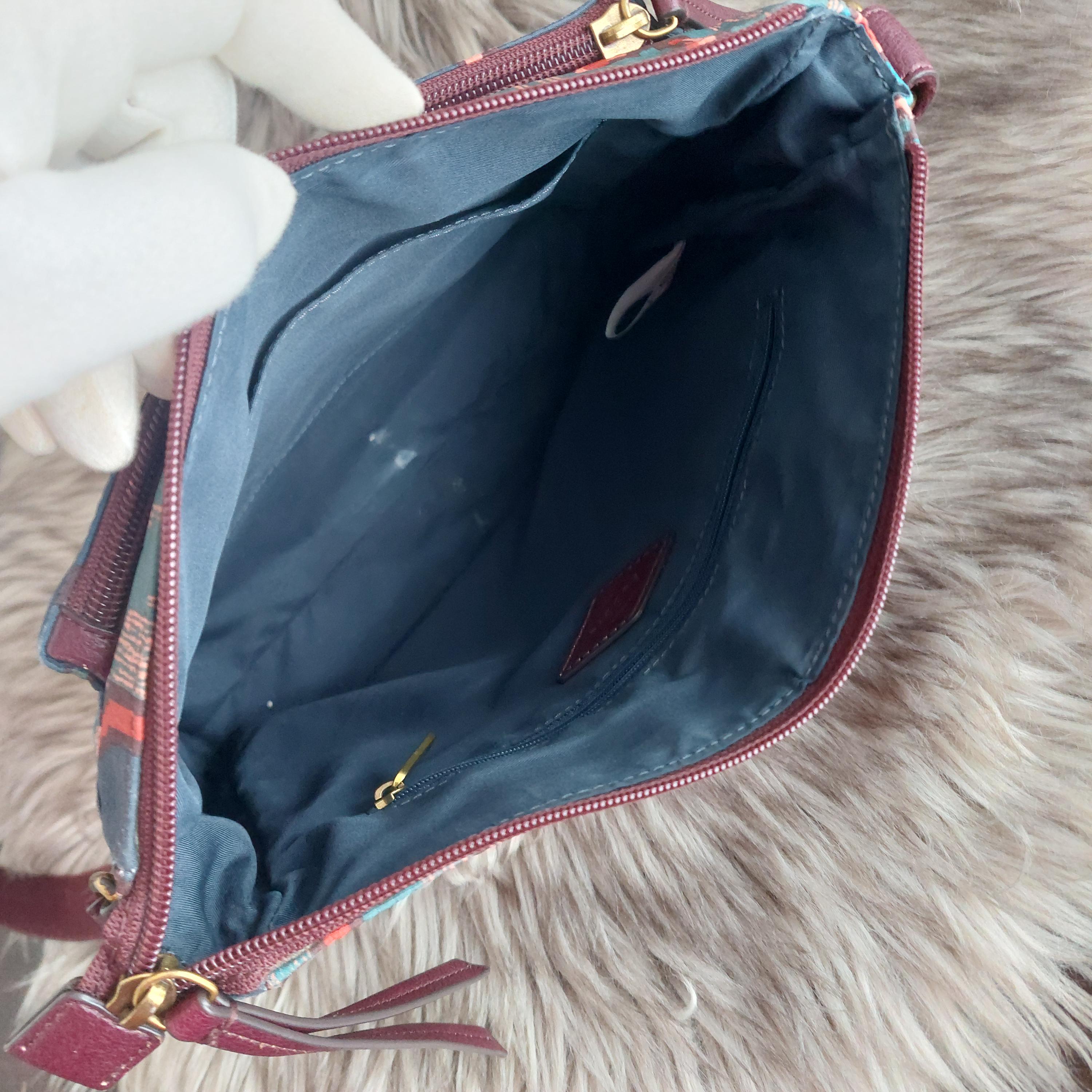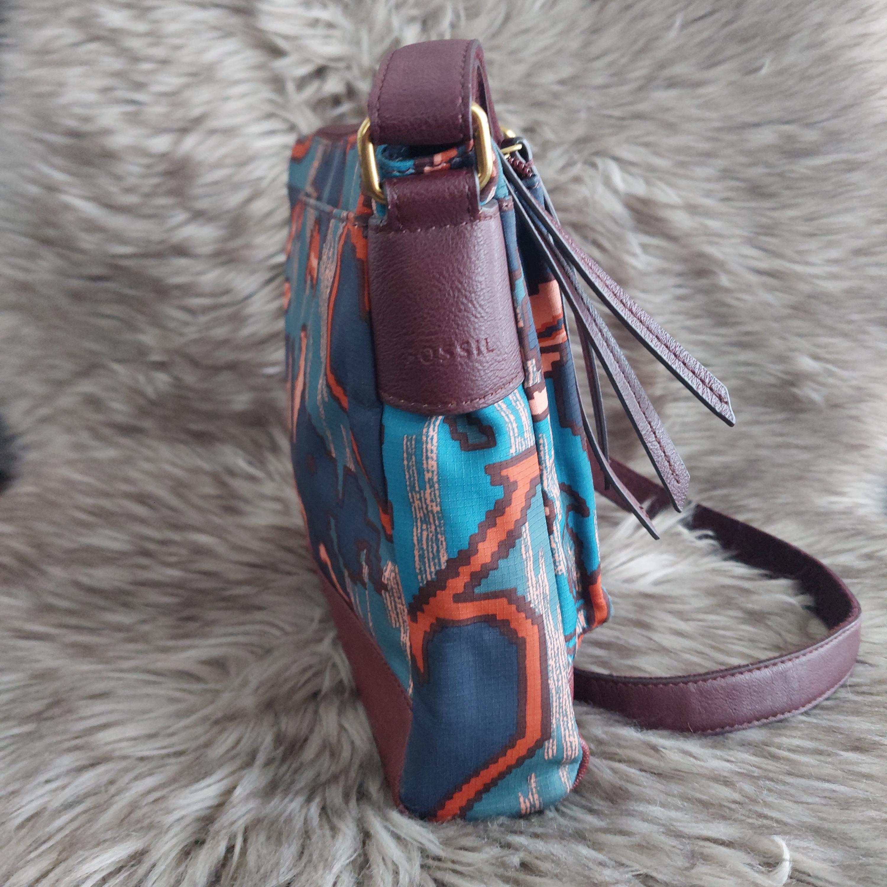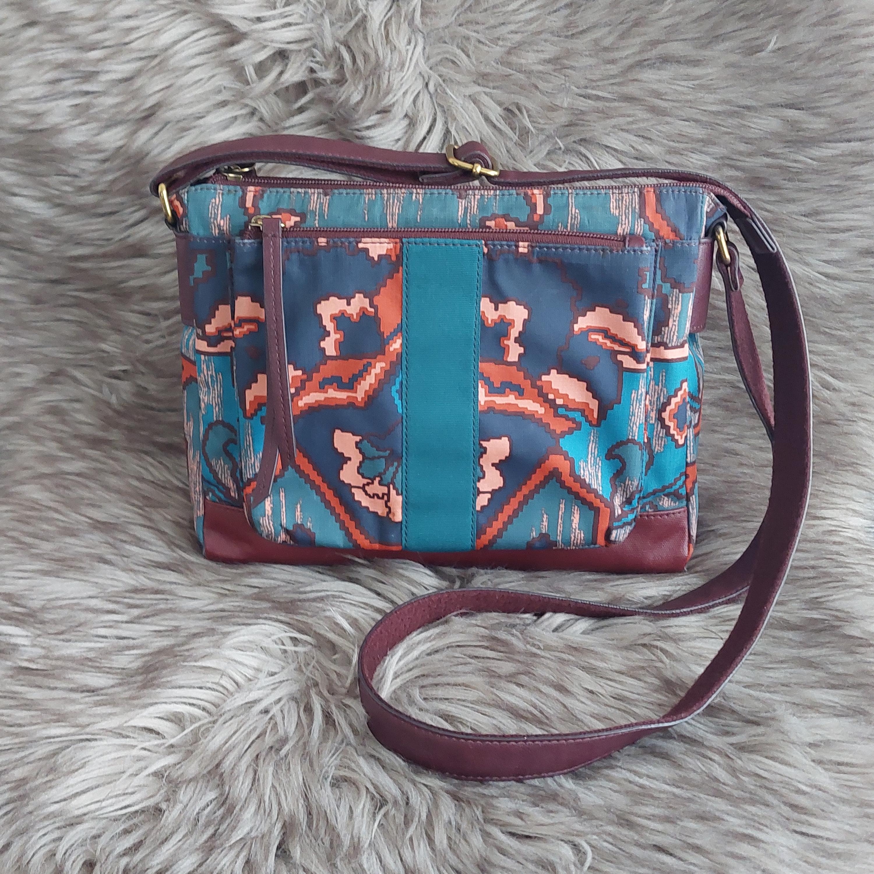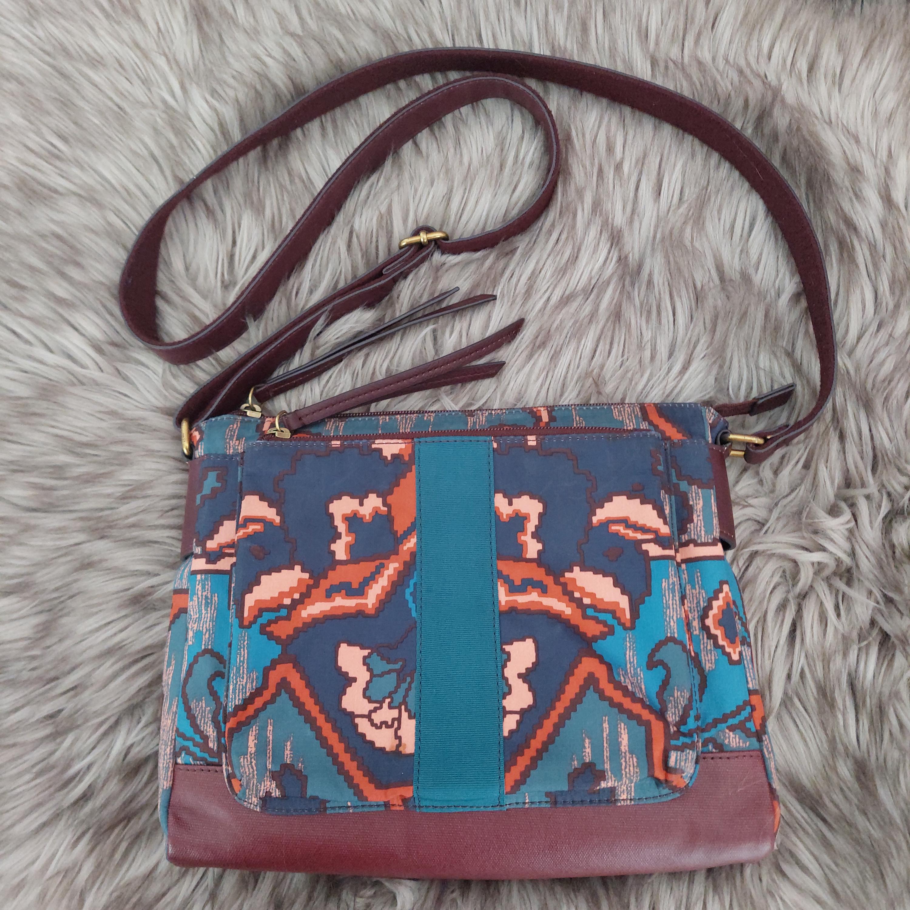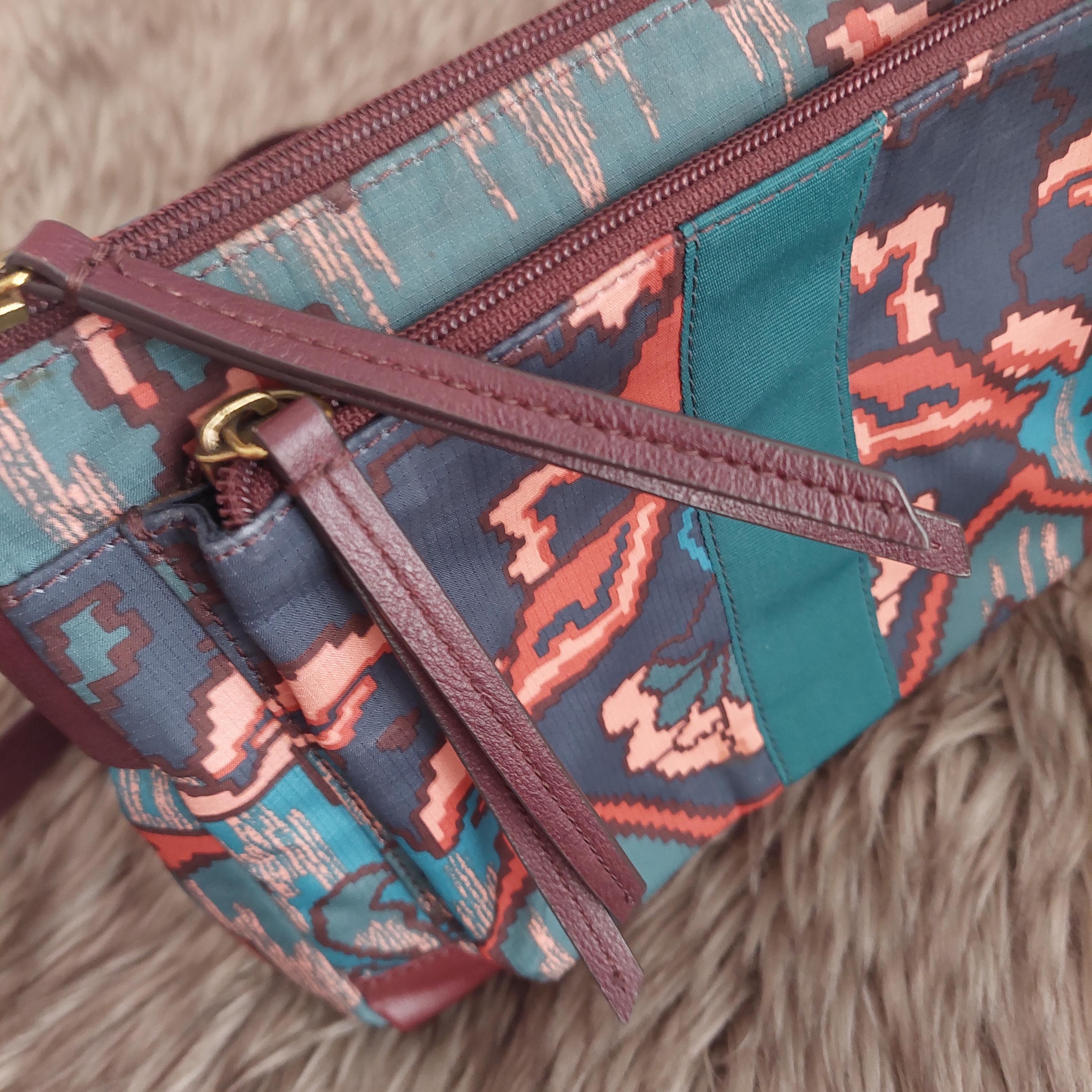 Vintage Fossil Jenna crossbody bag features a unique Southwestern or Bohemian multicolored floral pattern on coated canvas. Brass-tone hardware. Zip closure. One zippered outside pocket and one slip outside pocket. Inside one slip and one zippered wall pocket. Adjustable crossbody strap for everyday use.