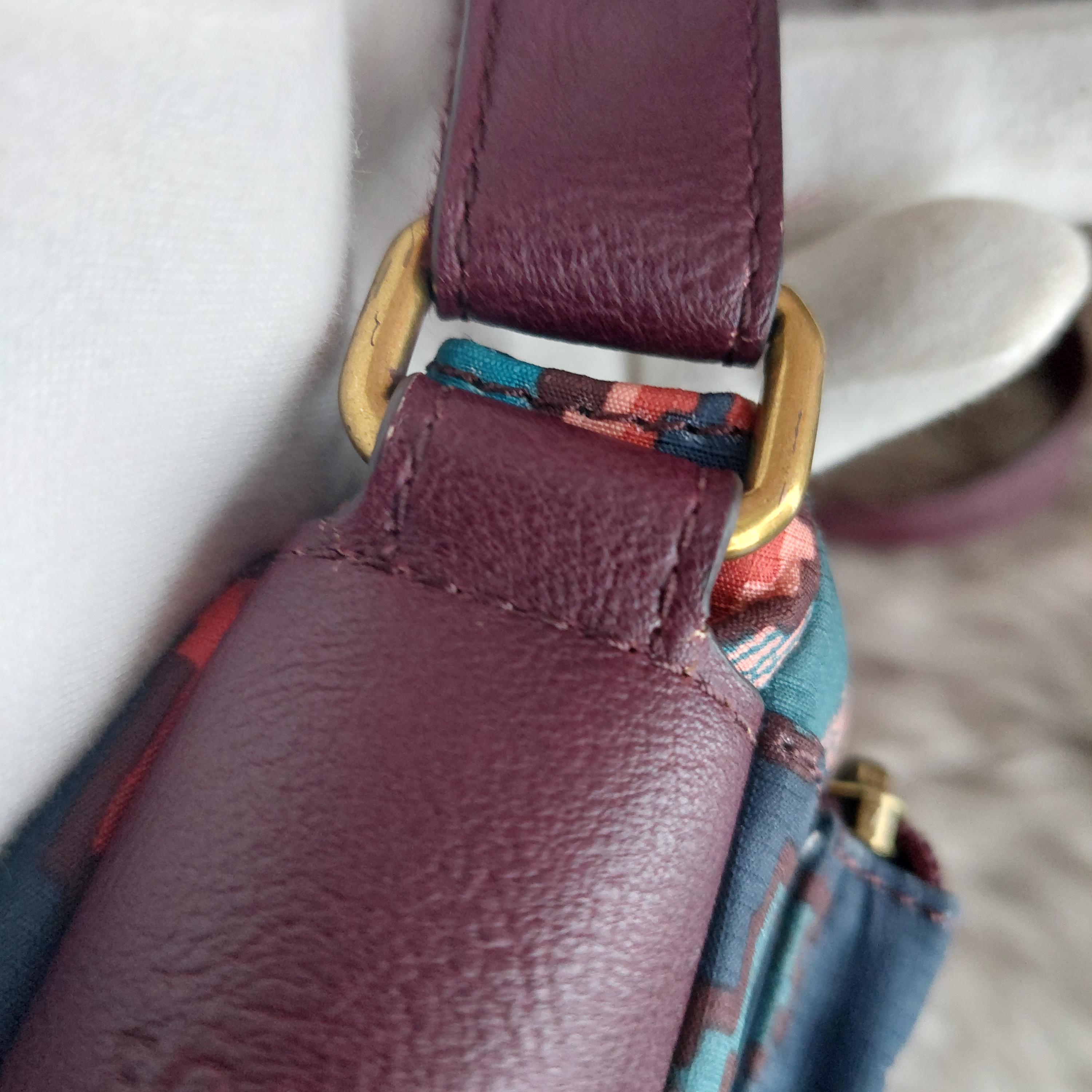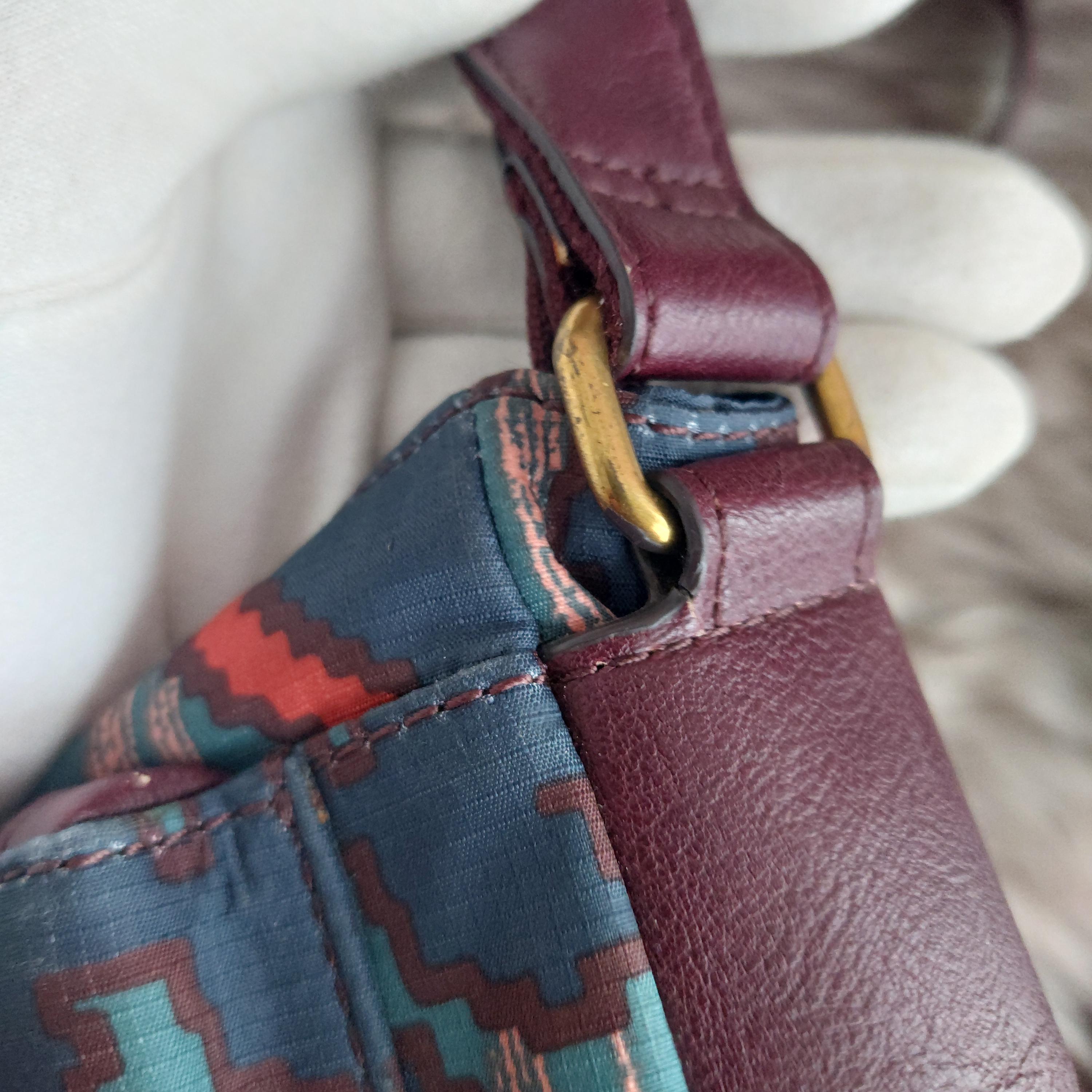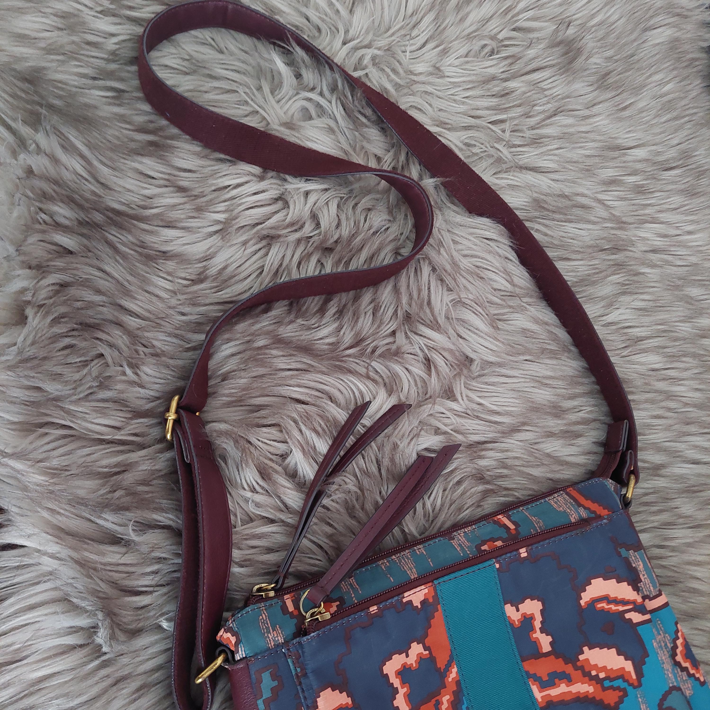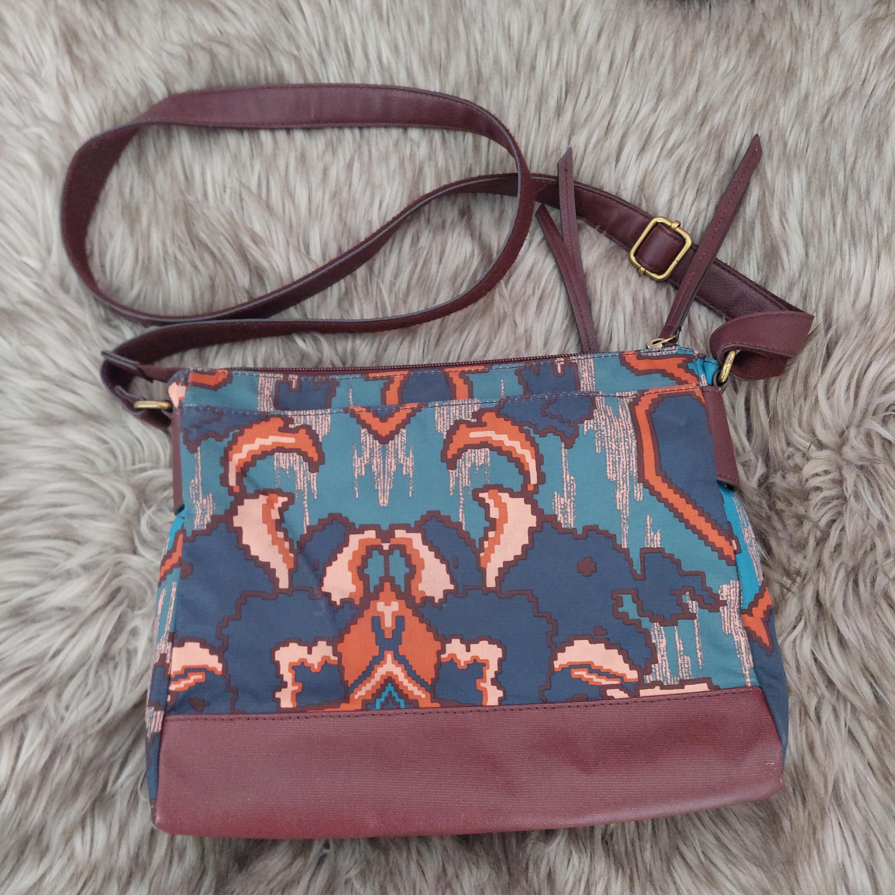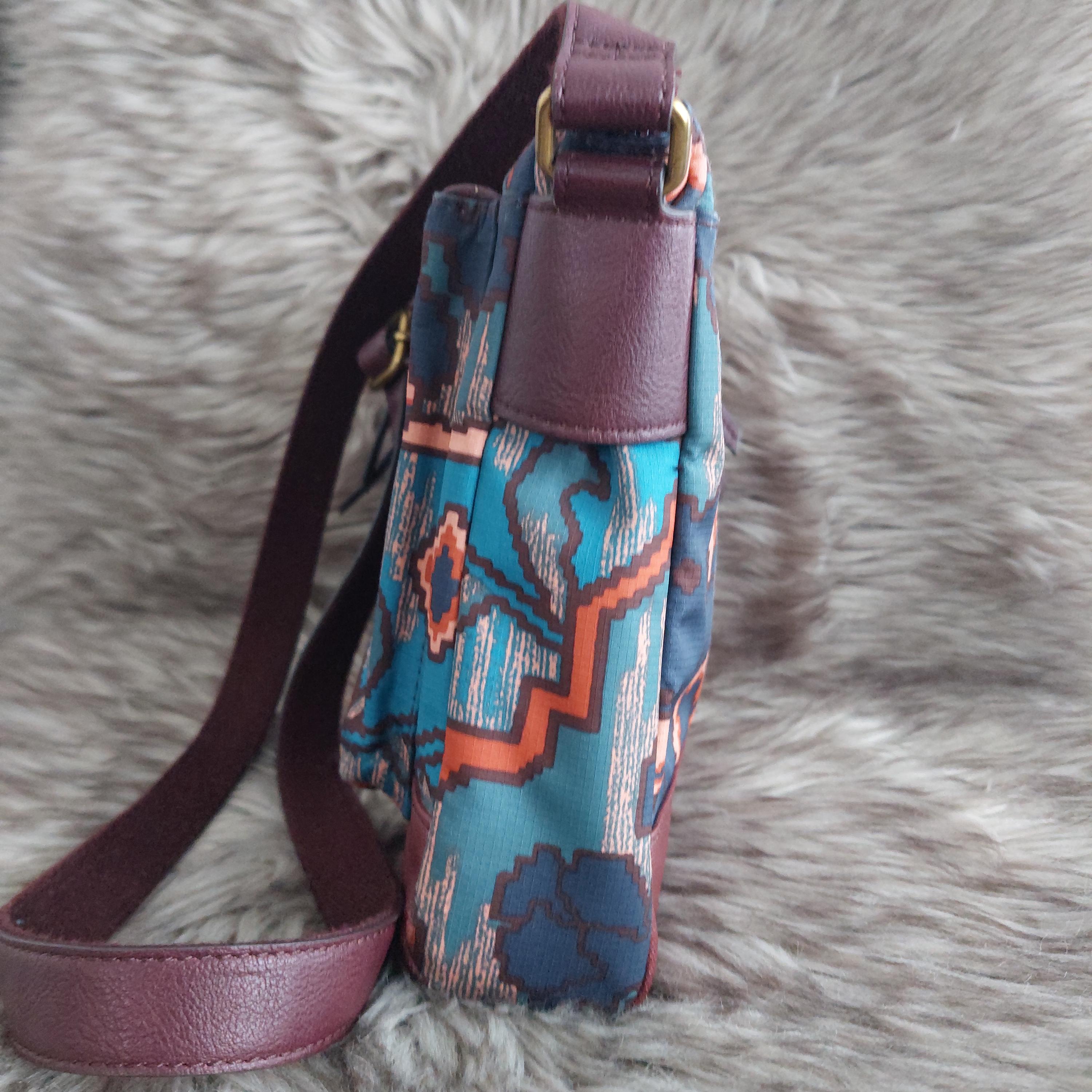Vintage Fossil Jenna crossbody bag features a unique Southwestern or Bohemian multicolored floral pattern on coated canvas. Brass-tone hardware. Zip closure. One zippered outside pocket and one slip outside pocket. Inside one slip and one zippered wall pocket. Adjustable crossbody strap for everyday use.