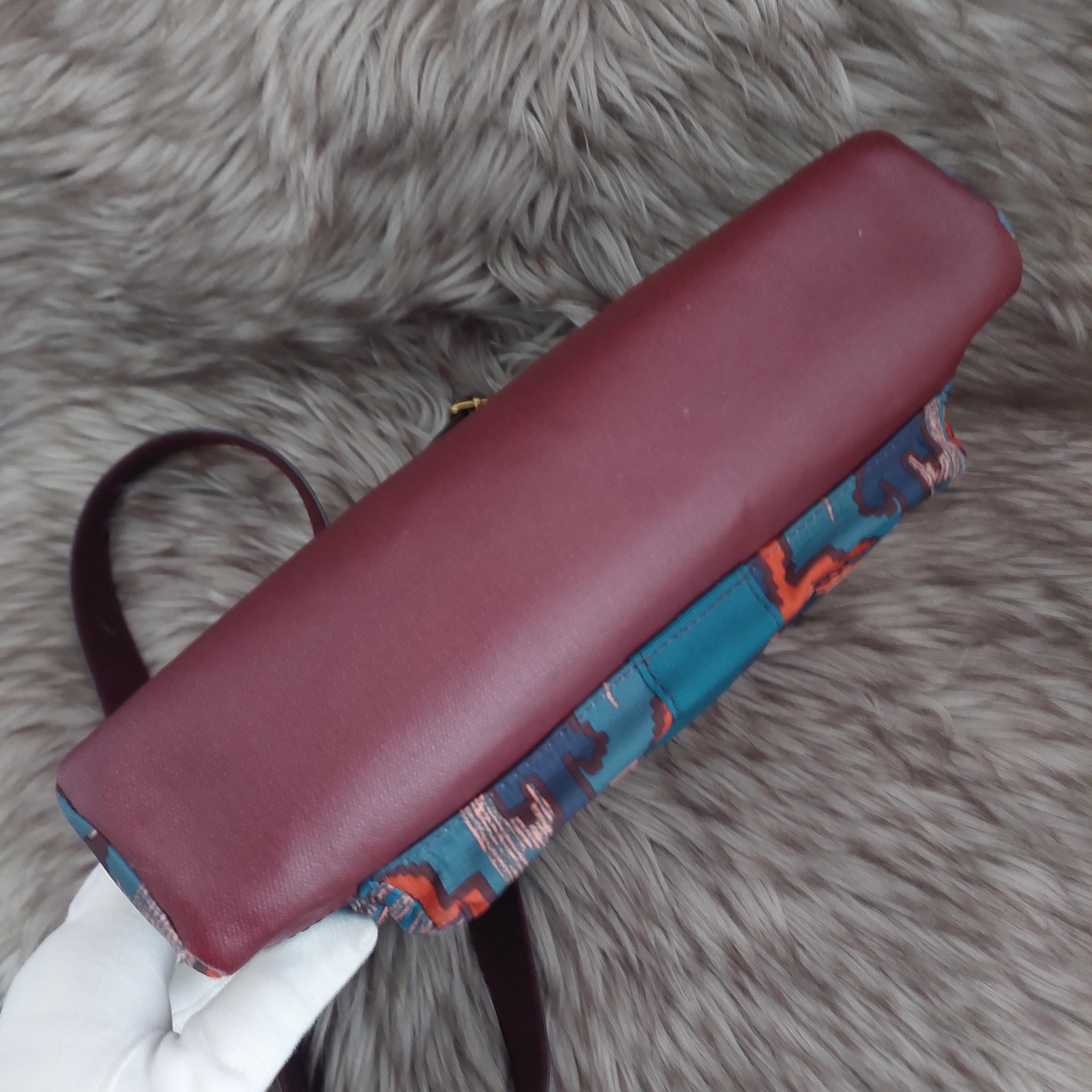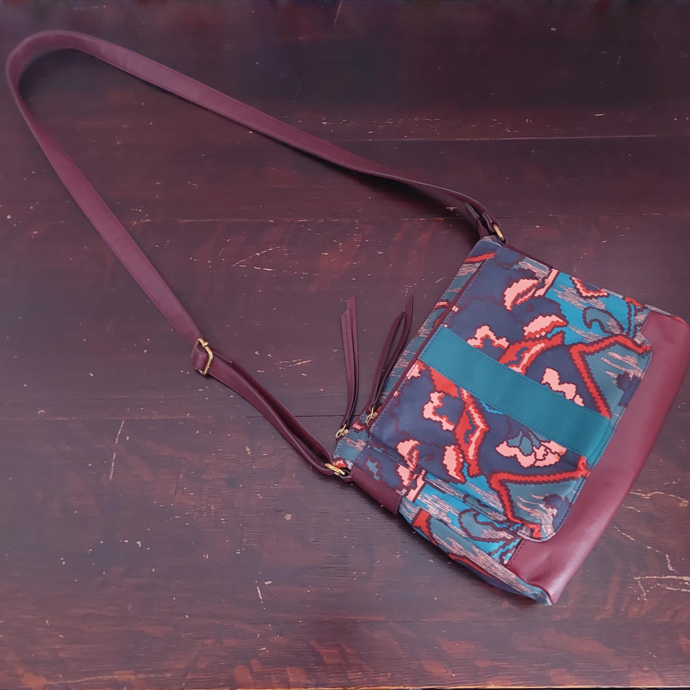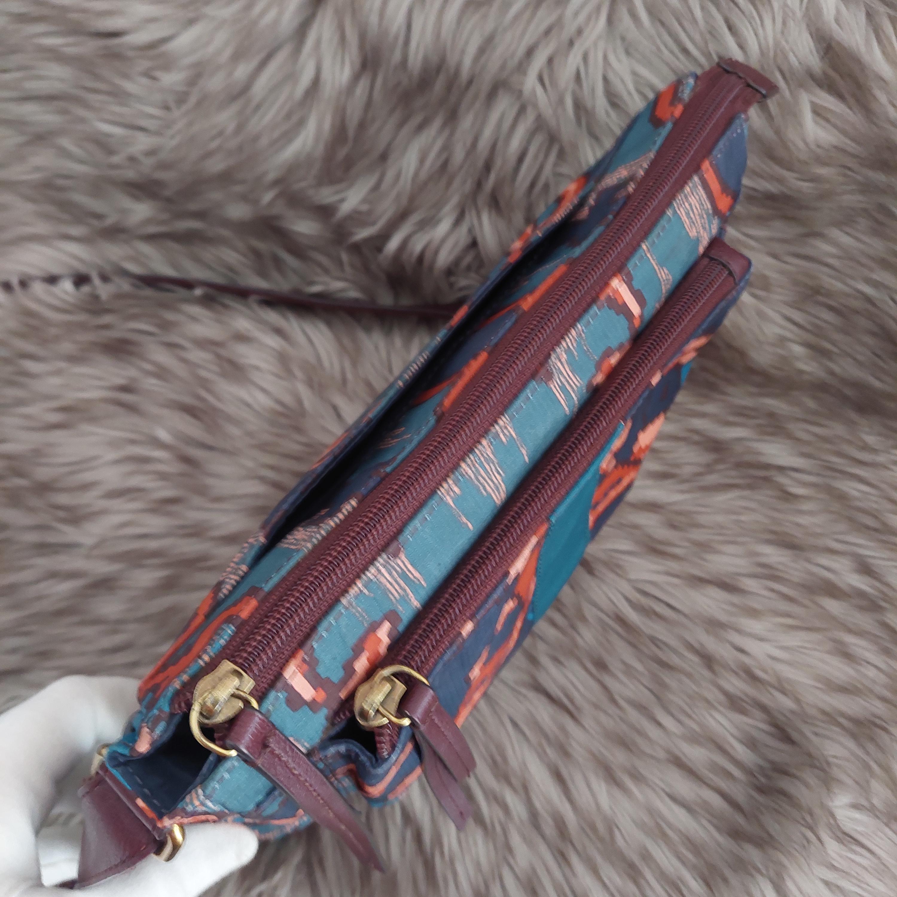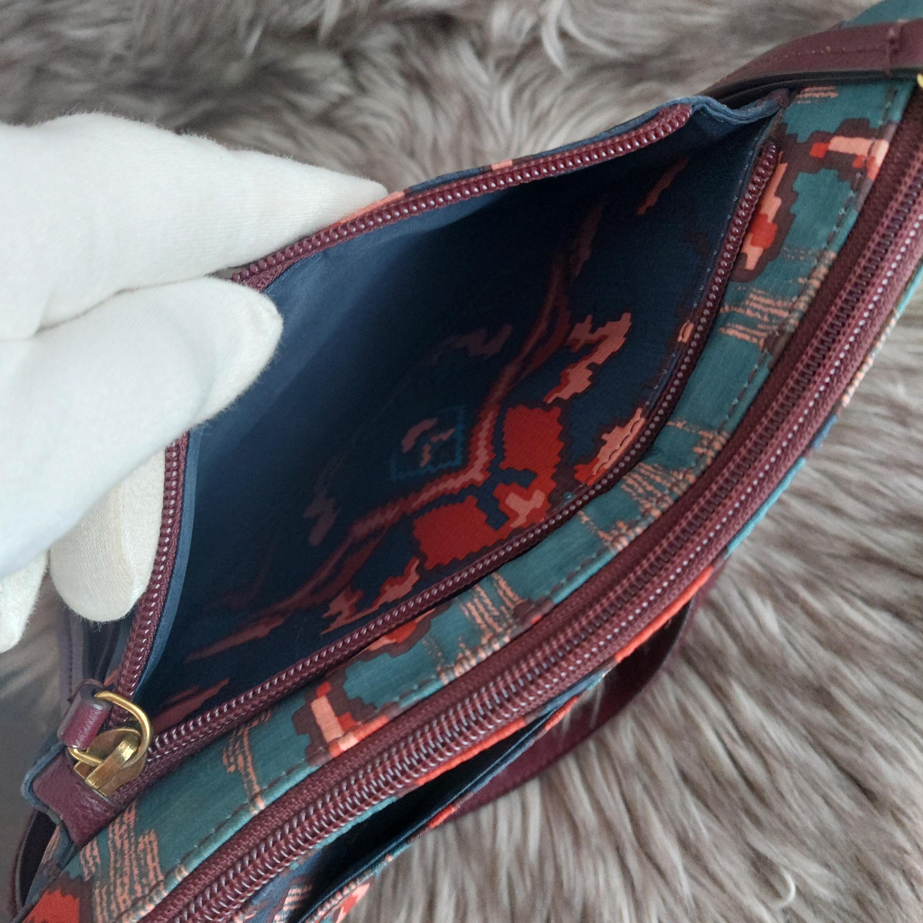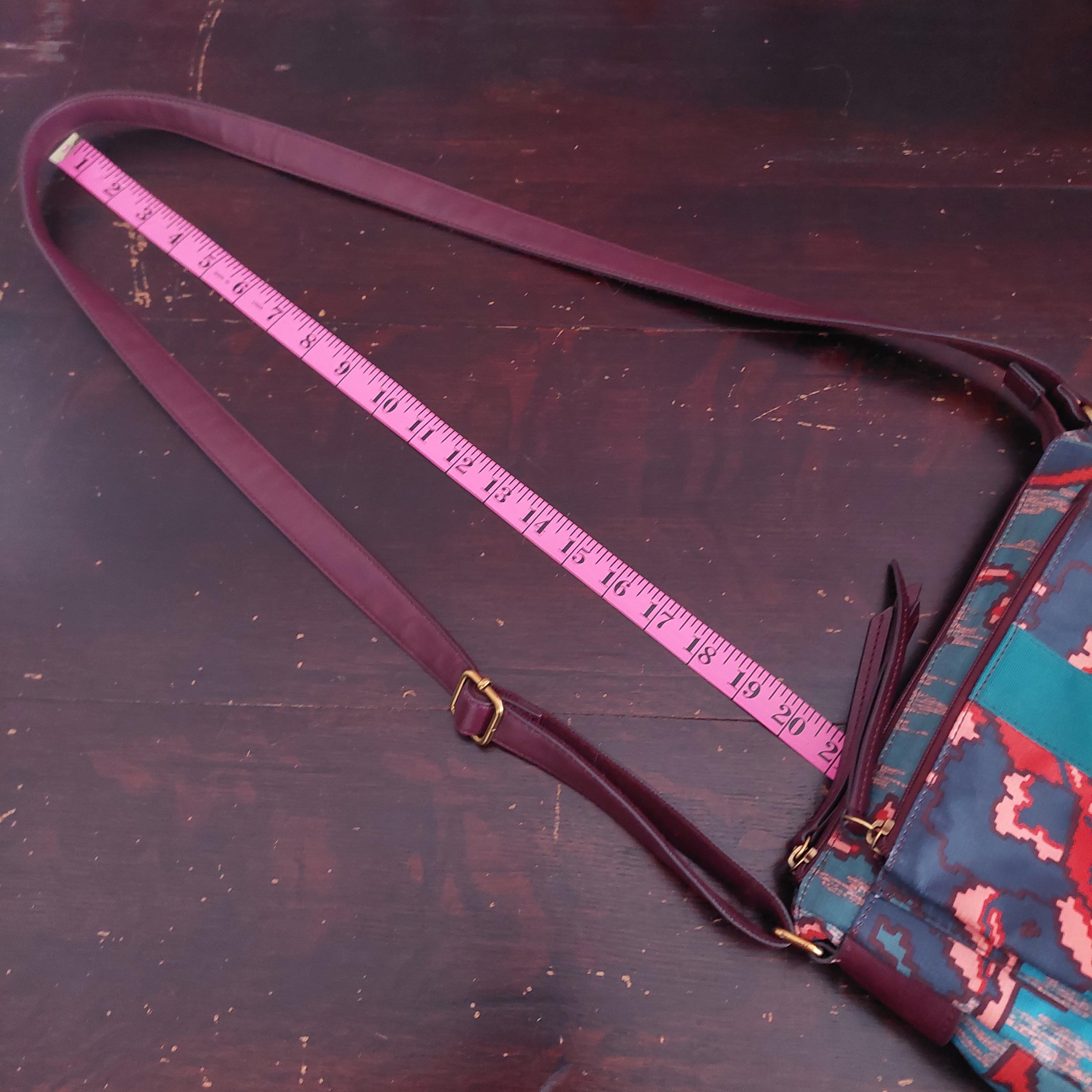 Vintage Fossil Jenna crossbody bag features a unique Southwestern or Bohemian multicolored floral pattern on coated canvas. Brass-tone hardware. Zip closure. One zippered outside pocket and one slip outside pocket. Inside one slip and one zippered wall pocket. Adjustable crossbody strap for everyday use.