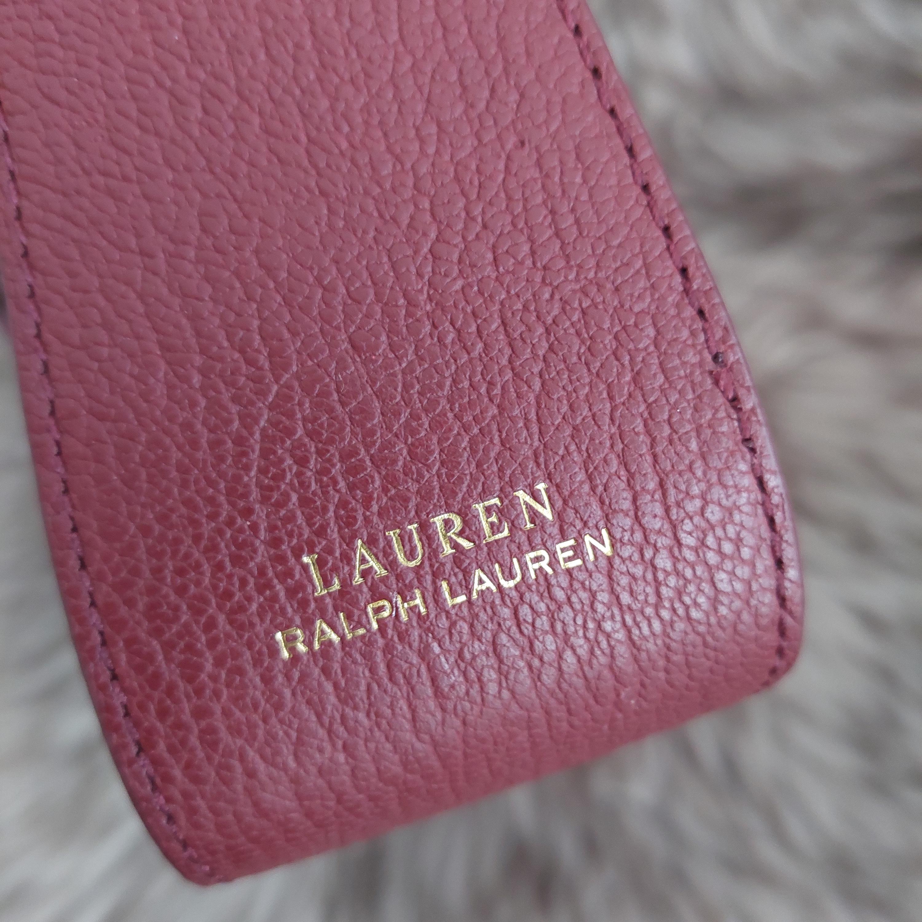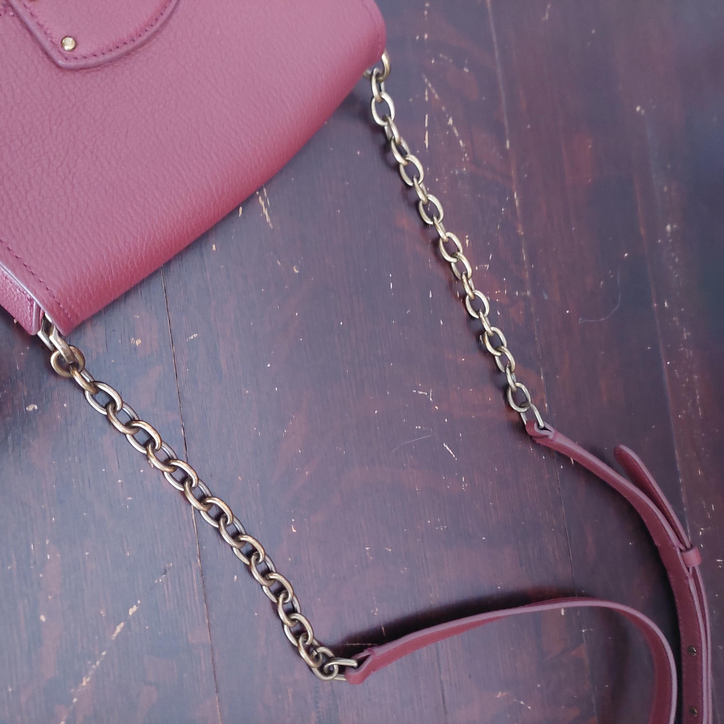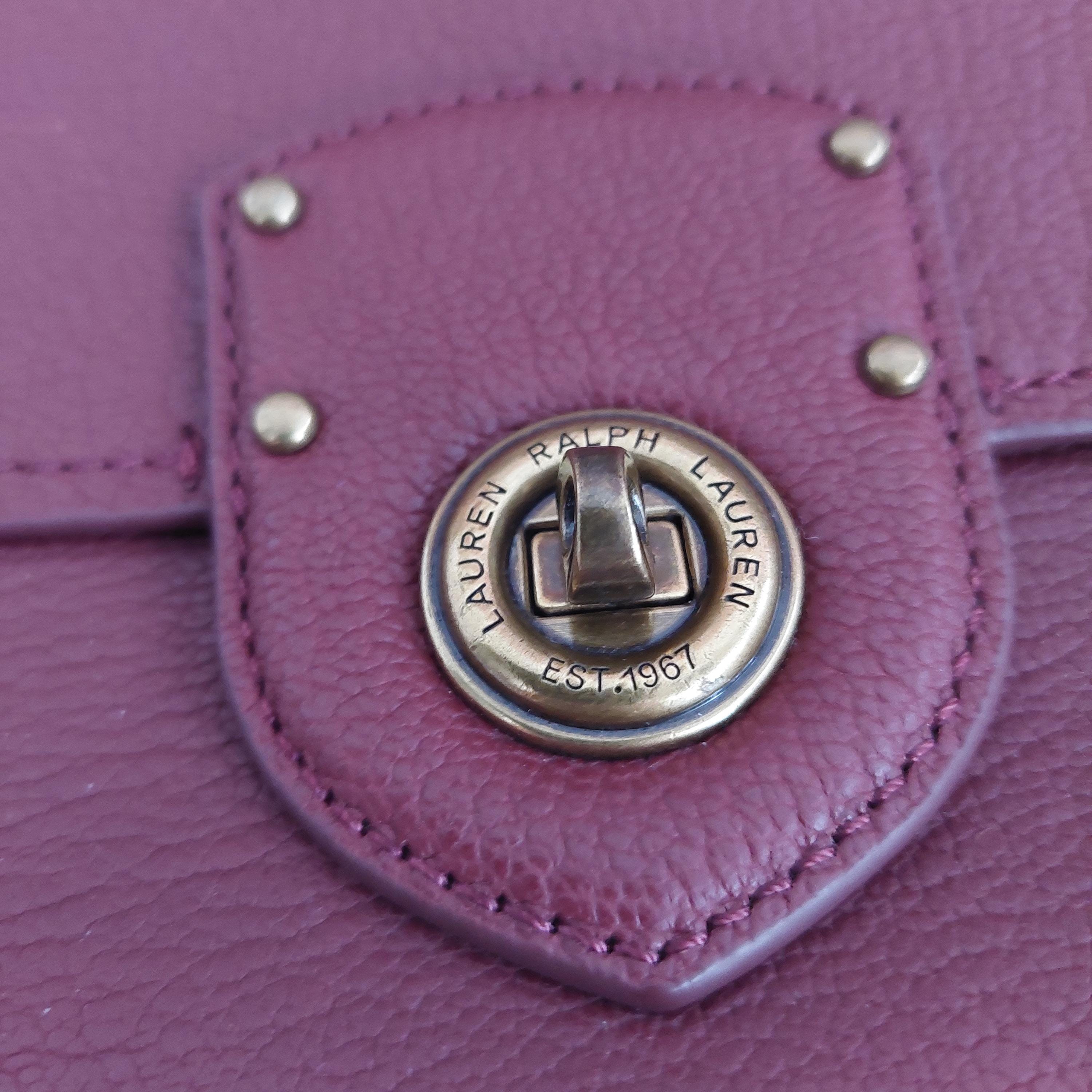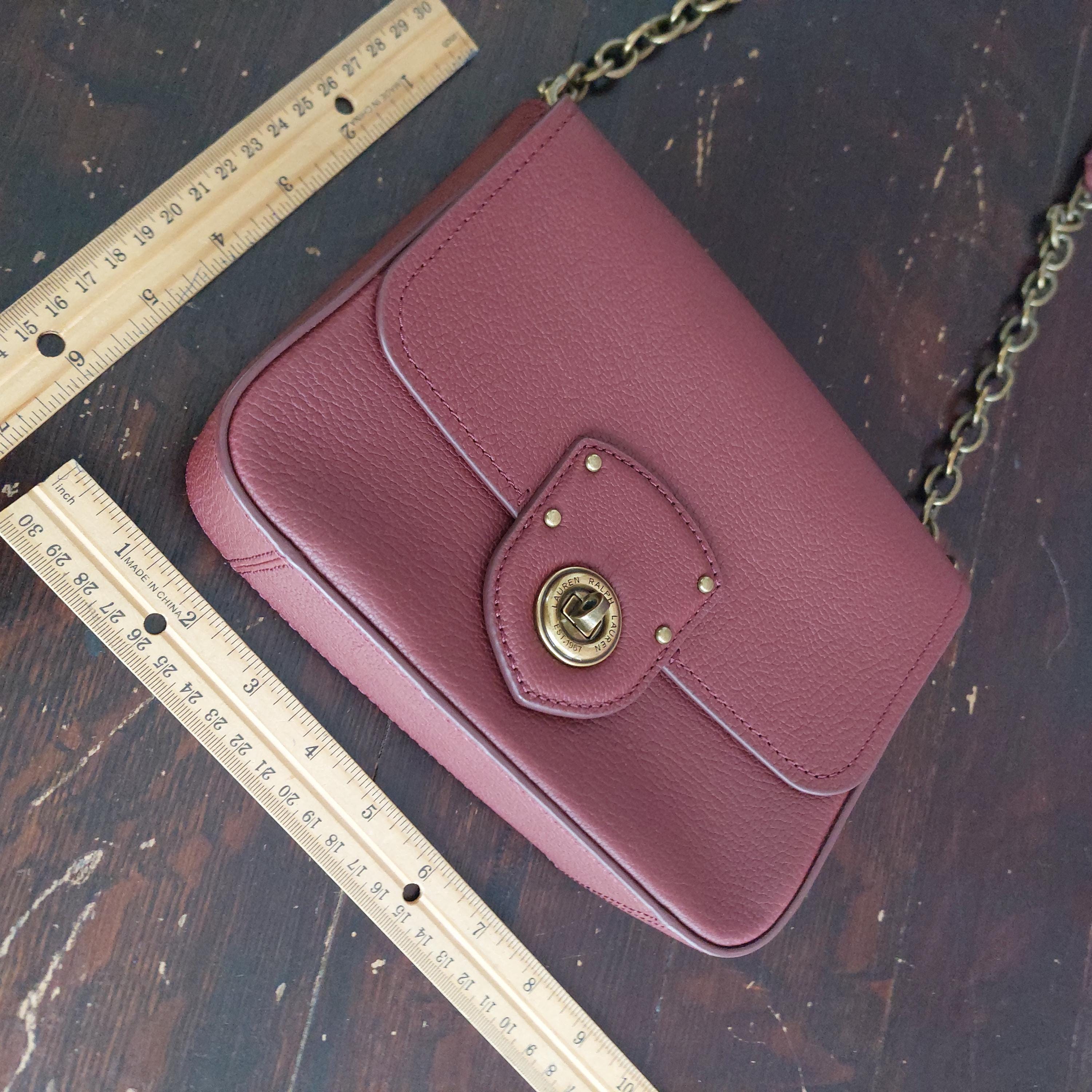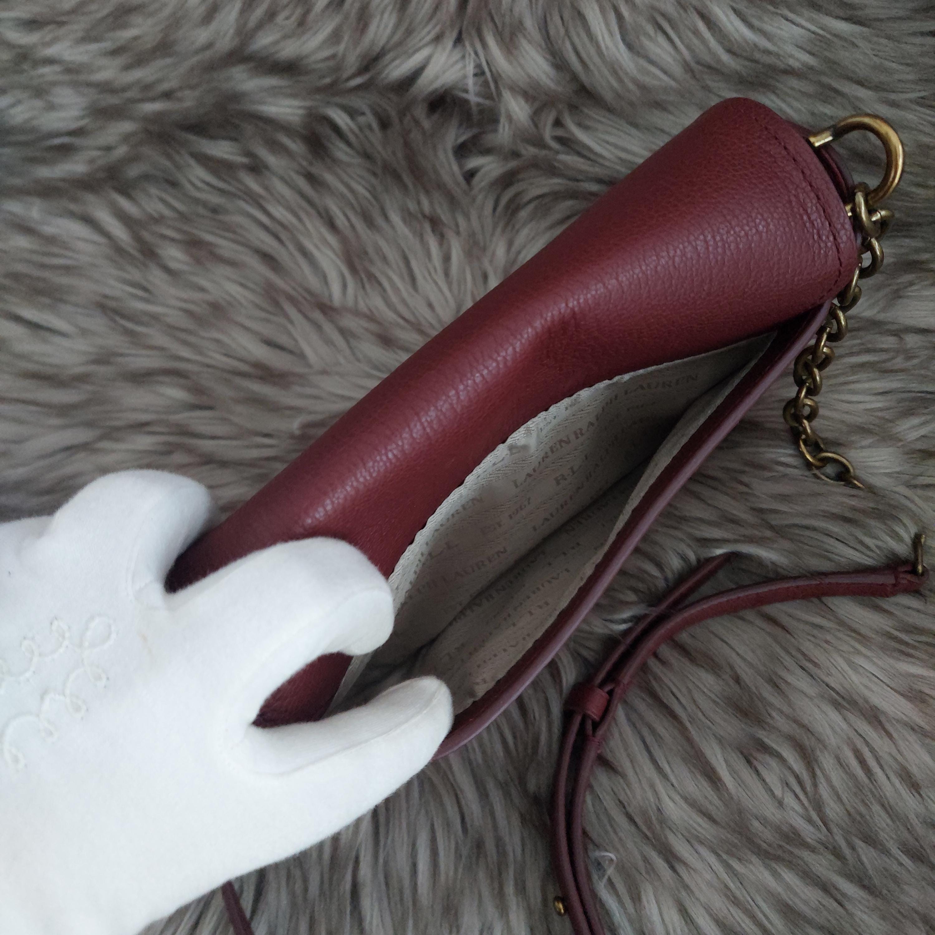 Lauren Ralph Lauren Millbrook chain crossbody handbag in merlot or burgundy pebbled leather. Strap features an antiqued brass chain with 6-hole adjustments, to wear as a shoulder bag or crossbody. Signature turn-lock closure on front flap. Inside on zippered and one sidewall slip pocket. Outside back has one slip pocket.