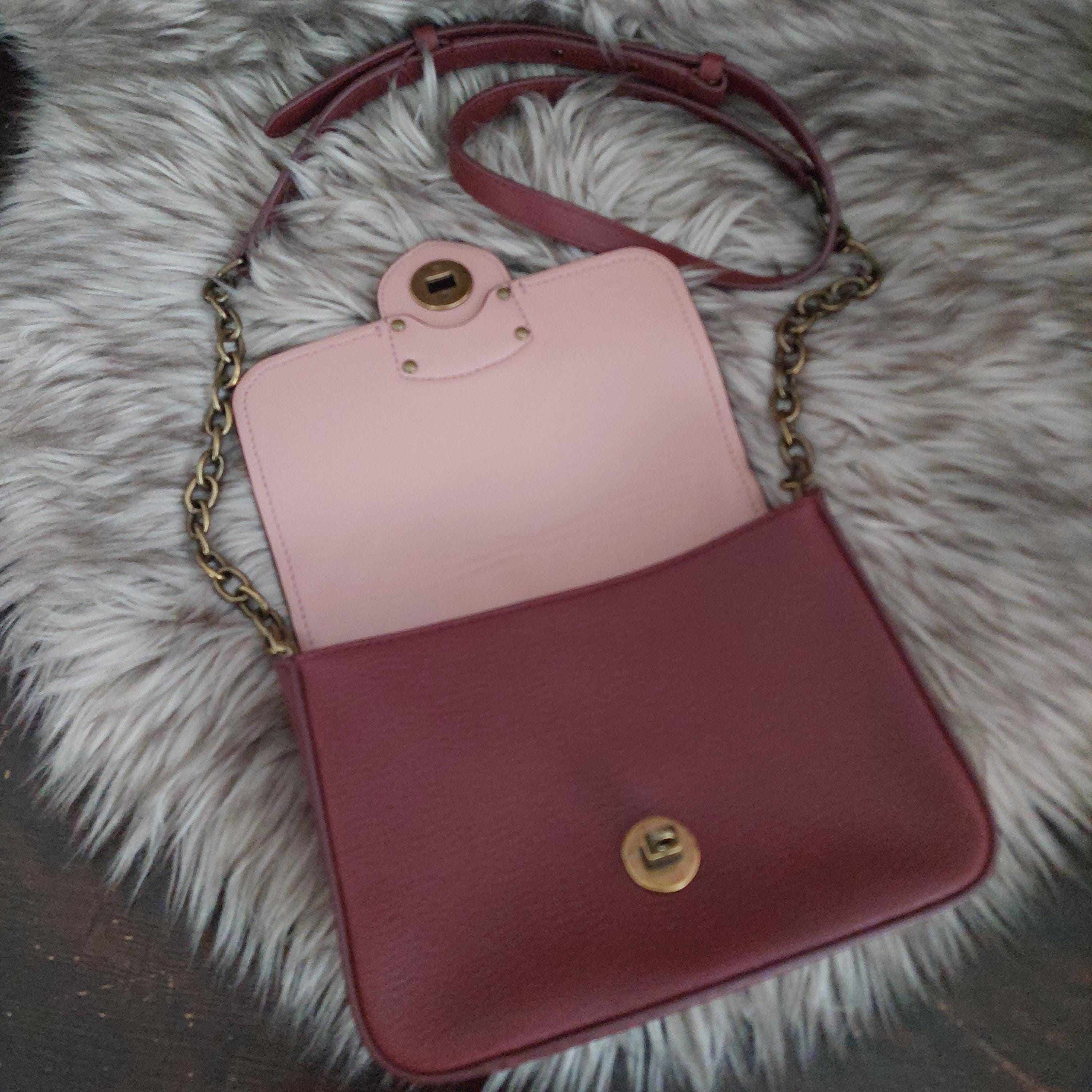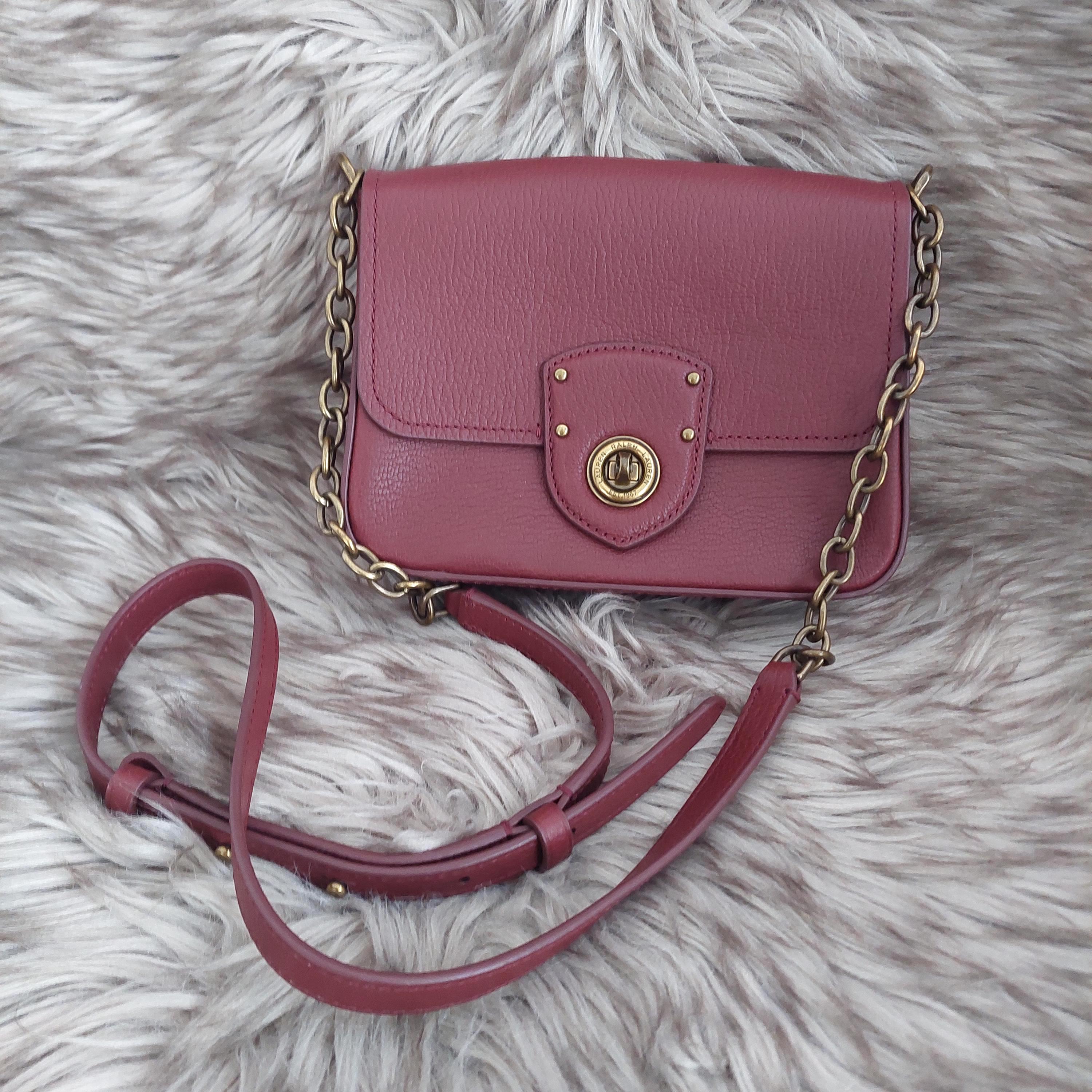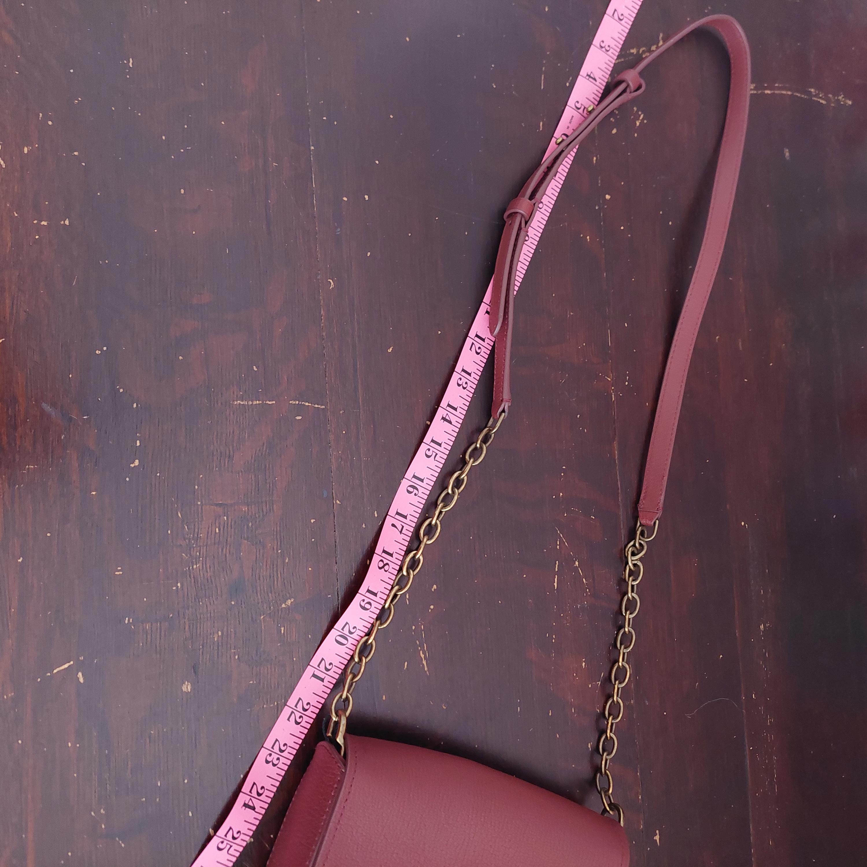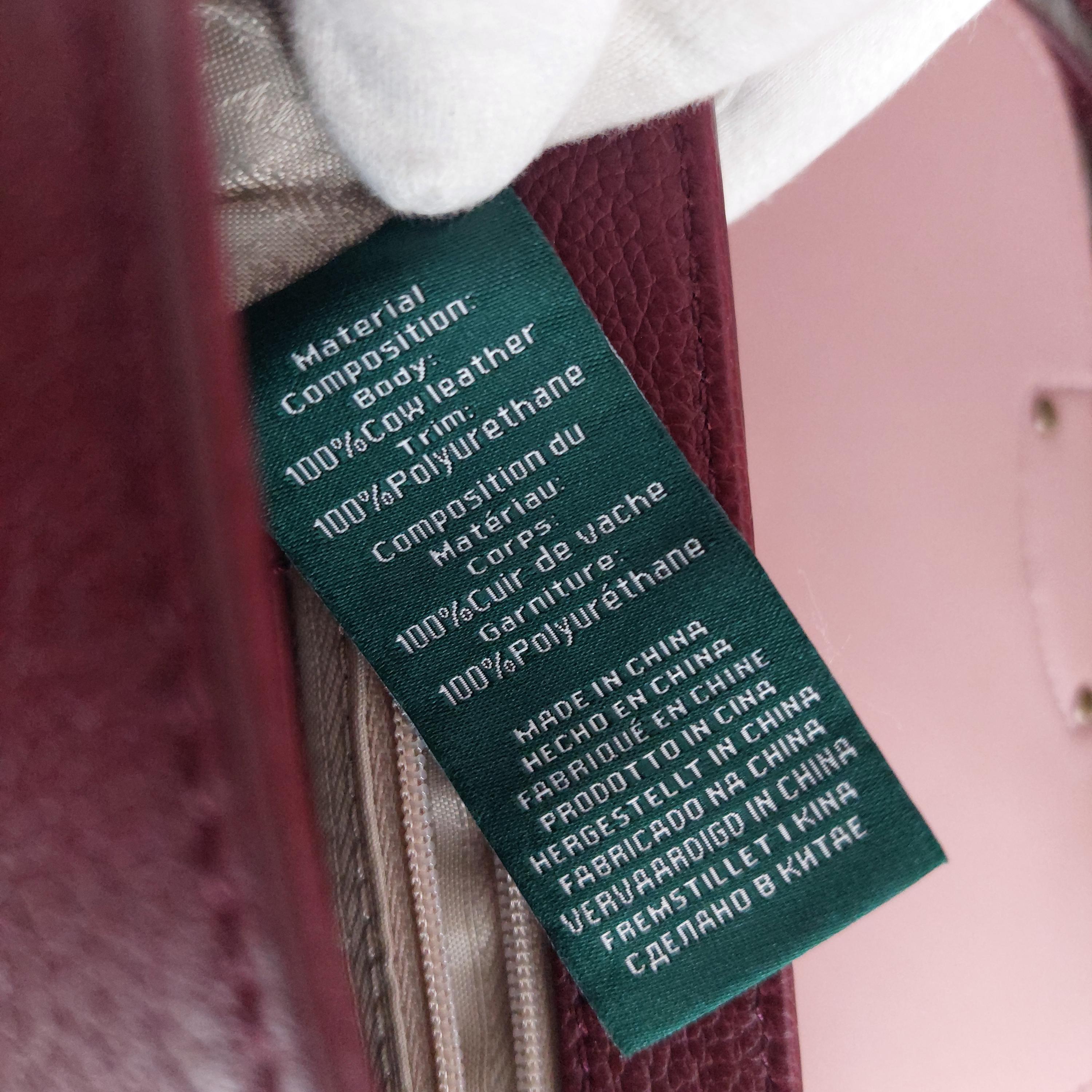 Lauren Ralph Lauren Millbrook chain crossbody handbag in merlot or burgundy pebbled leather. Strap features an antiqued brass chain with 6-hole adjustments, to wear as a shoulder bag or crossbody. Signature turn-lock closure on front flap. Inside on zippered and one sidewall slip pocket. Outside back has one slip pocket.