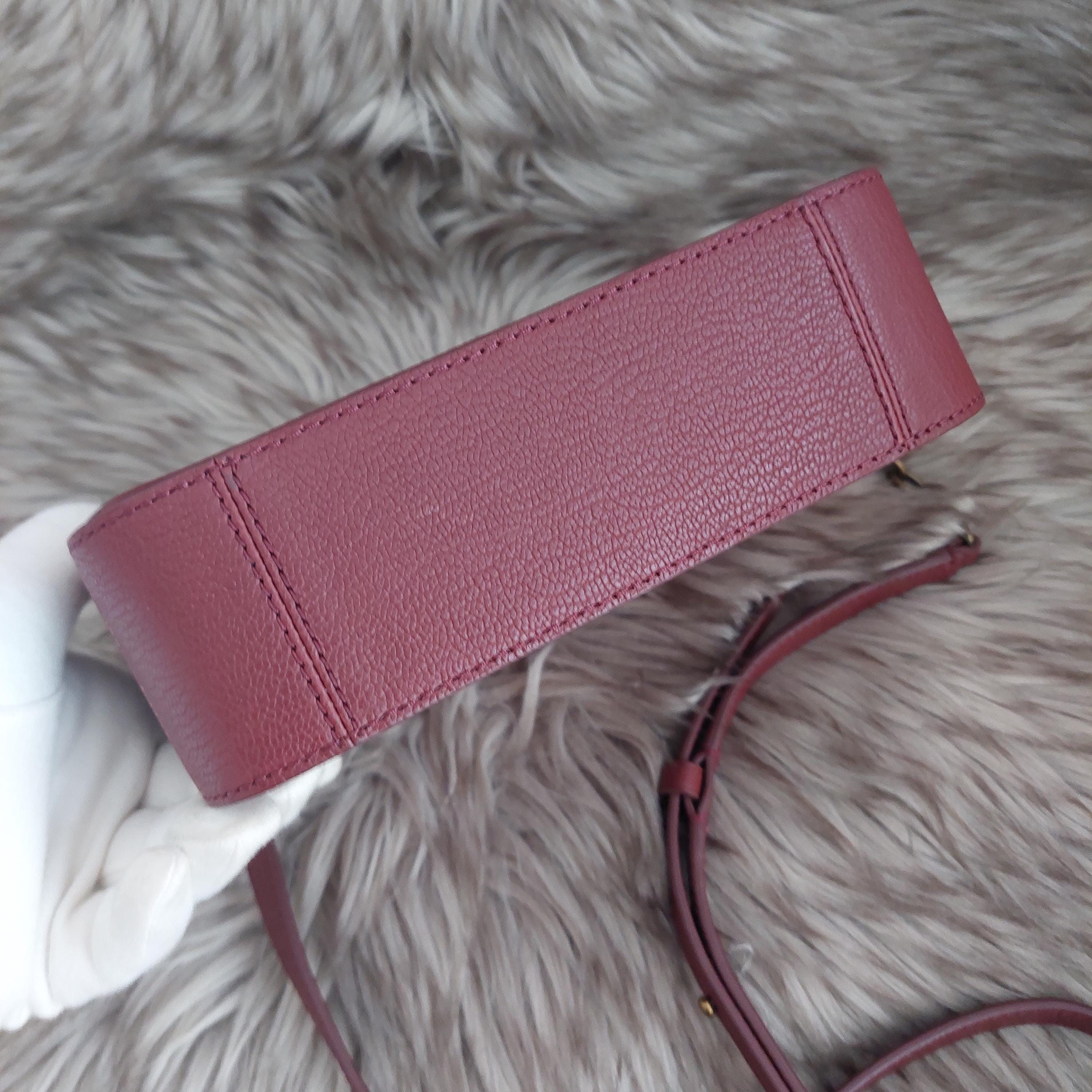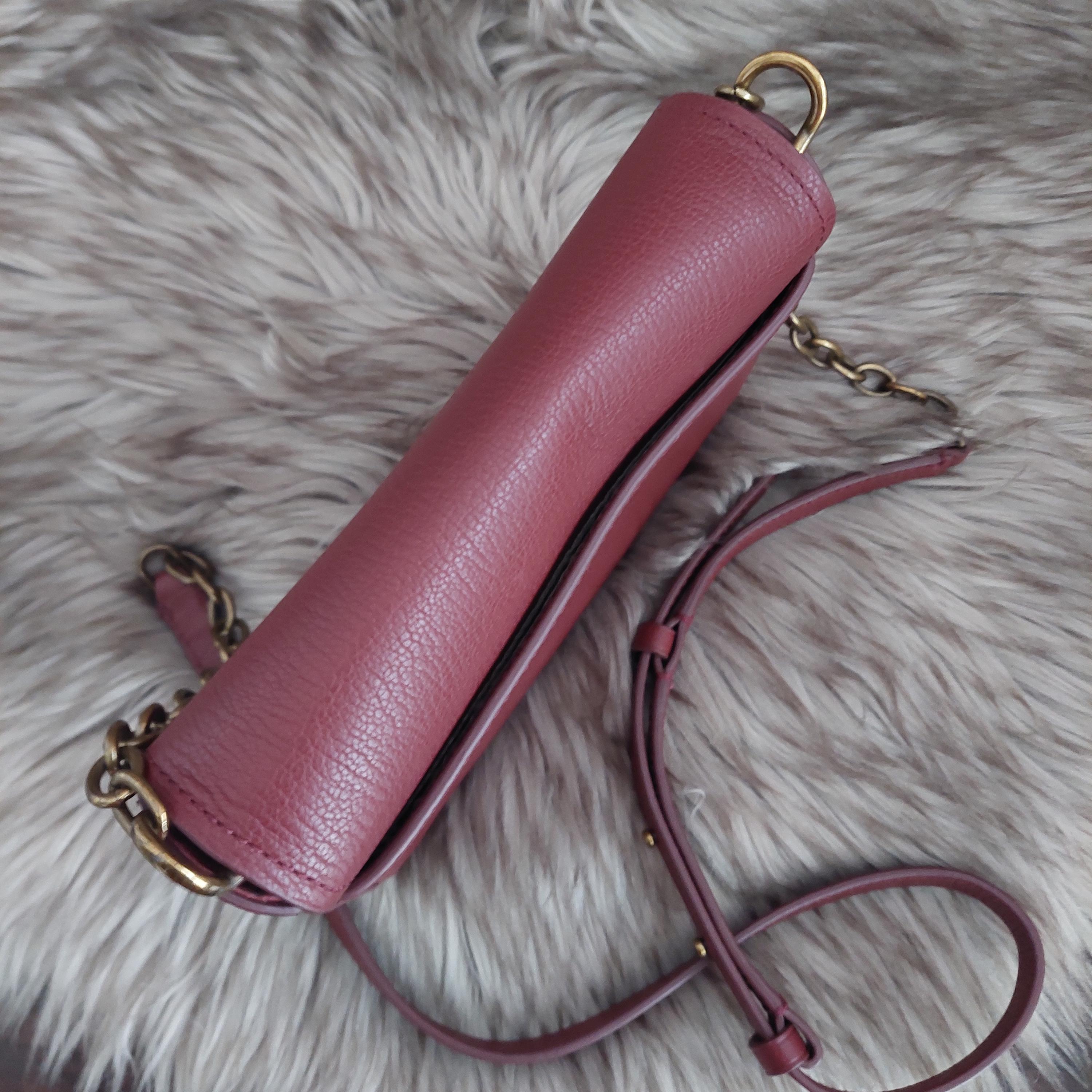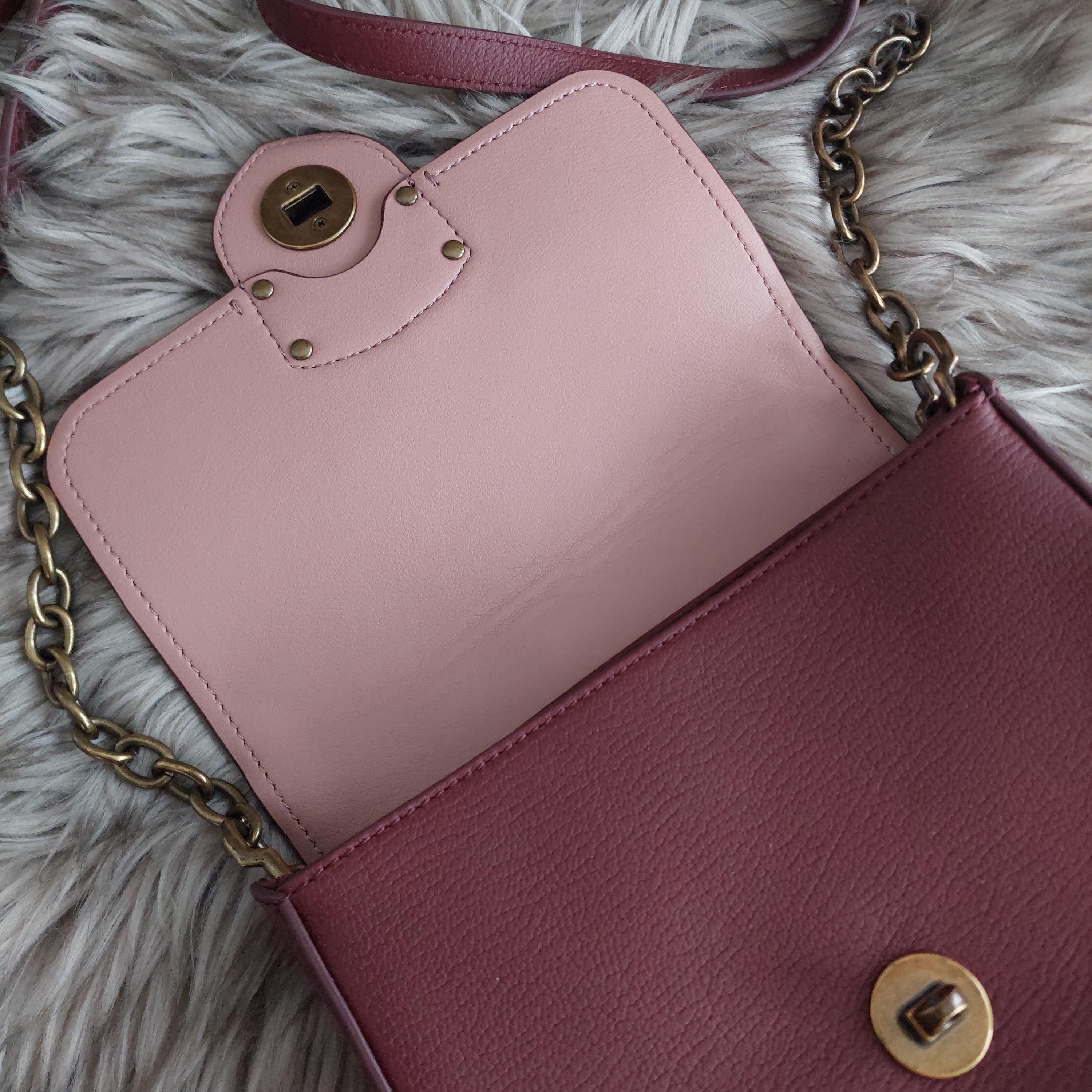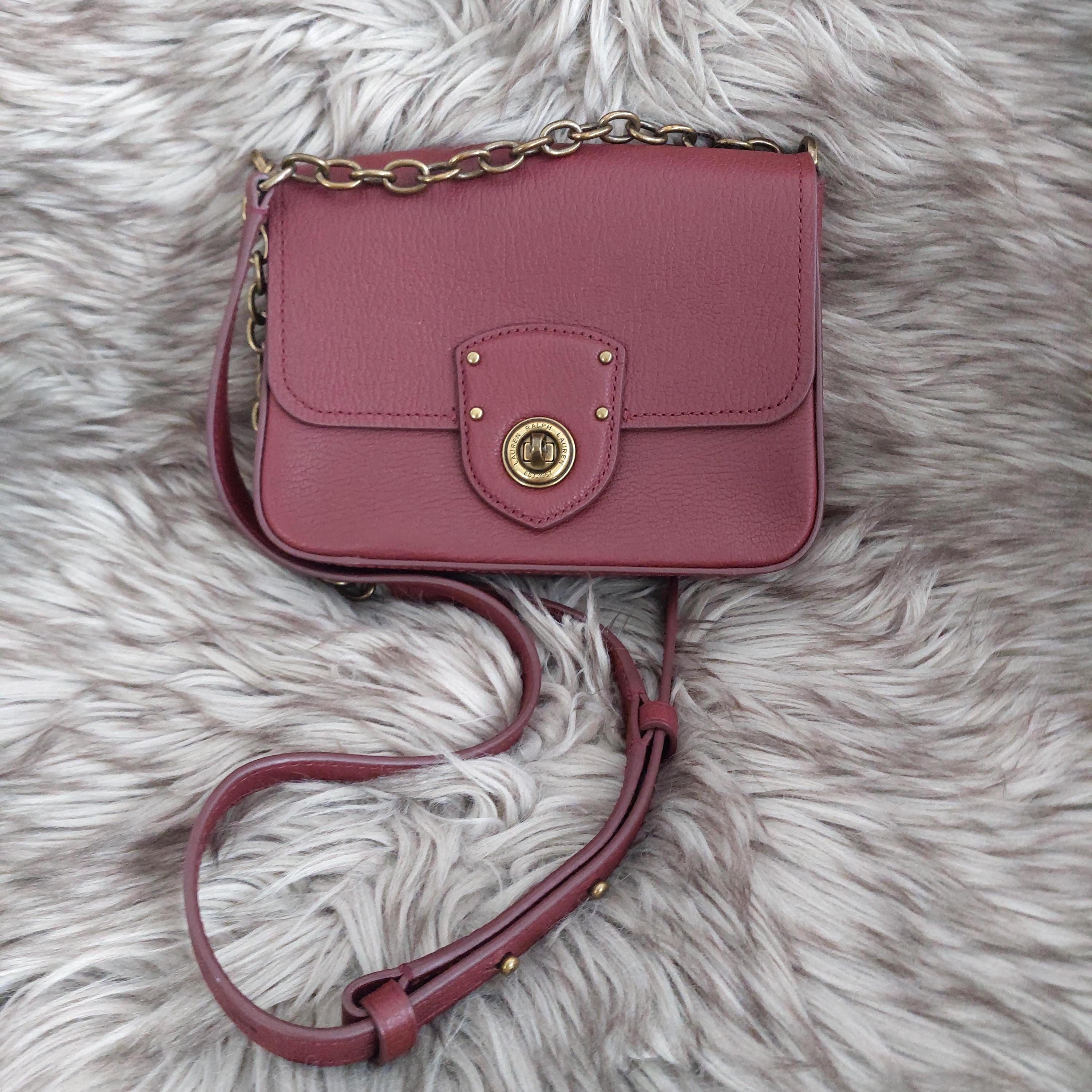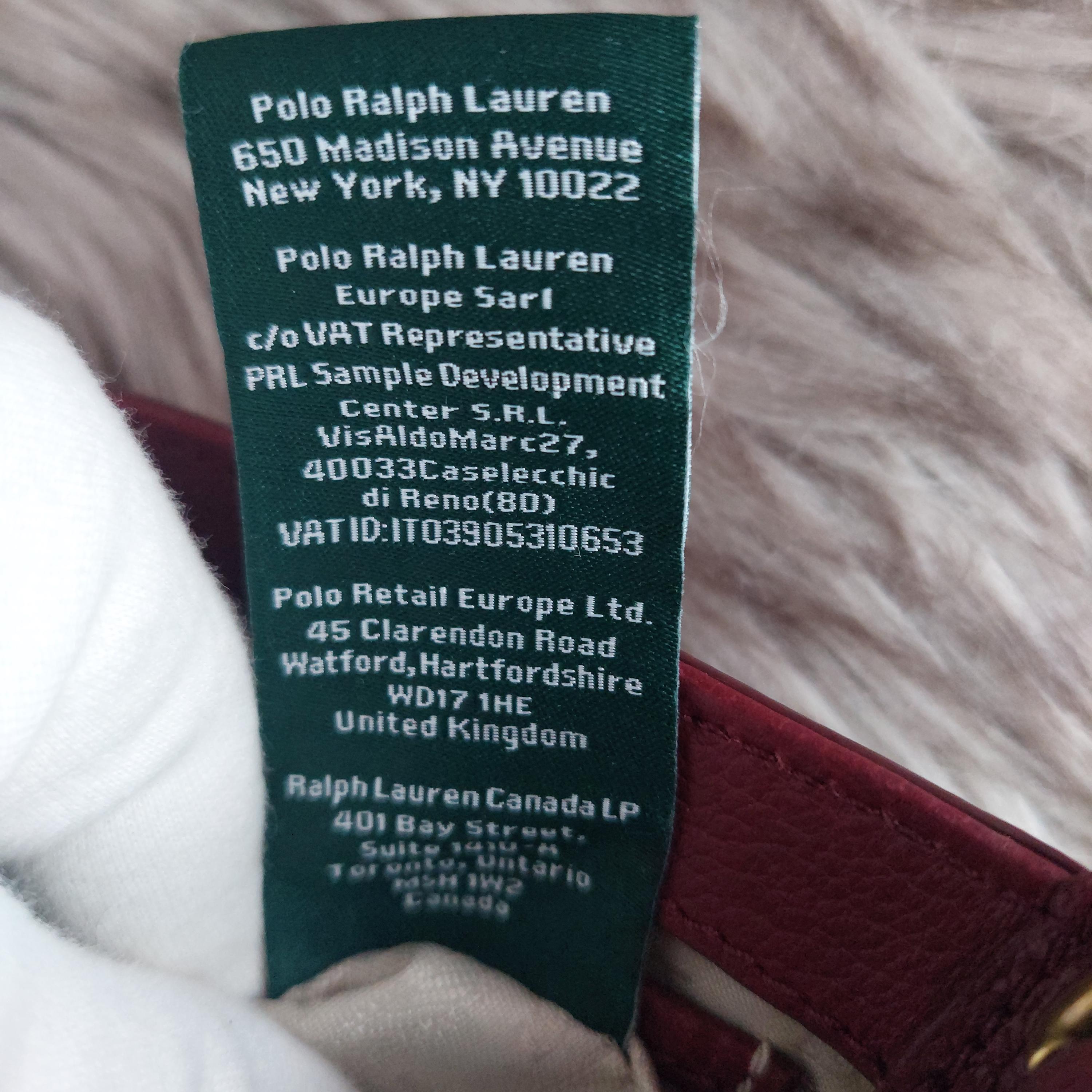 Lauren Ralph Lauren Millbrook chain crossbody handbag in merlot or burgundy pebbled leather. Strap features an antiqued brass chain with 6-hole adjustments, to wear as a shoulder bag or crossbody. Signature turn-lock closure on front flap. Inside on zippered and one sidewall slip pocket. Outside back has one slip pocket.