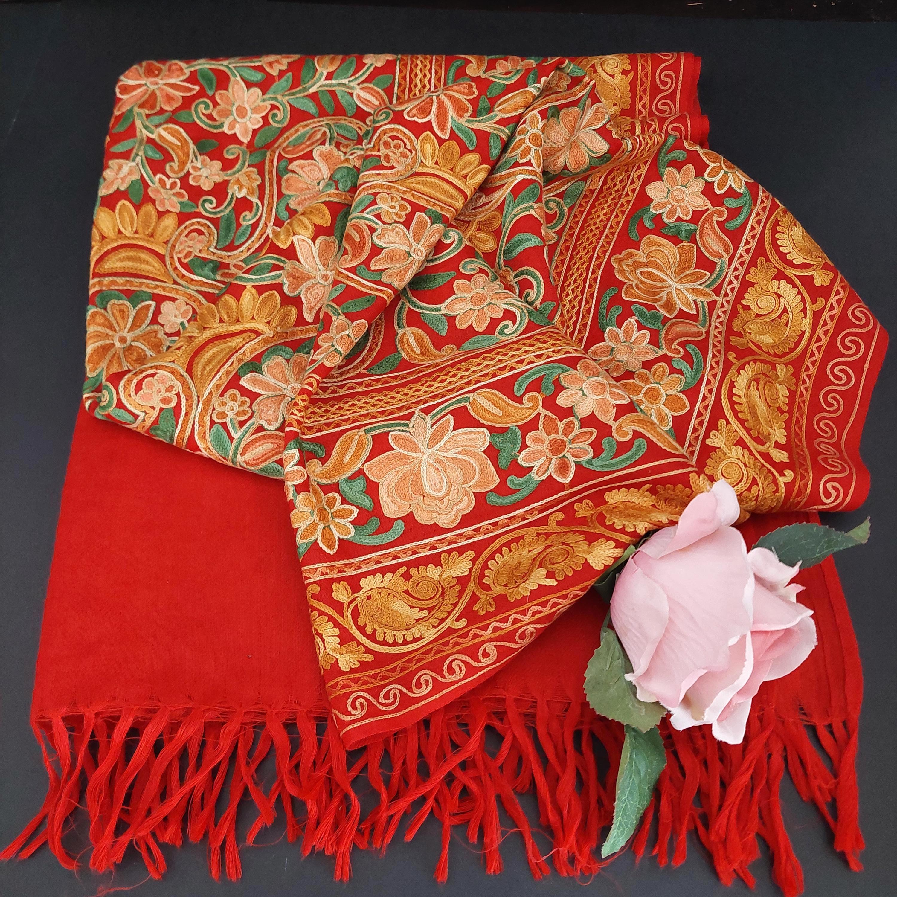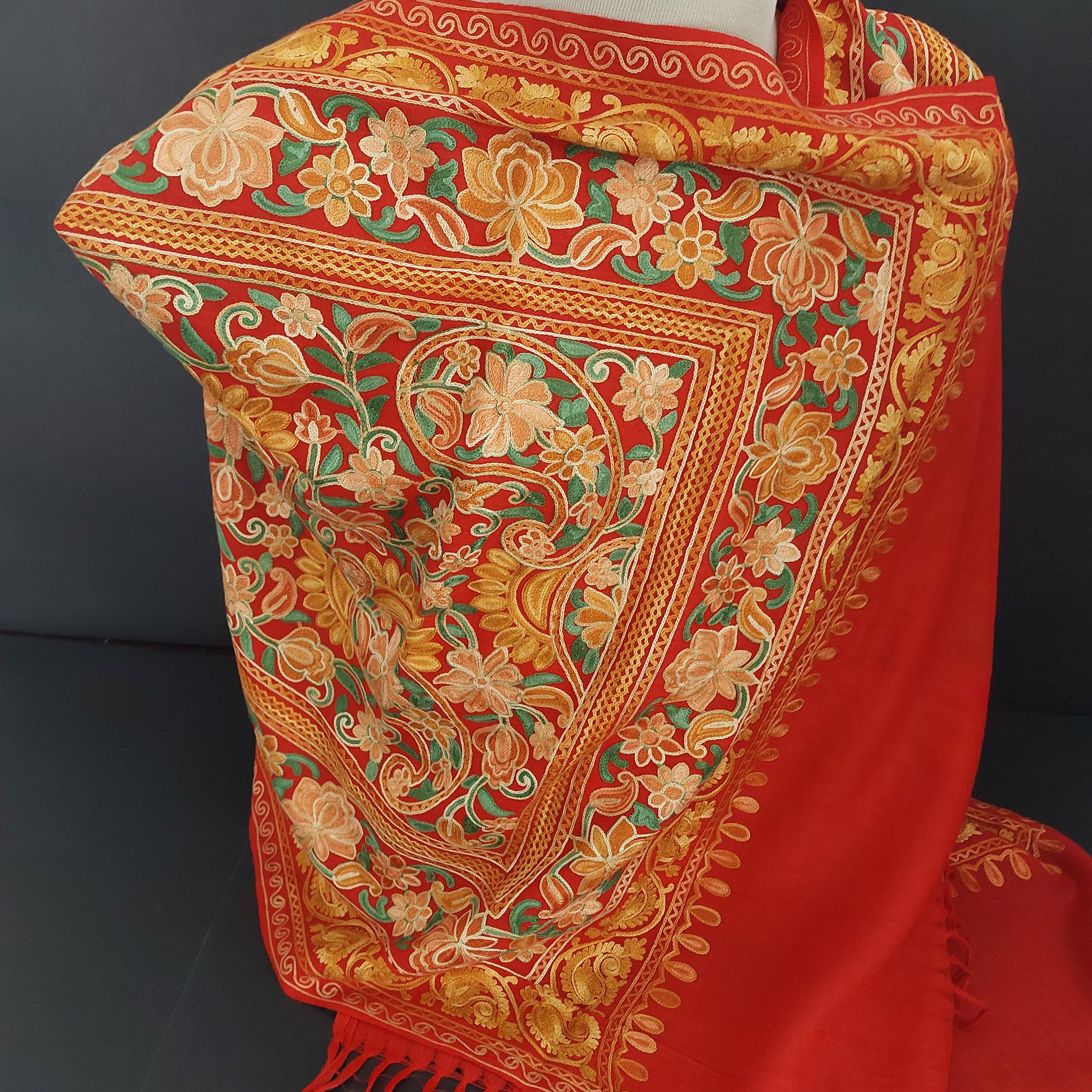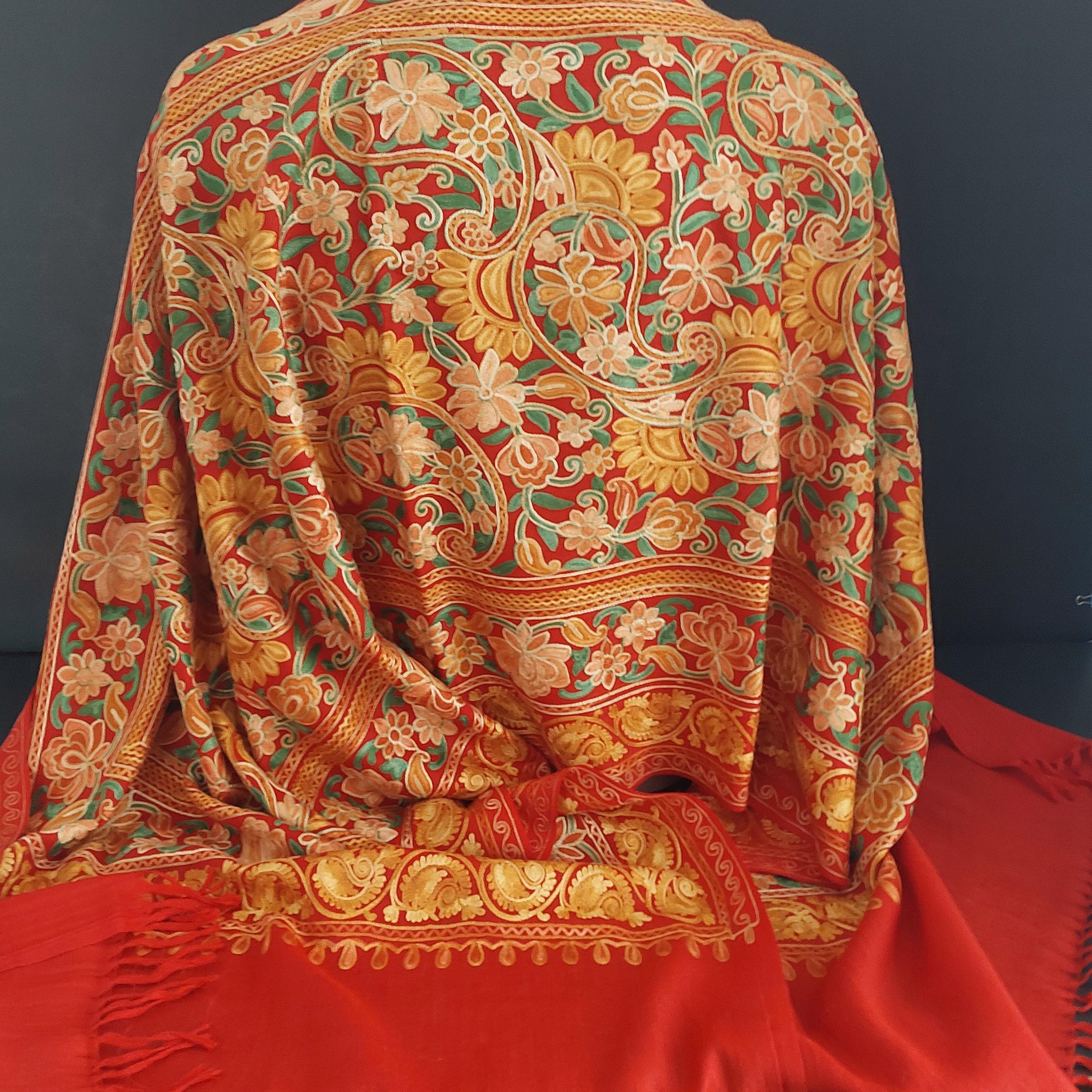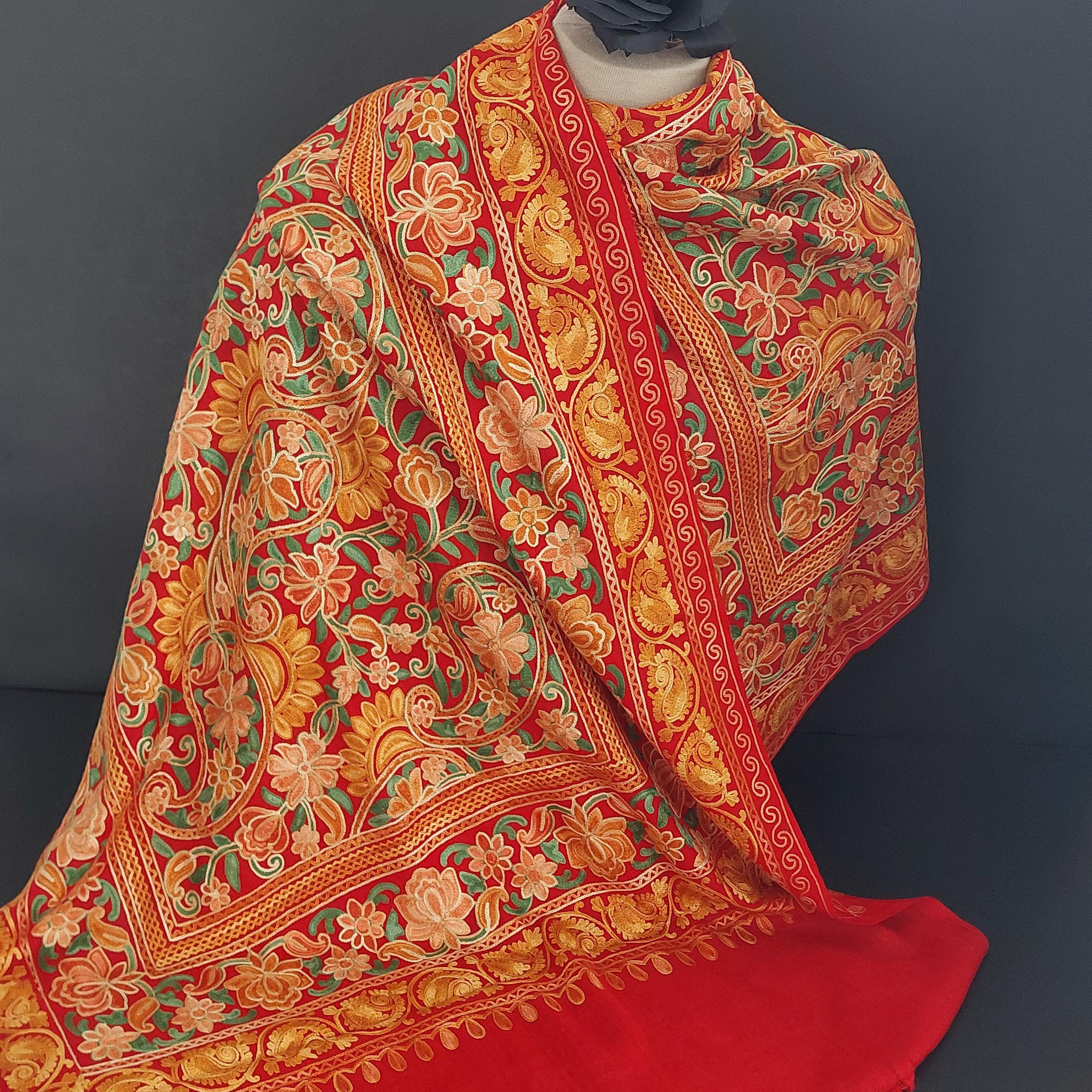 Red Kashmiri embroidered deep red shawl featuring Aari floral and paisley embroidery in yellow, orange and gold tones.
