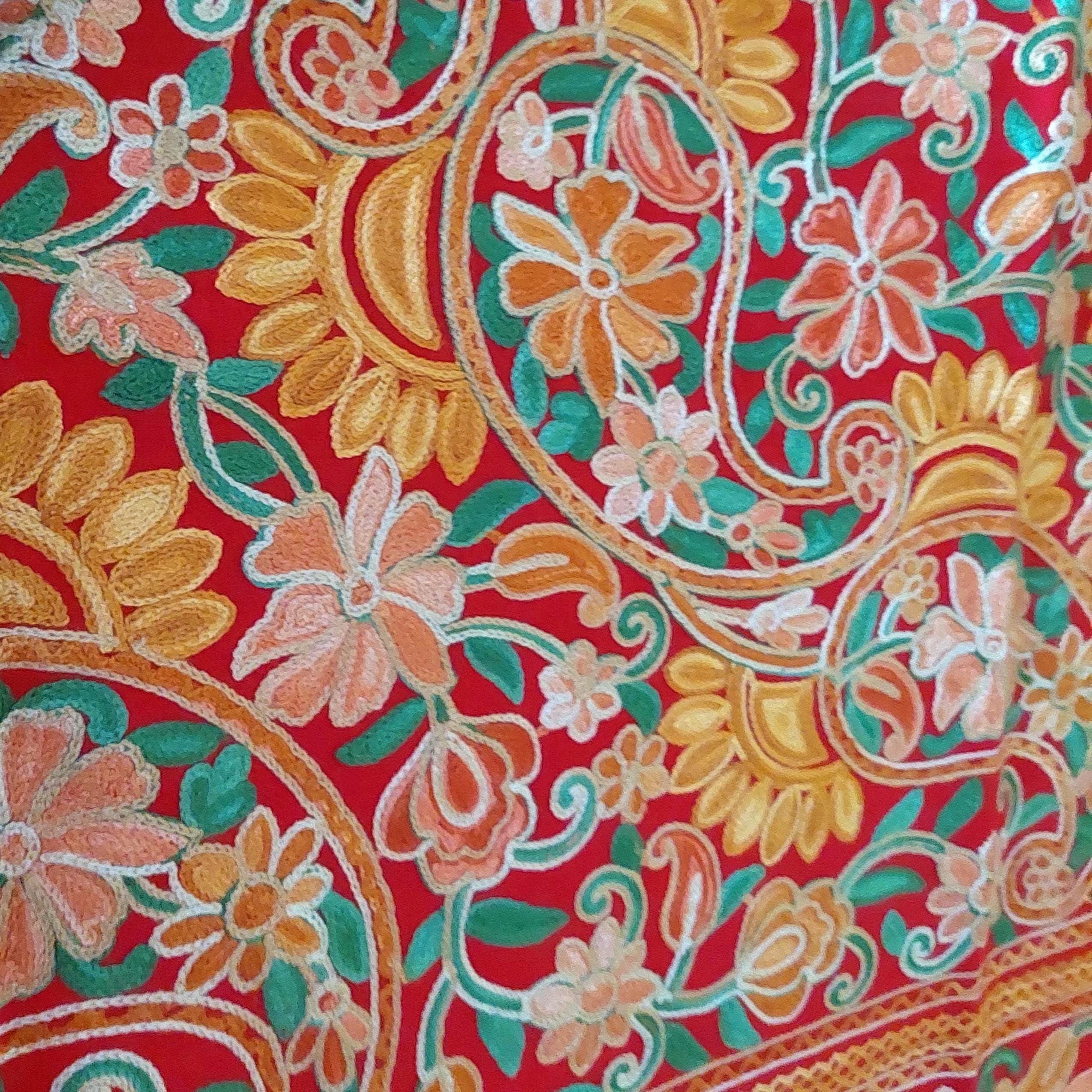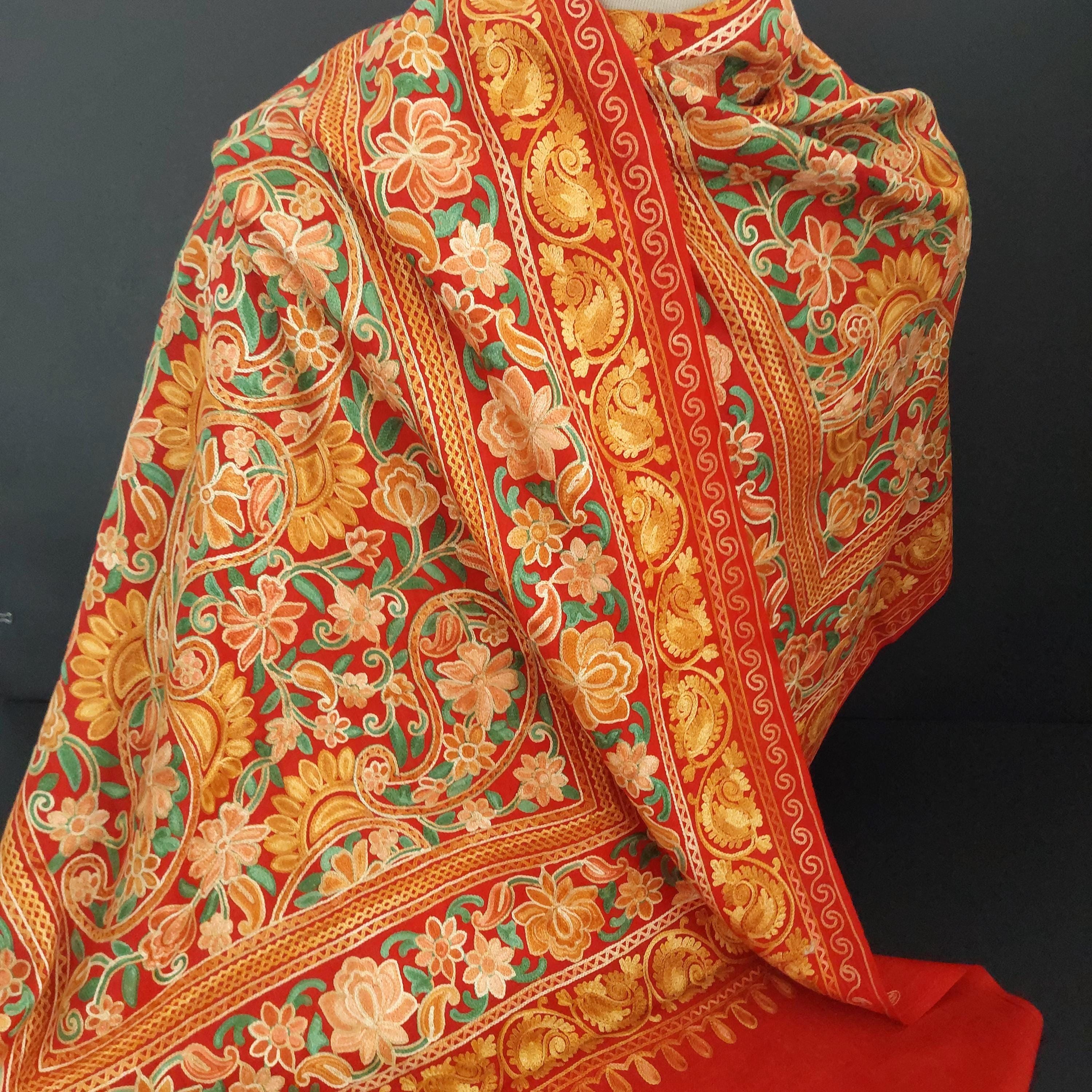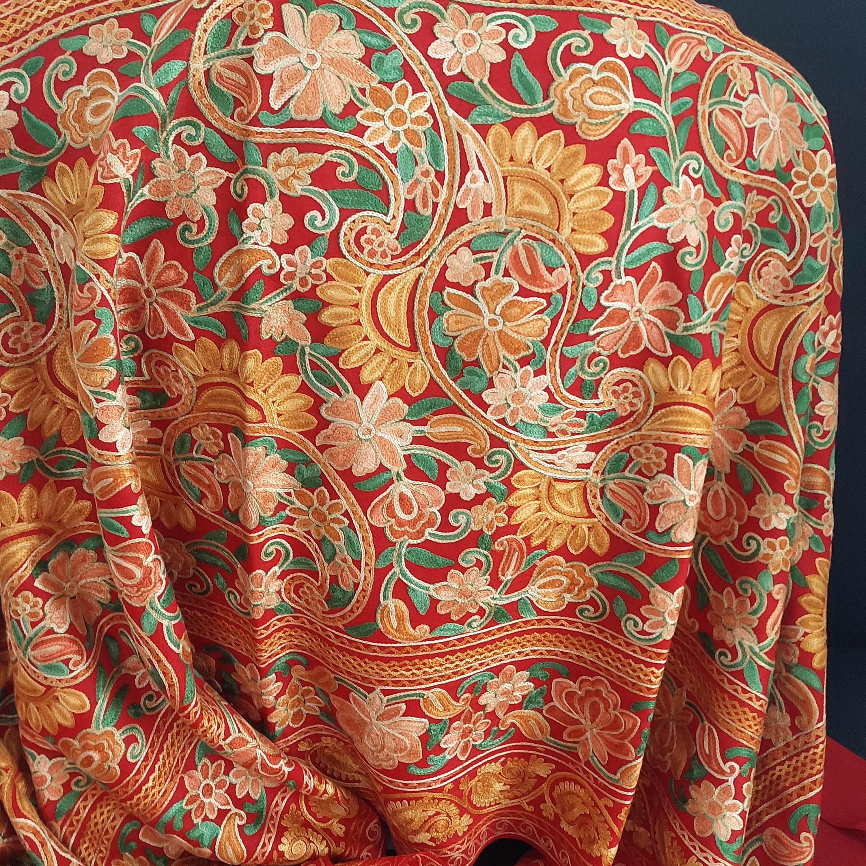 Red Kashmiri embroidered deep red shawl featuring Aari floral and paisley embroidery in yellow, orange and gold tones.